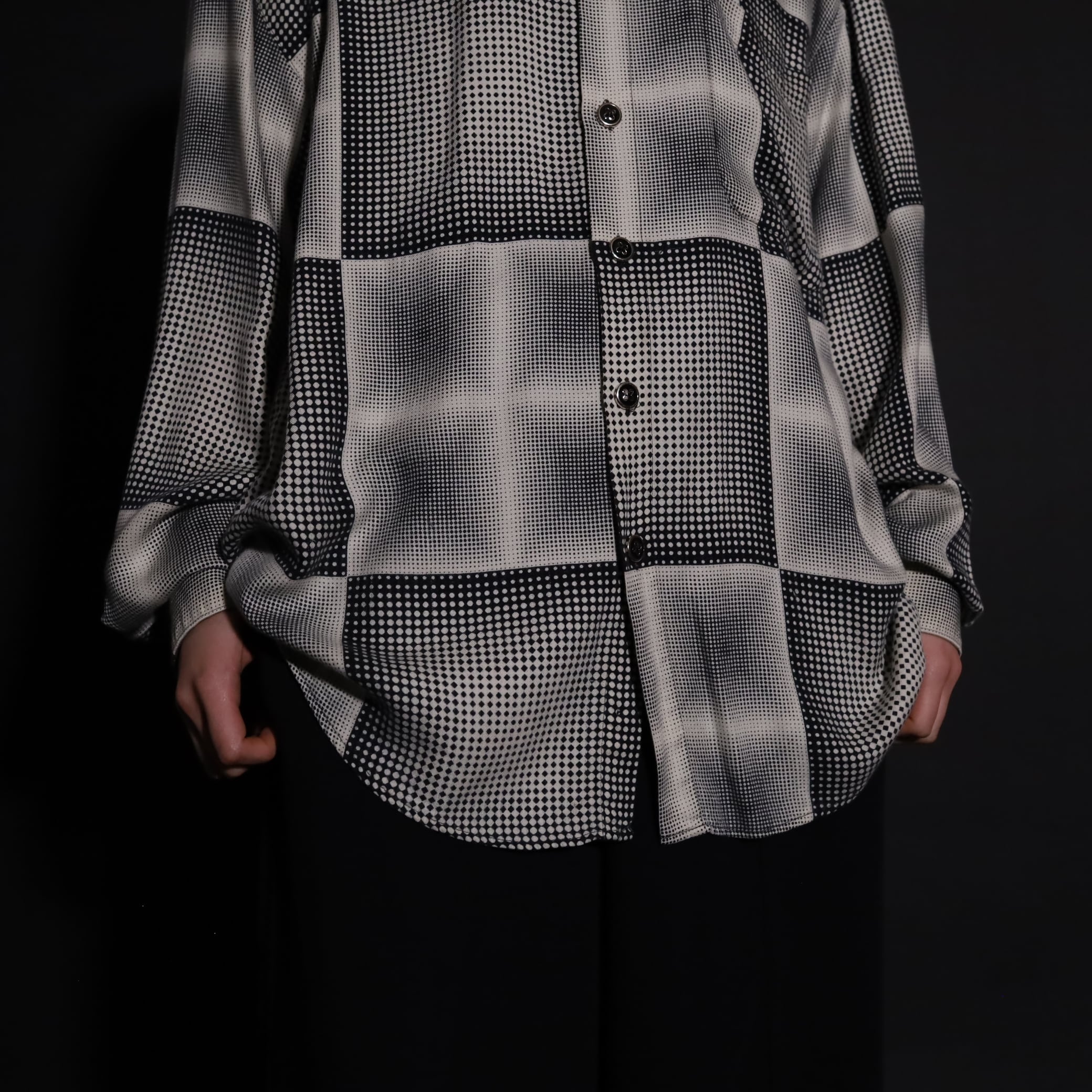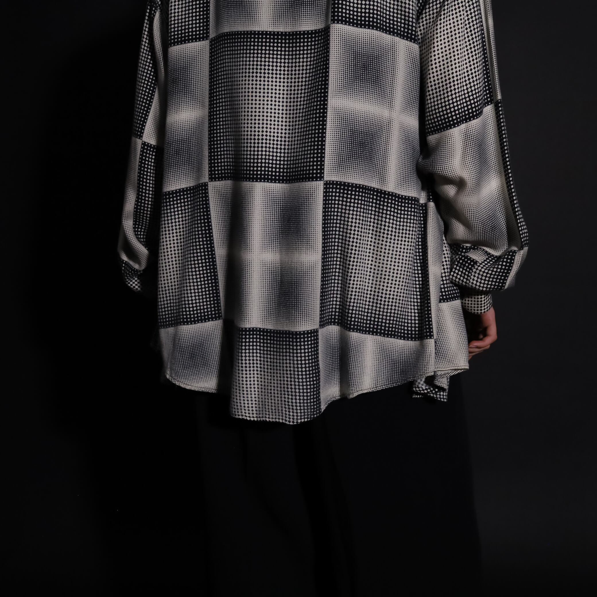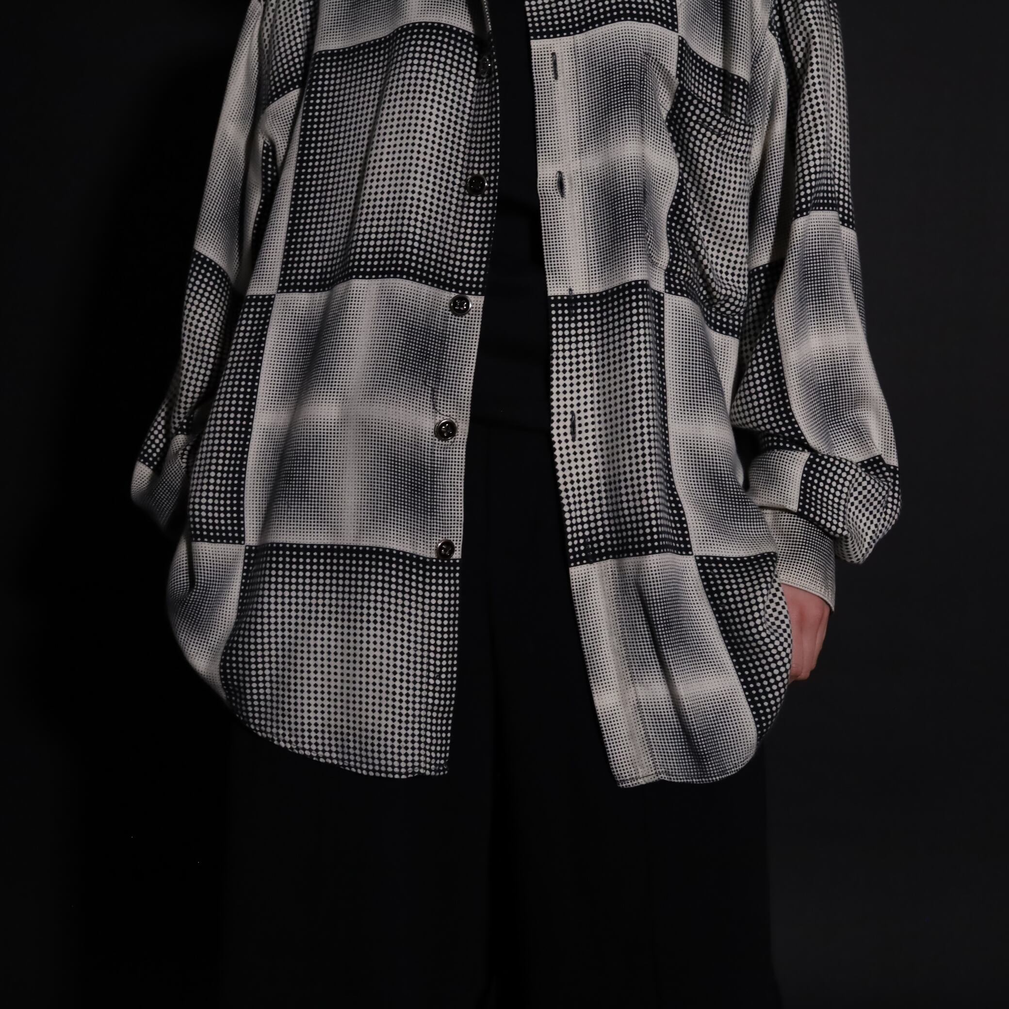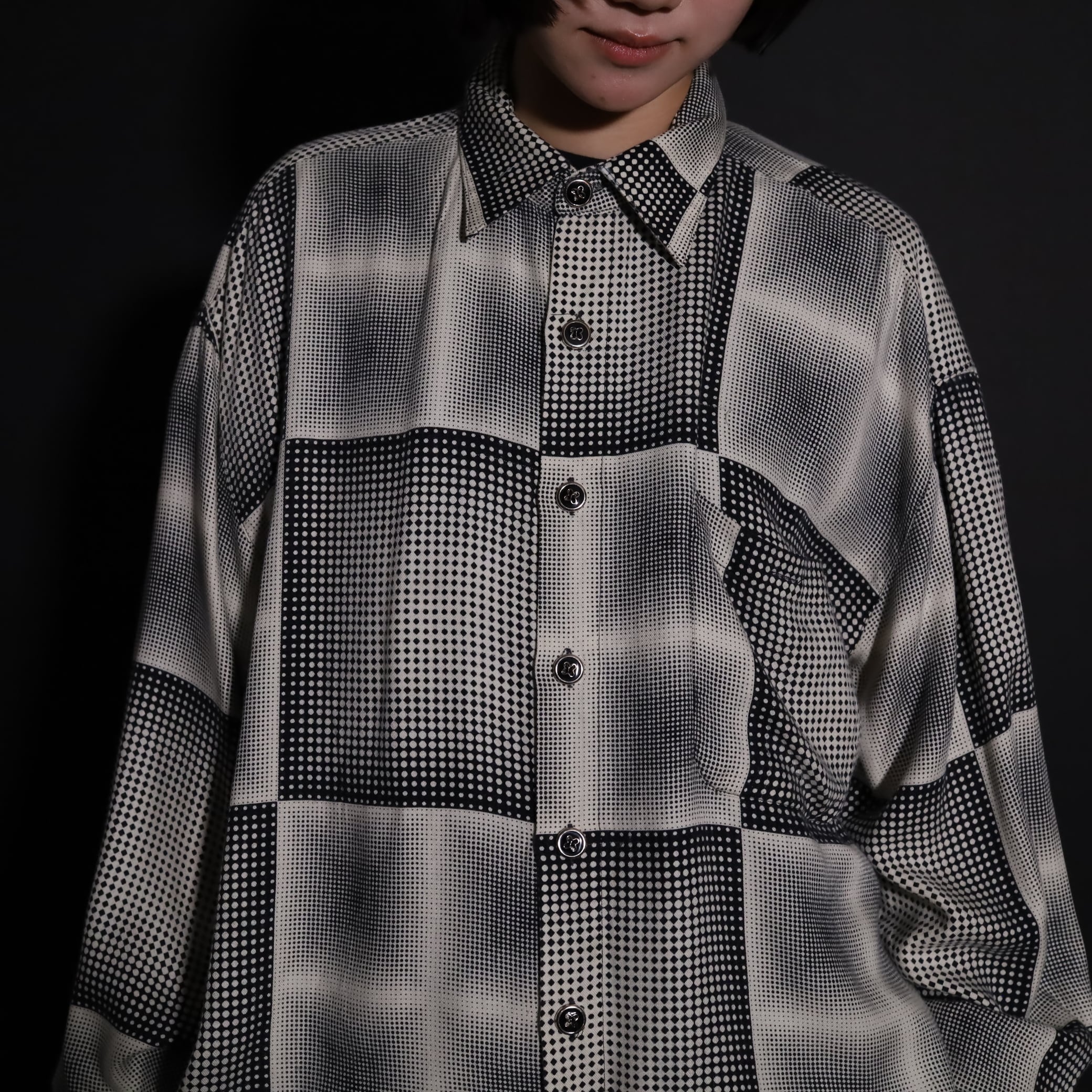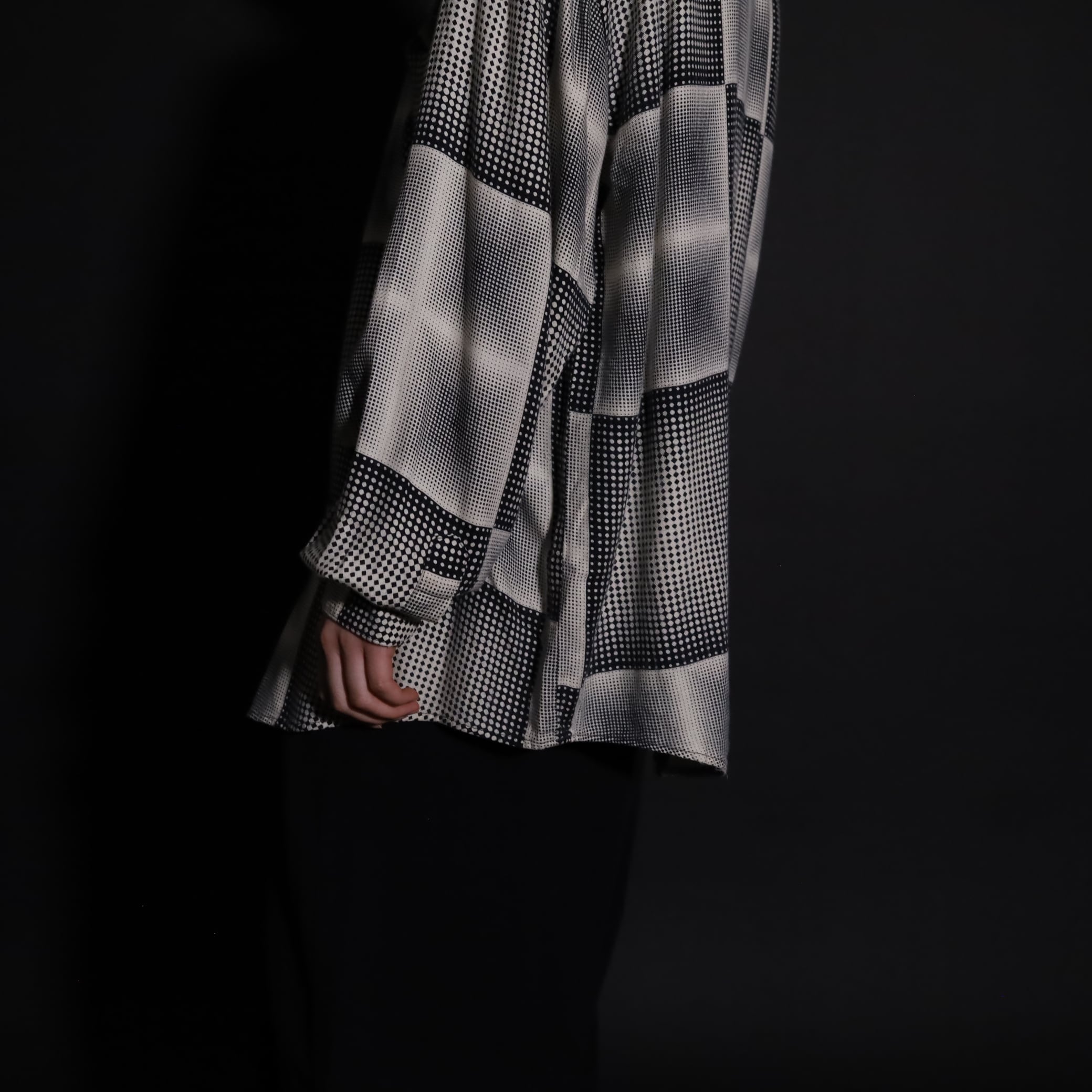 ホワイトカラーのヴィスコース100%ボディに,ブラックカラーのドット総柄デザイン.