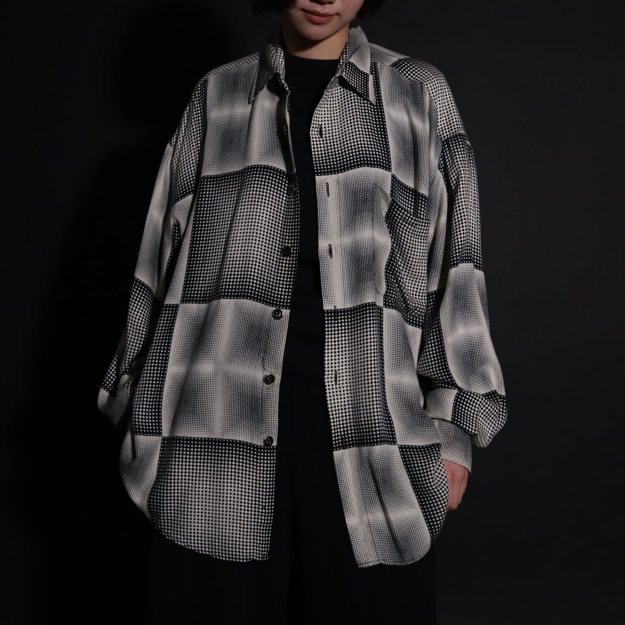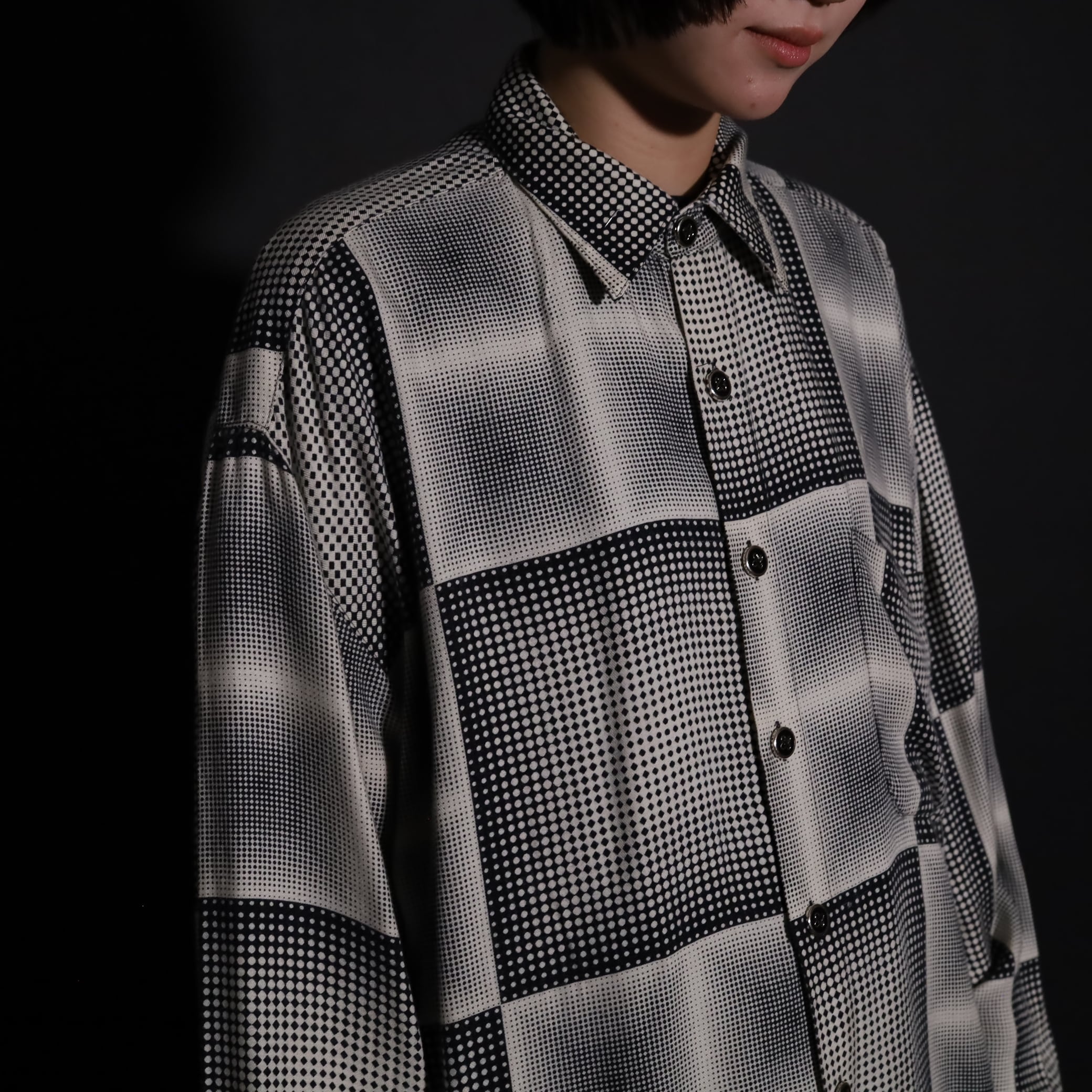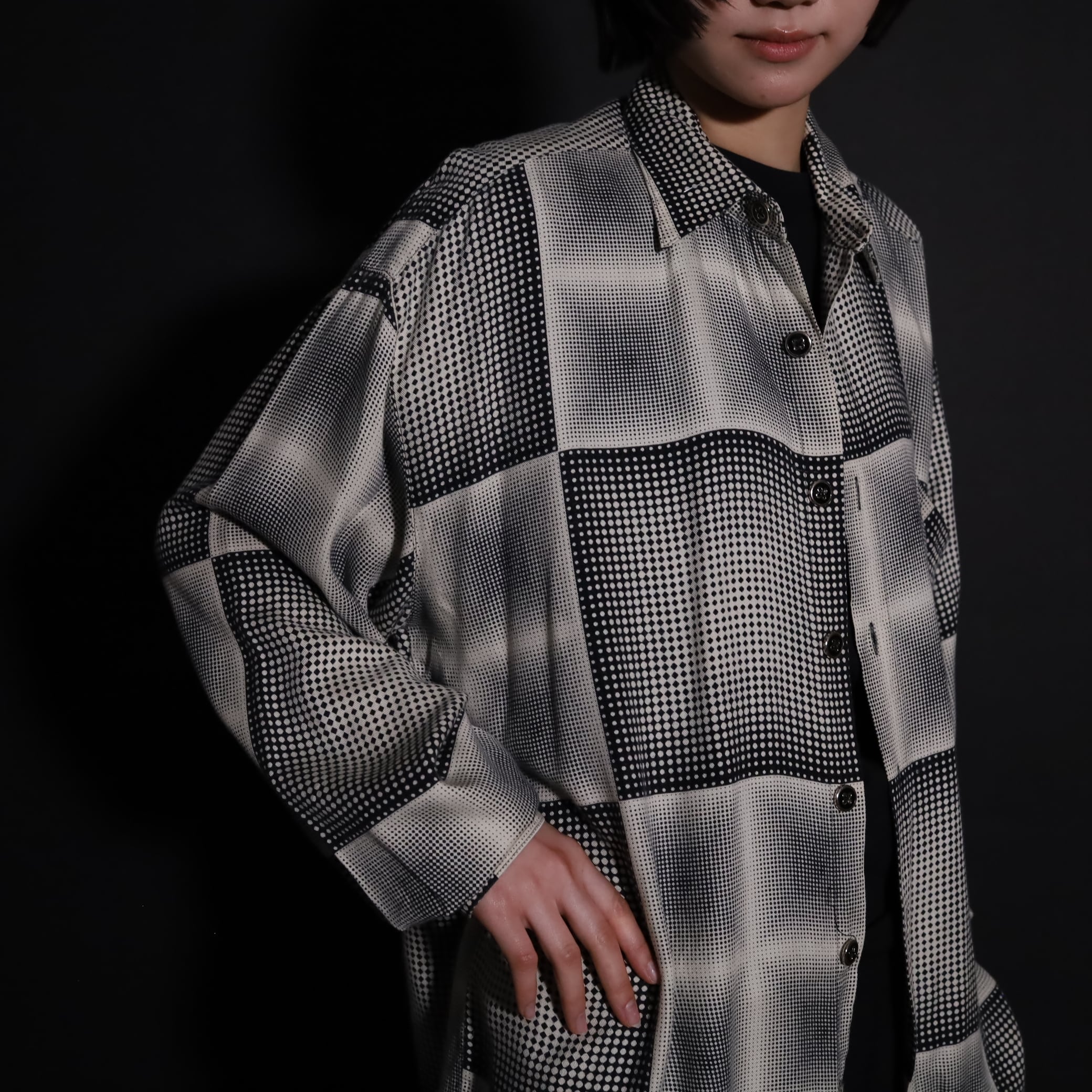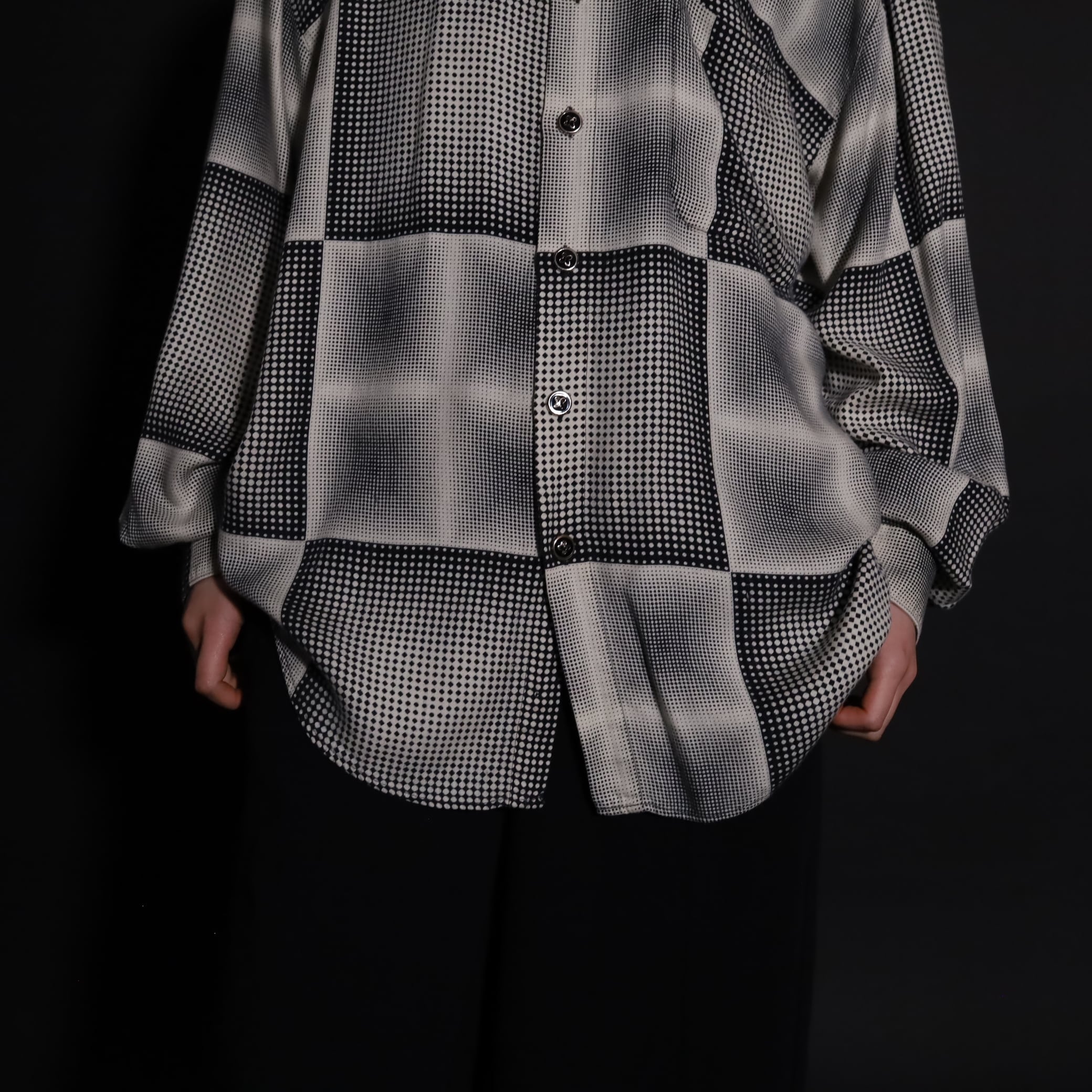 ホワイトカラーのヴィスコース100%ボディに,ブラックカラーのドット総柄デザイン.