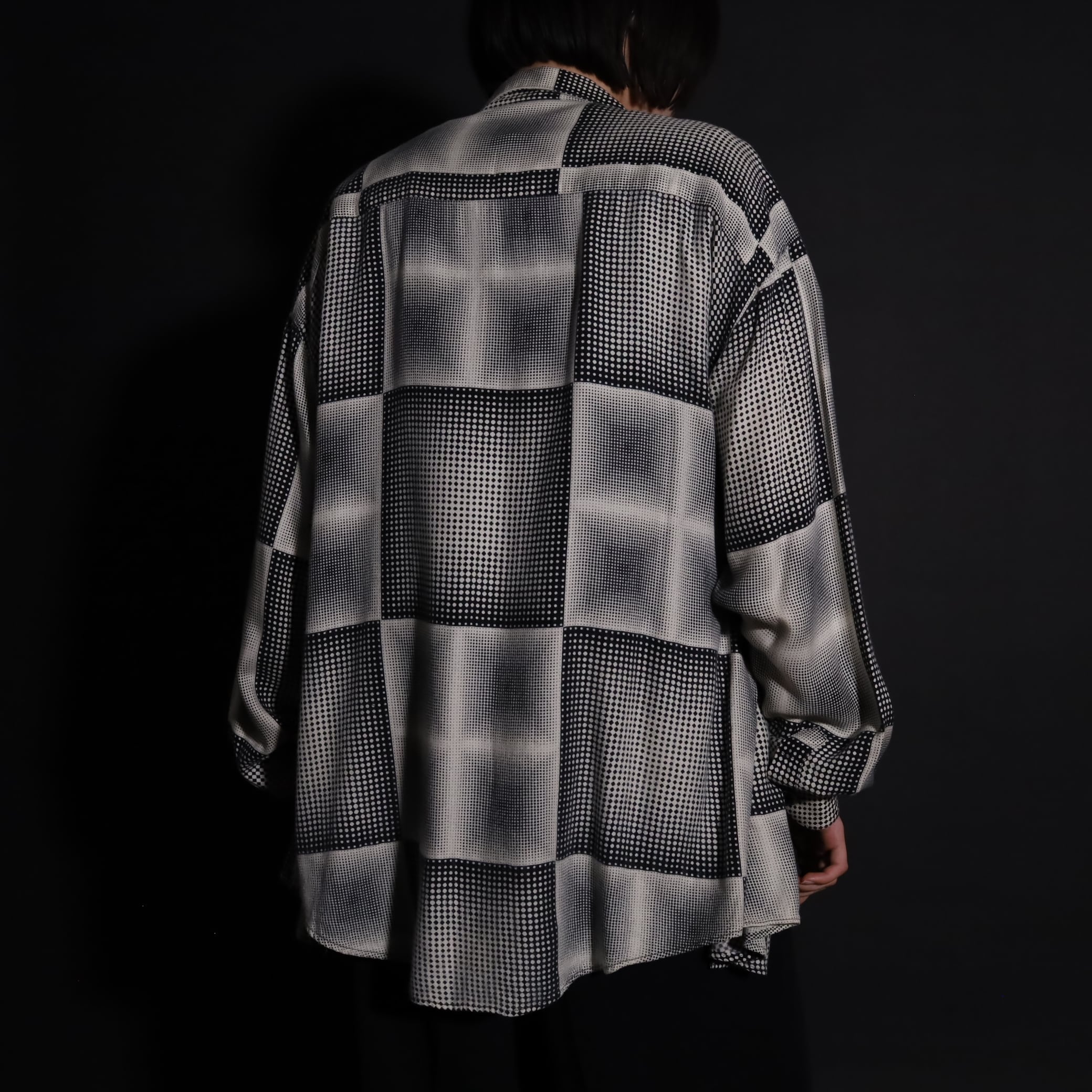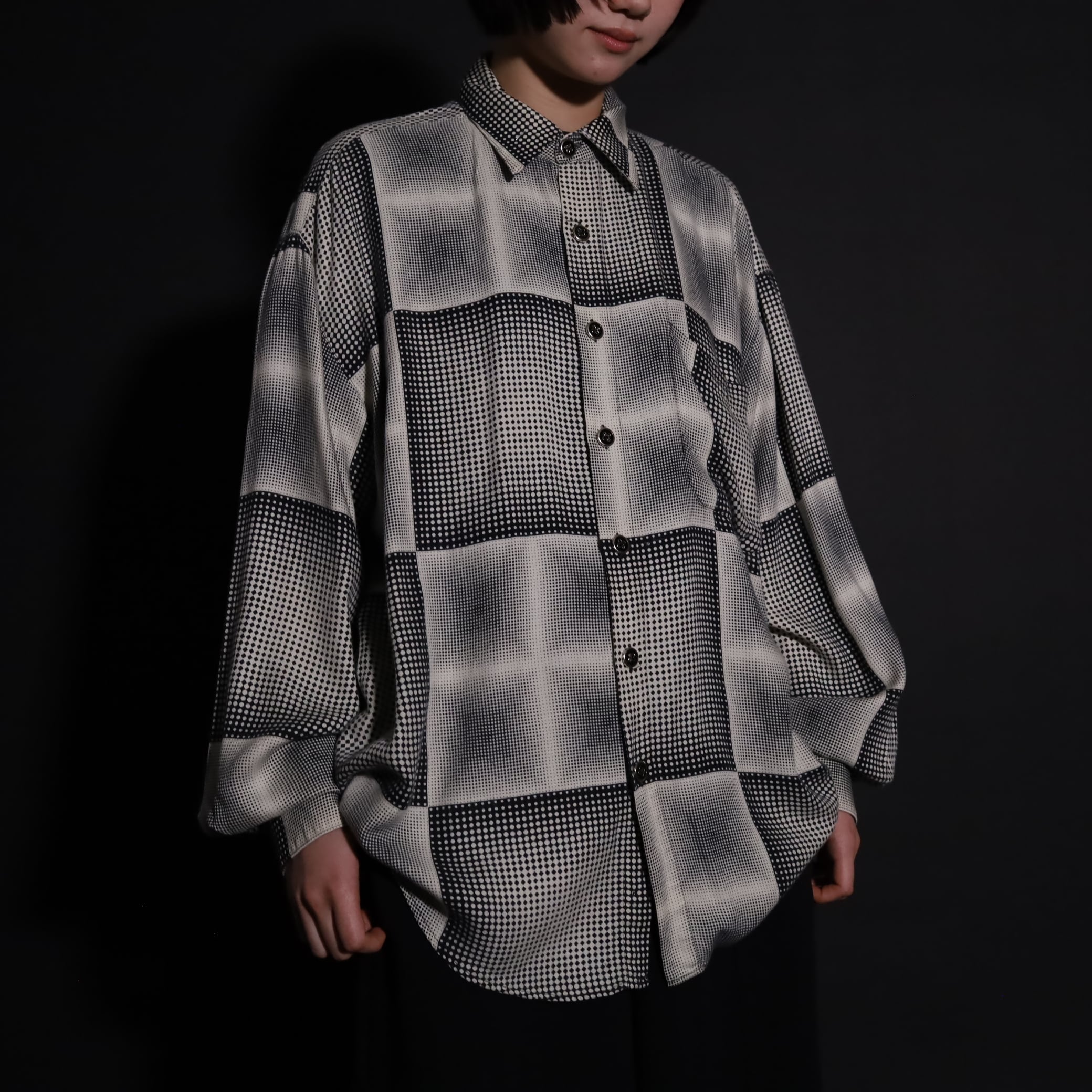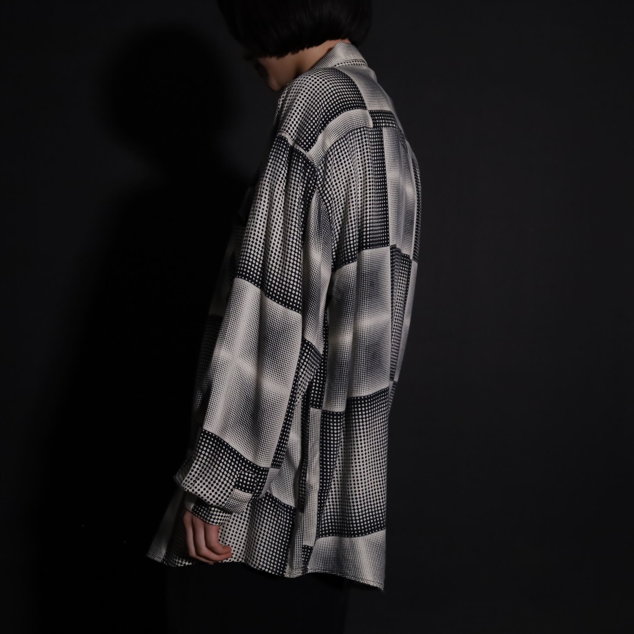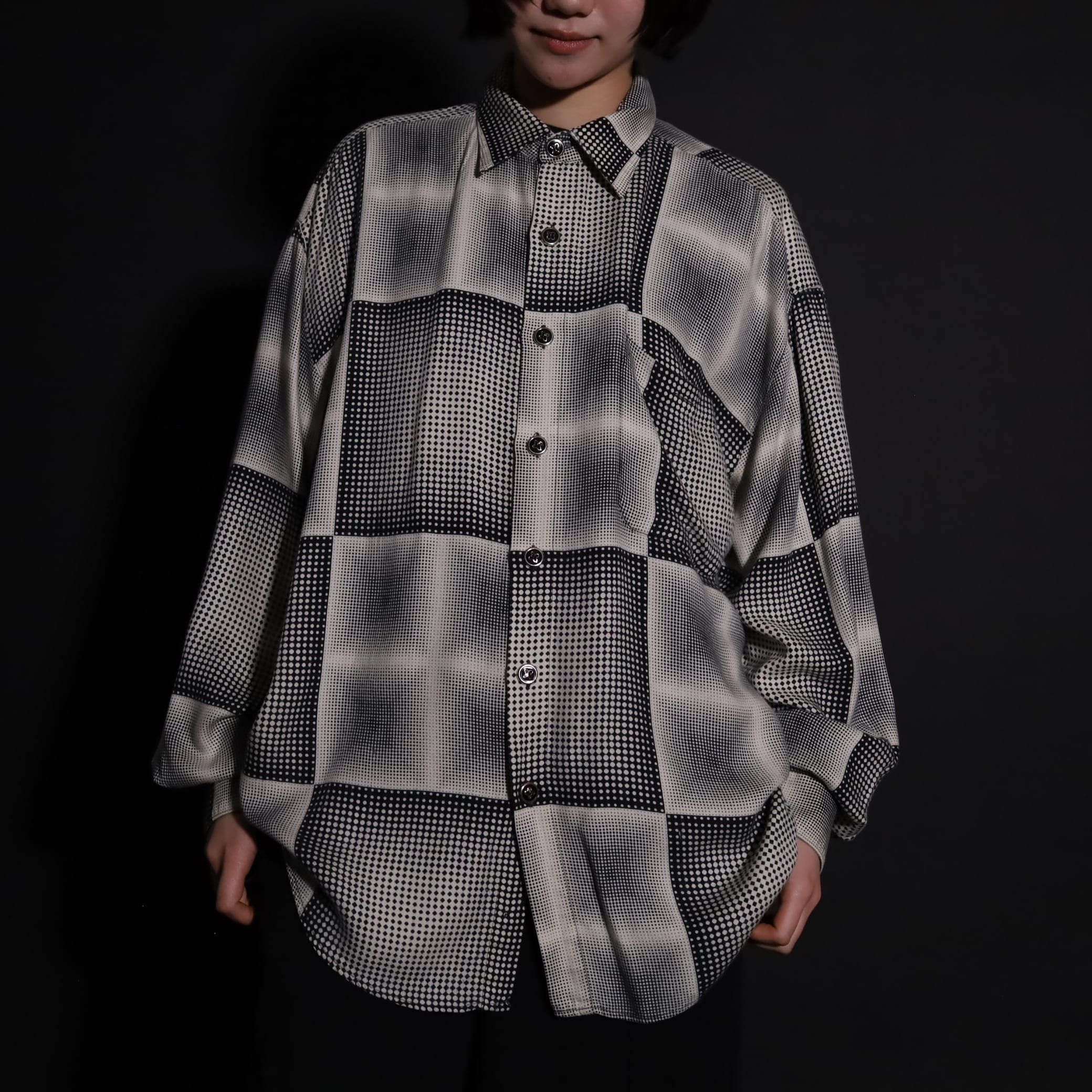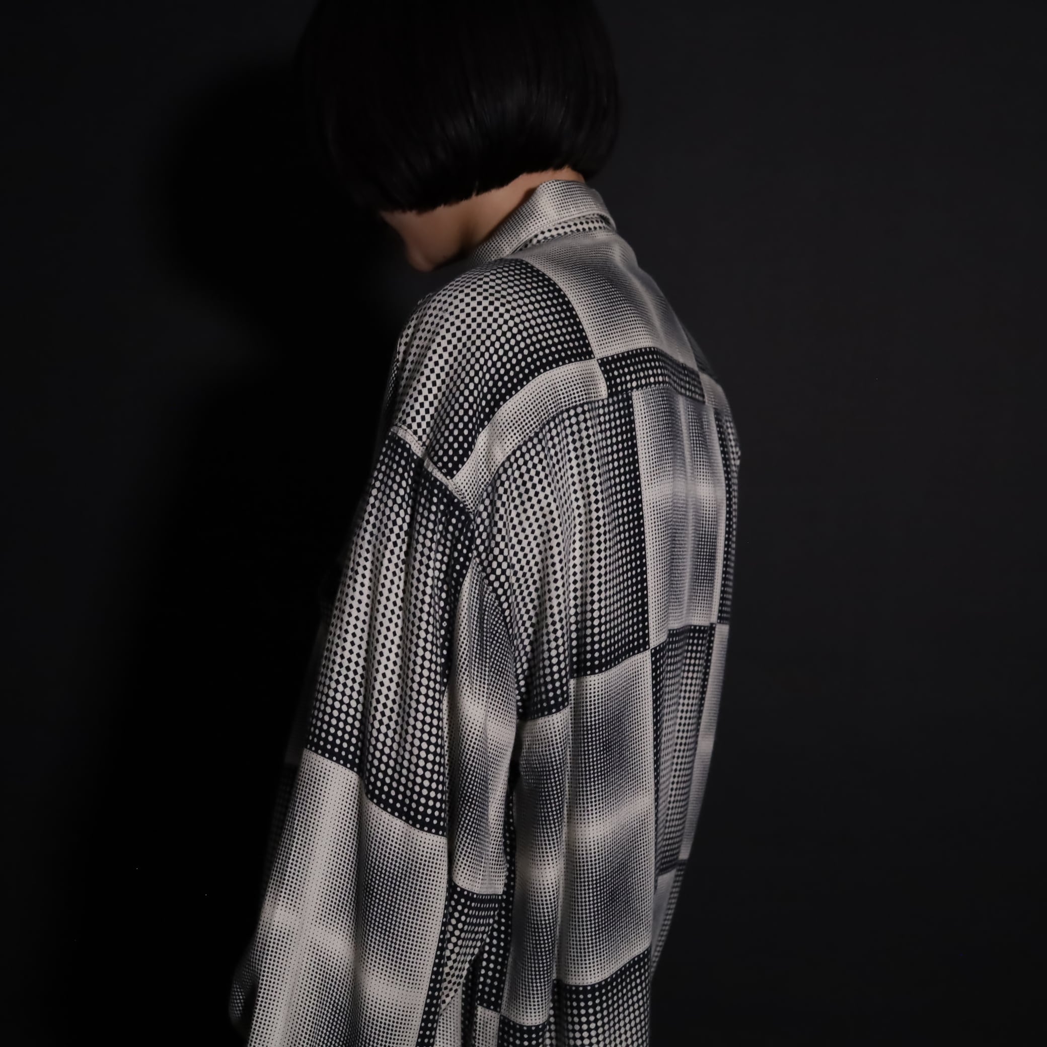 ホワイトカラーのヴィスコース100%ボディに,ブラックカラーのドット総柄デザイン.