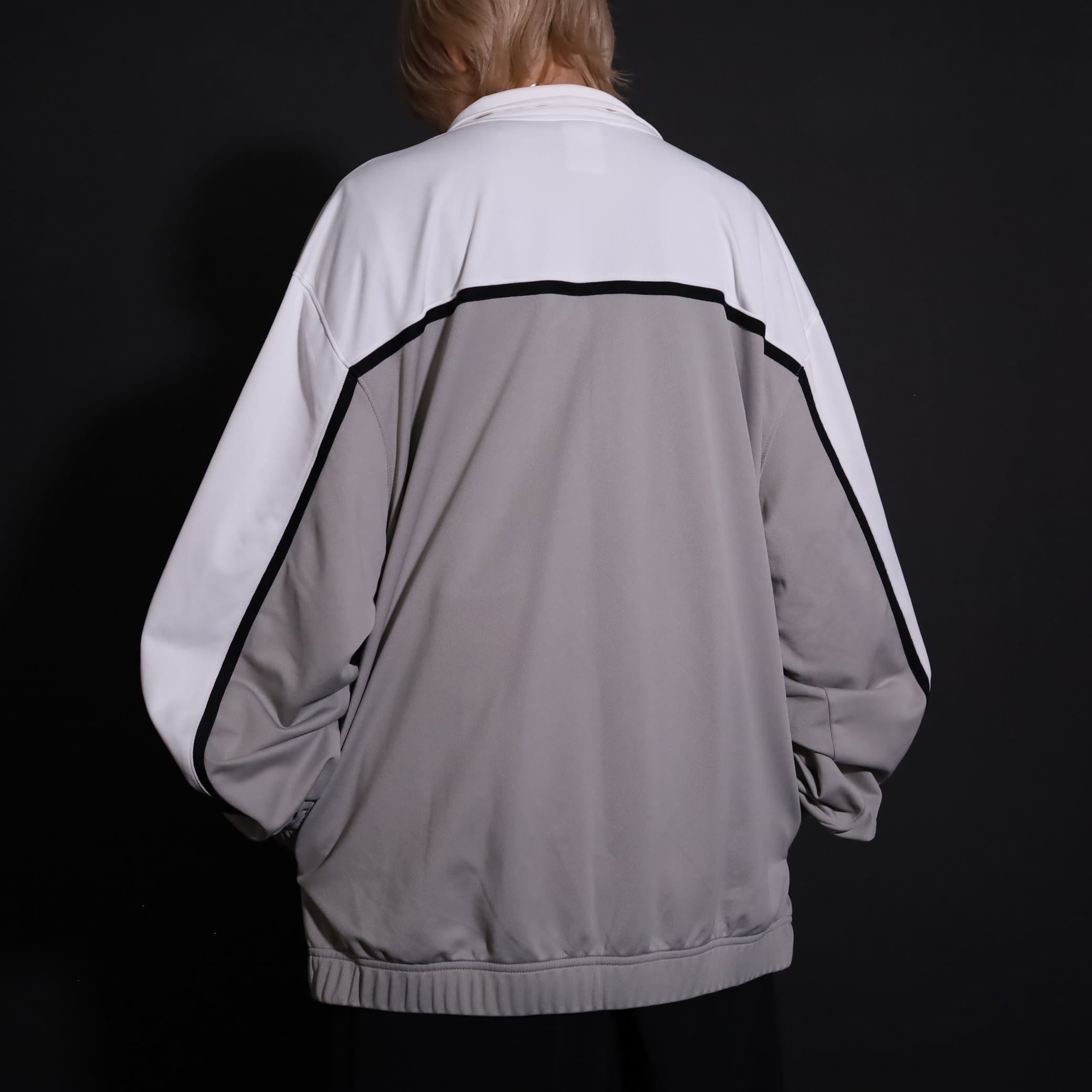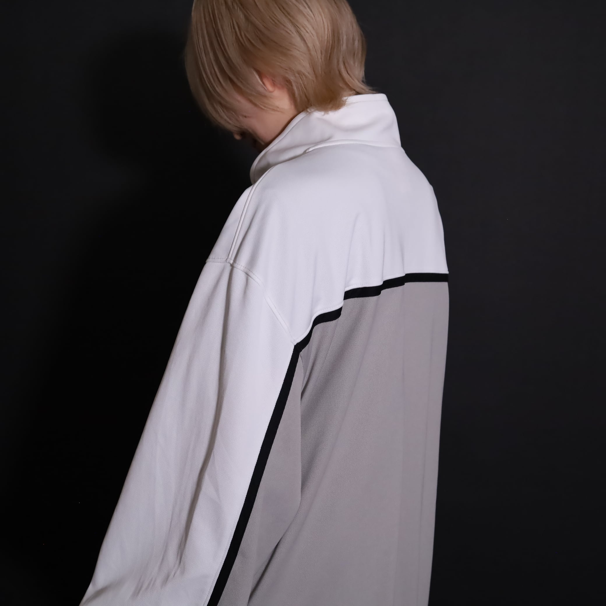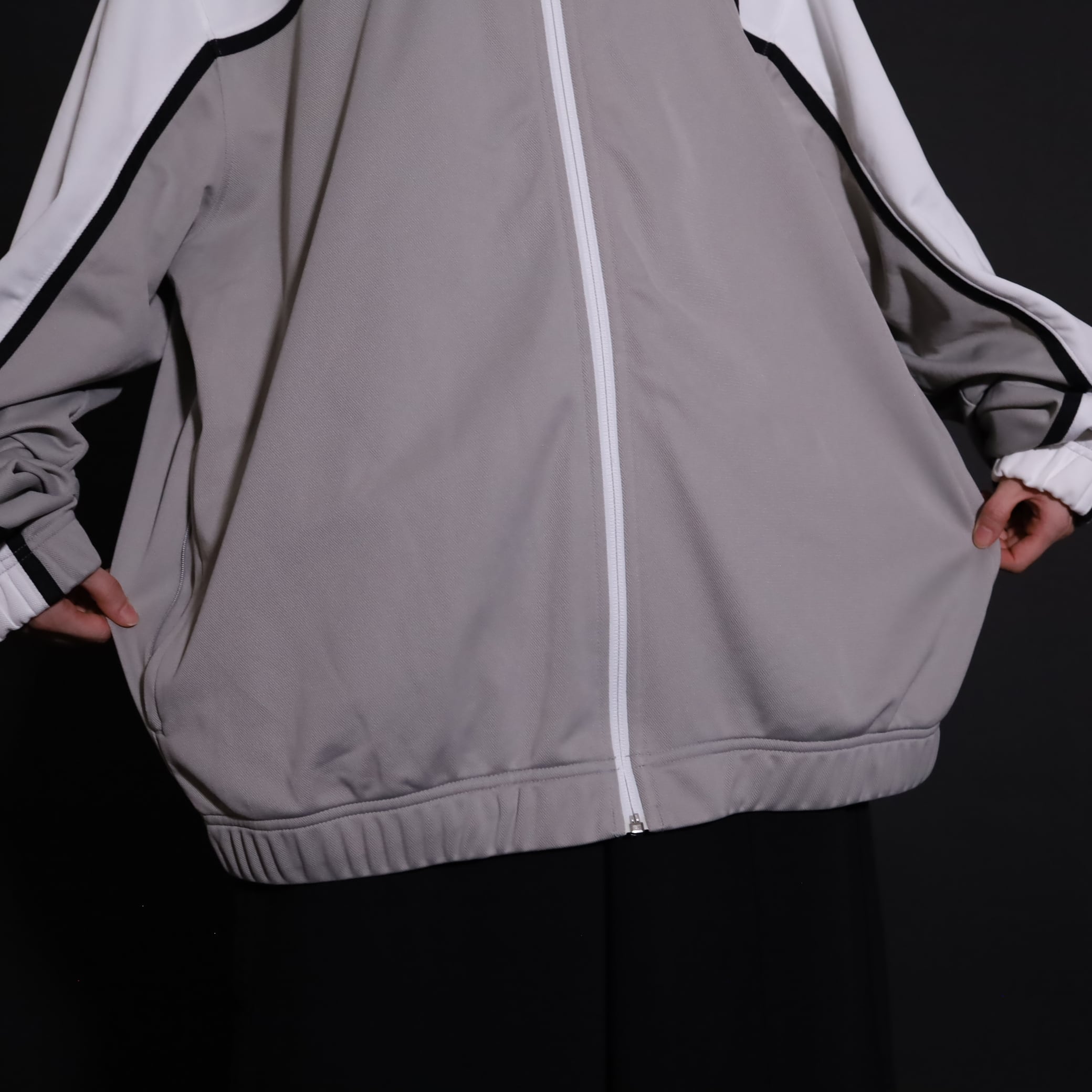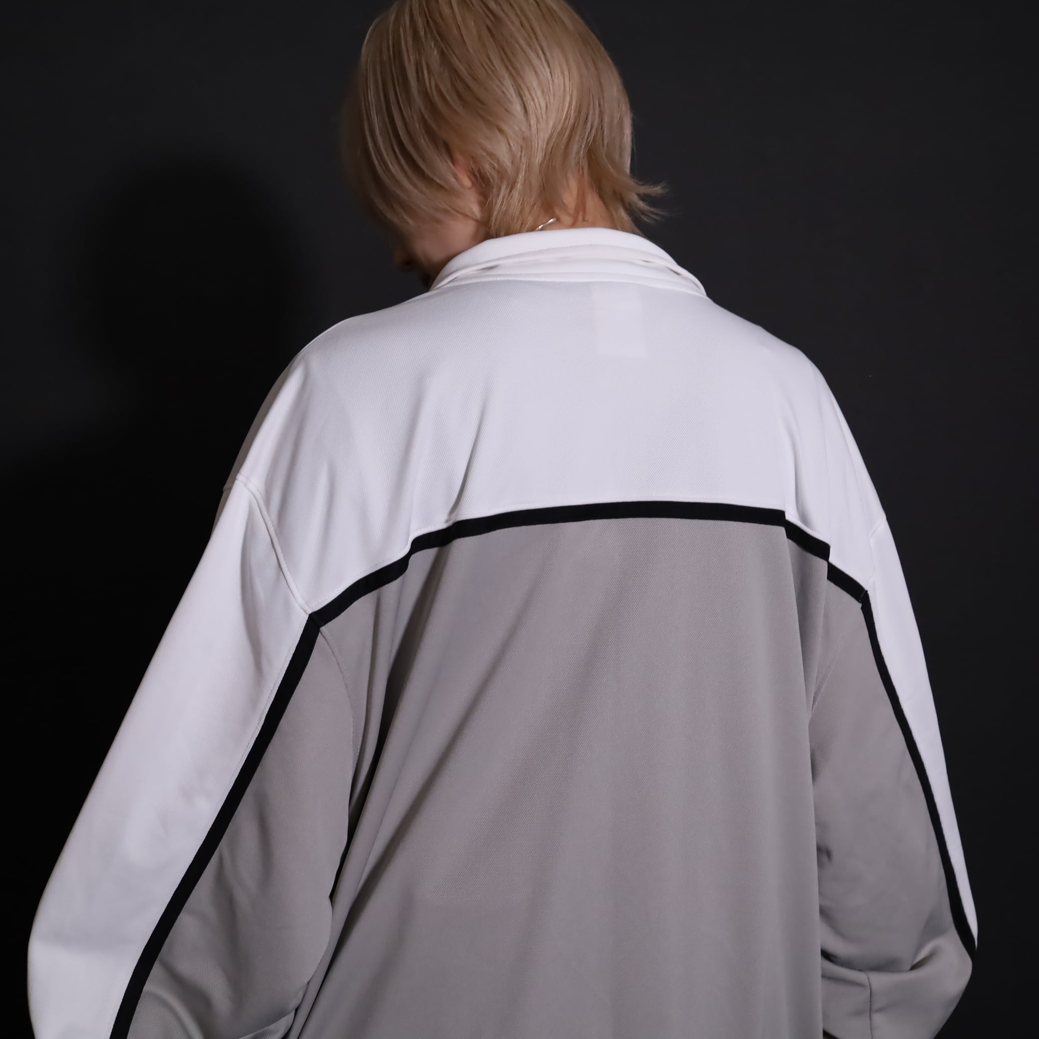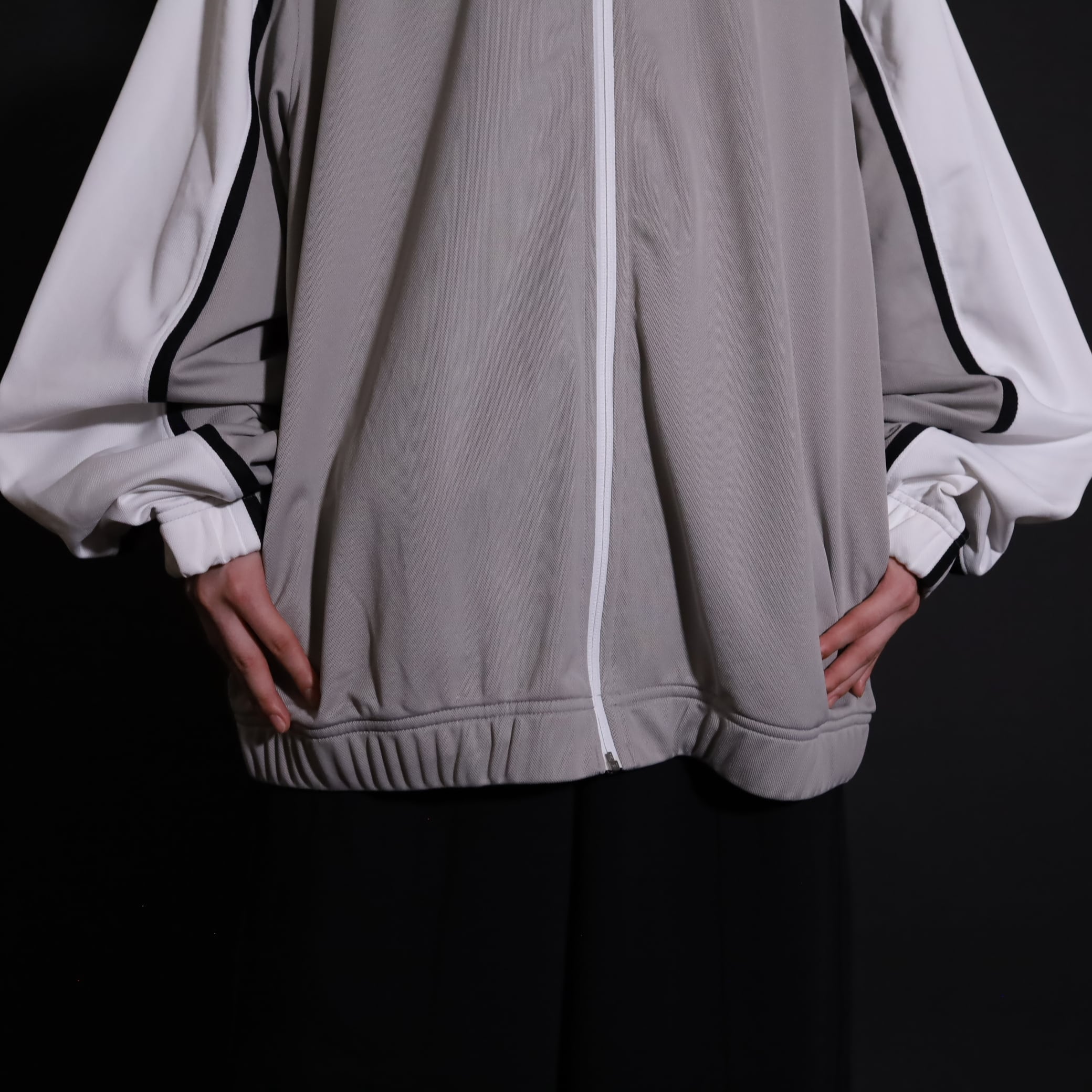 グレージュ×ホワイトのバイカラー切替に加えて,袖と身頃にブラックのラインが走ったデザイン.