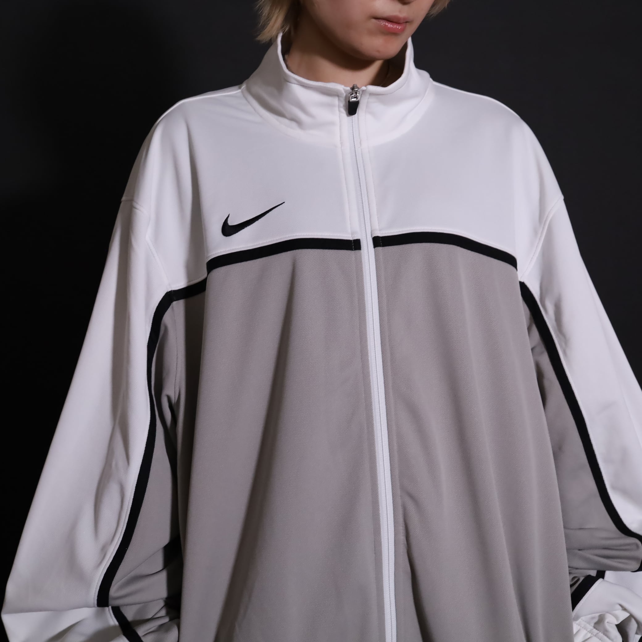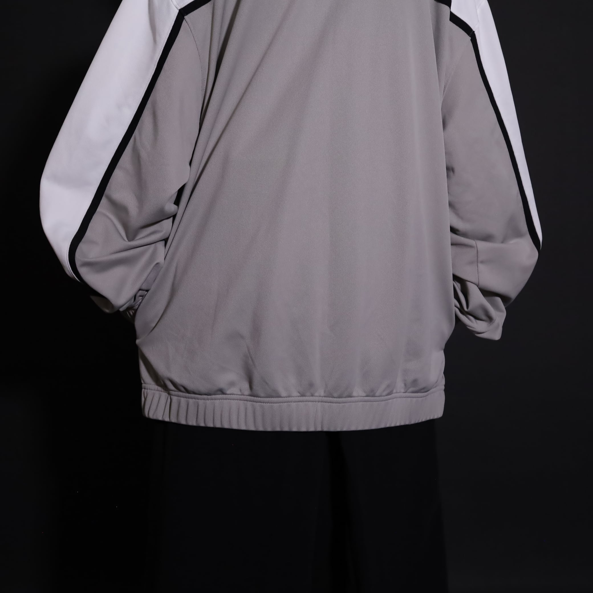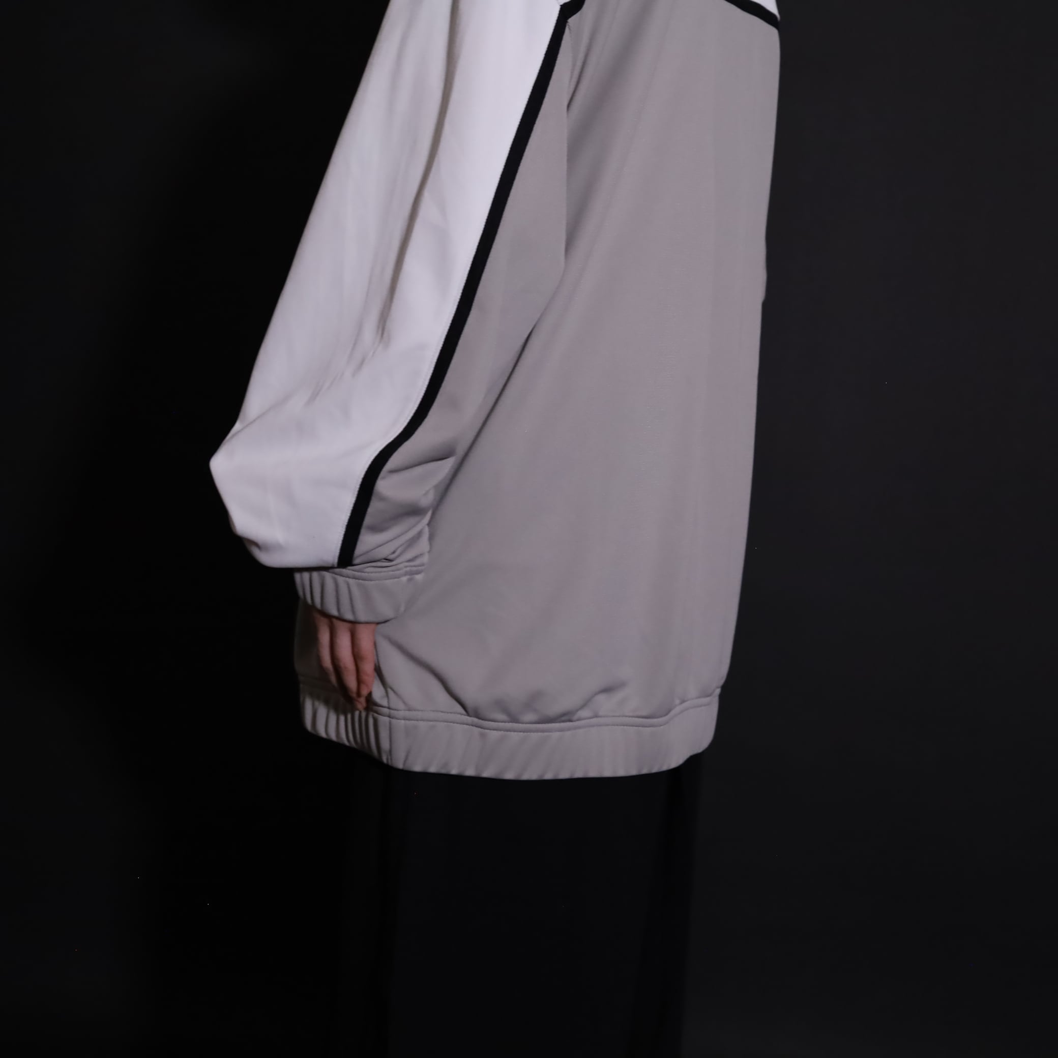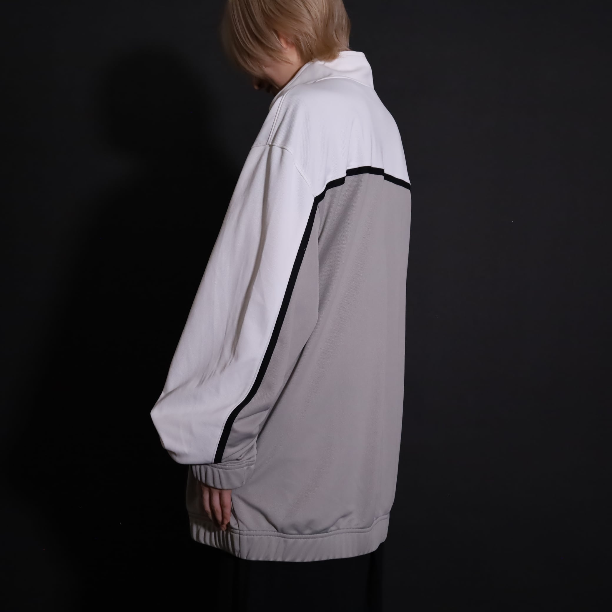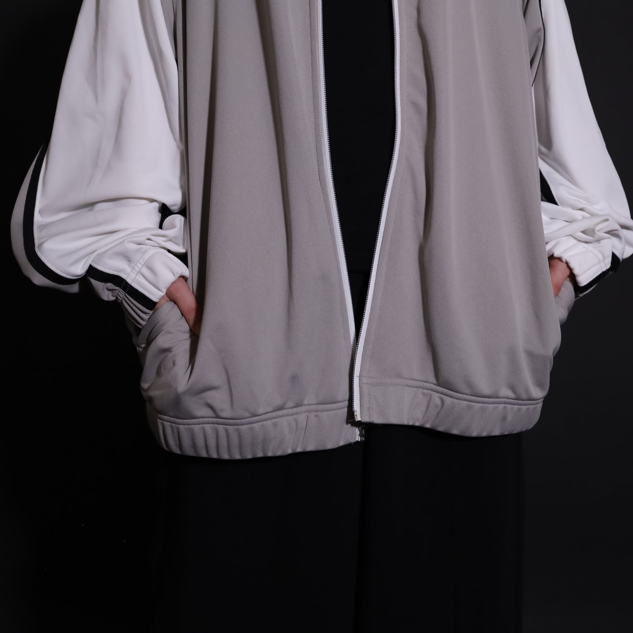 グレージュ×ホワイトのバイカラー切替に加えて,袖と身頃にブラックのラインが走ったデザイン.
