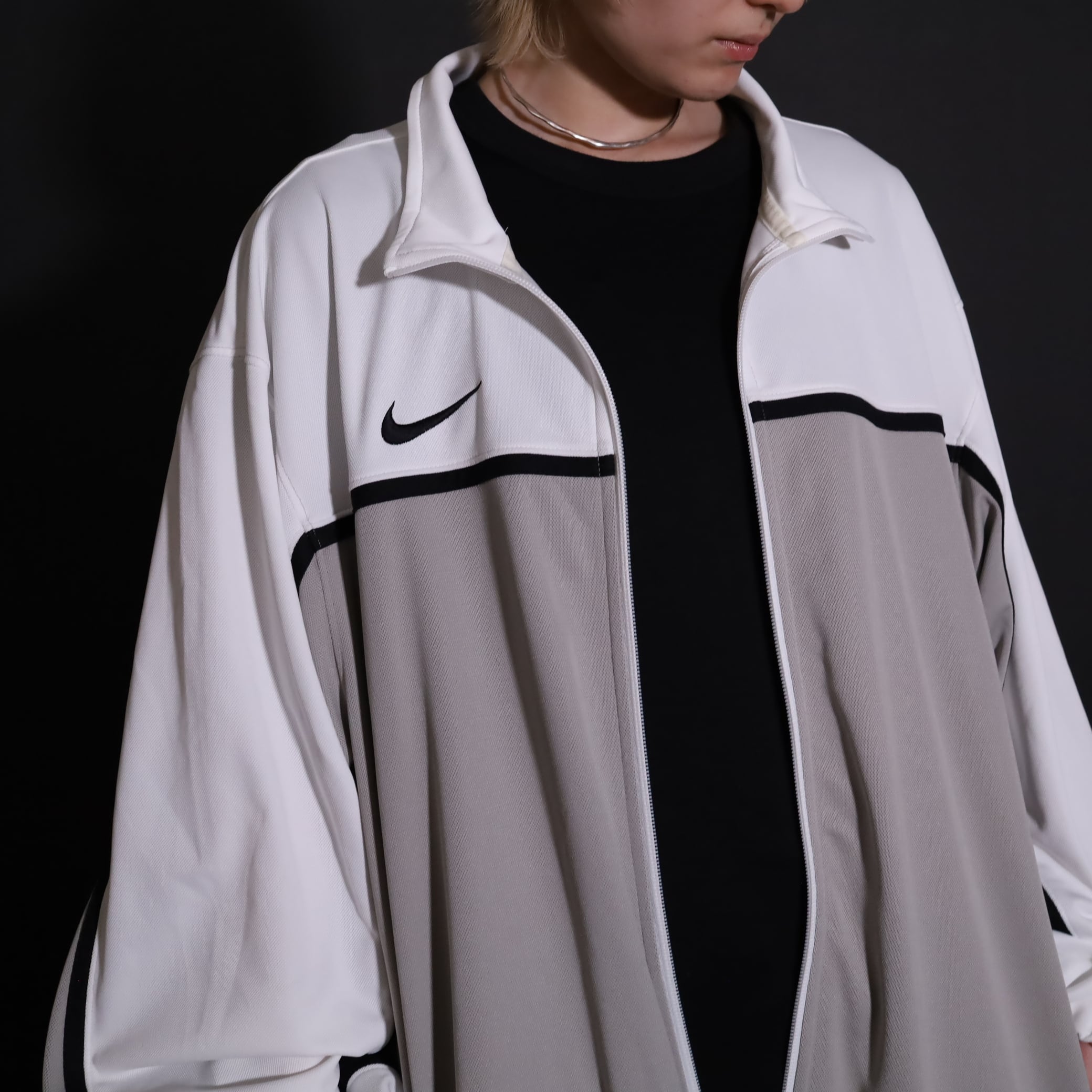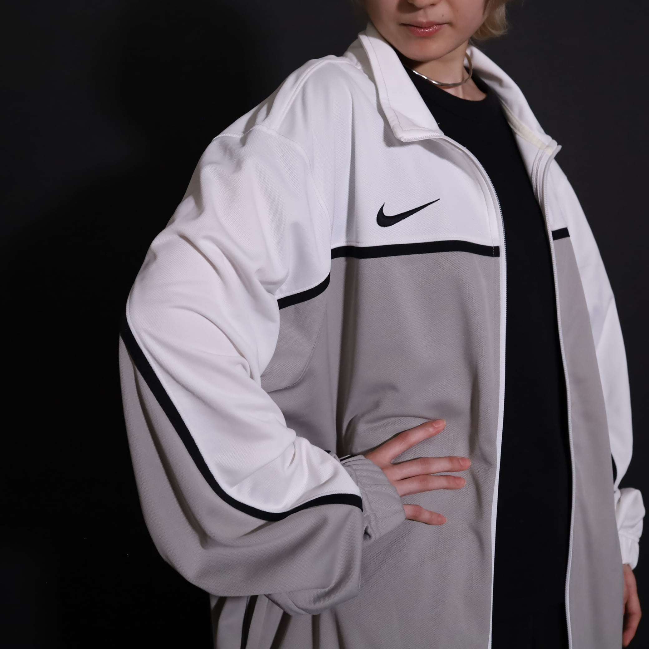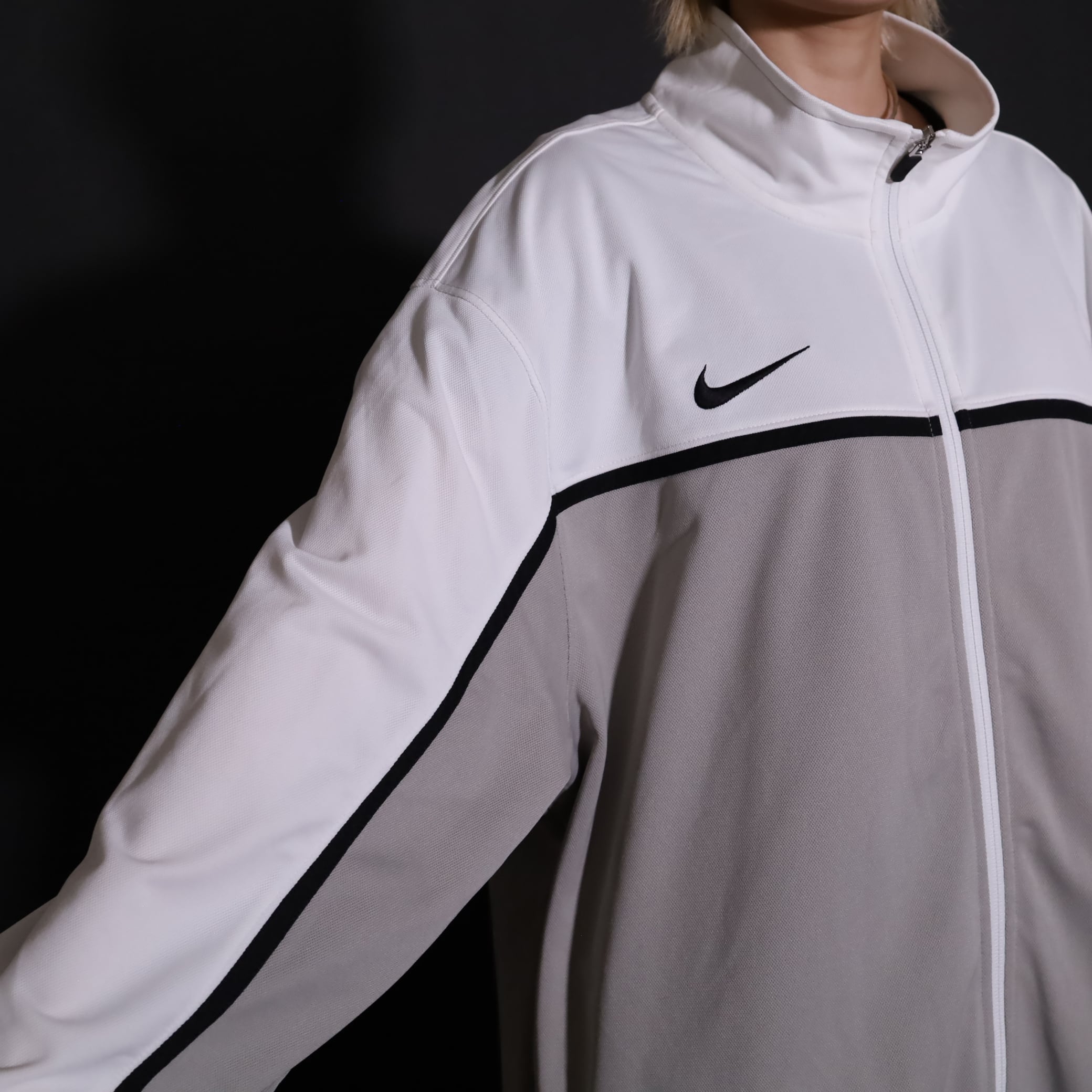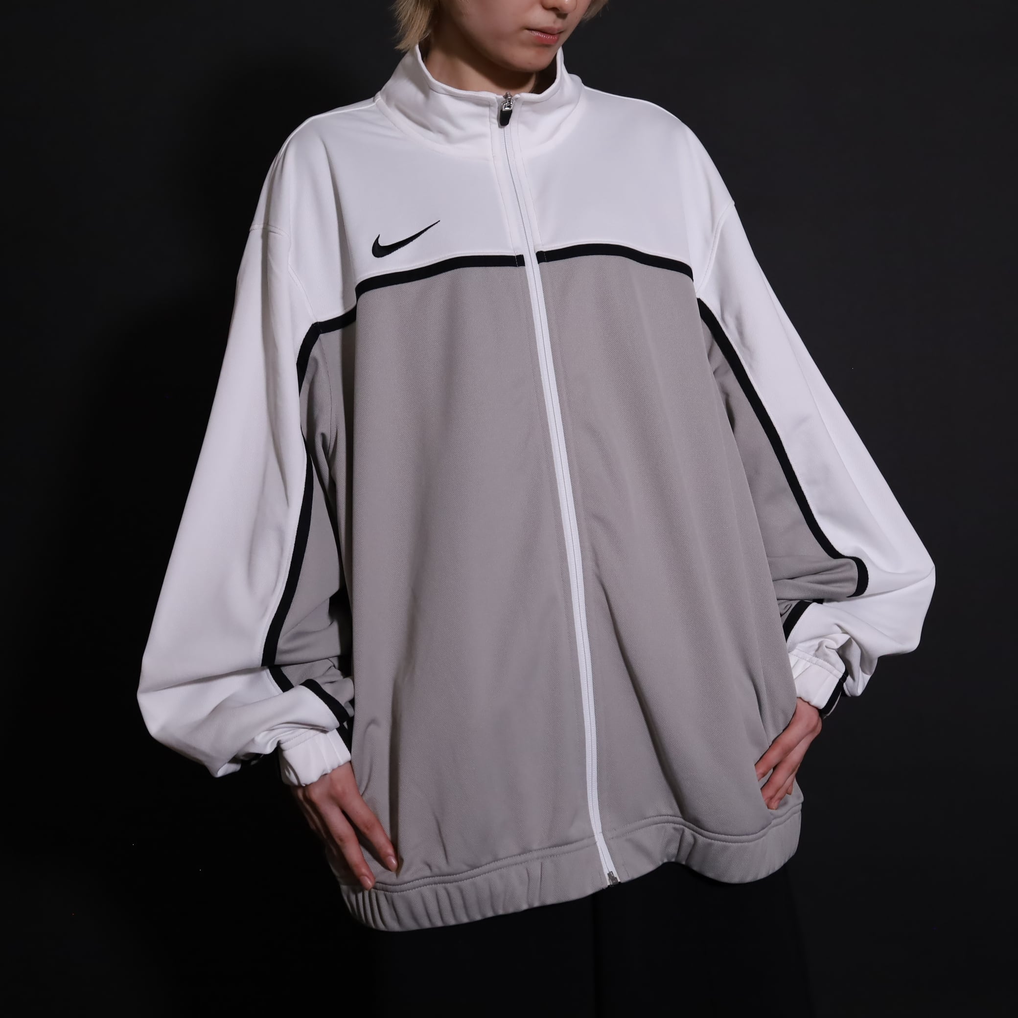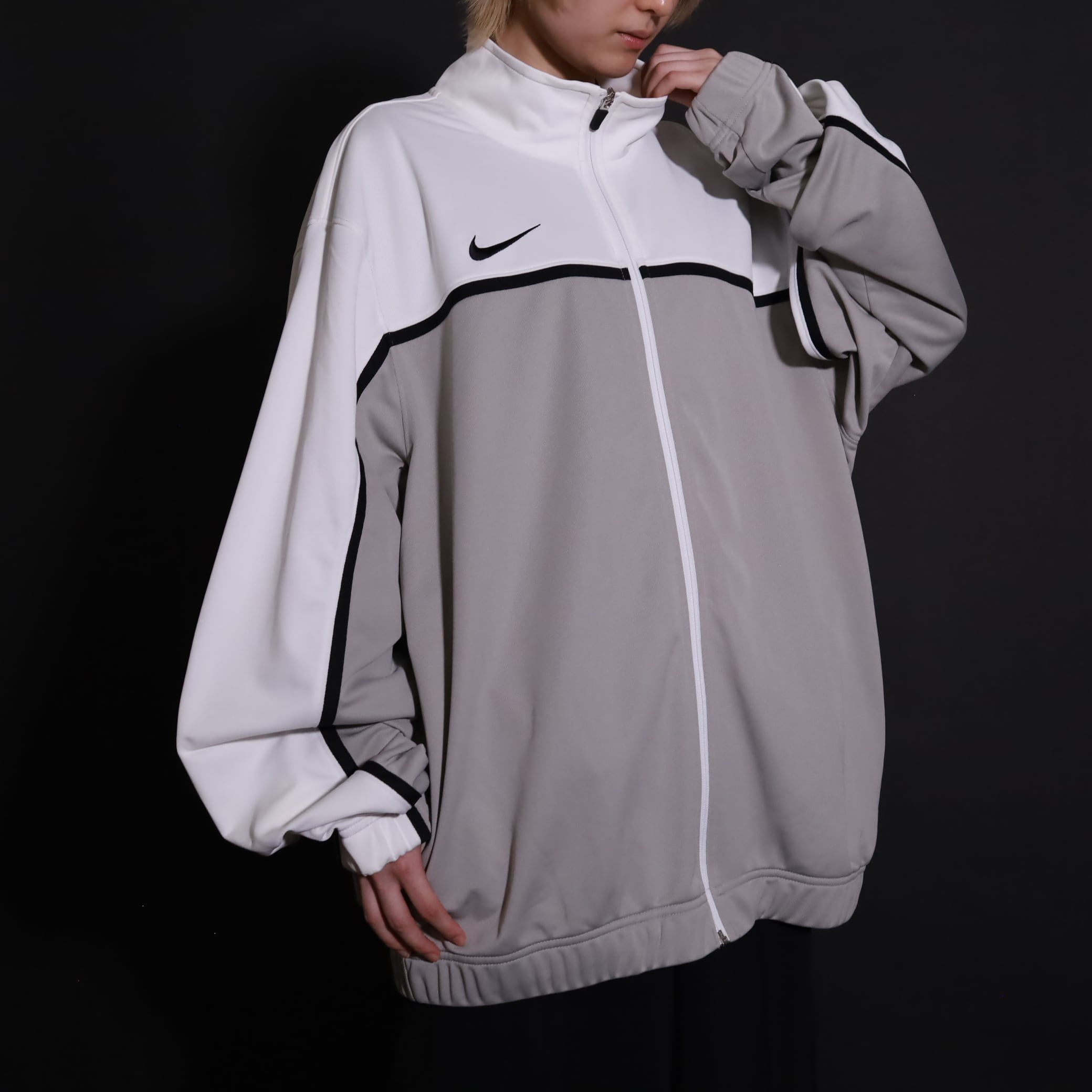 グレージュ×ホワイトのバイカラー切替に加えて,袖と身頃にブラックのラインが走ったデザイン.