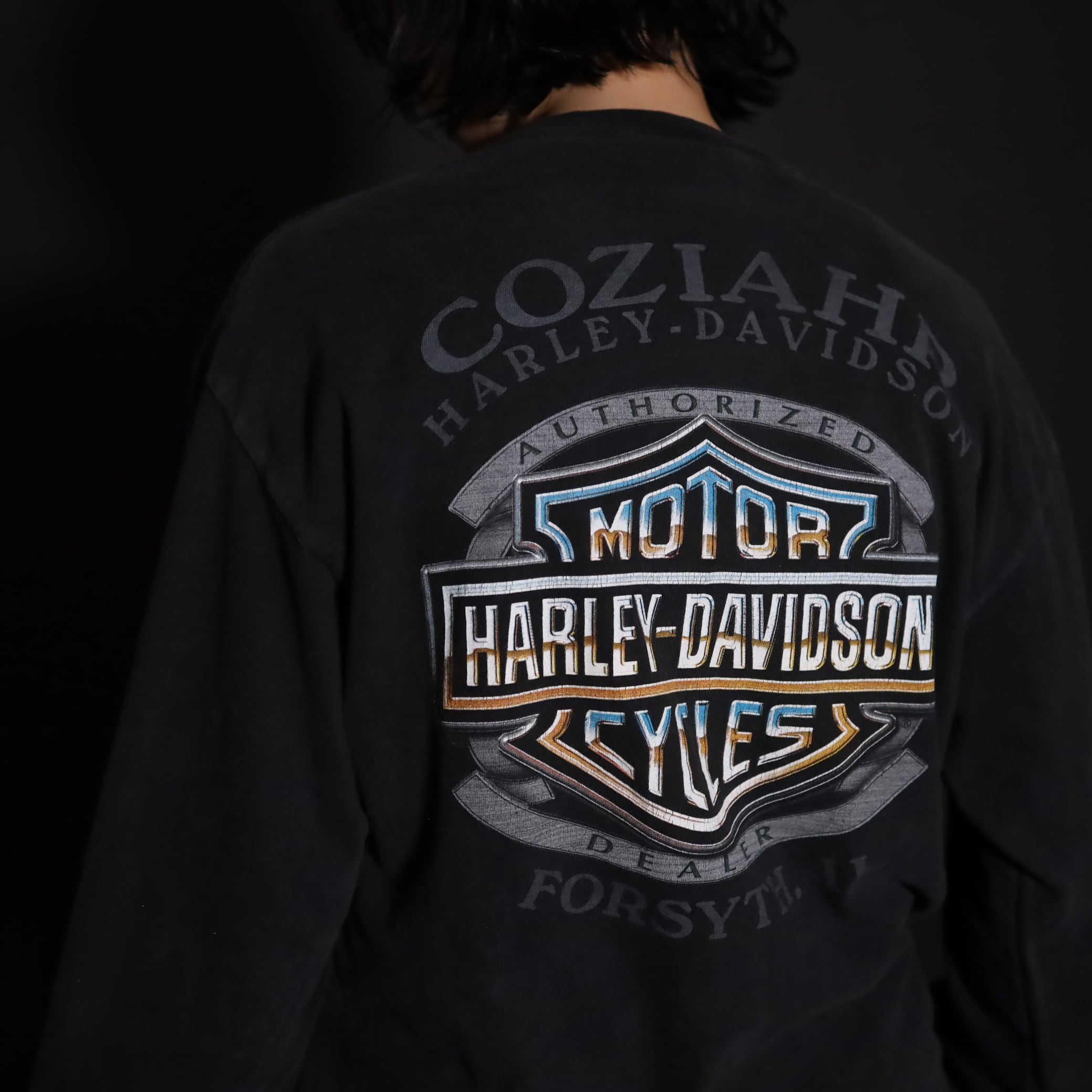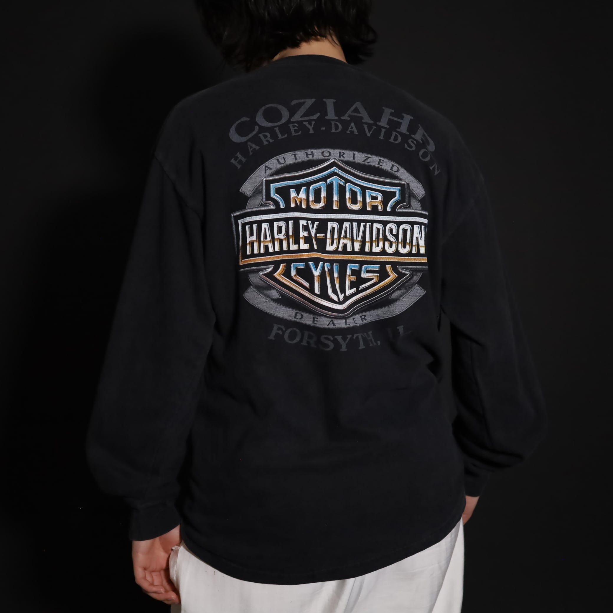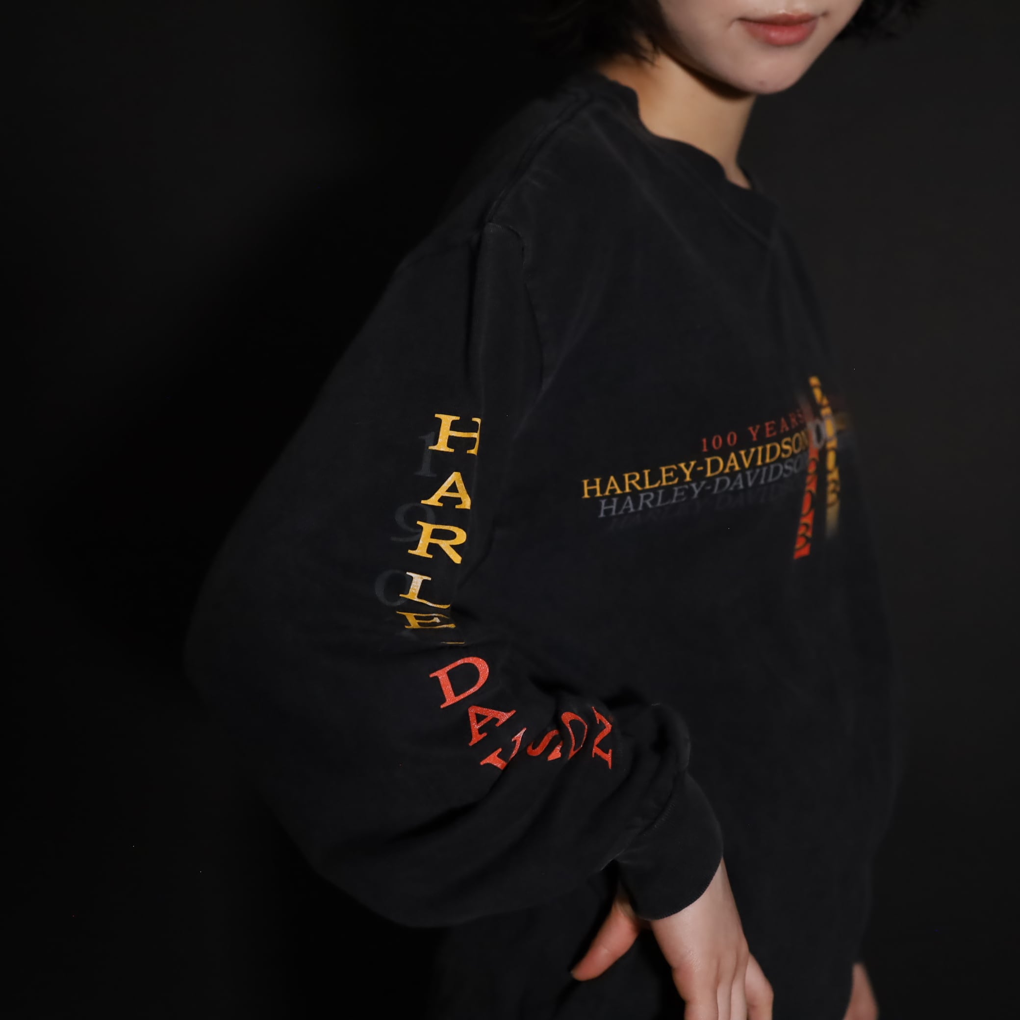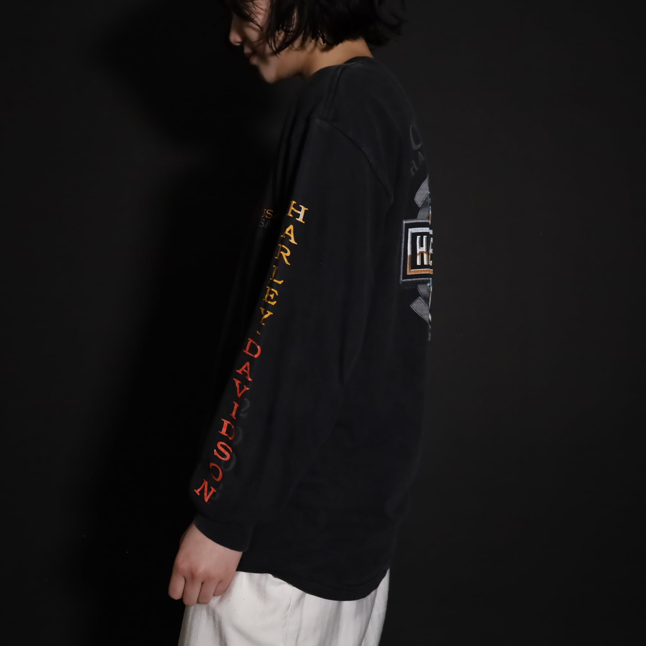 フロント,バッグ,スリーブそれぞれ,箇所によって異なるHARLEY DAVIDSONプリント.