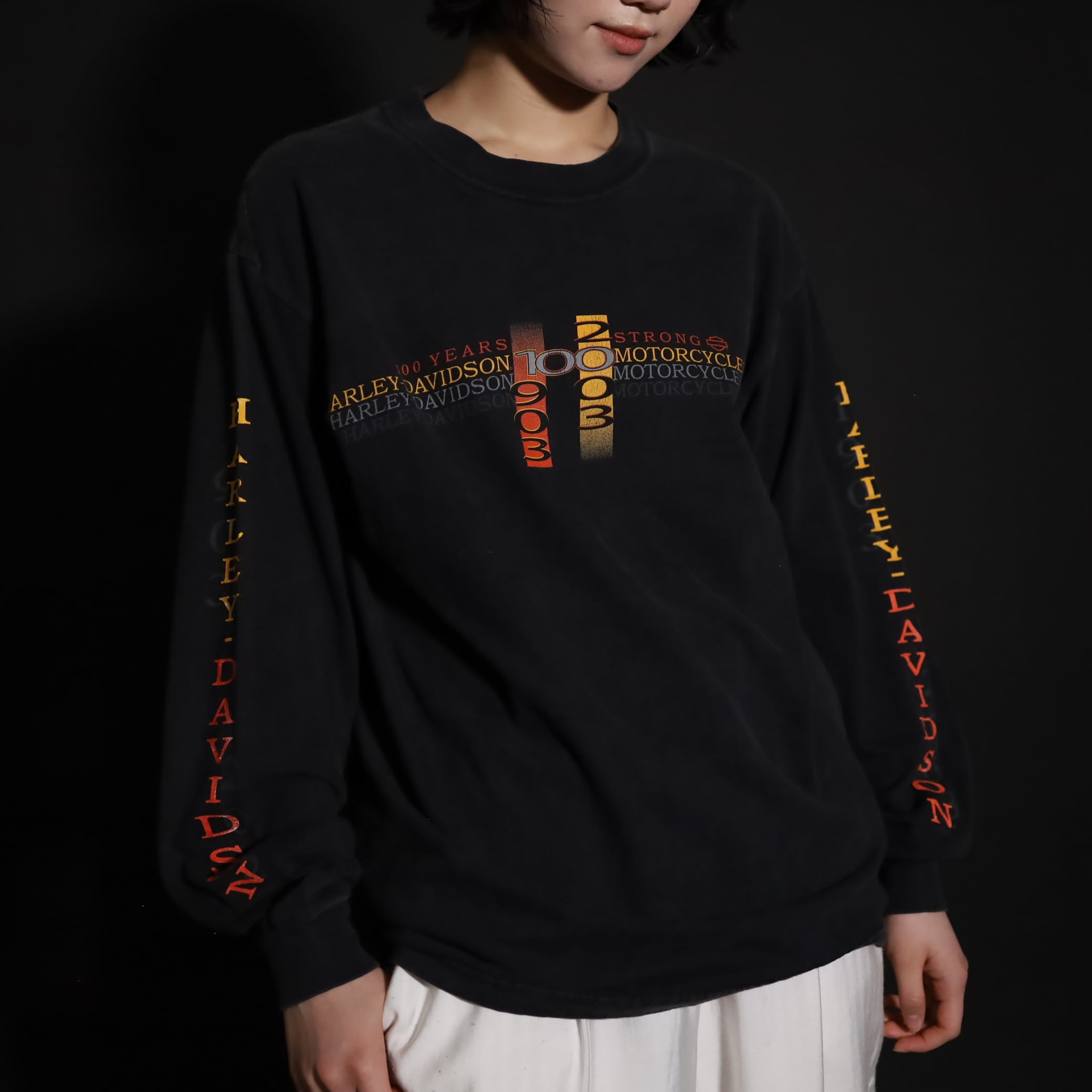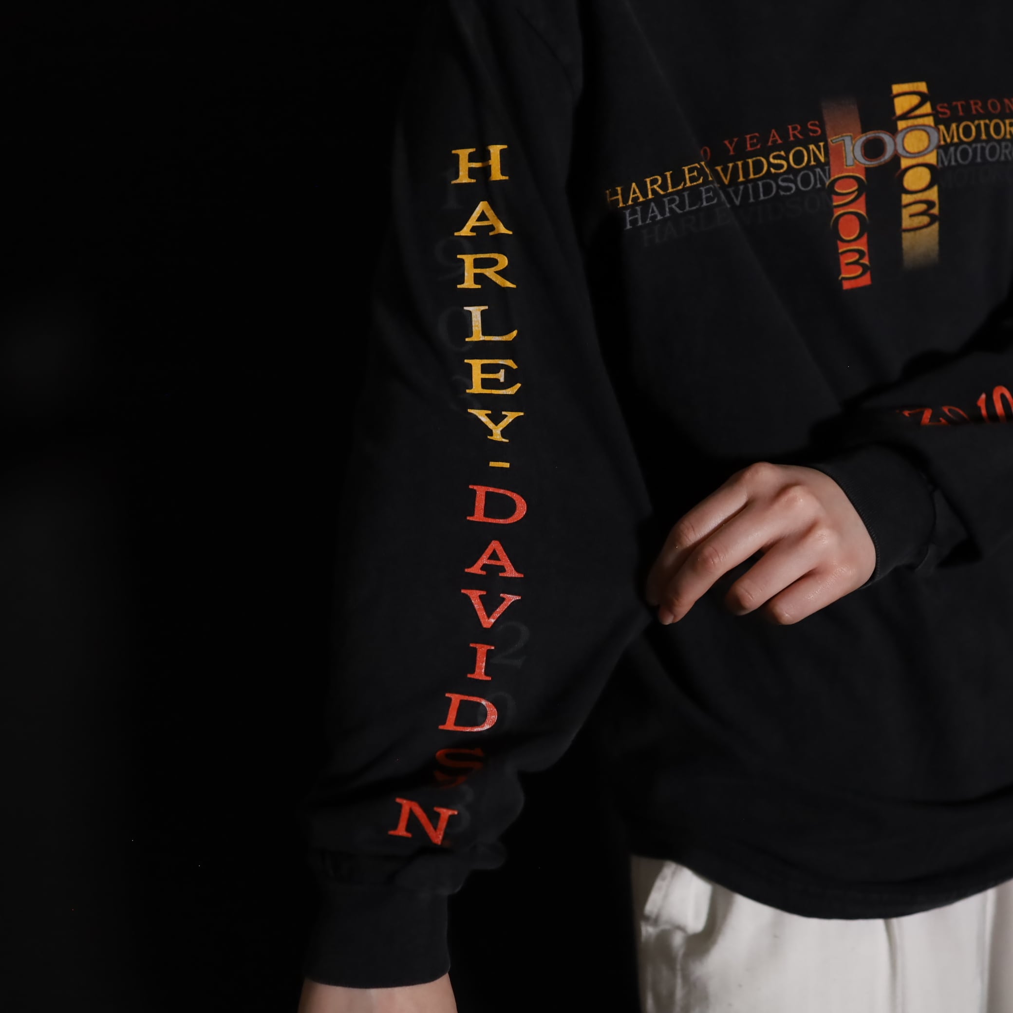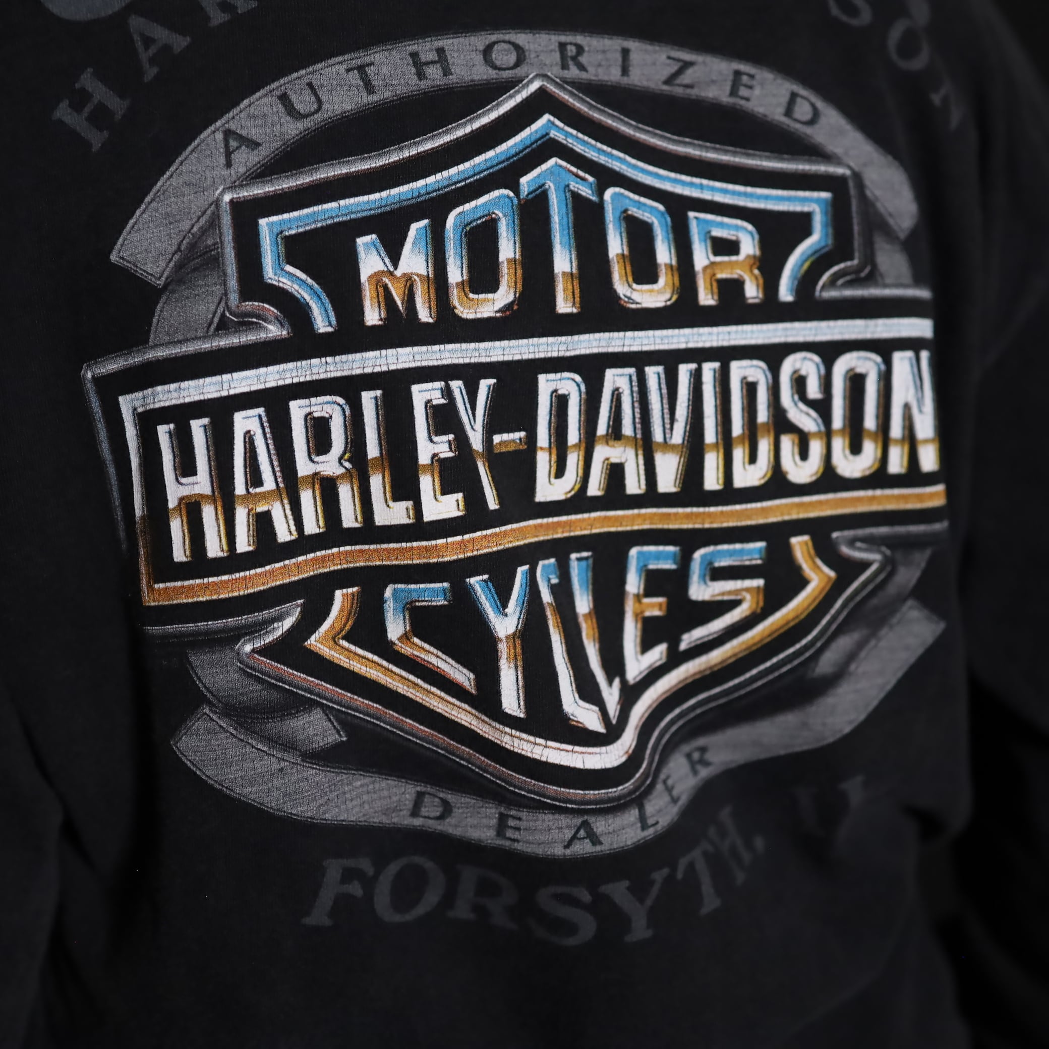フロント,バッグ,スリーブそれぞれ,箇所によって異なるHARLEY DAVIDSONプリント.