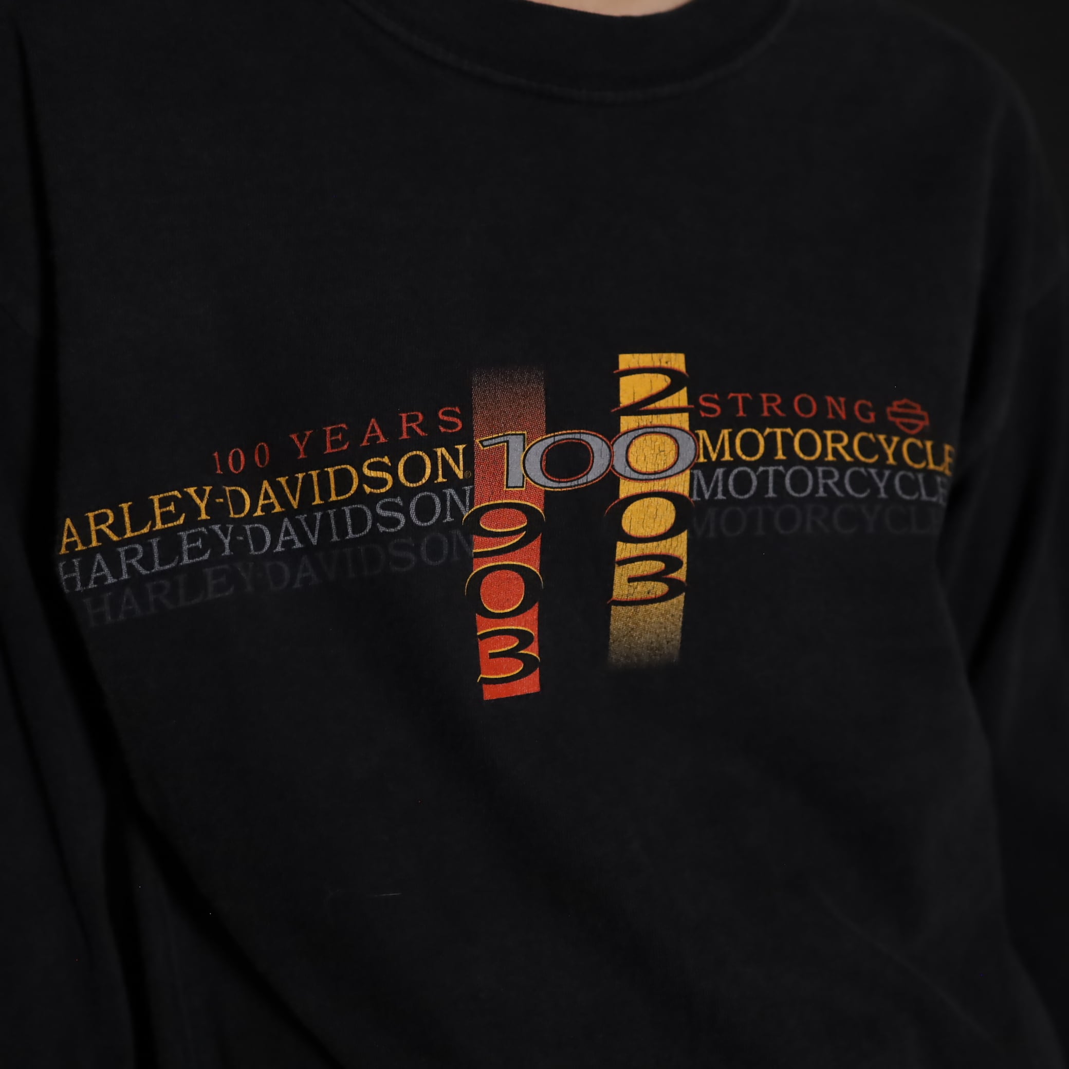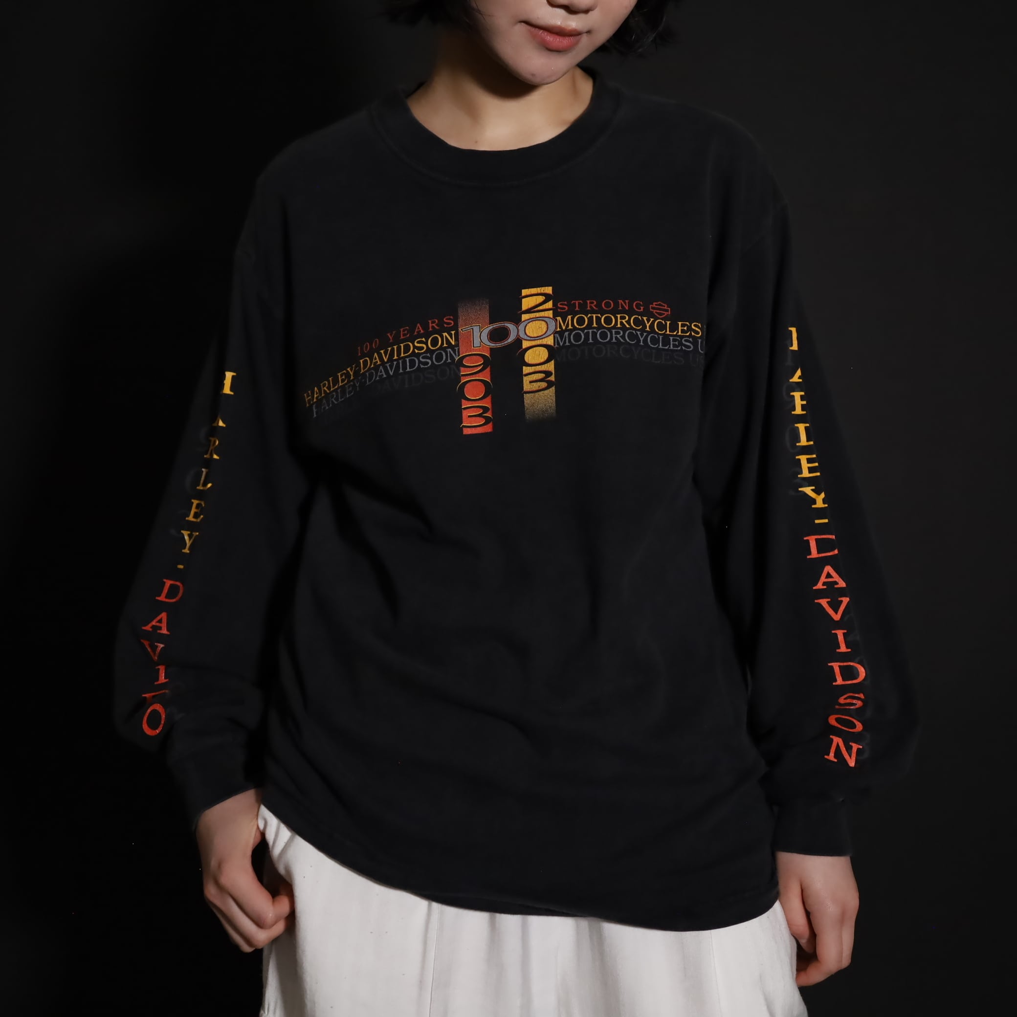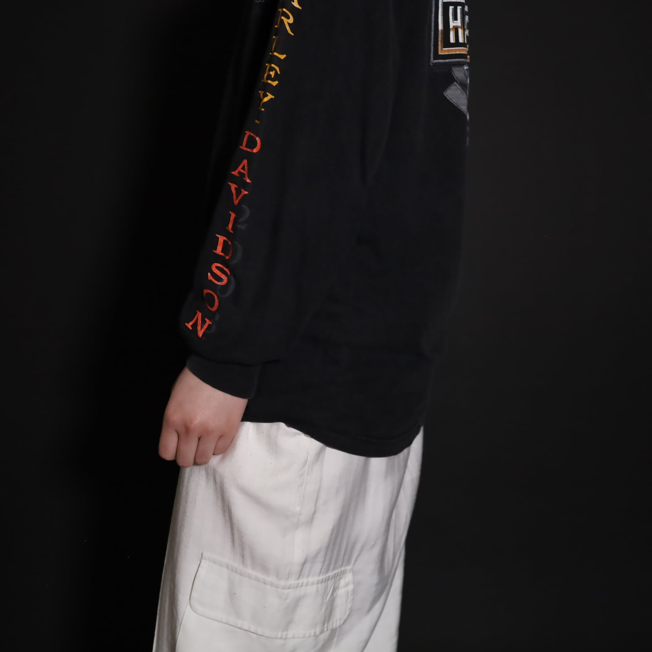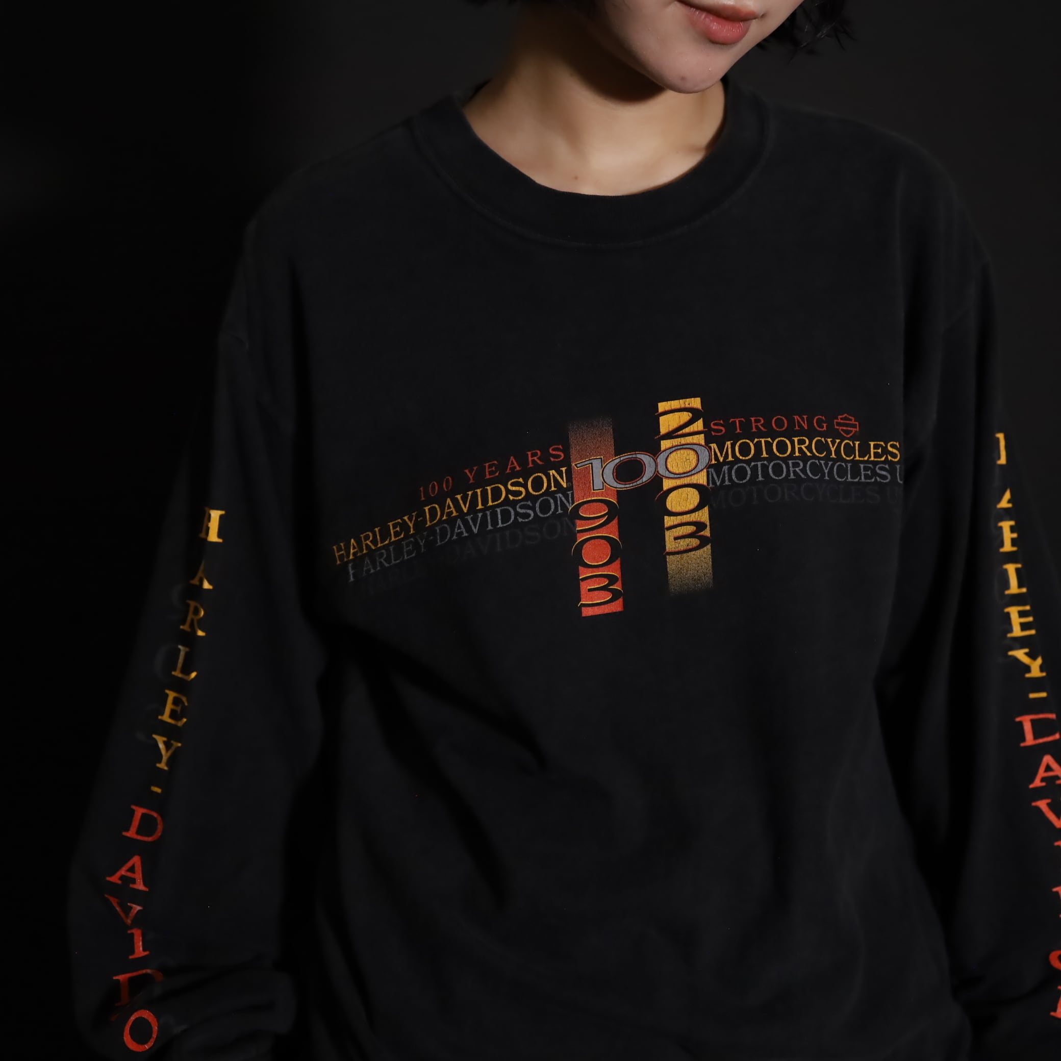 フロント,バッグ,スリーブそれぞれ,箇所によって異なるHARLEY DAVIDSONプリント.