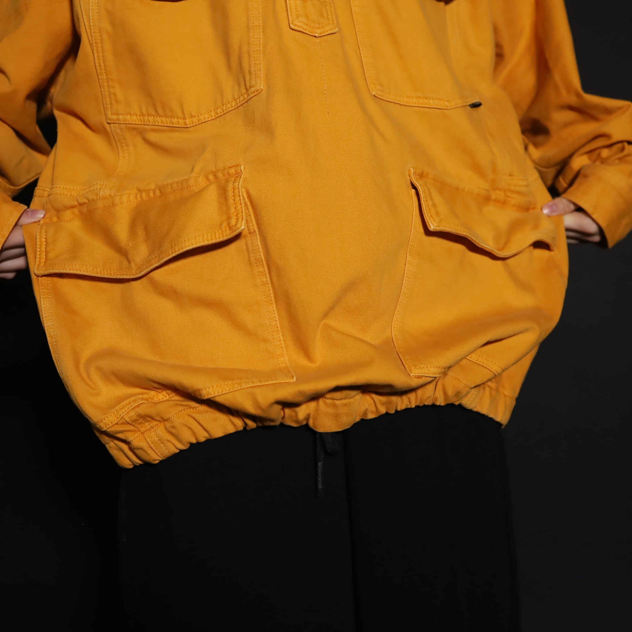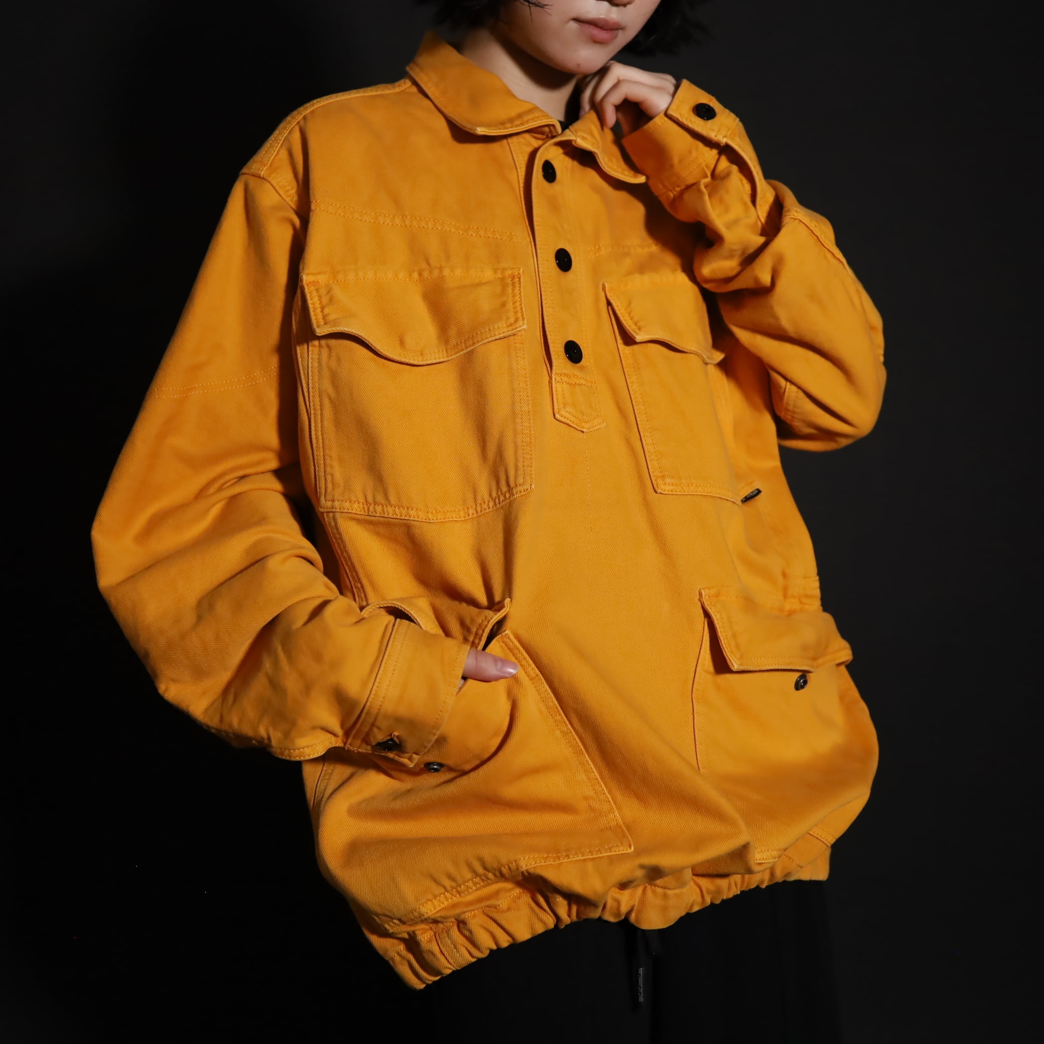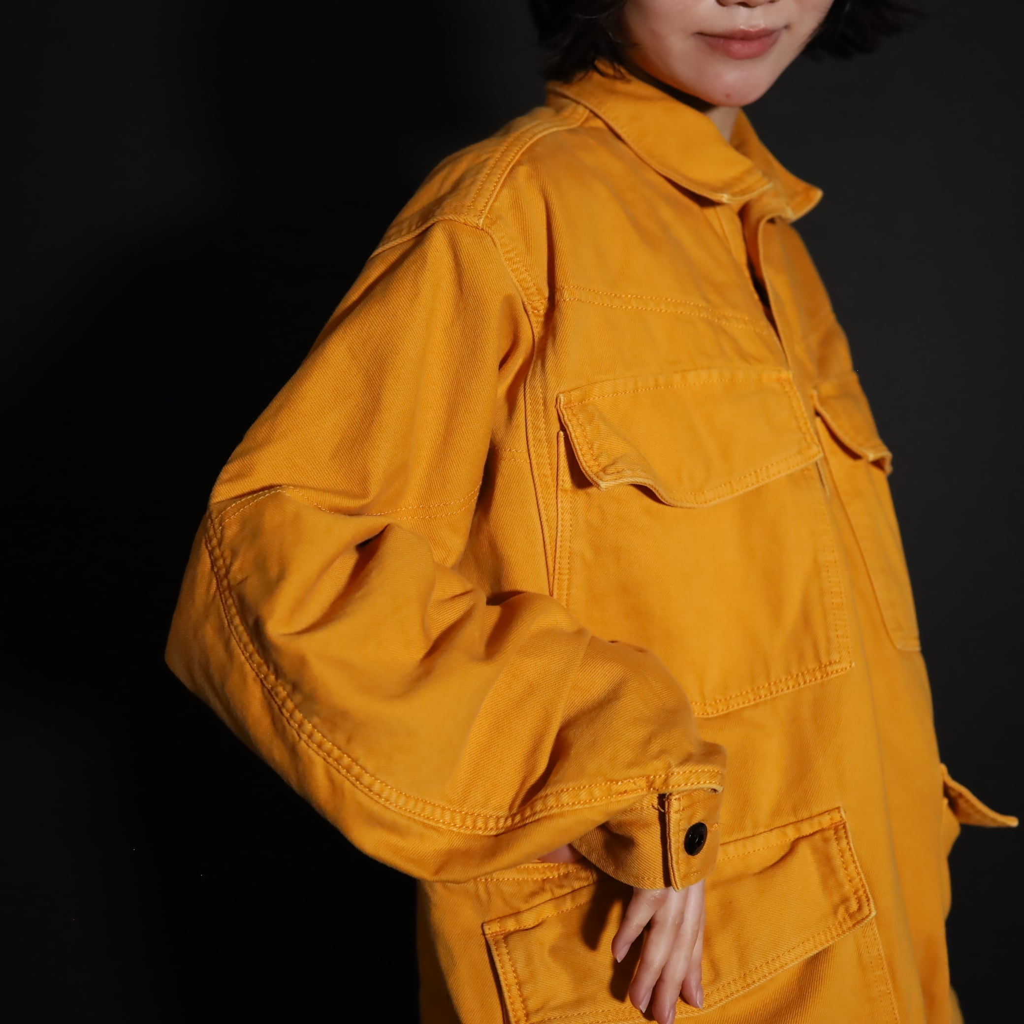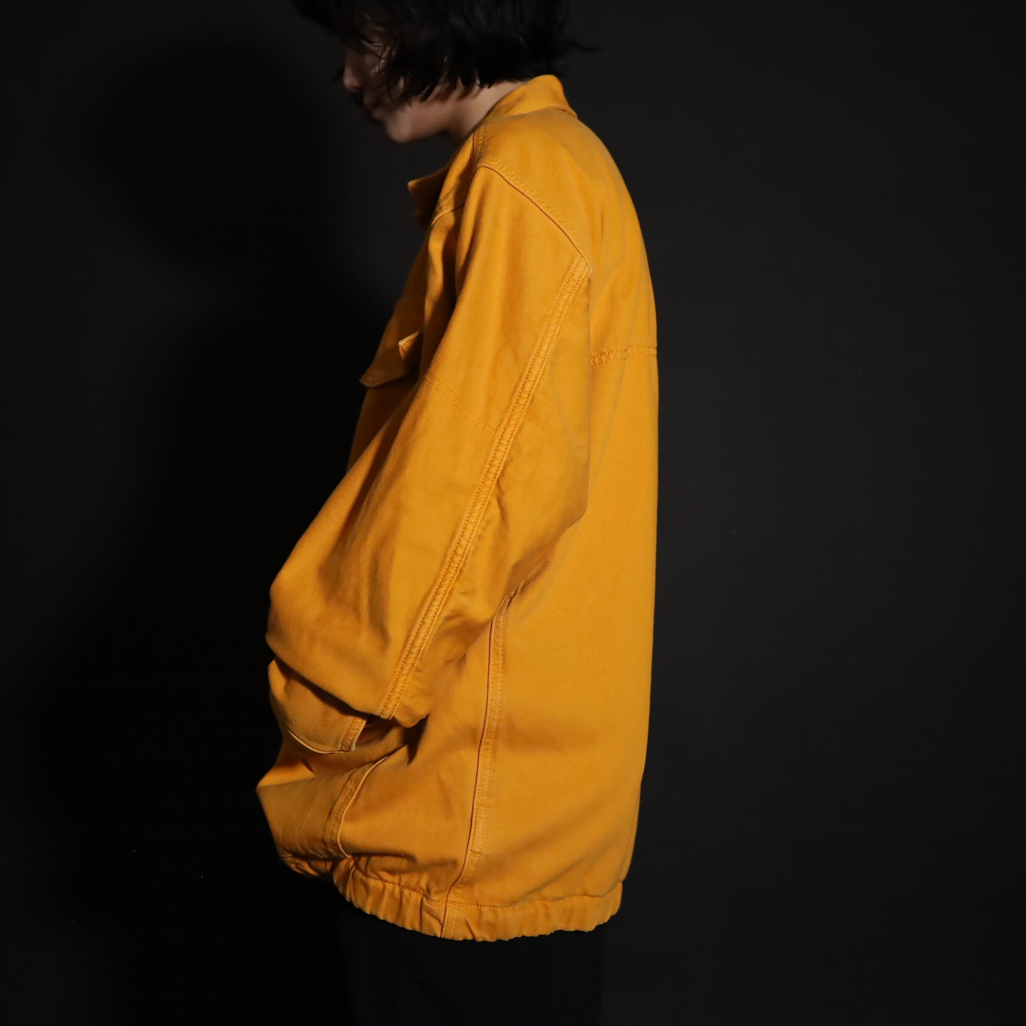 マスタードカラーのコットン×ポリ混紡デニム.