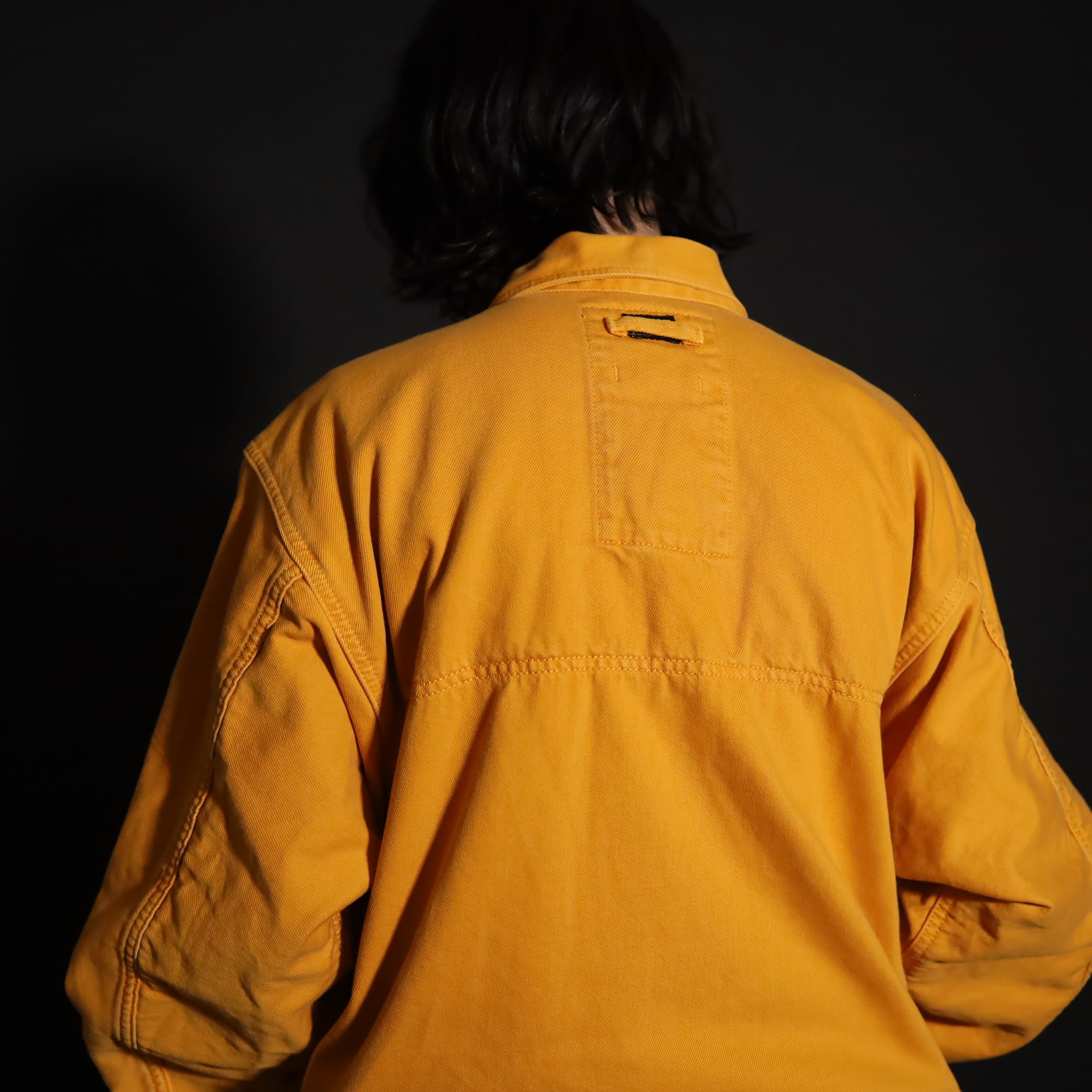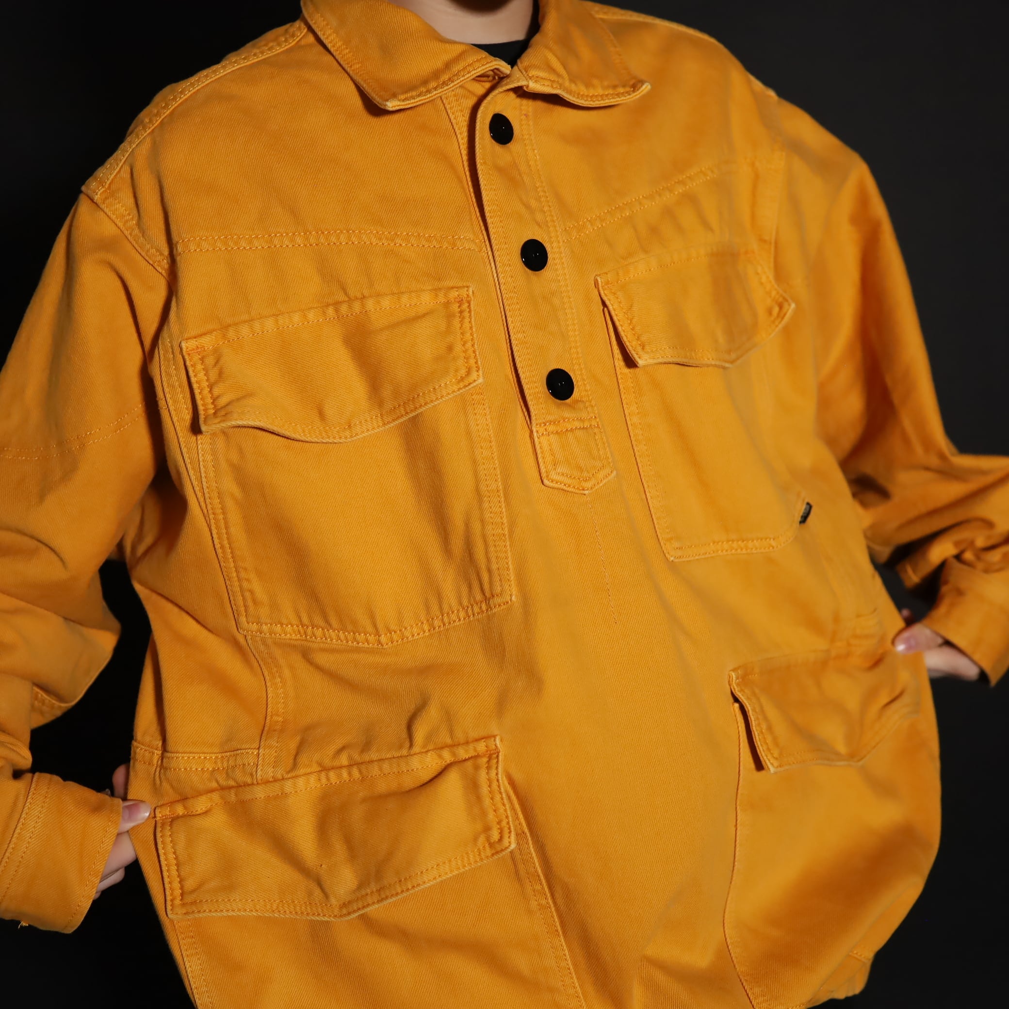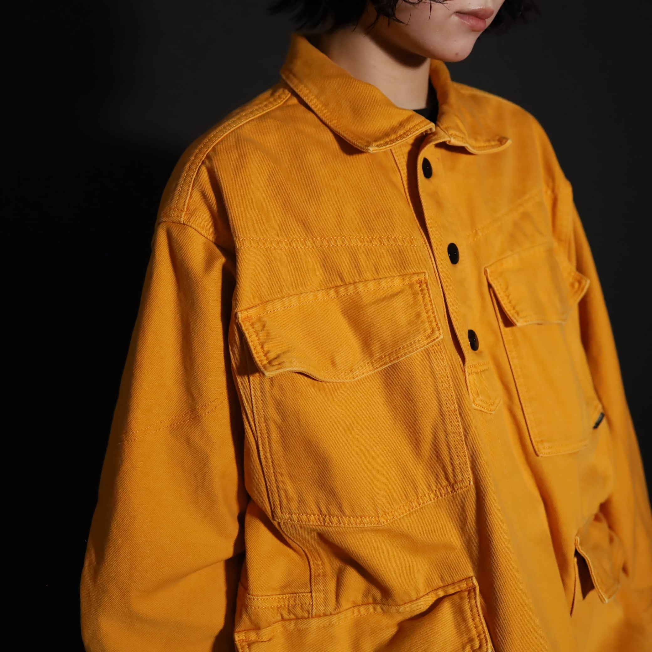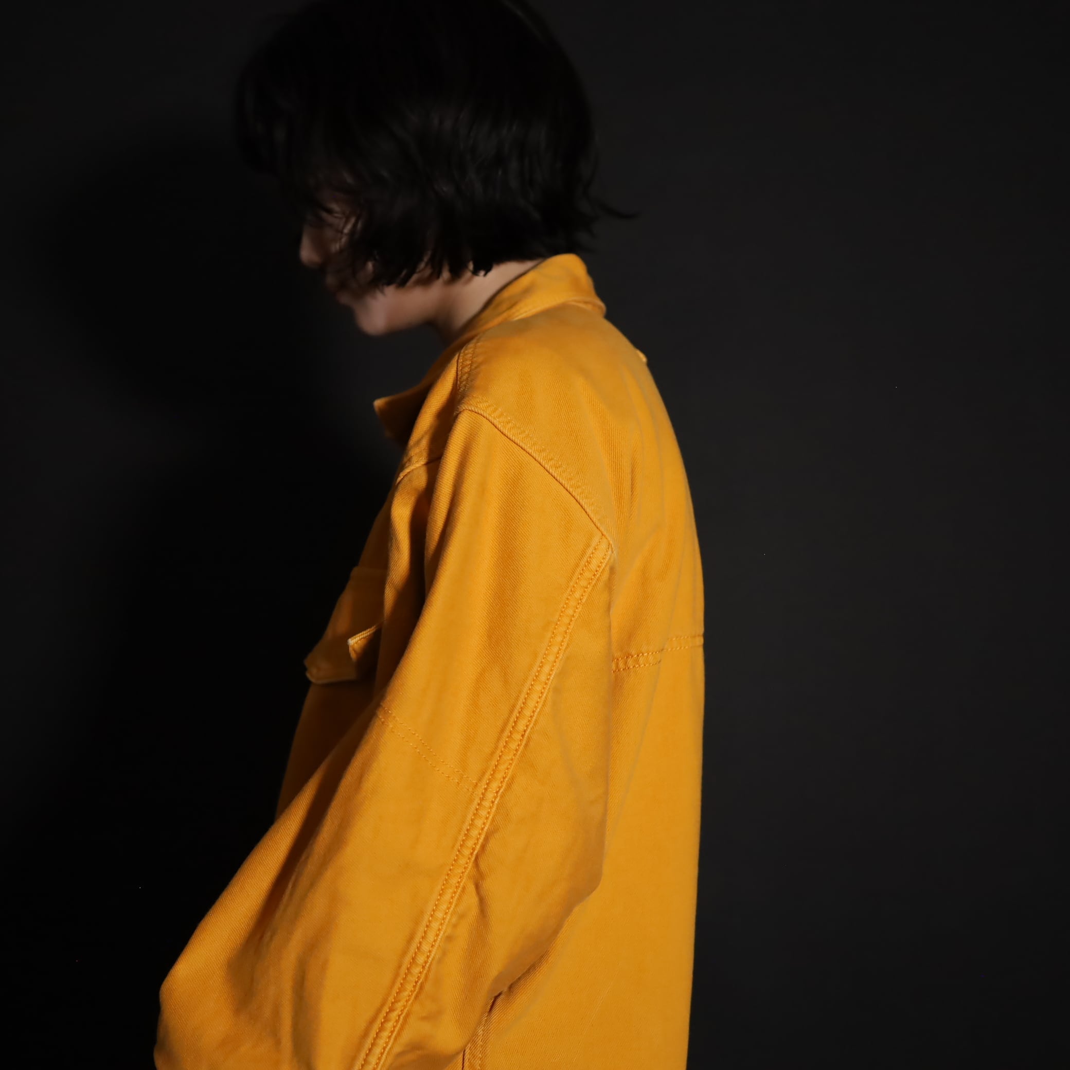 マスタードカラーのコットン×ポリ混紡デニム.