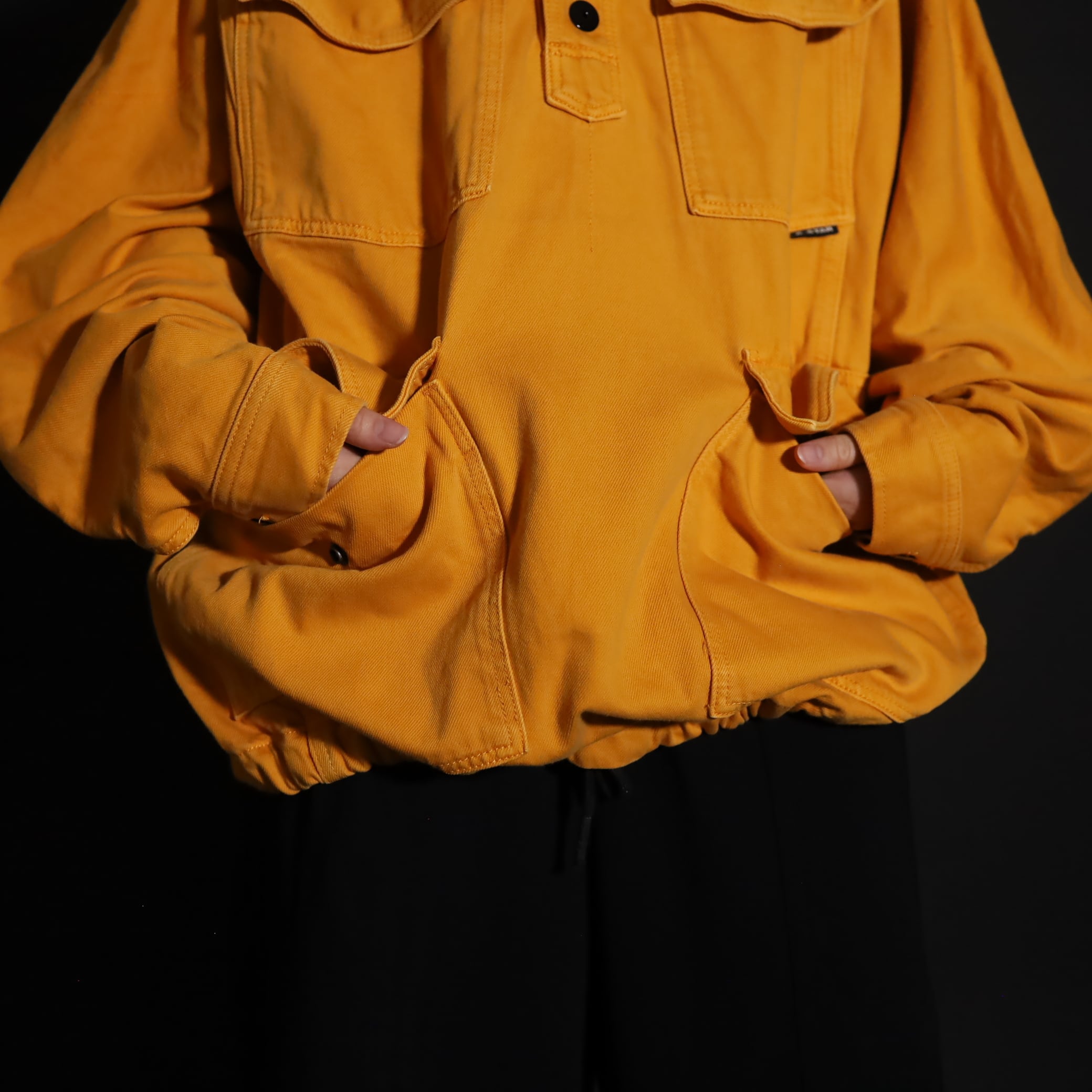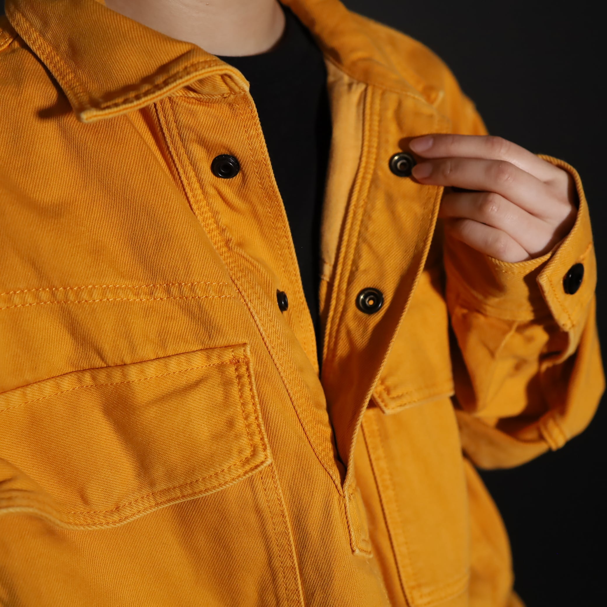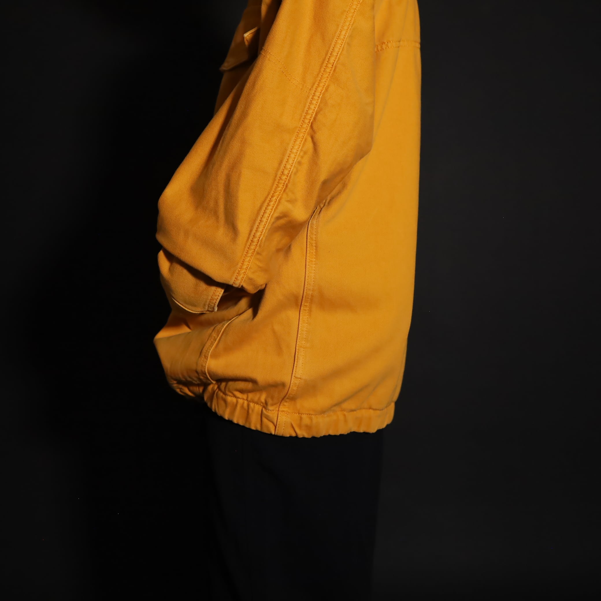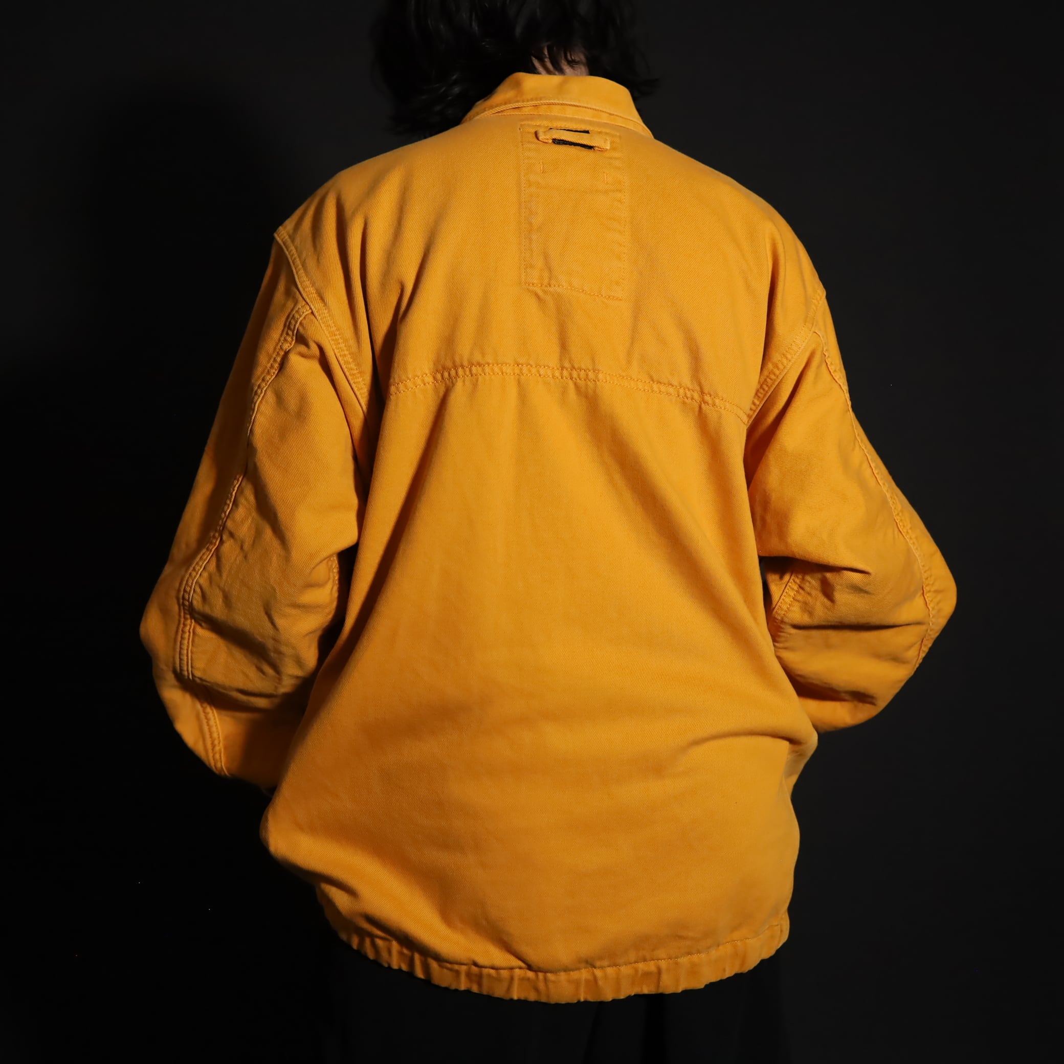 マスタードカラーのコットン×ポリ混紡デニム.