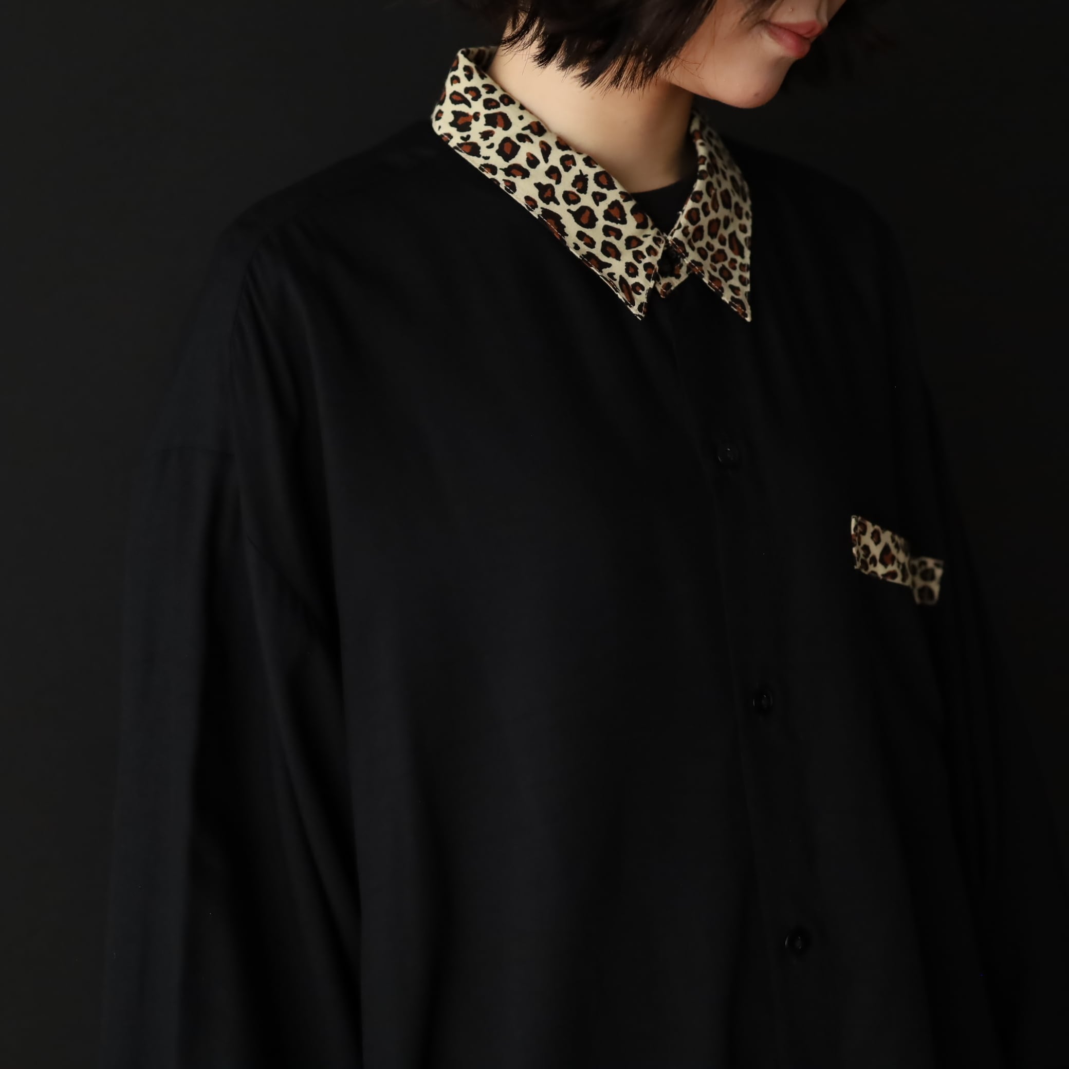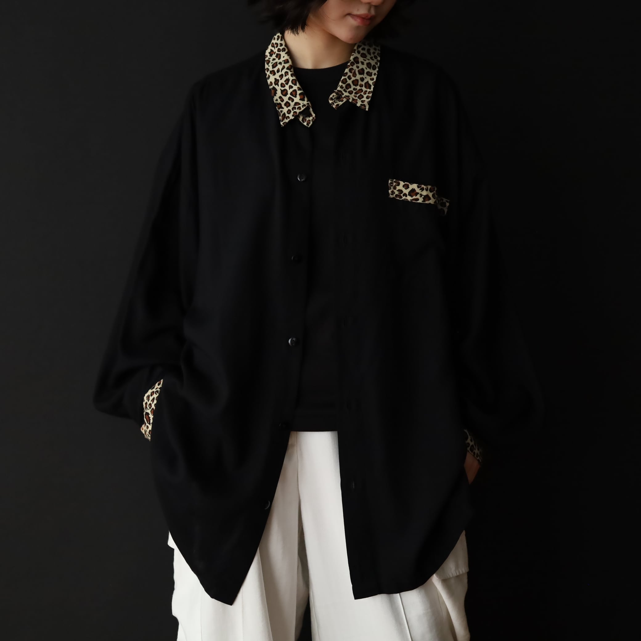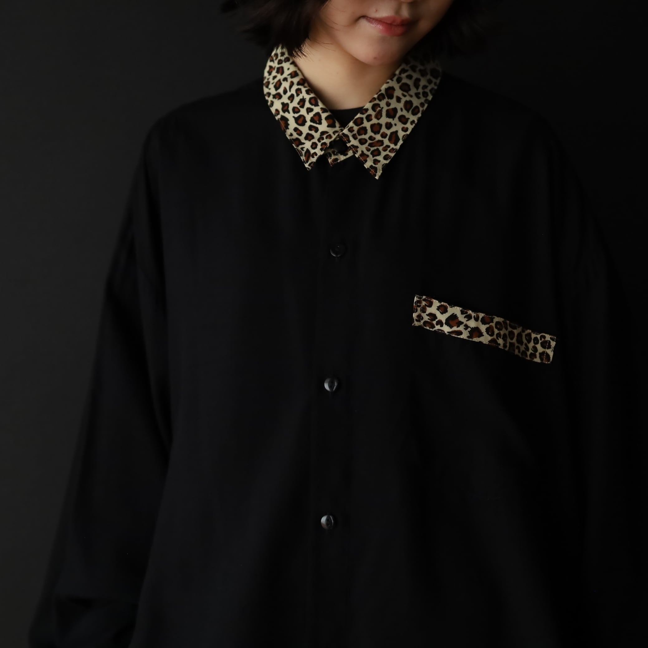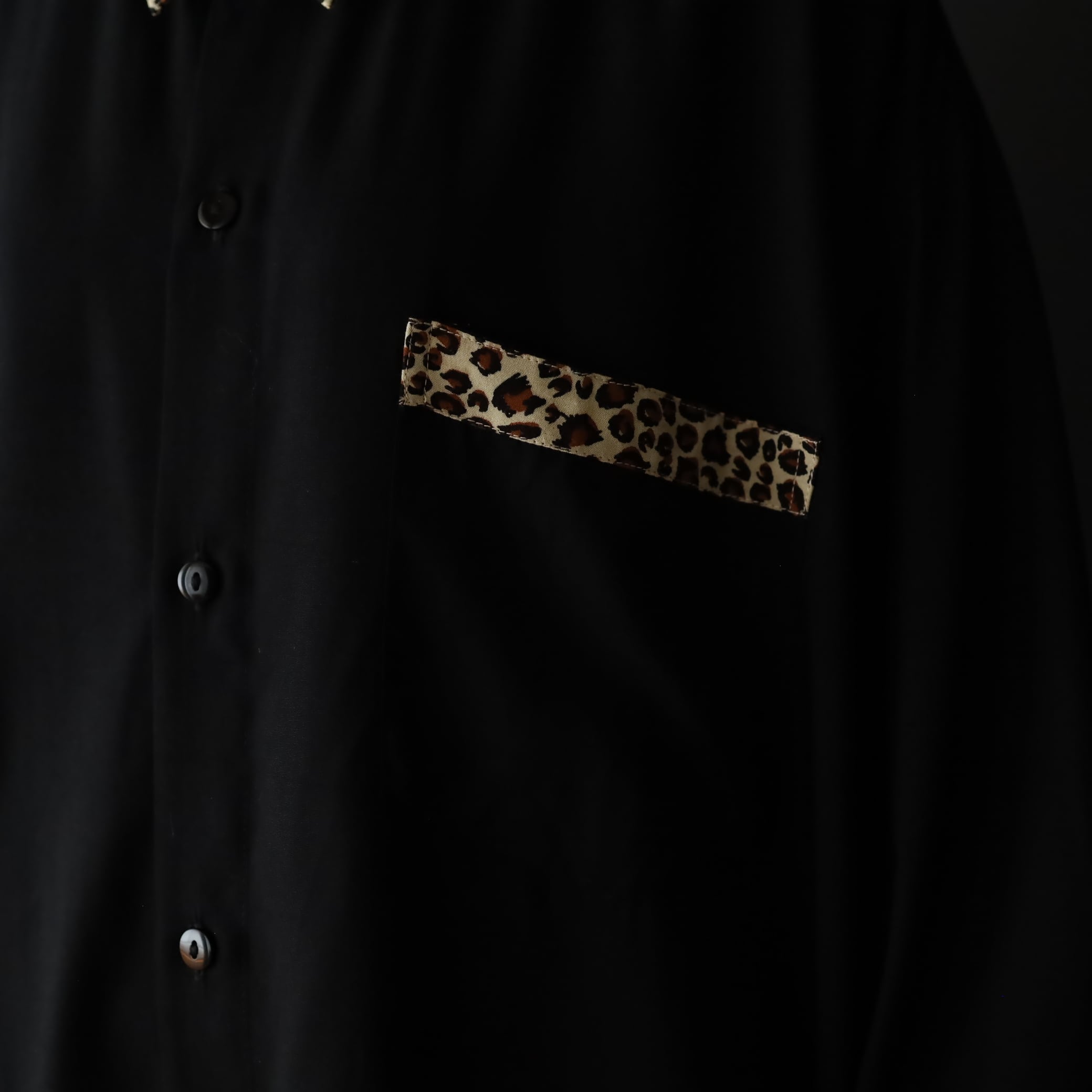 袖先カフス部分,襟,胸ポケットがレオパード柄切替.