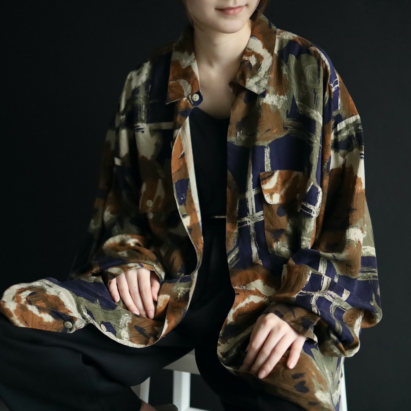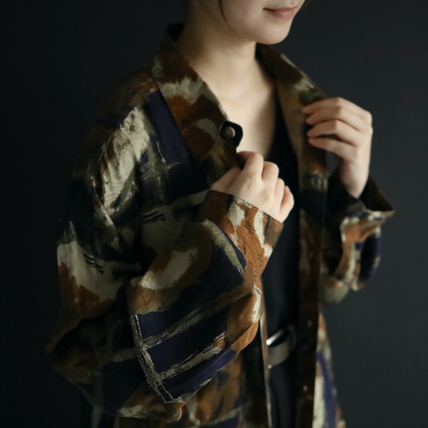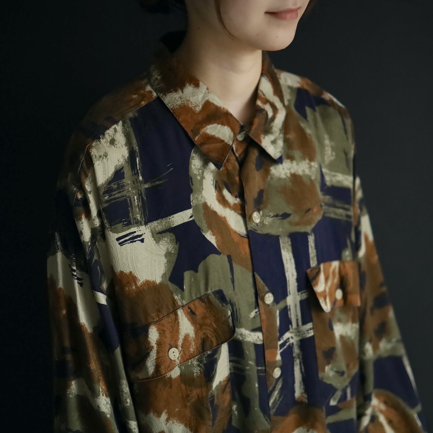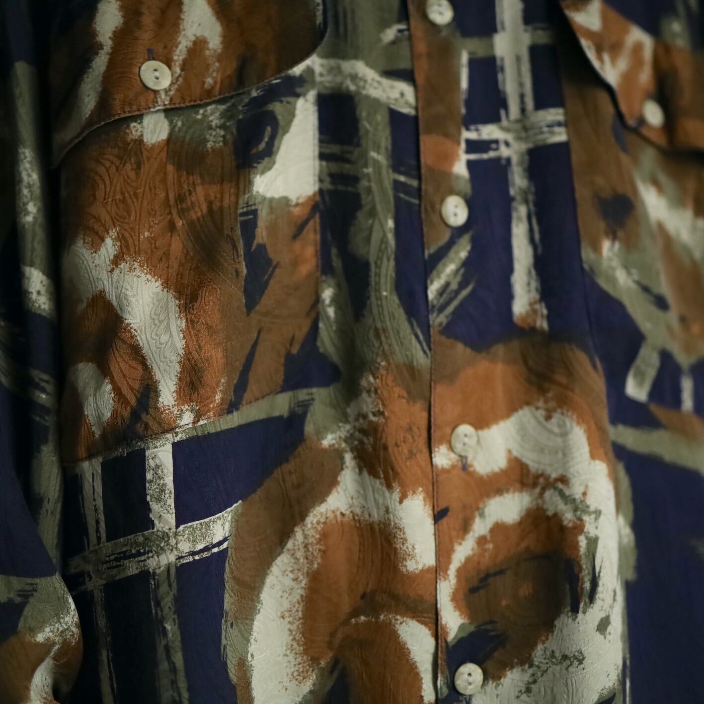 ネイビー,カーキ,ブラウン,オフホワイトなどで描かれた,抽象的でややレトロな印象を受けるアート.