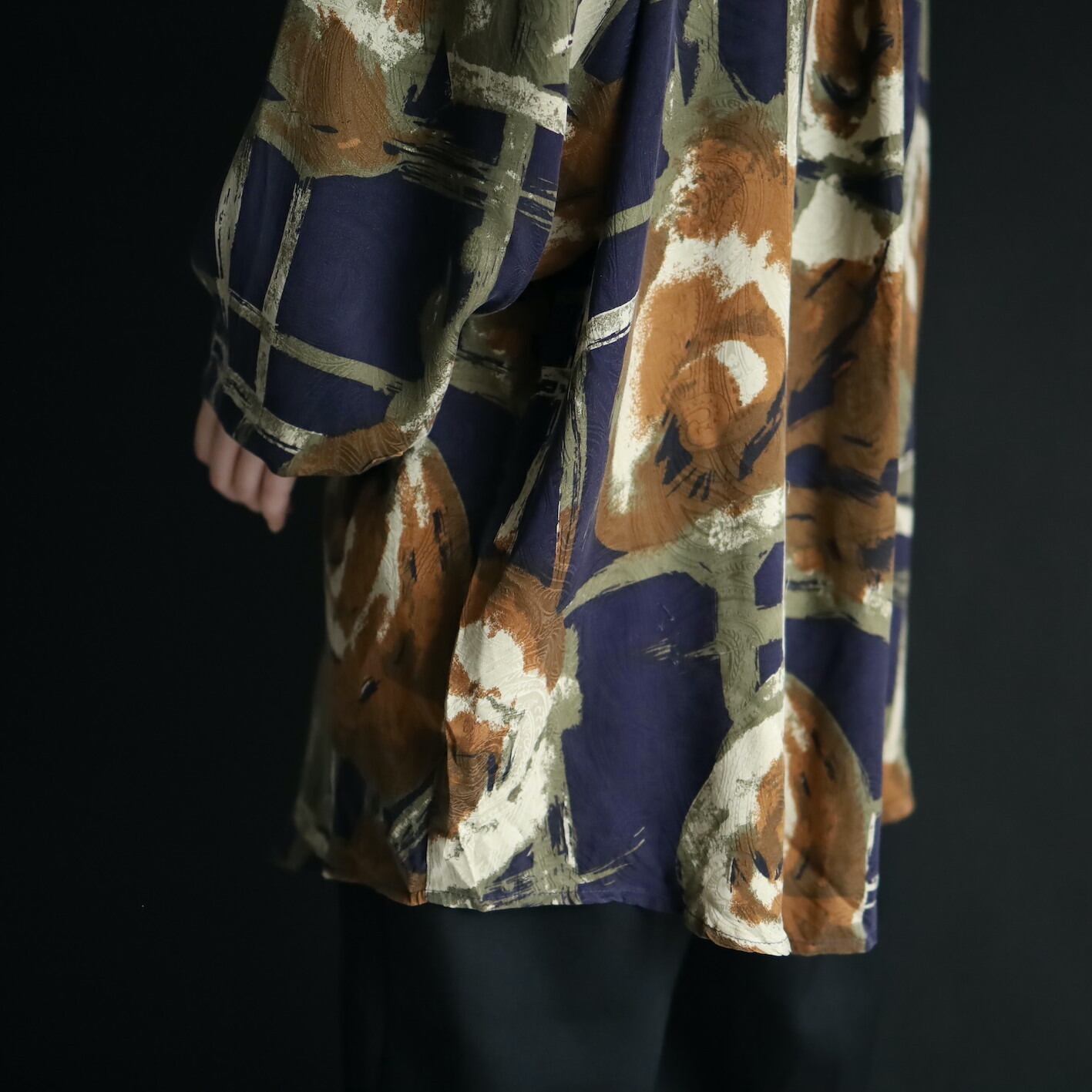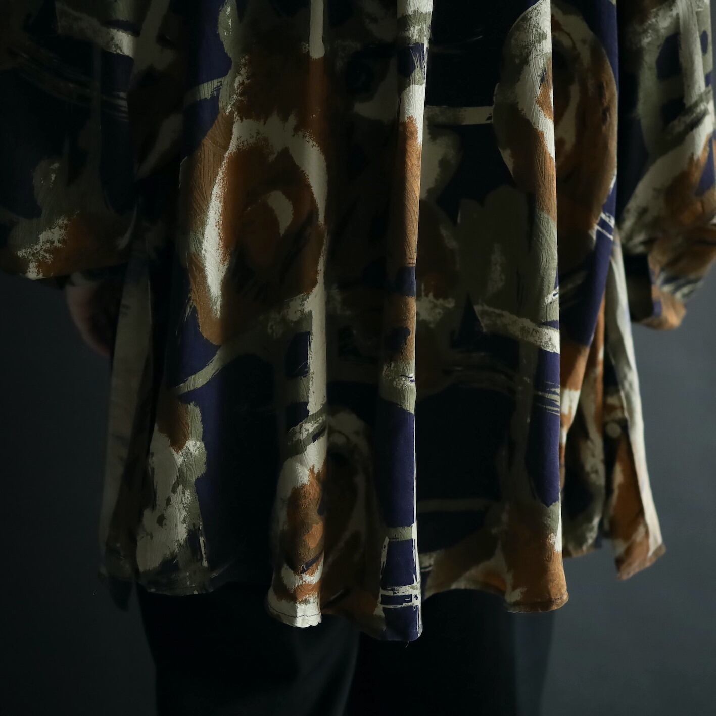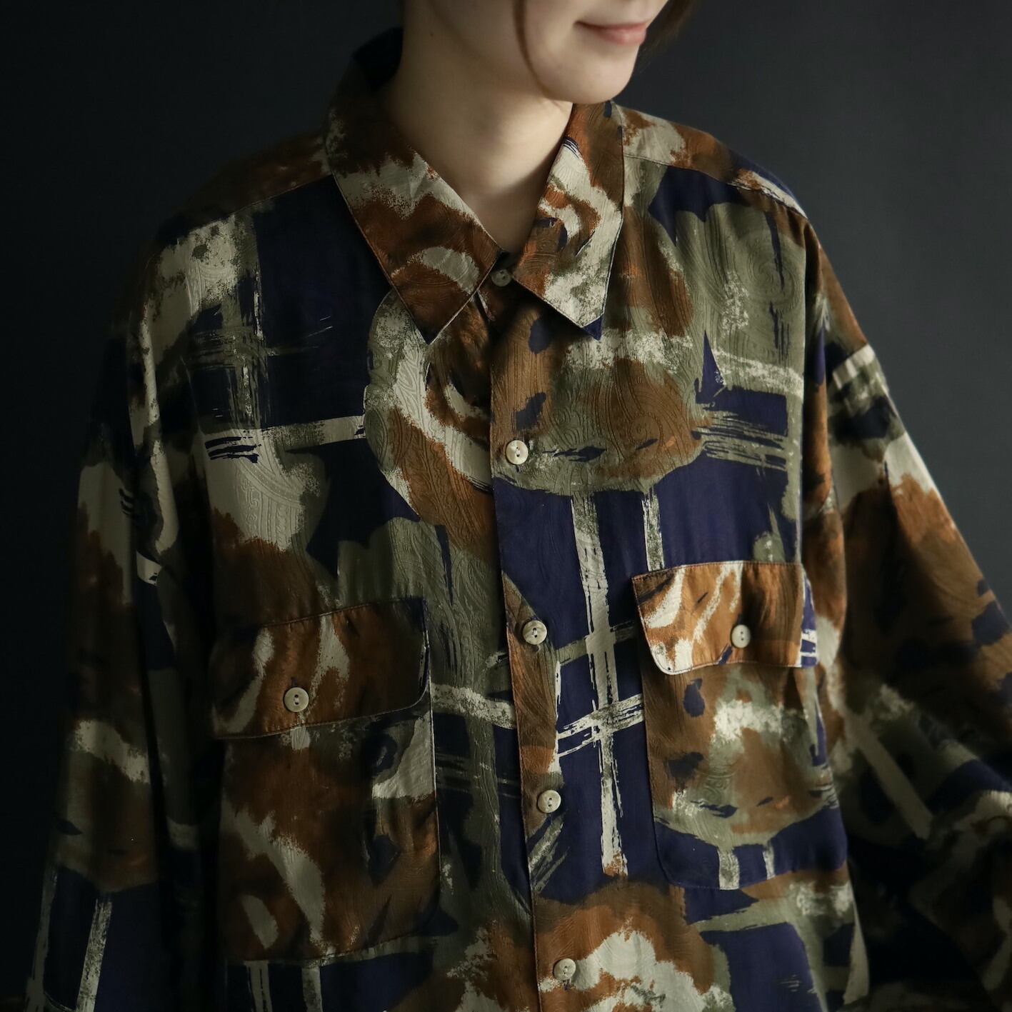 ネイビー,カーキ,ブラウン,オフホワイトなどで描かれた,抽象的でややレトロな印象を受けるアート.