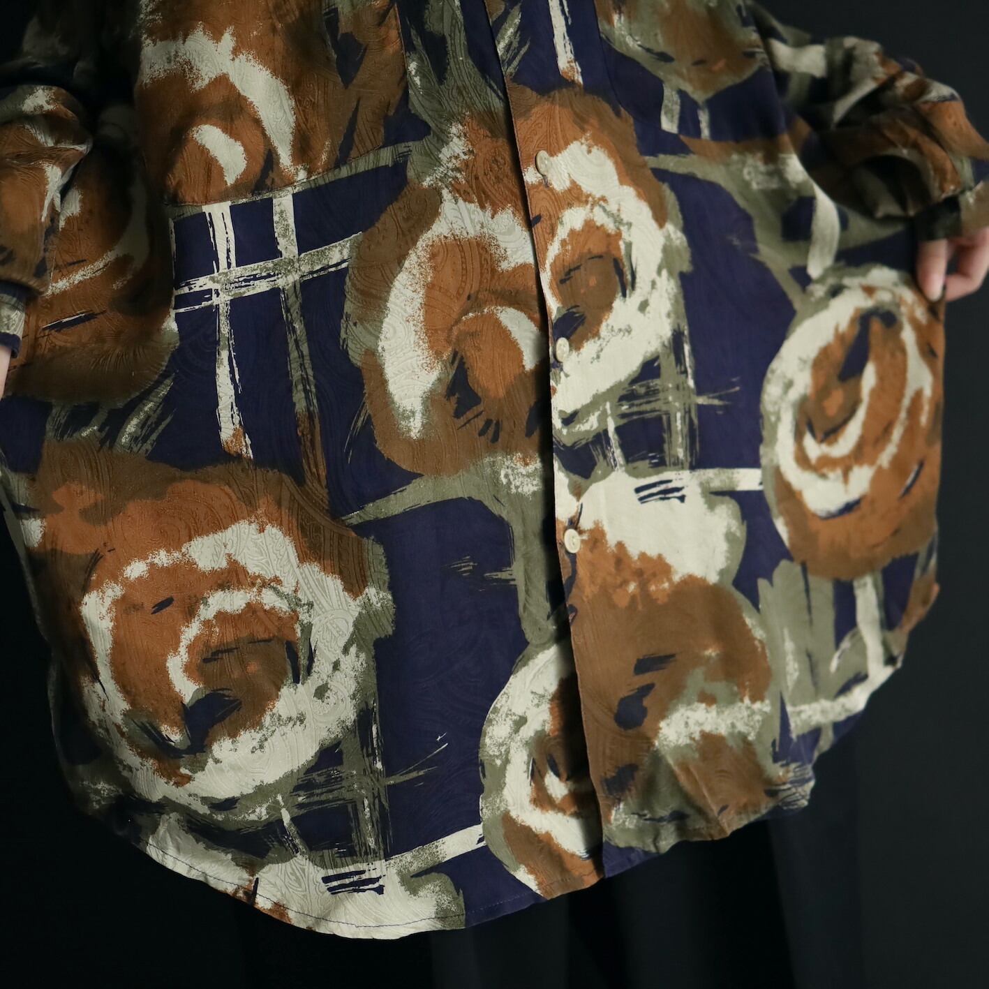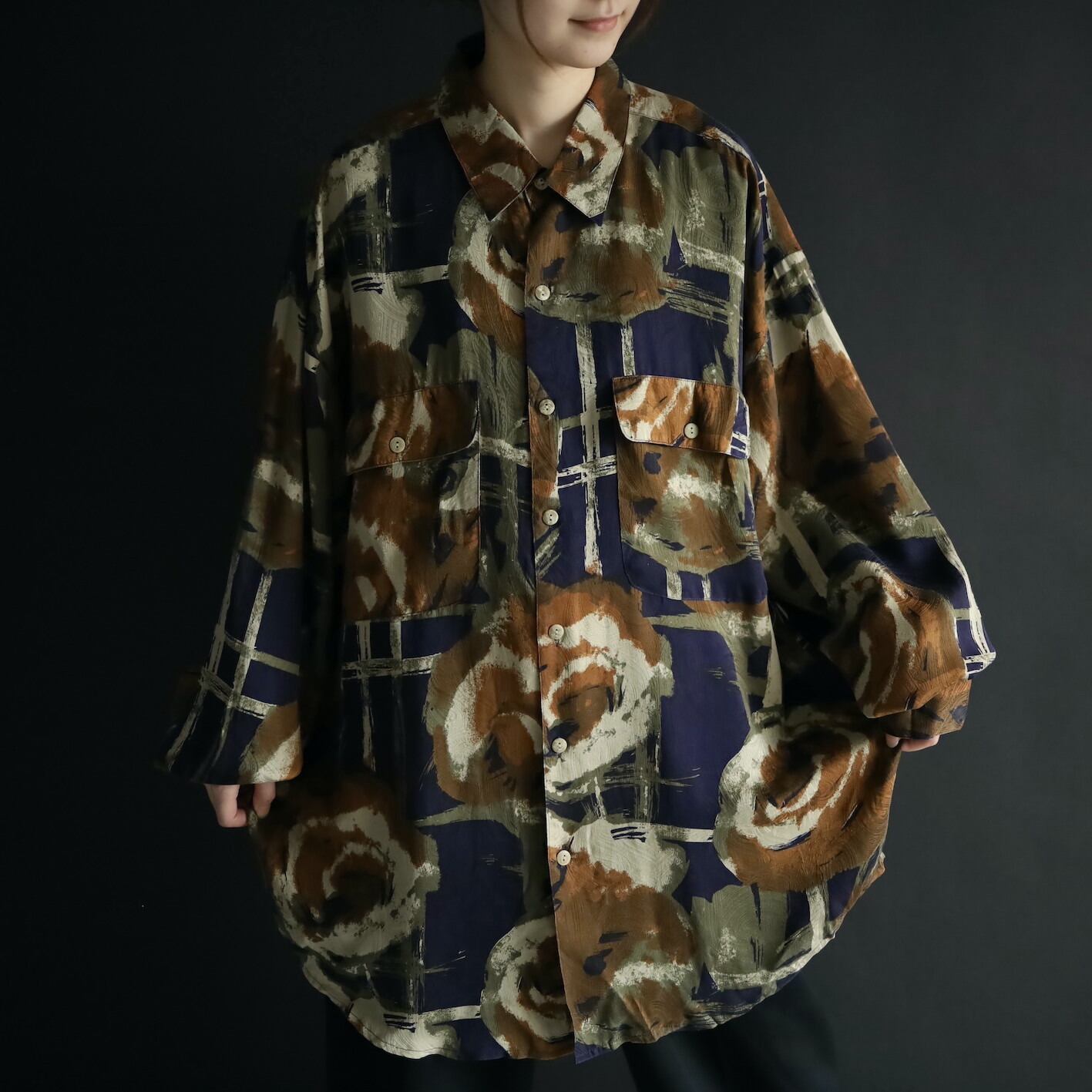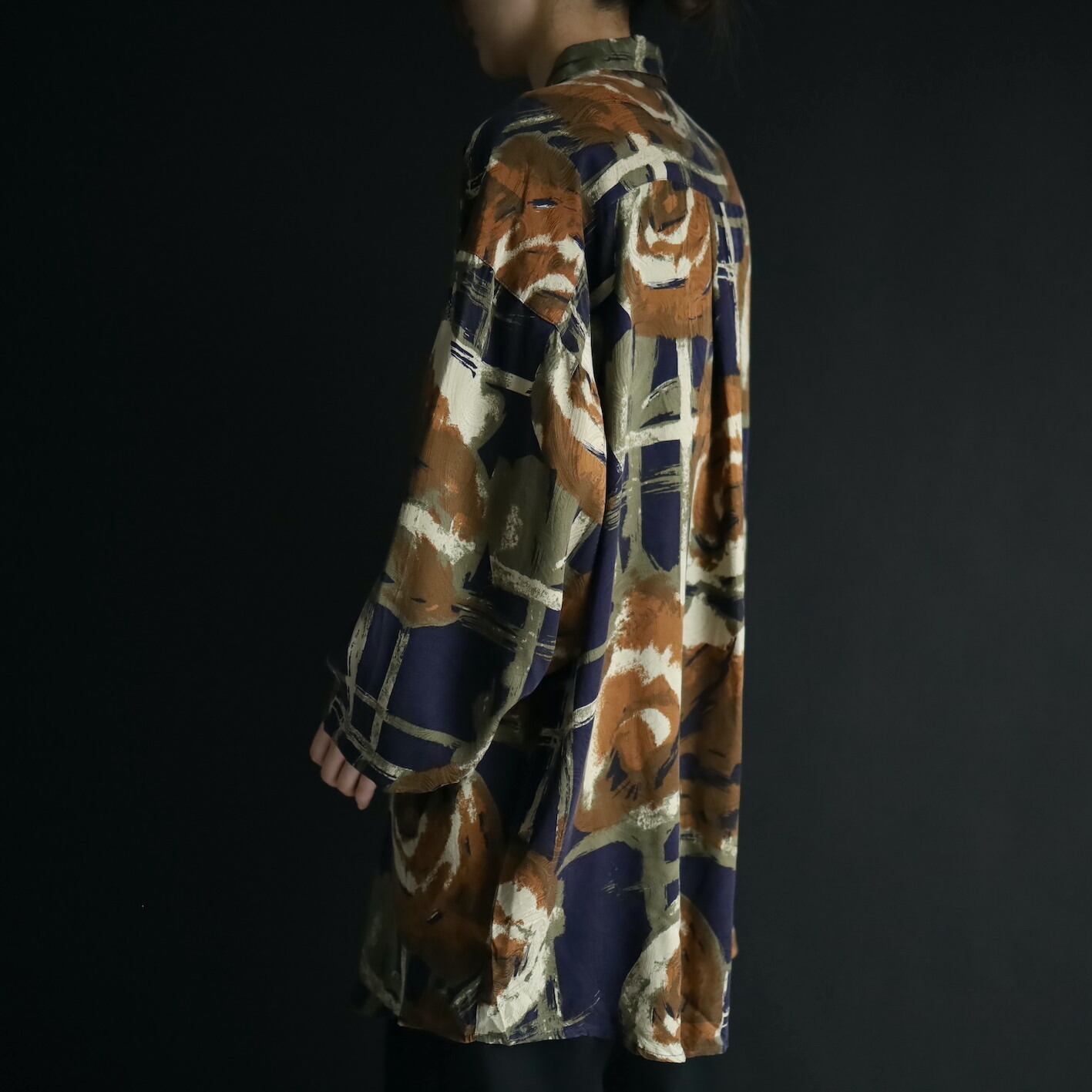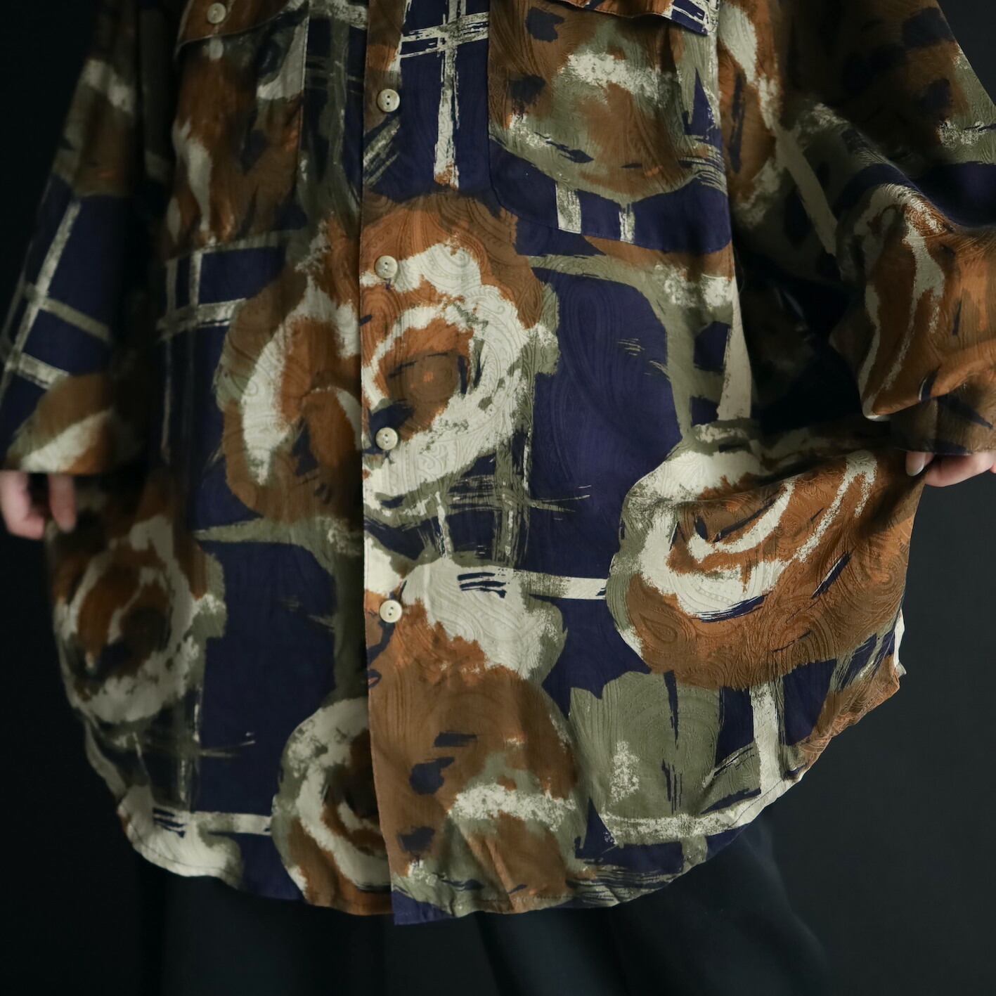 ネイビー,カーキ,ブラウン,オフホワイトなどで描かれた,抽象的でややレトロな印象を受けるアート.