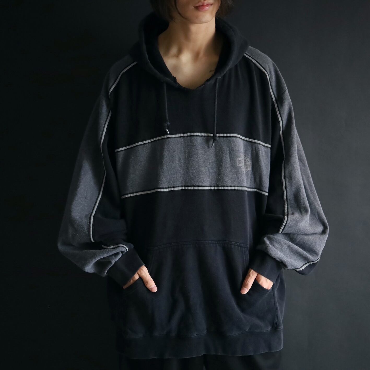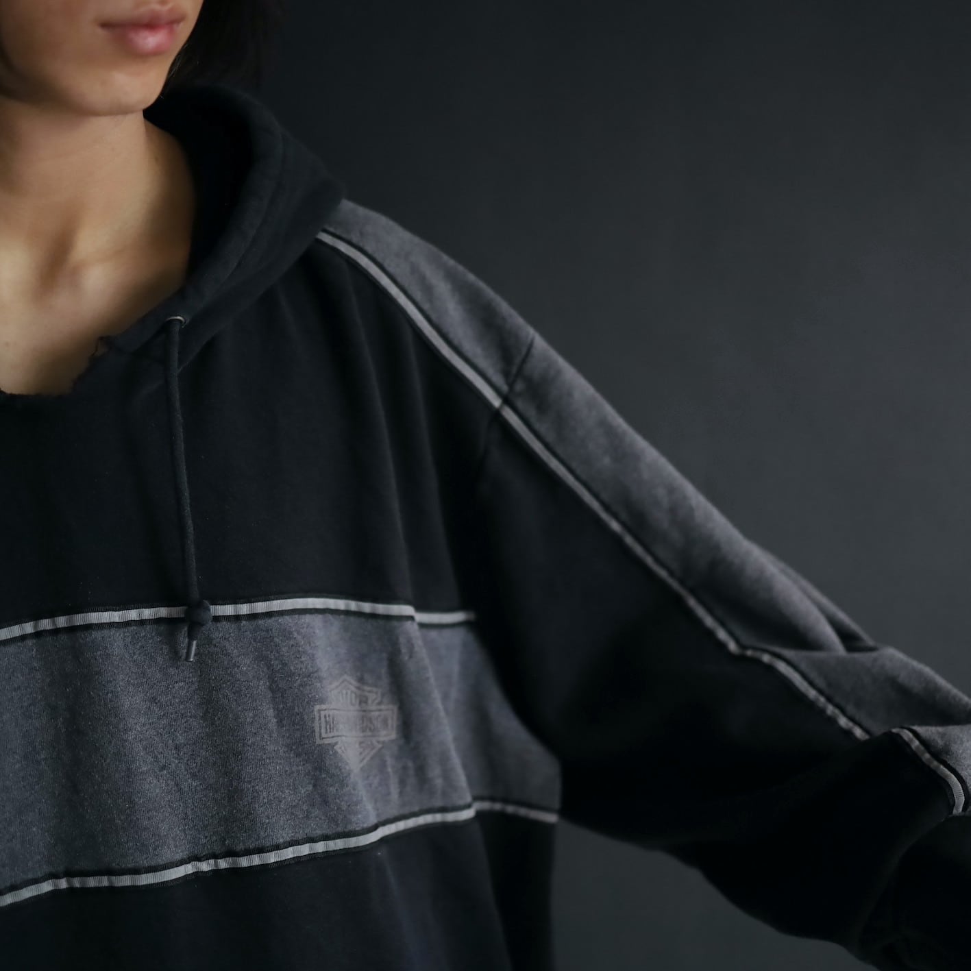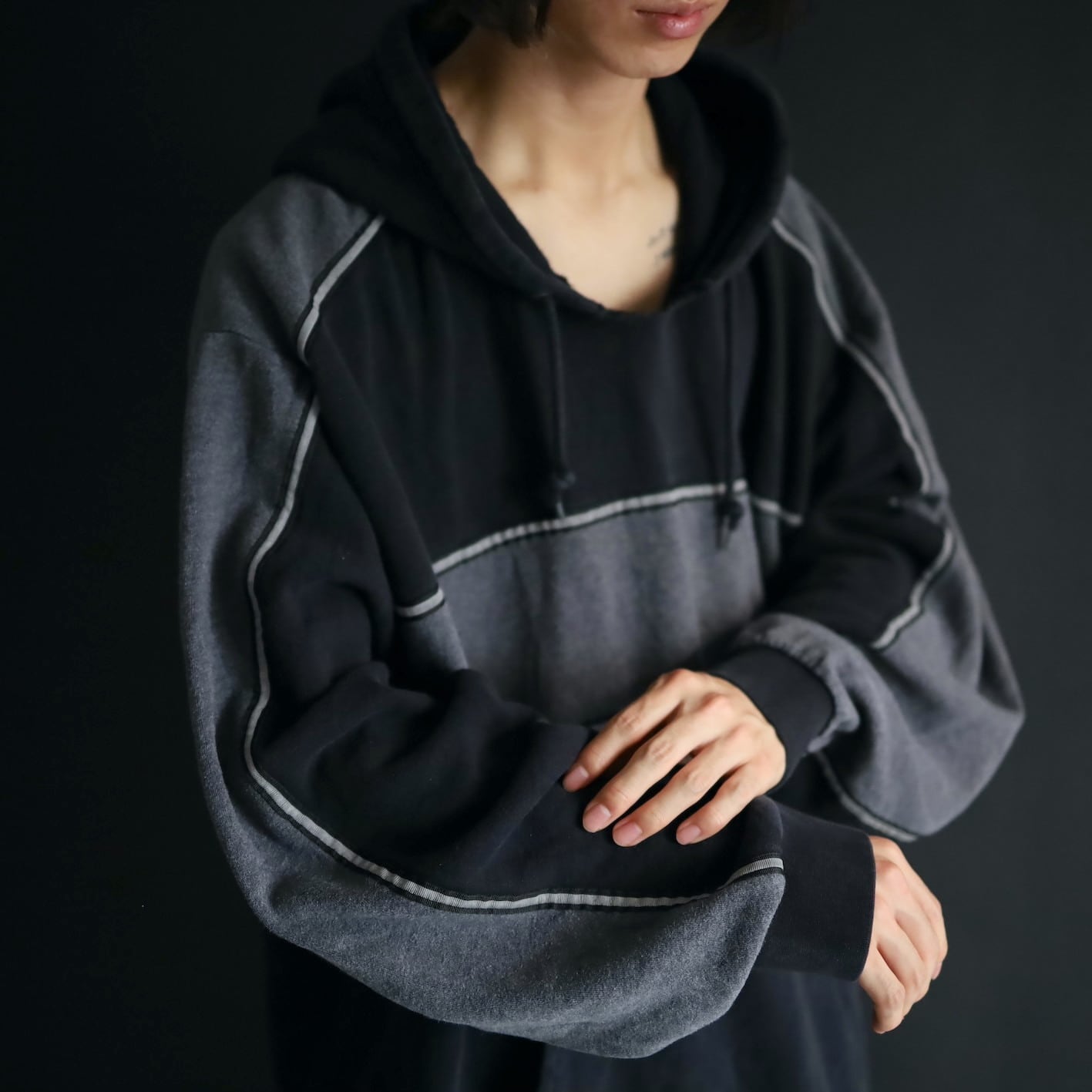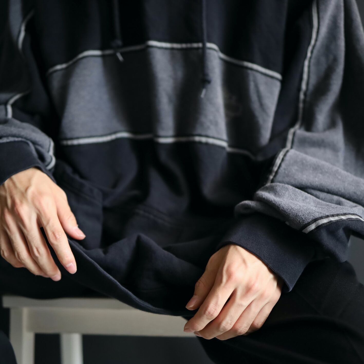 首元,古着のパーカーによく見られる縦裂けがありますが,くたっとしたボディと相まったグランジ感がむしろ◎