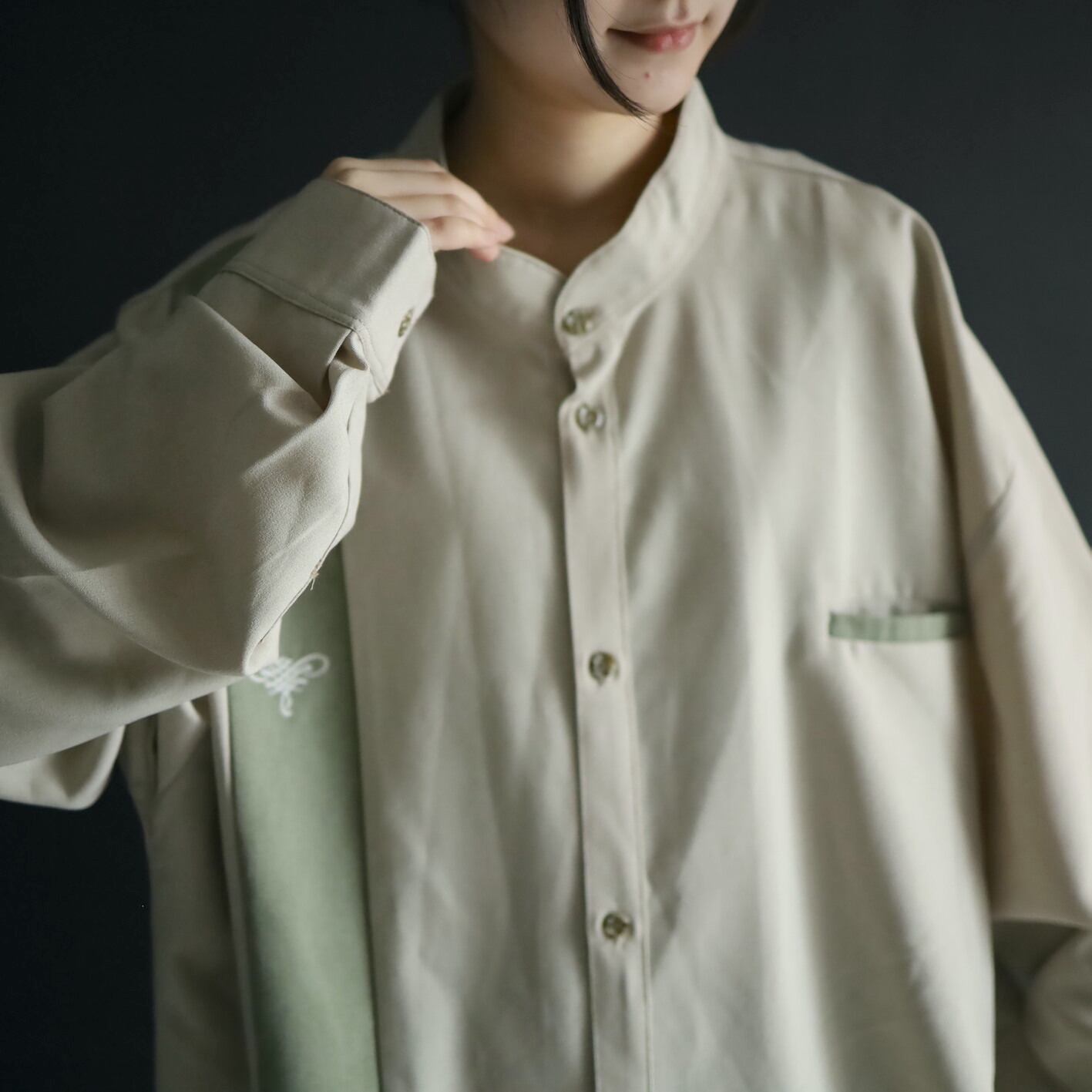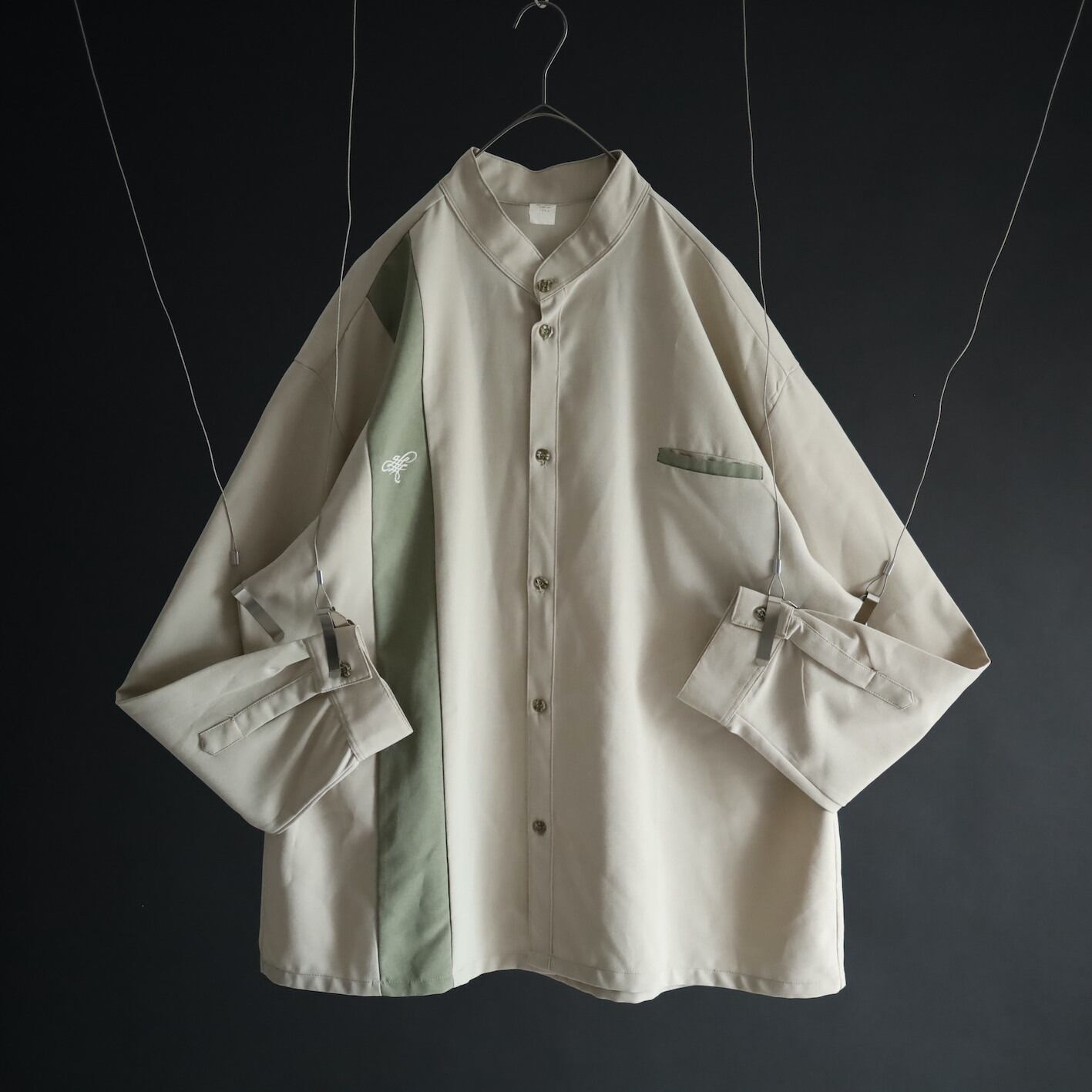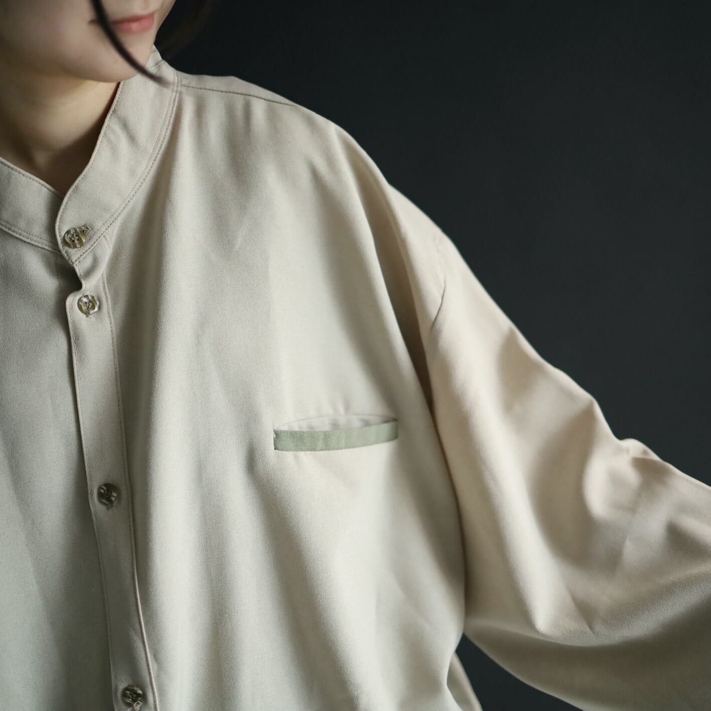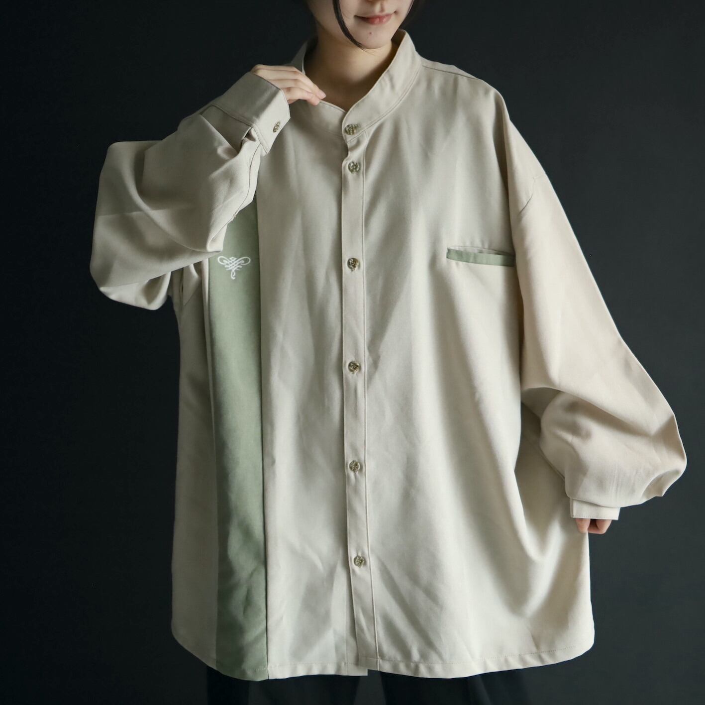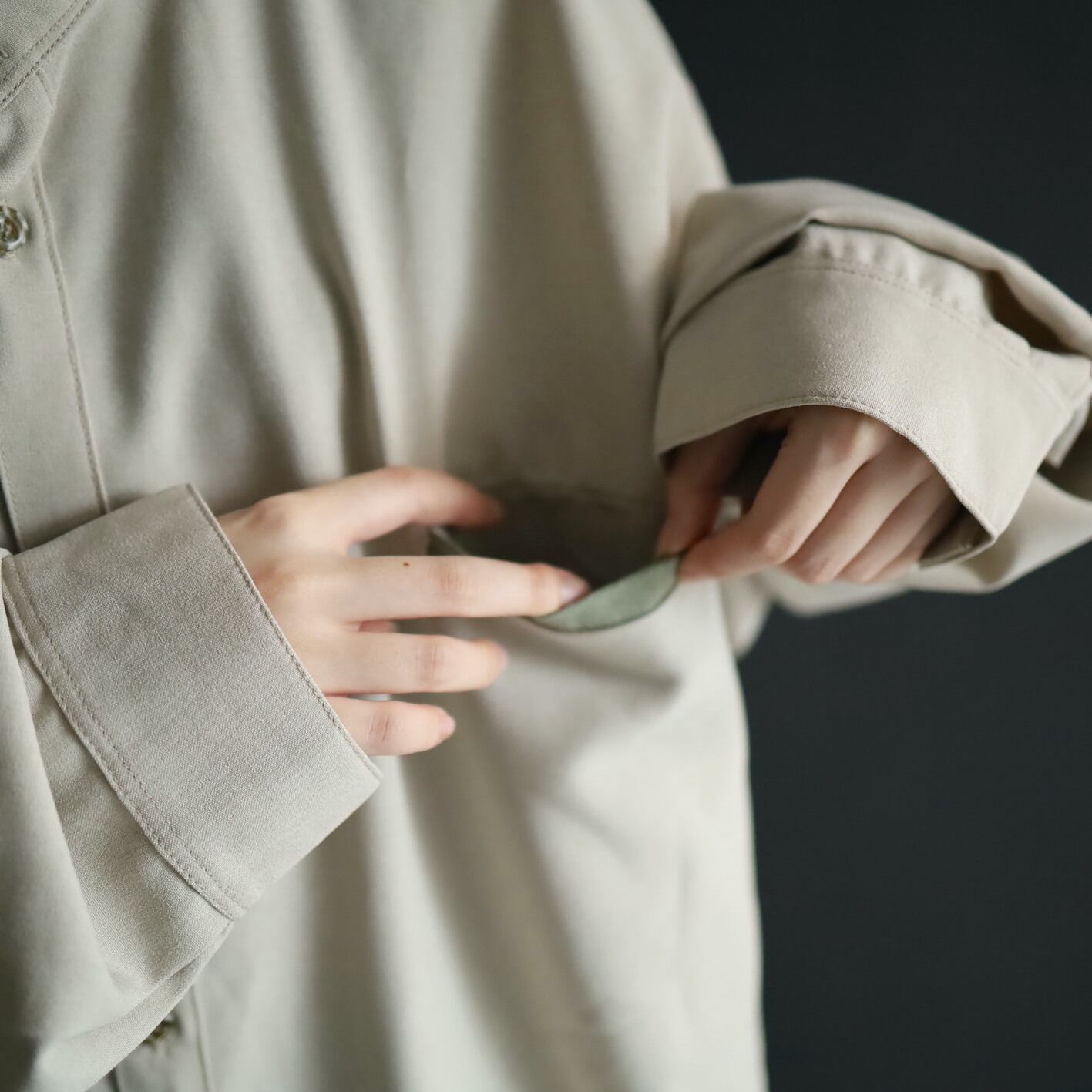 胸ポケットの抹茶色での縁取りも小洒落てます〜.