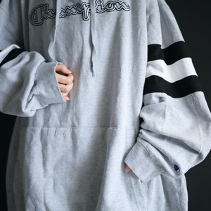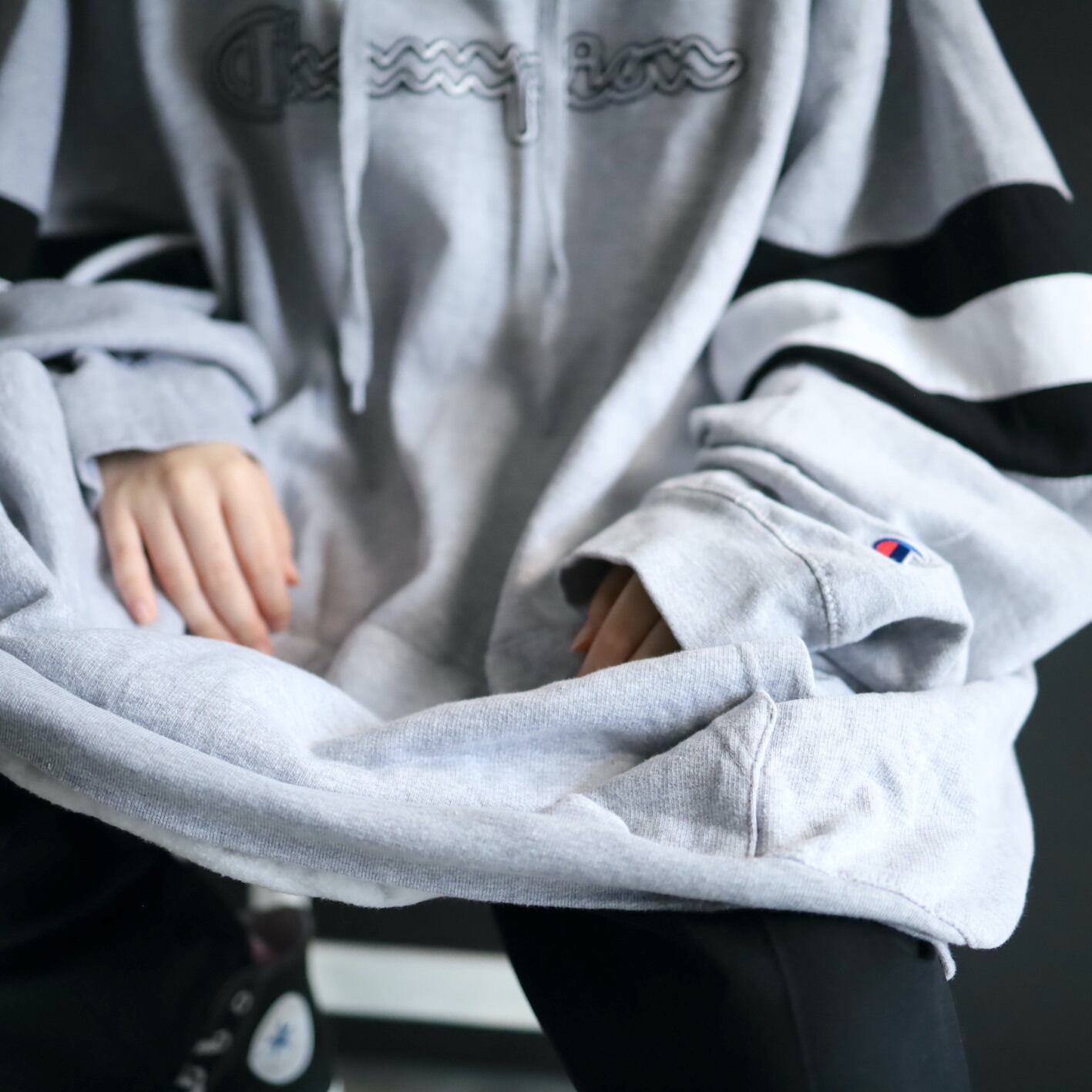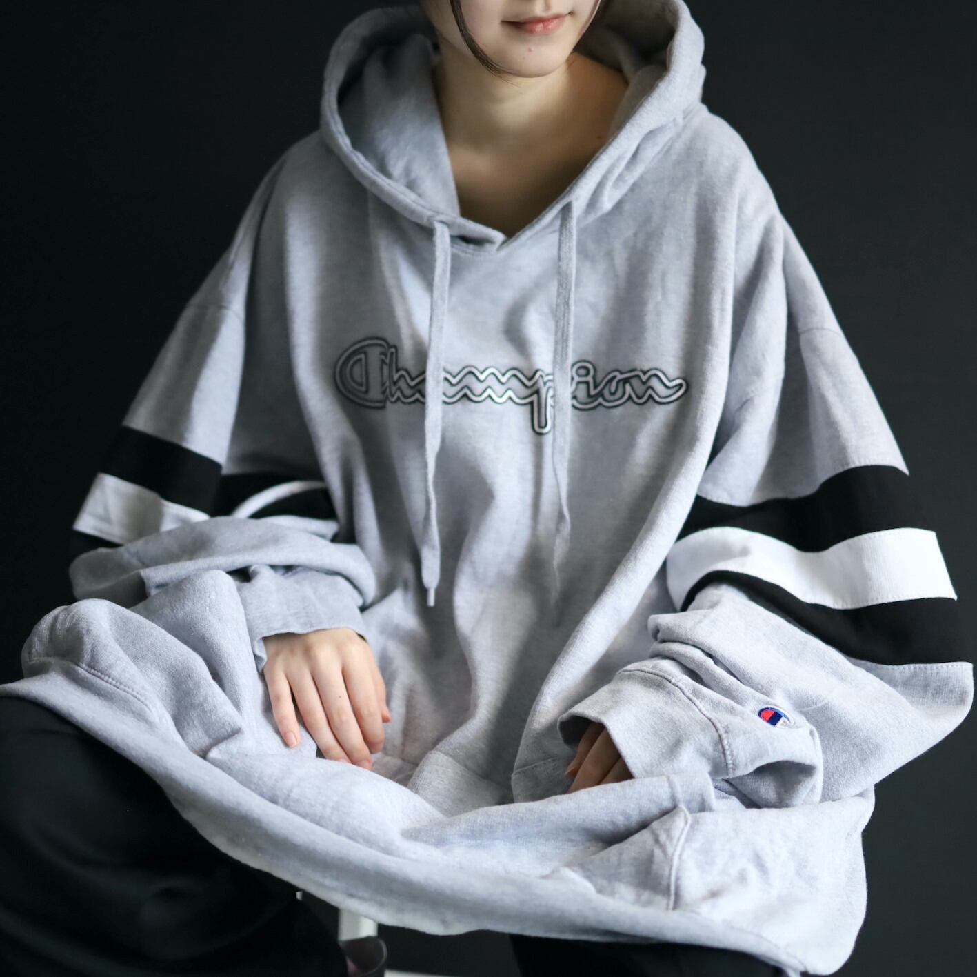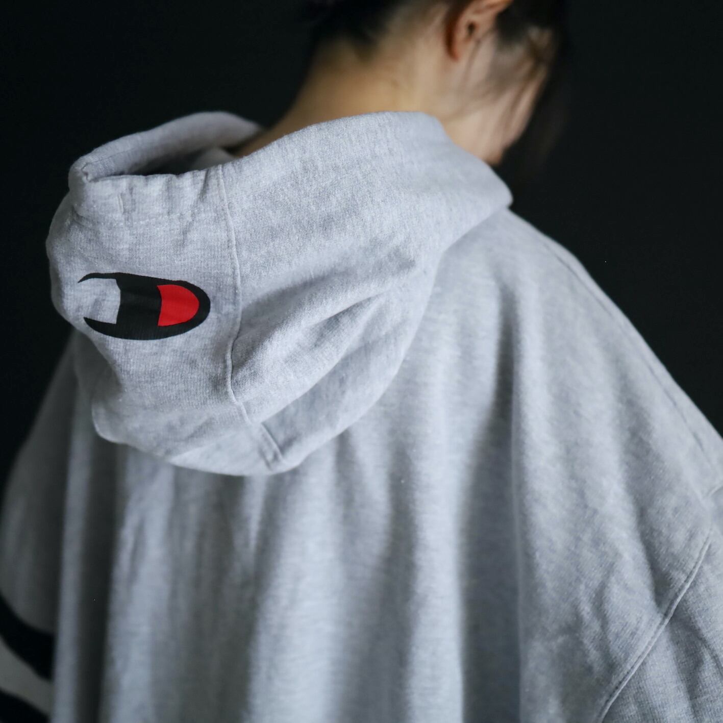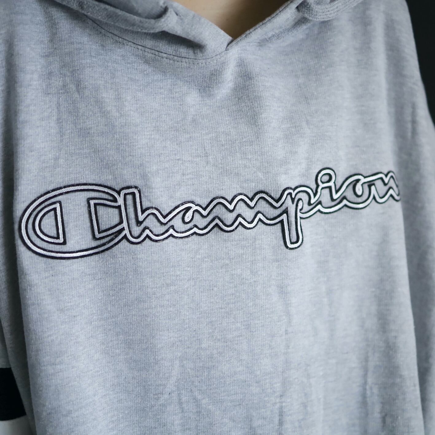 胸元にChampionのネームプリント,袖先に目玉ロゴ.