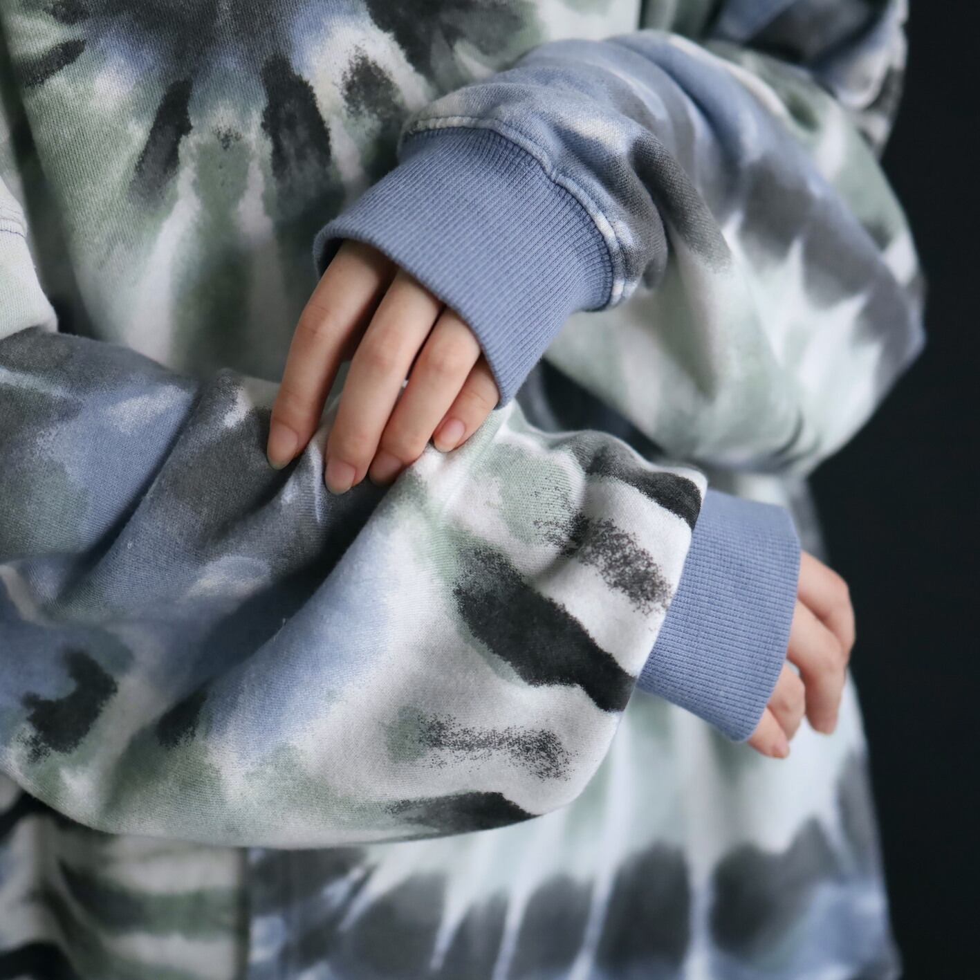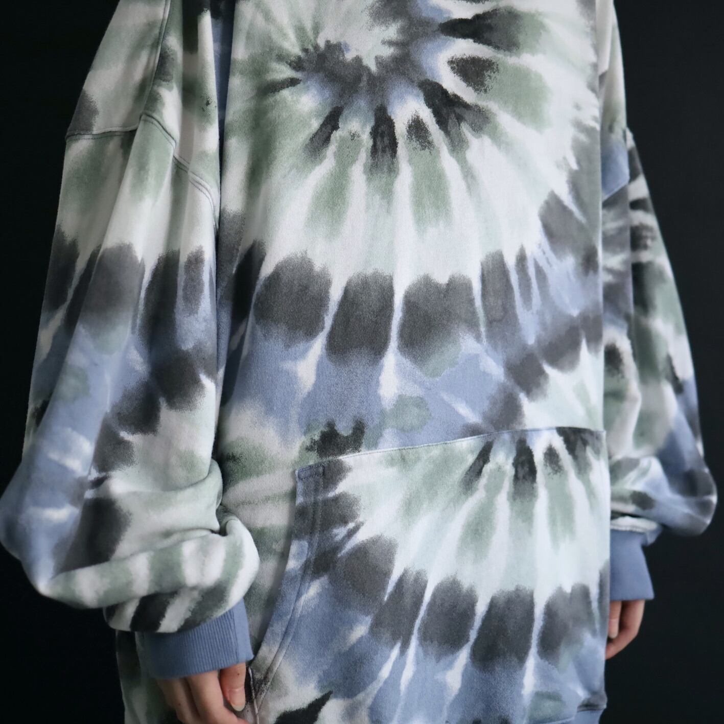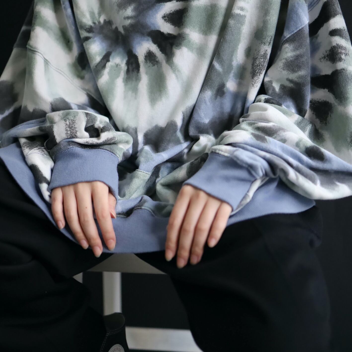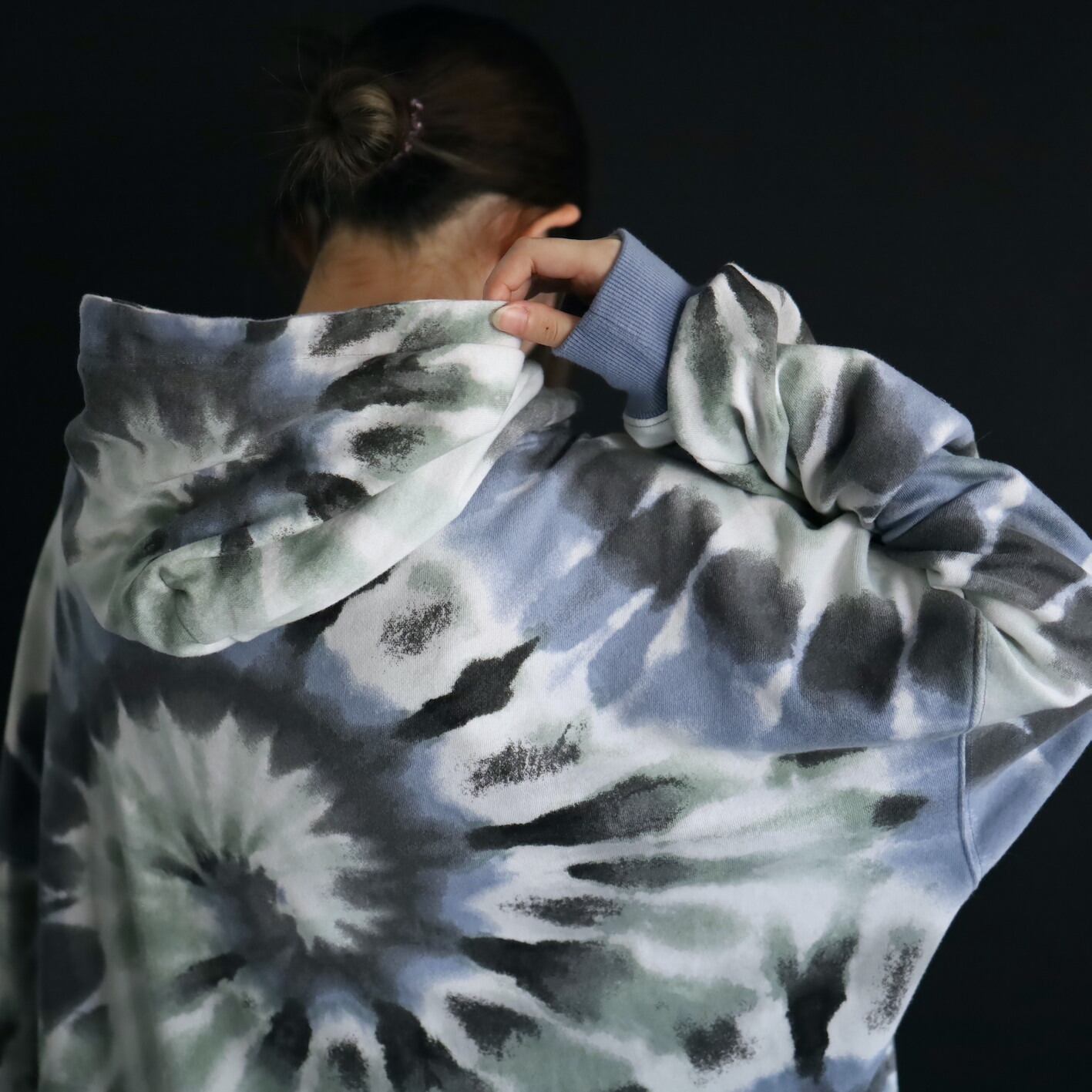 淡いグリーンとブルー,墨黒,ホワイトのタイダイ.