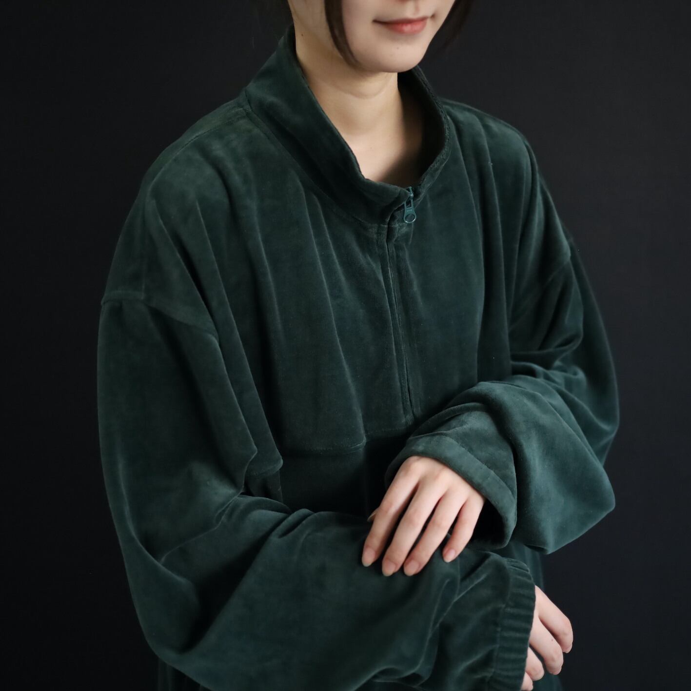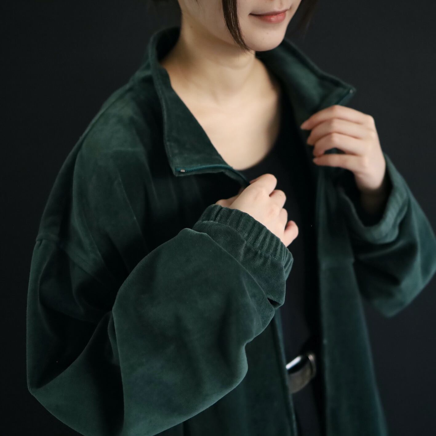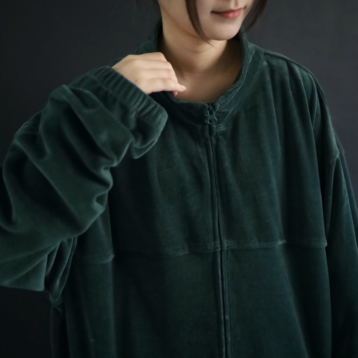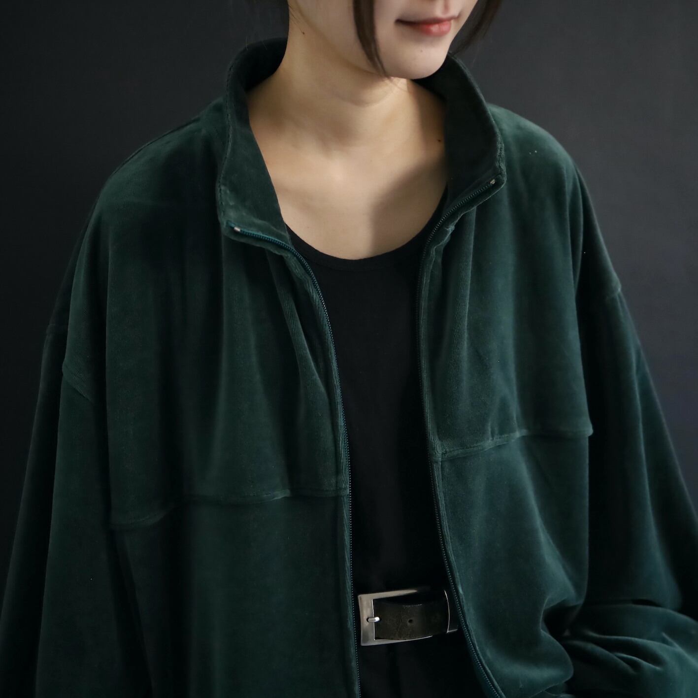 異素材系,ベロアのジップアップブルゾン.