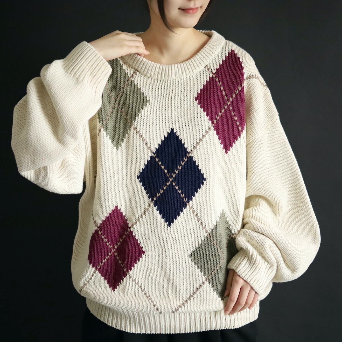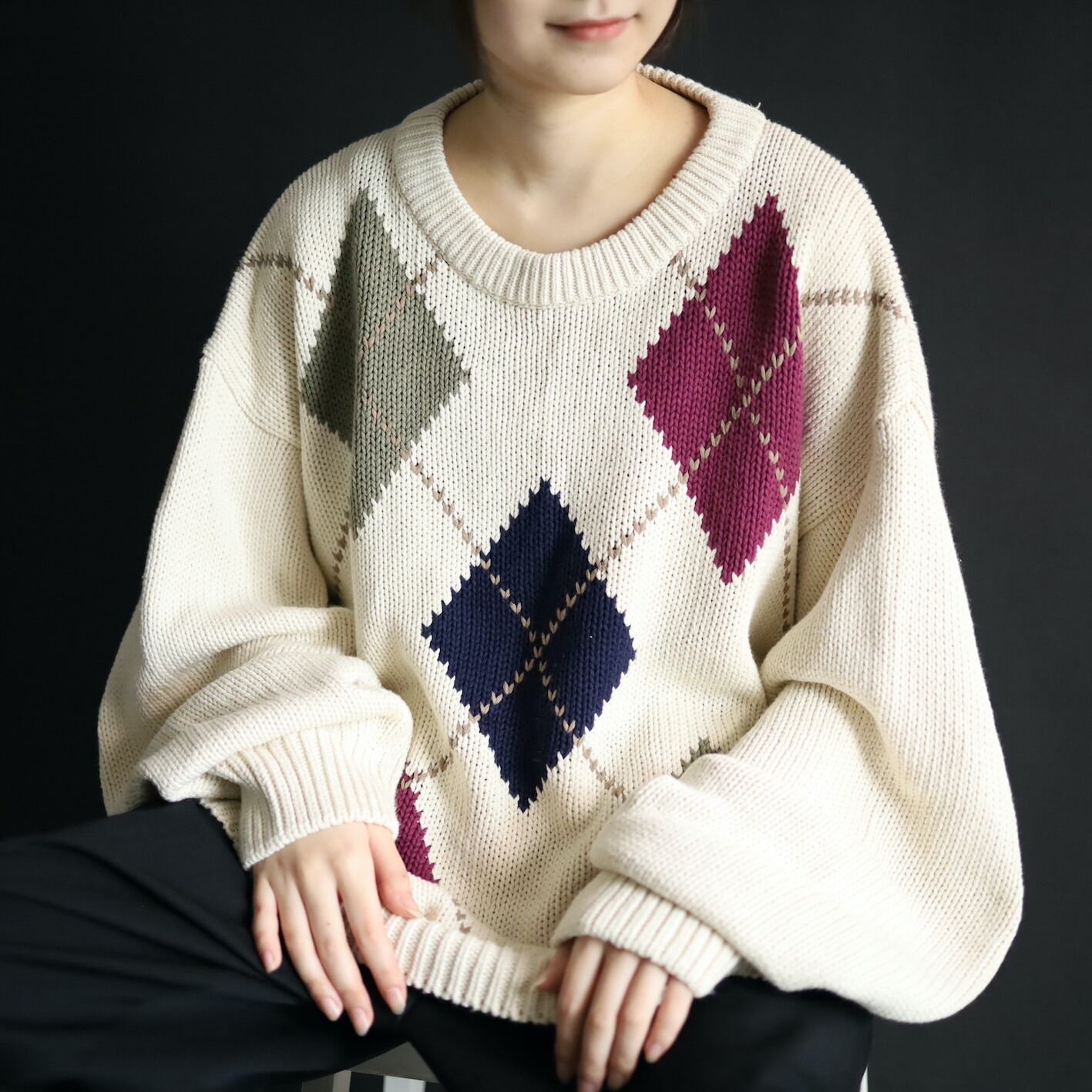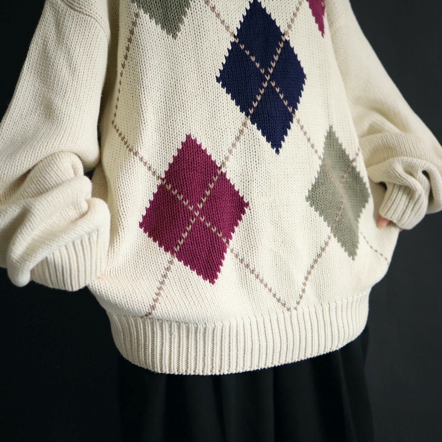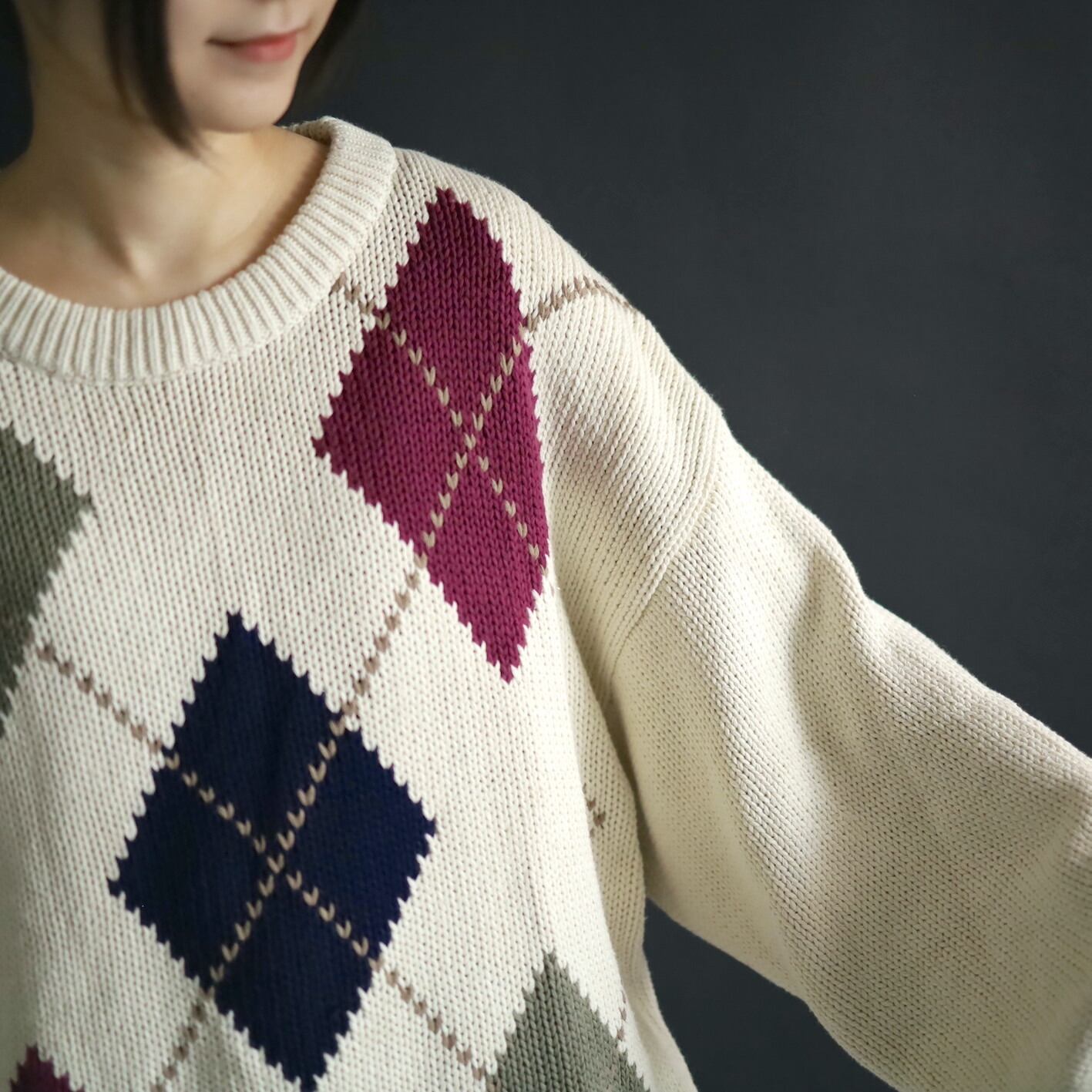 柔らかいホワイトカラーをベースに,ボルドー,カーキ,ネイビーのアーガイル柄.