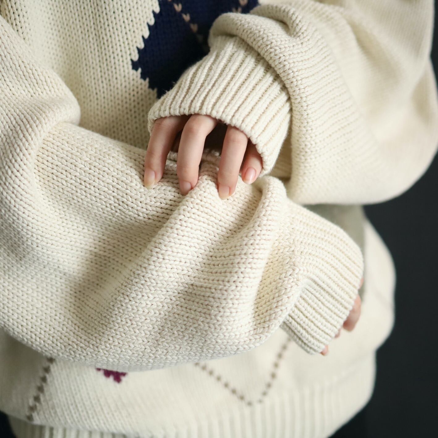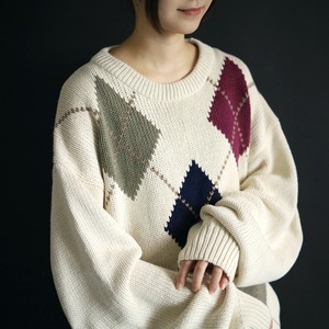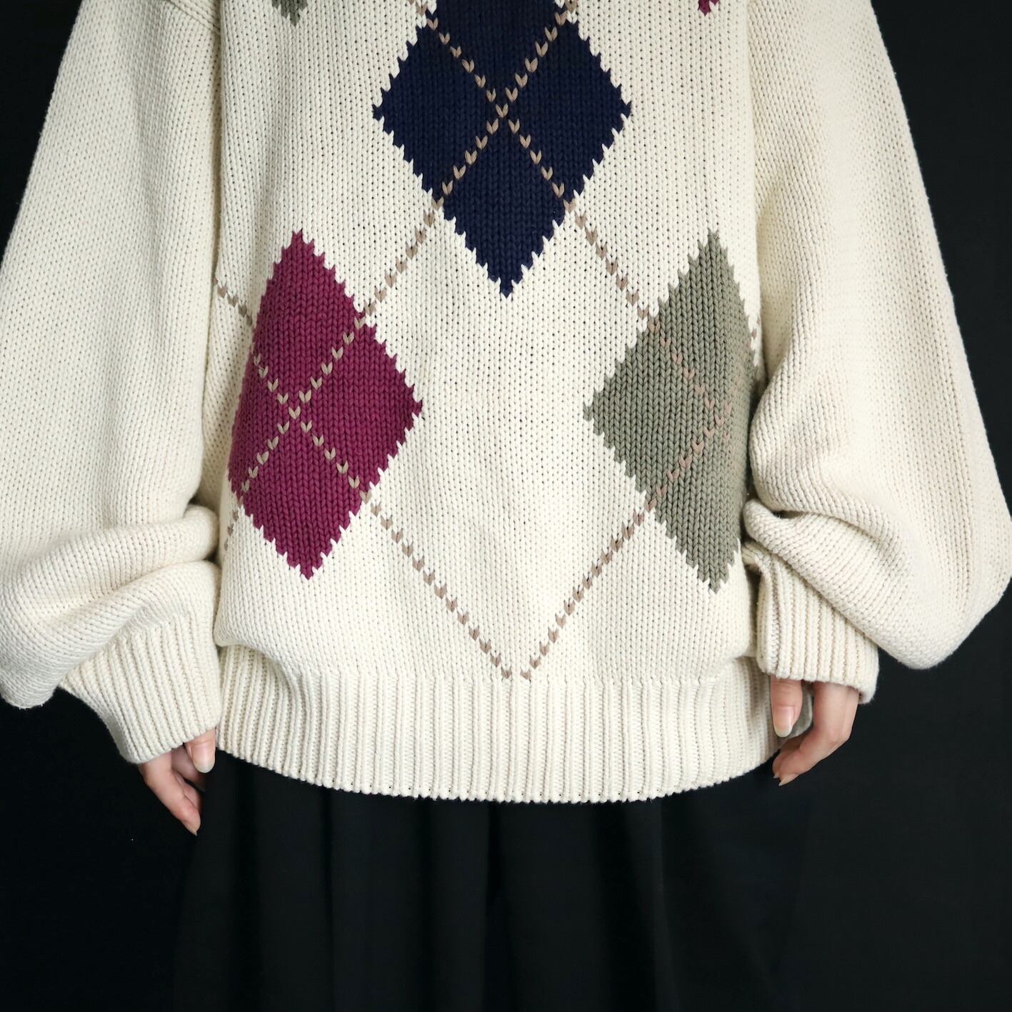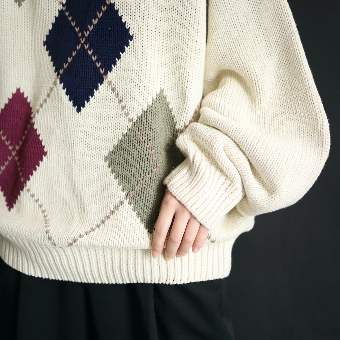 柔らかいホワイトカラーをベースに,ボルドー,カーキ,ネイビーのアーガイル柄.