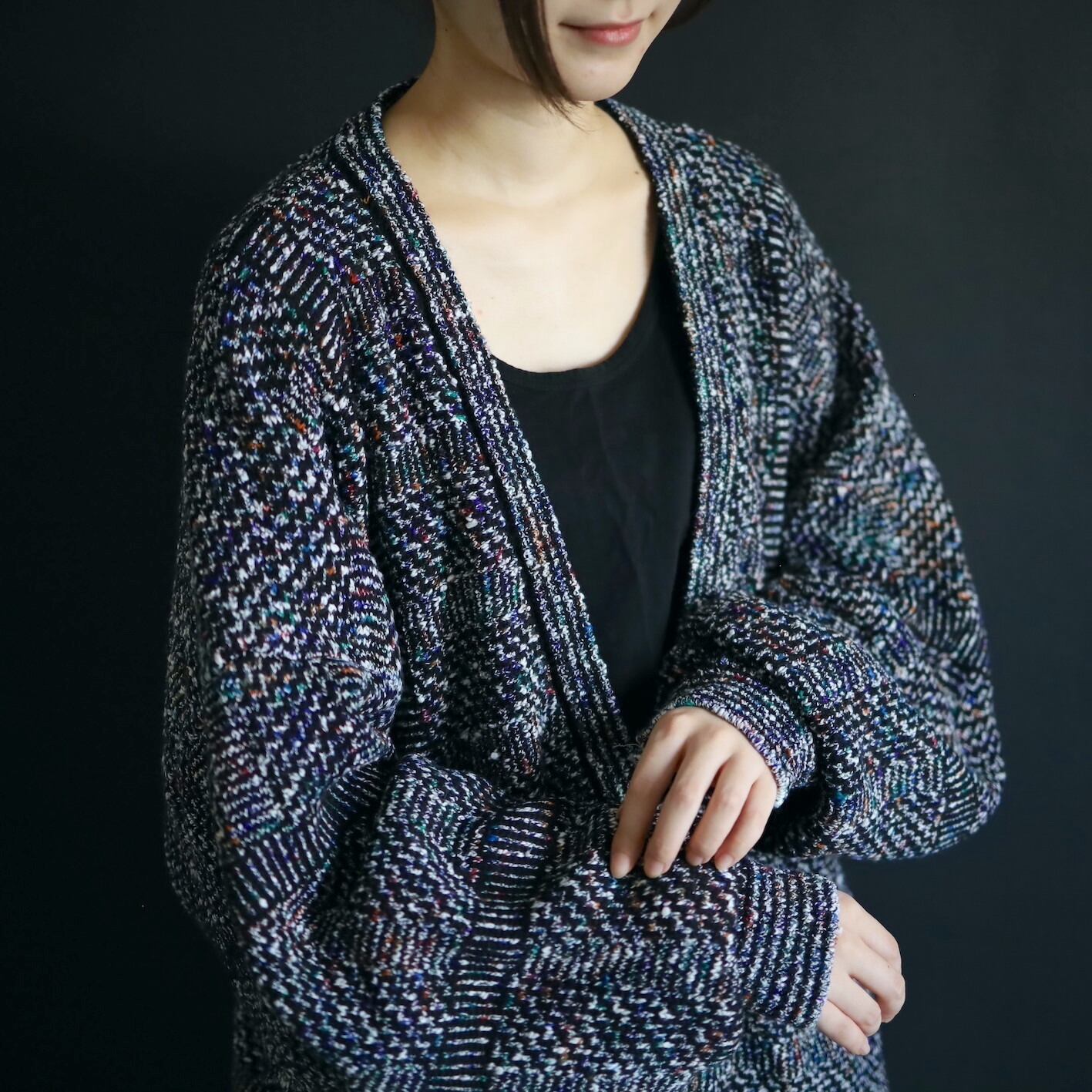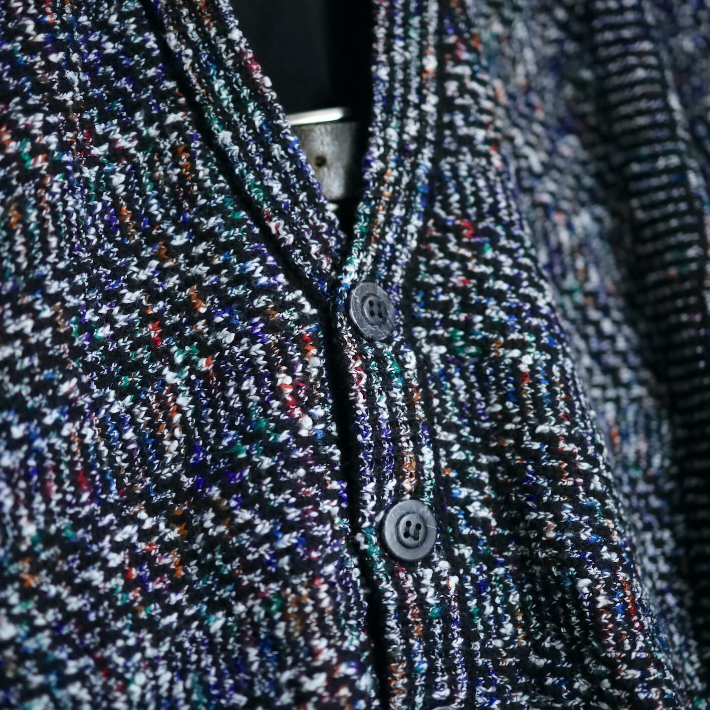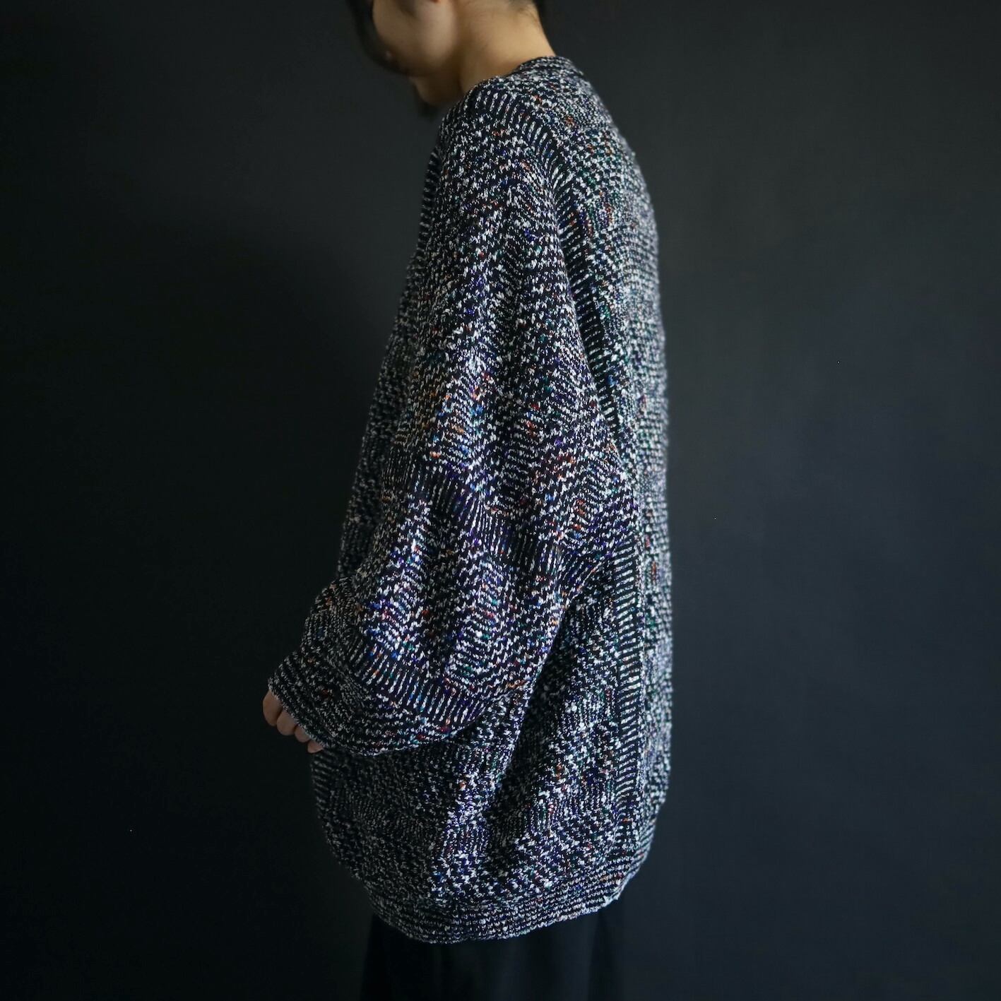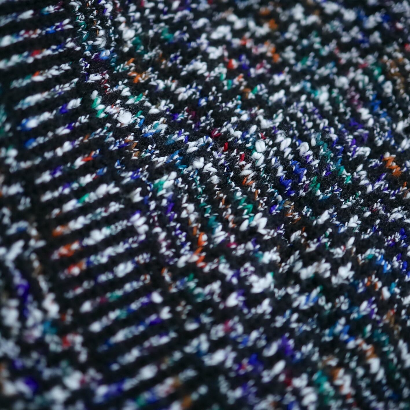 全体を通して見るとグレーっぽく見えますが,ブラック,ホワイト,レッド,オレンジ,ブルー,グリーン,ほか数色を細かく編み込んだデザイン.