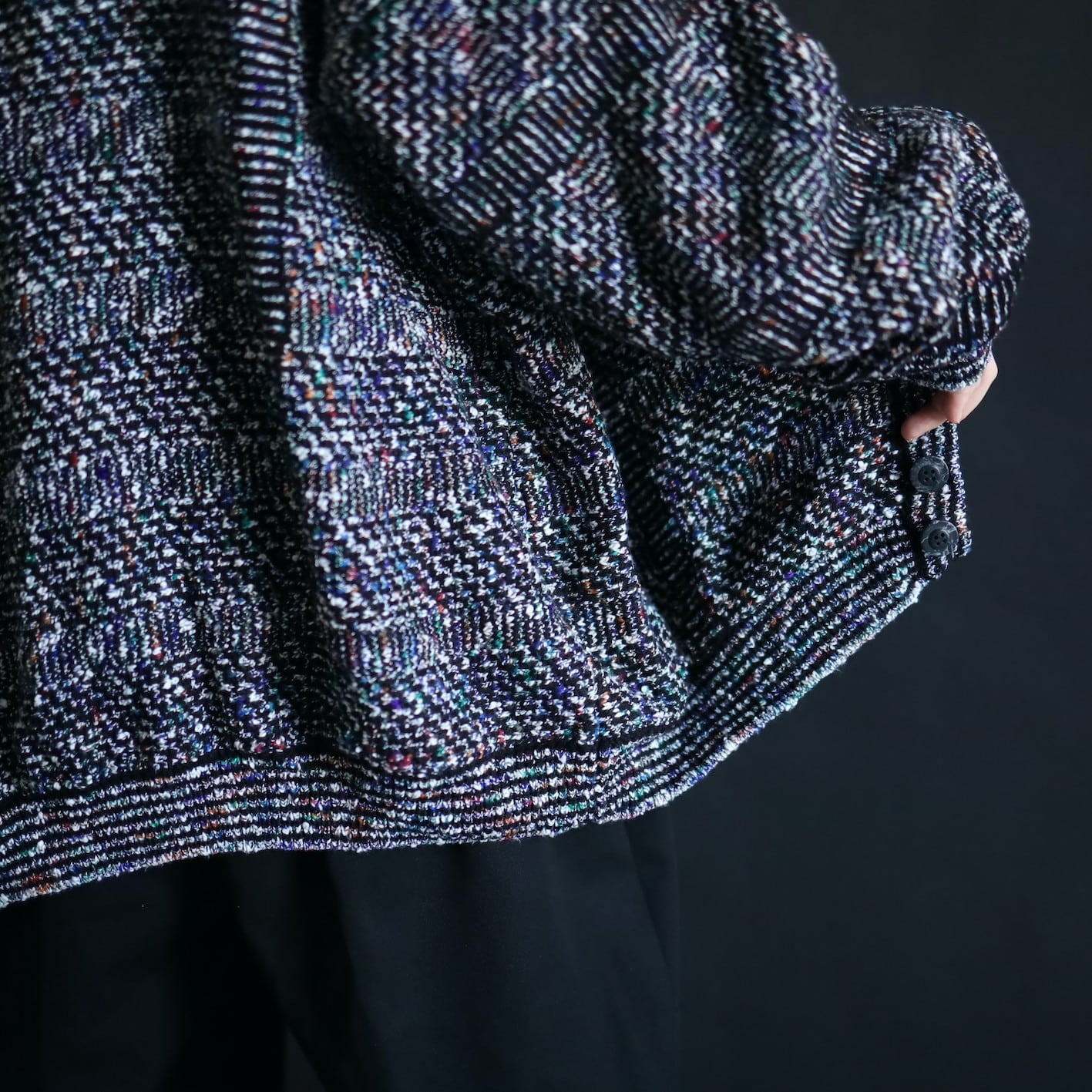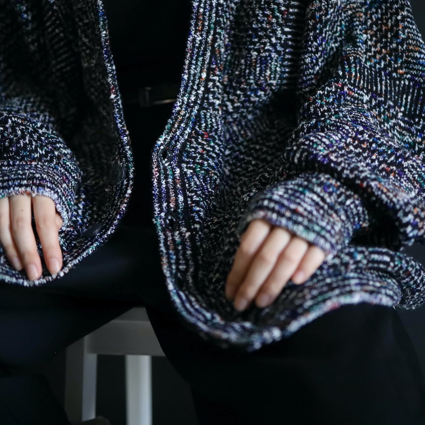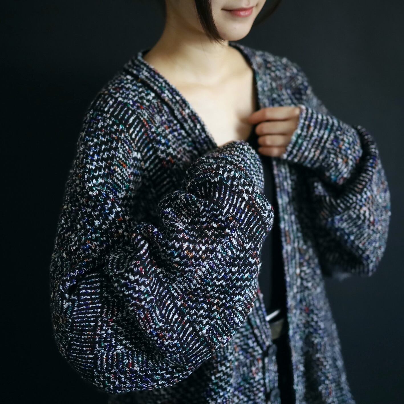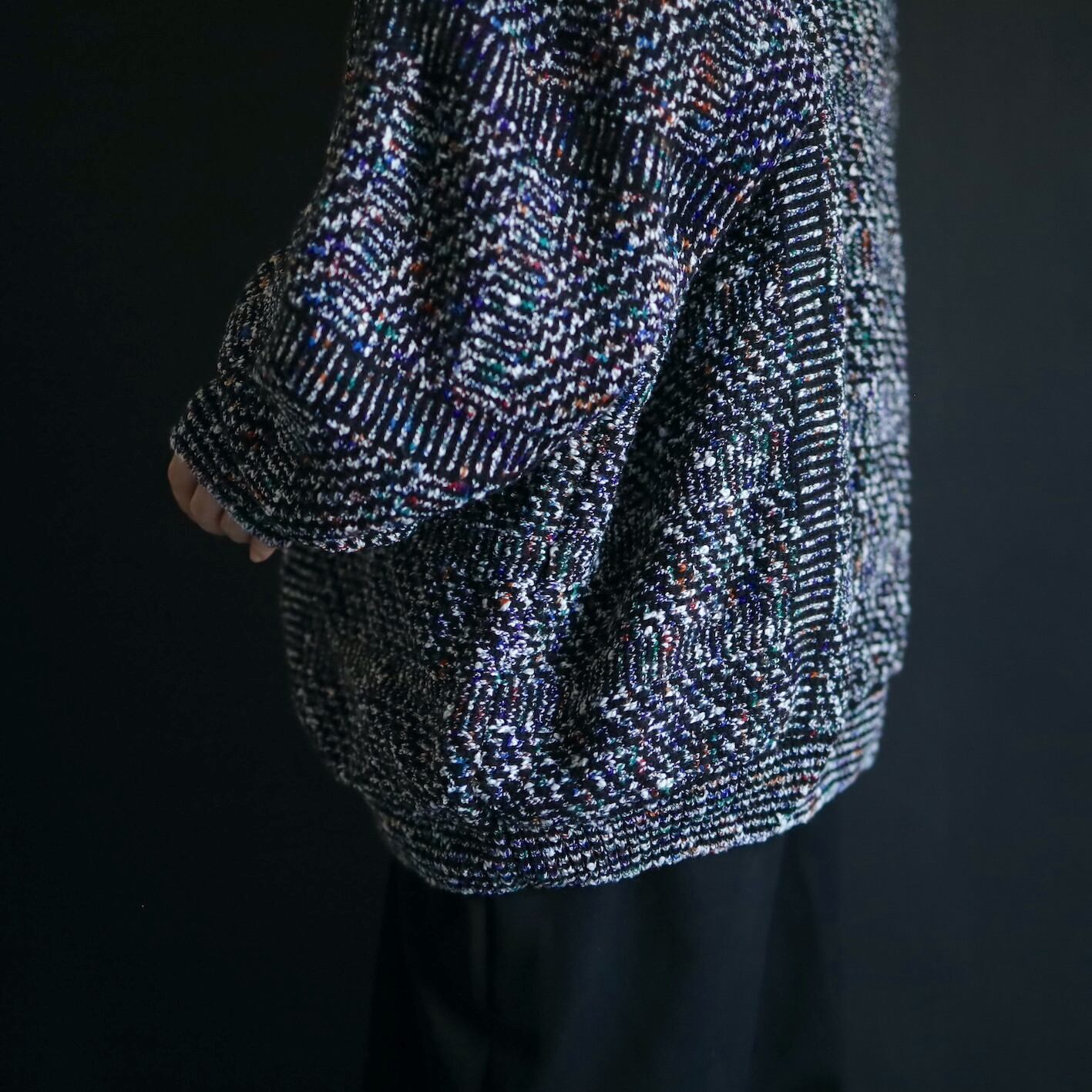 全体を通して見るとグレーっぽく見えますが,ブラック,ホワイト,レッド,オレンジ,ブルー,グリーン,ほか数色を細かく編み込んだデザイン.