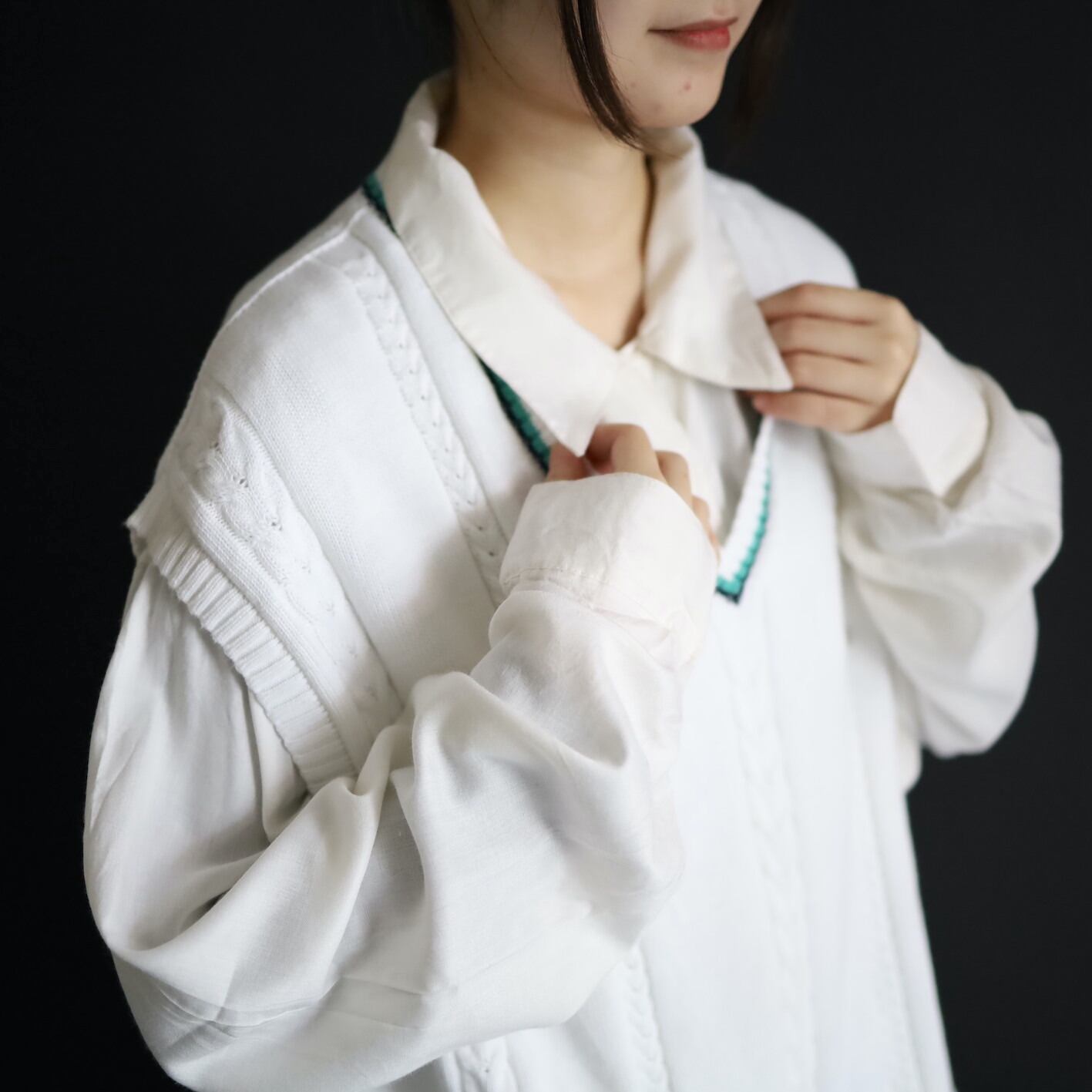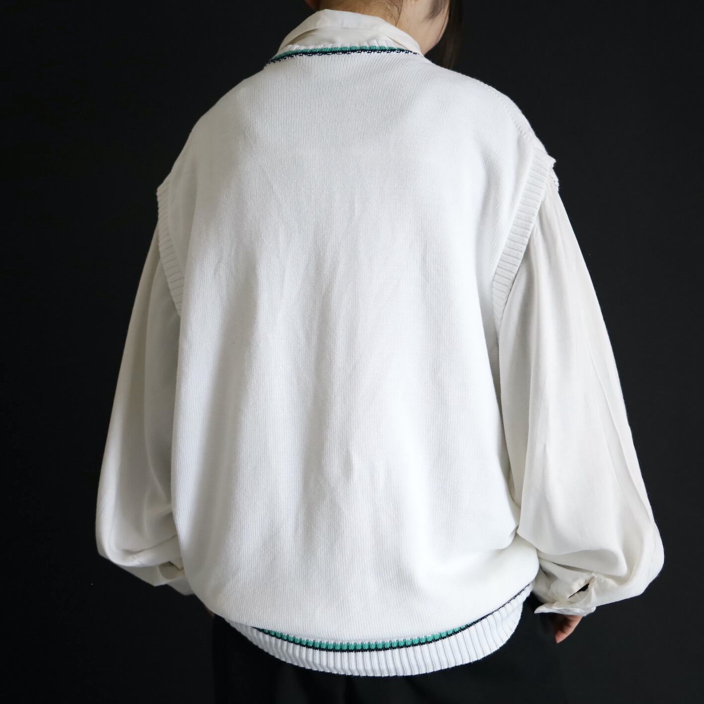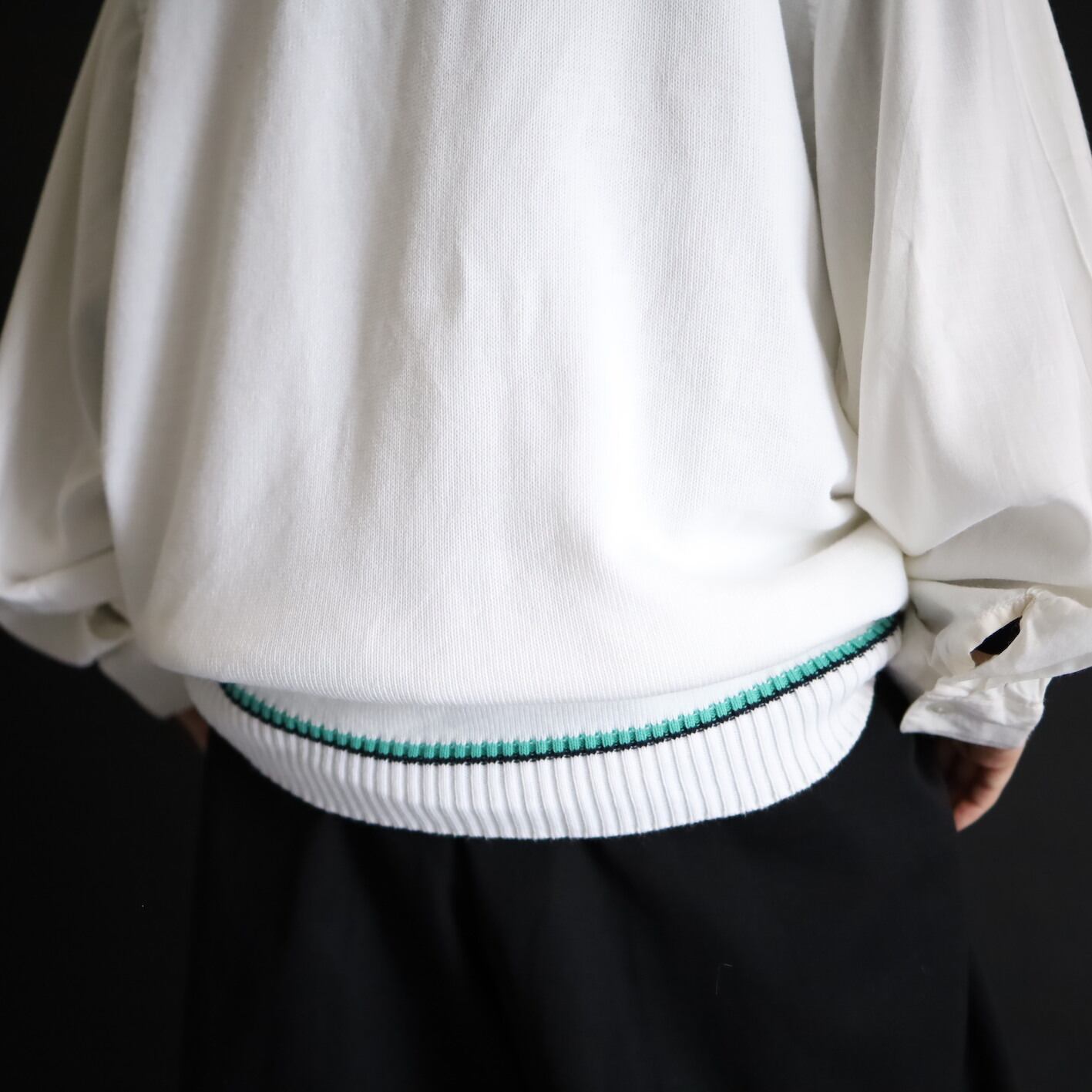 綺麗なホワイトボディをベースに,Vネック,裾を一周するライトグリーンとブラックライン.