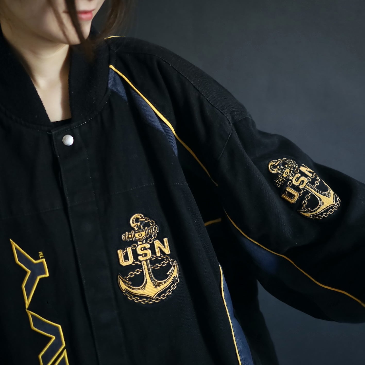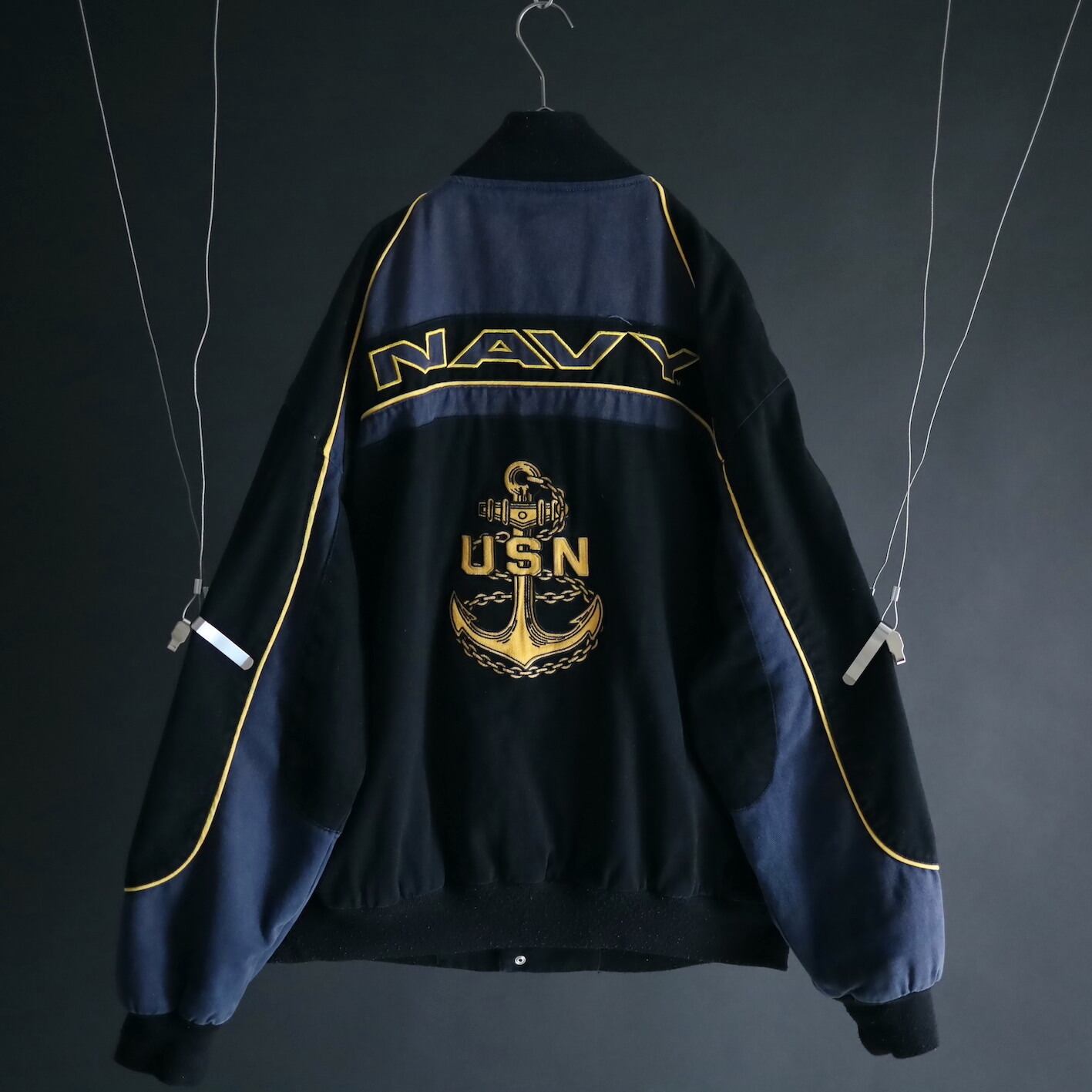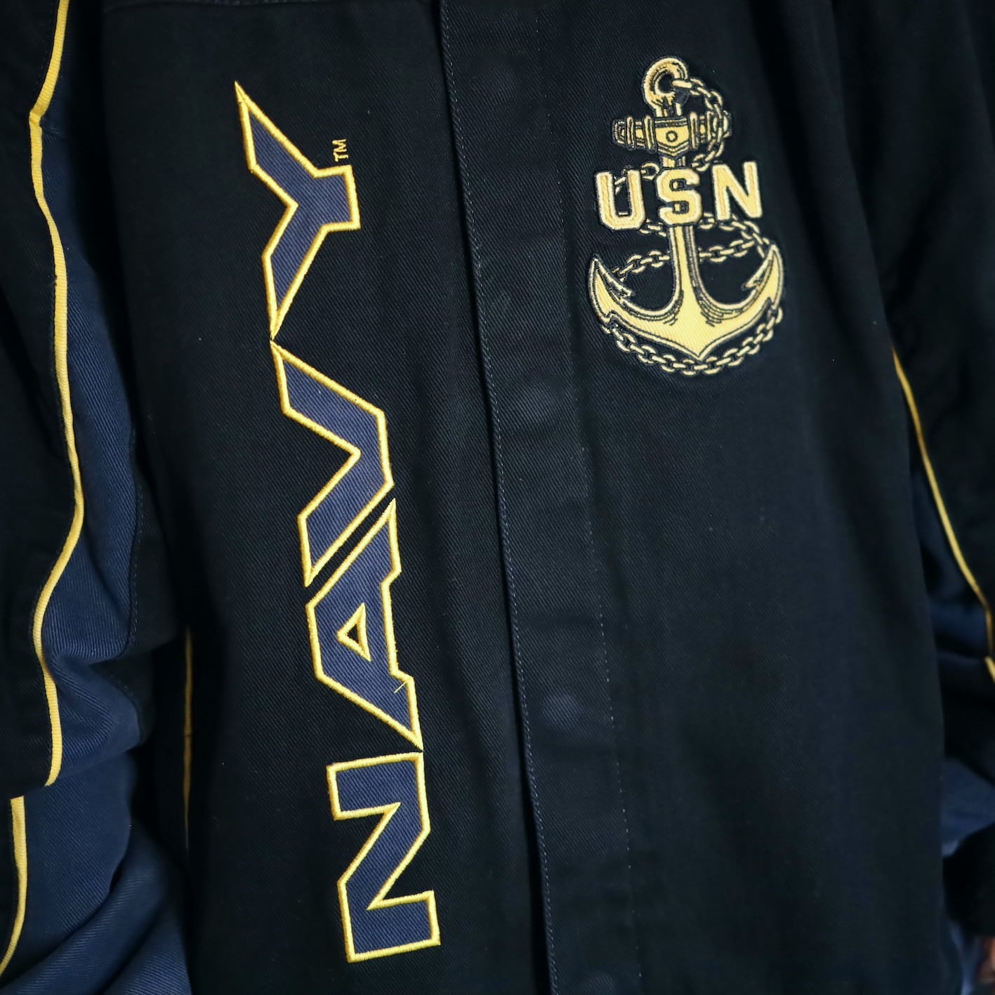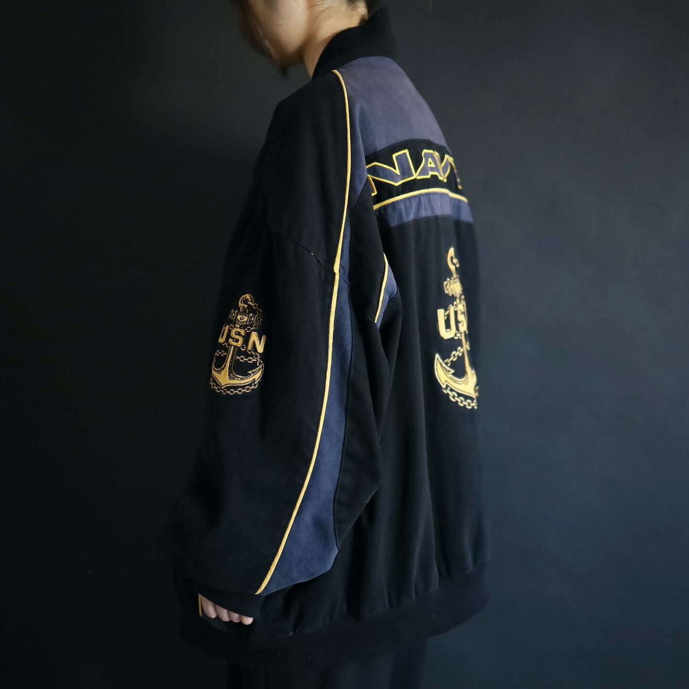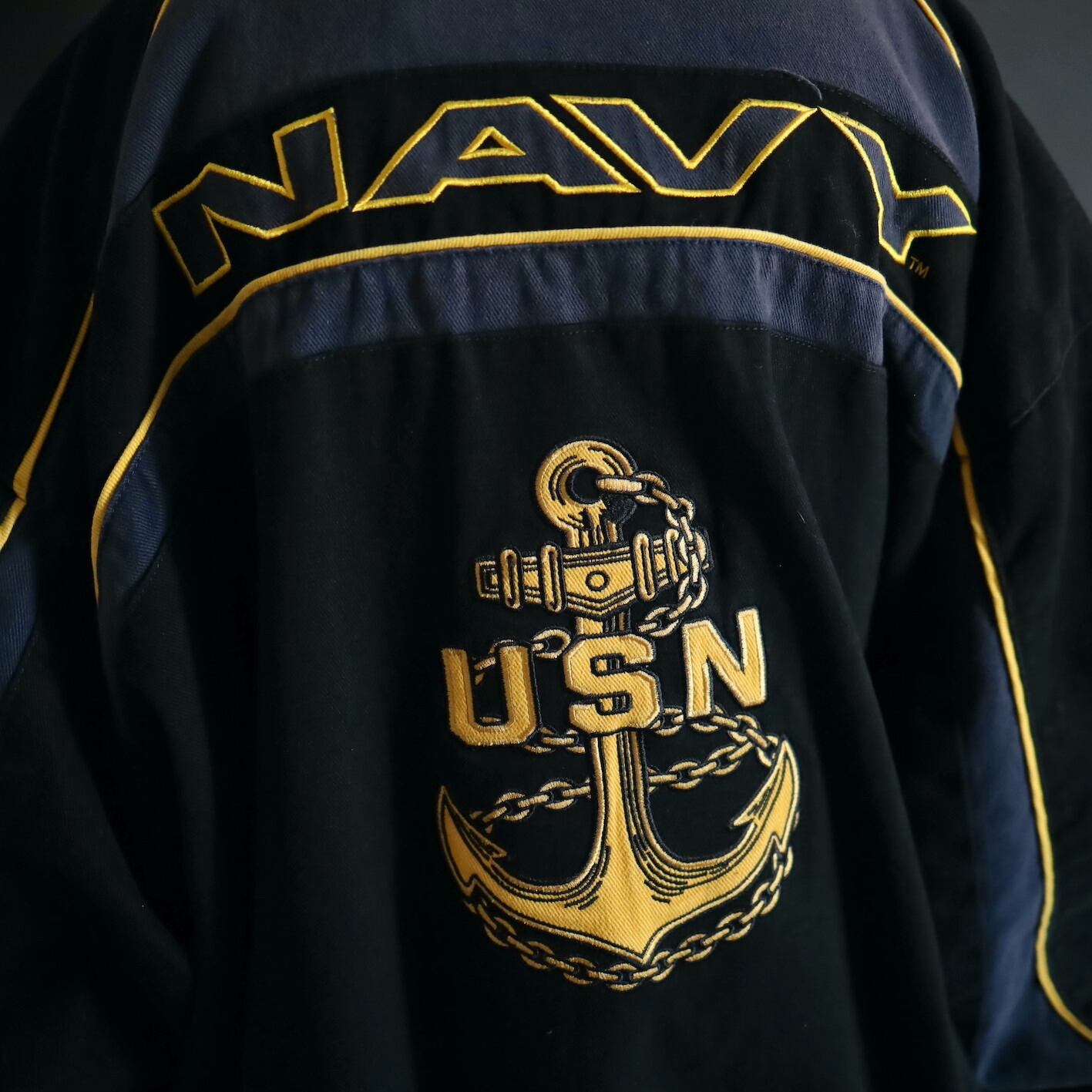 アメリカ合衆国海軍であるU.S.NAVYのワッペンと,両袖,左胸,バックにアンカーの刺繍デザイン.