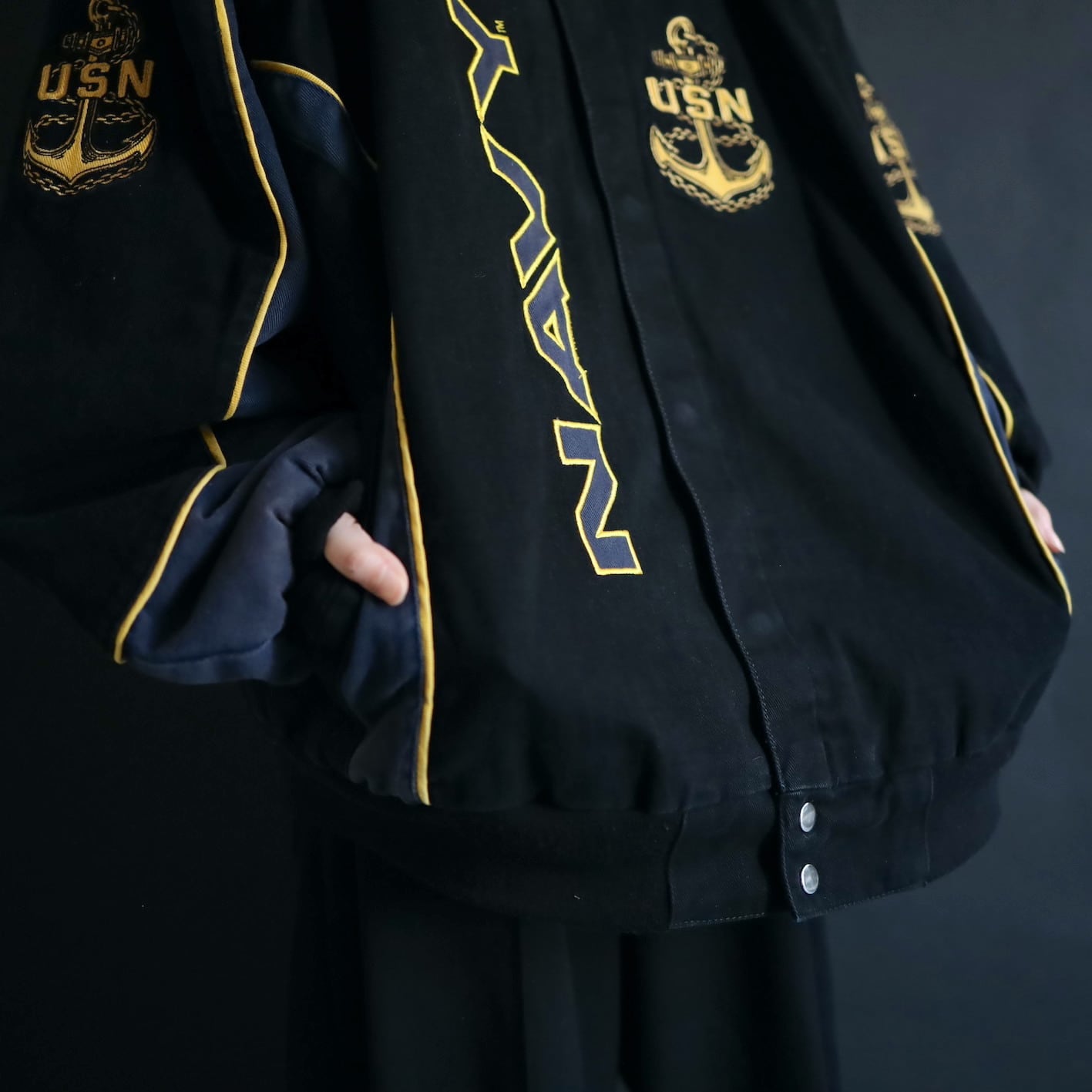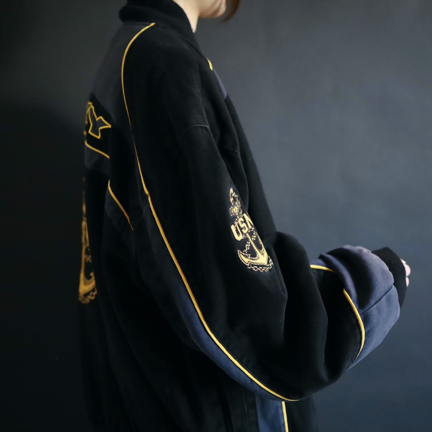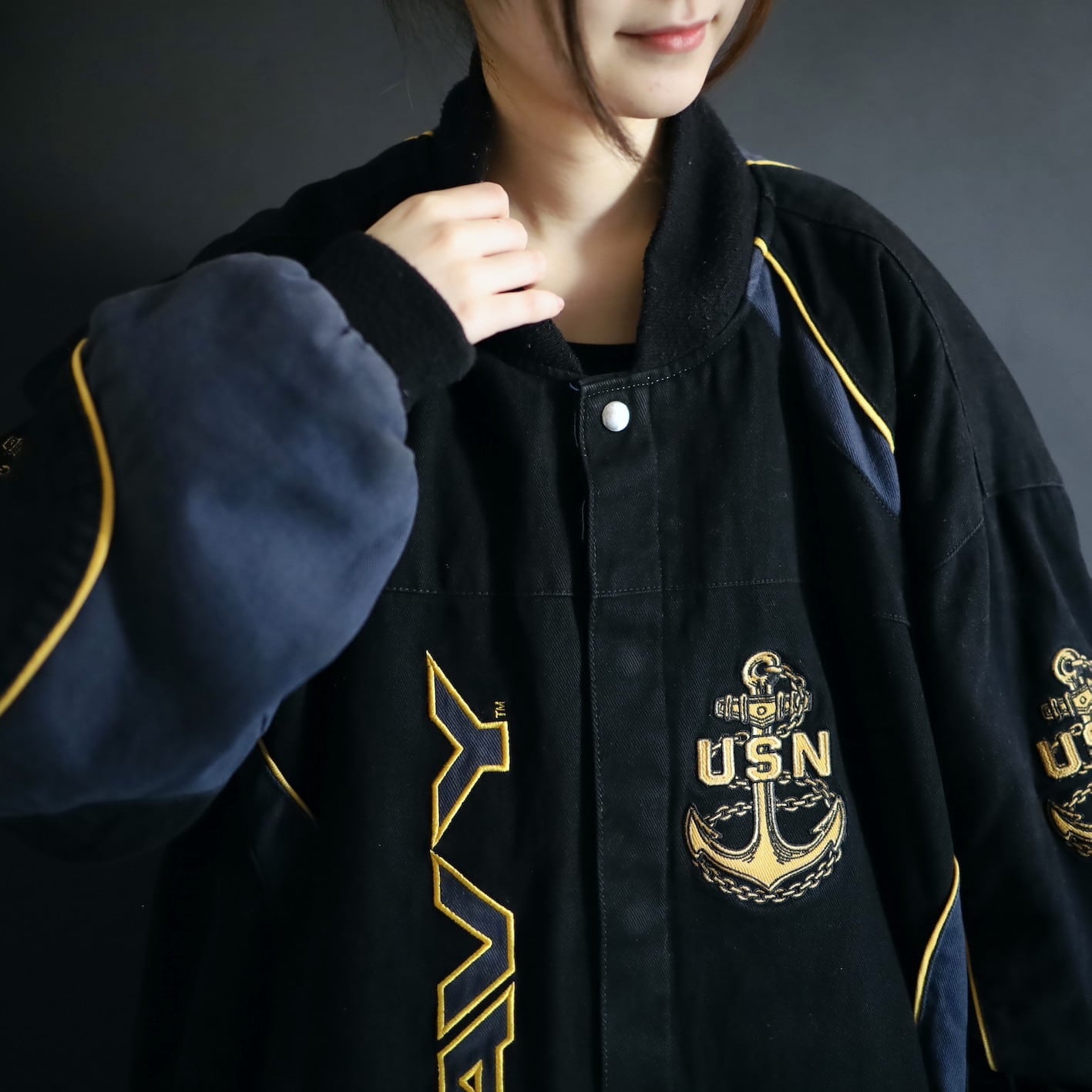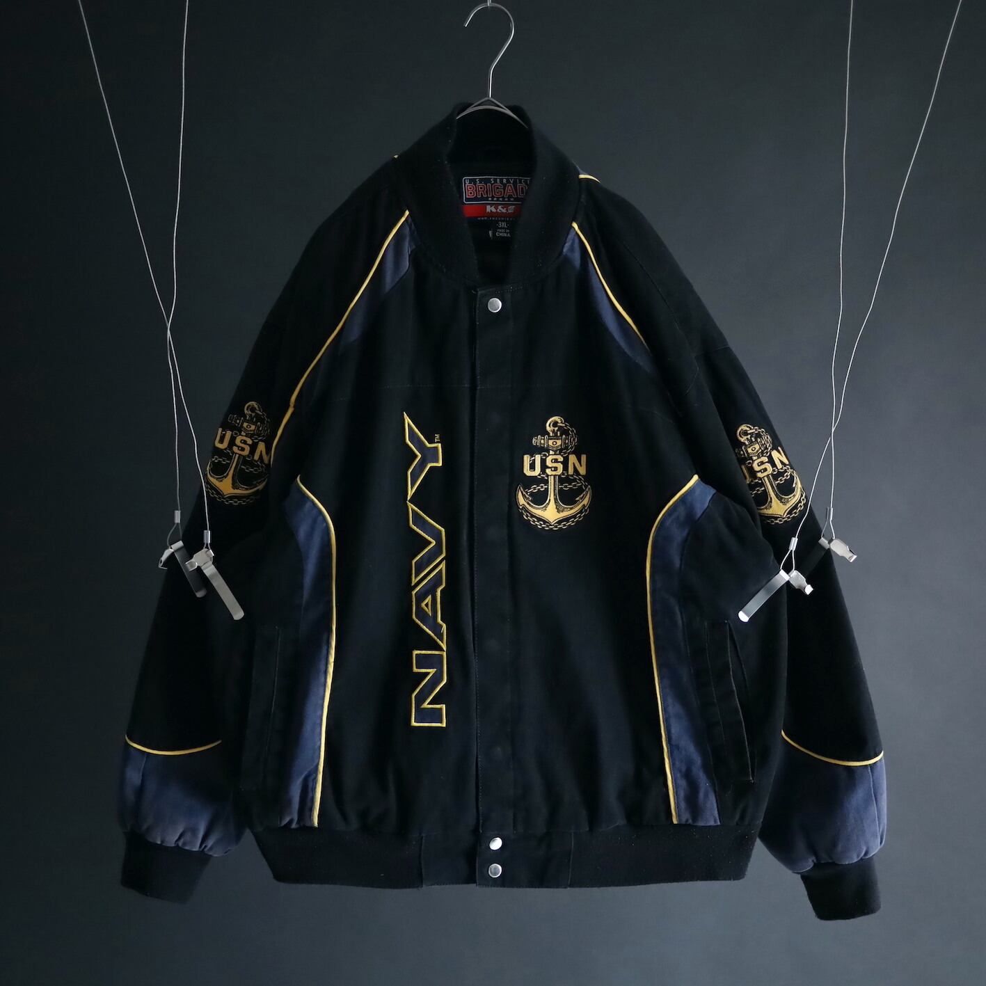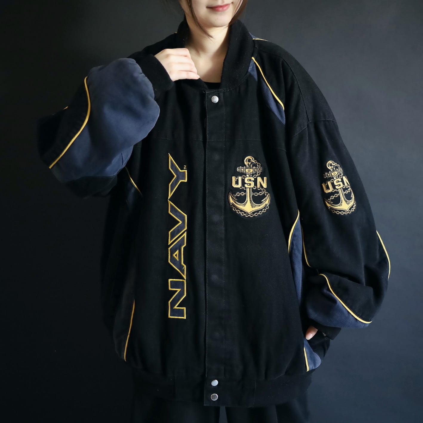 アメリカ合衆国海軍であるU.S.NAVYのワッペンと,両袖,左胸,バックにアンカーの刺繍デザイン.
