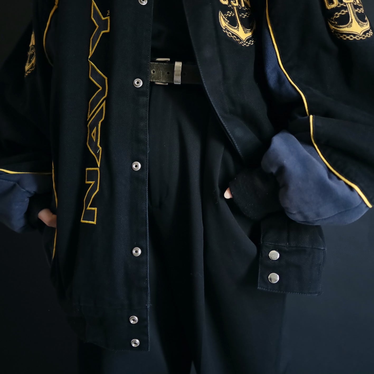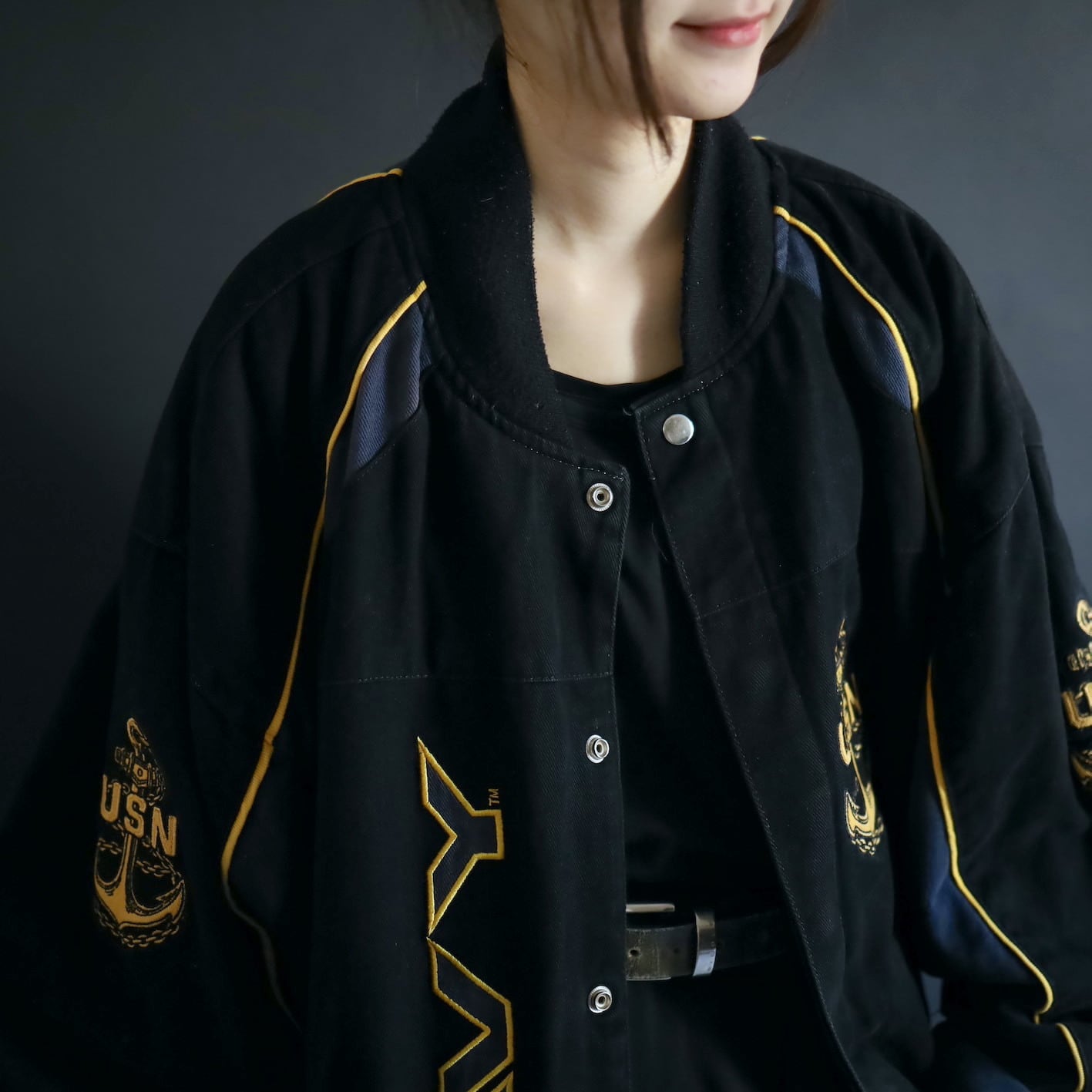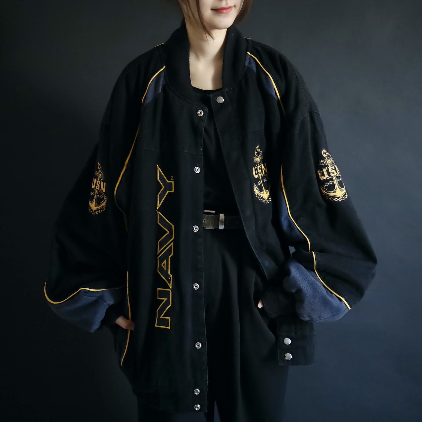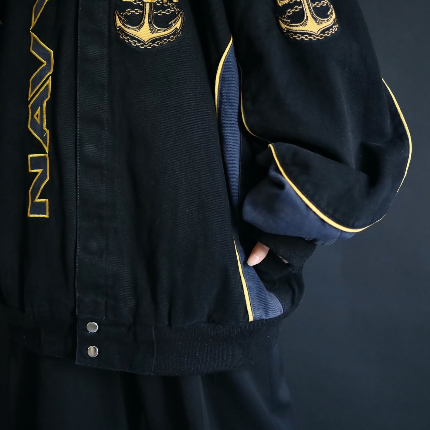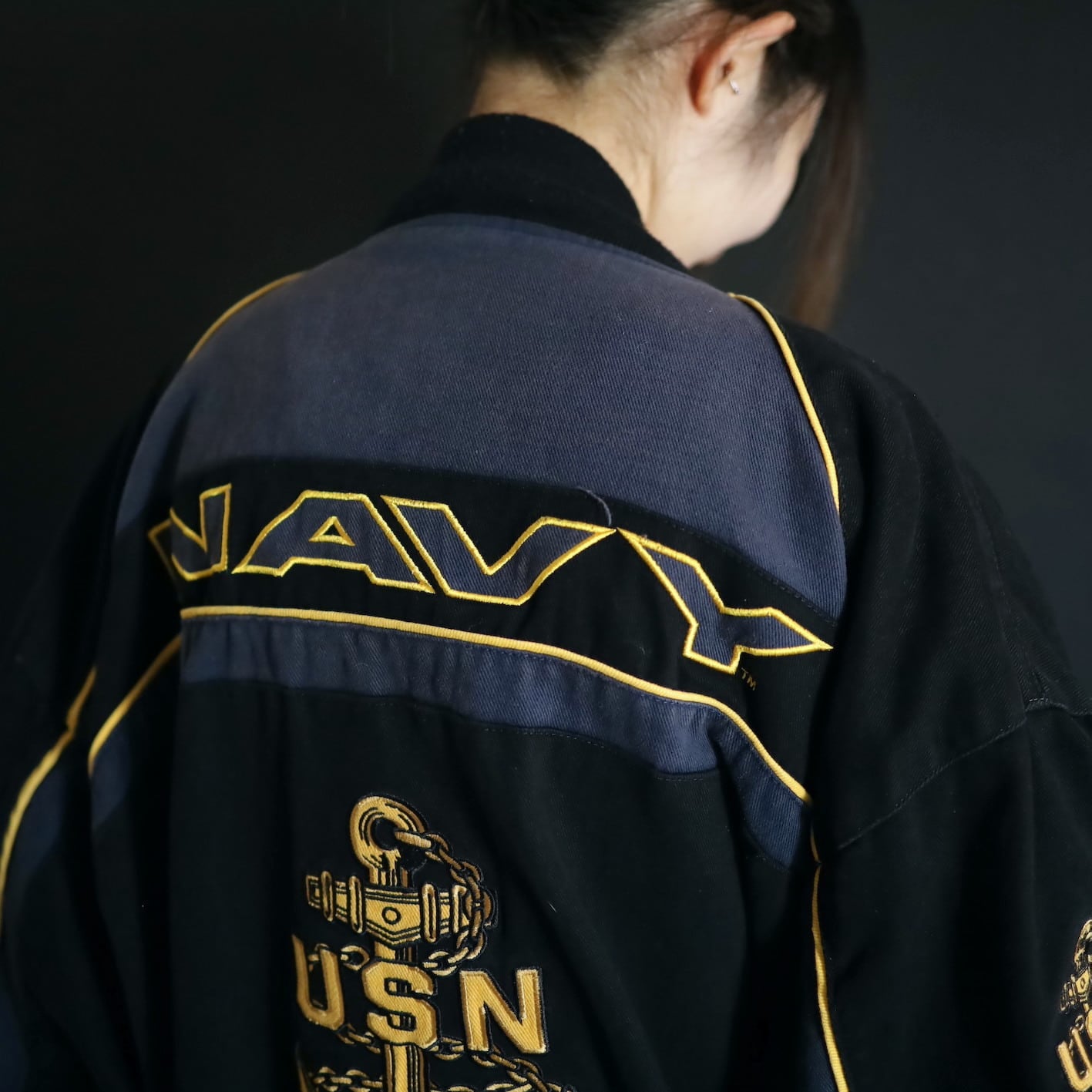 アメリカ合衆国海軍であるU.S.NAVYのワッペンと,両袖,左胸,バックにアンカーの刺繍デザイン.