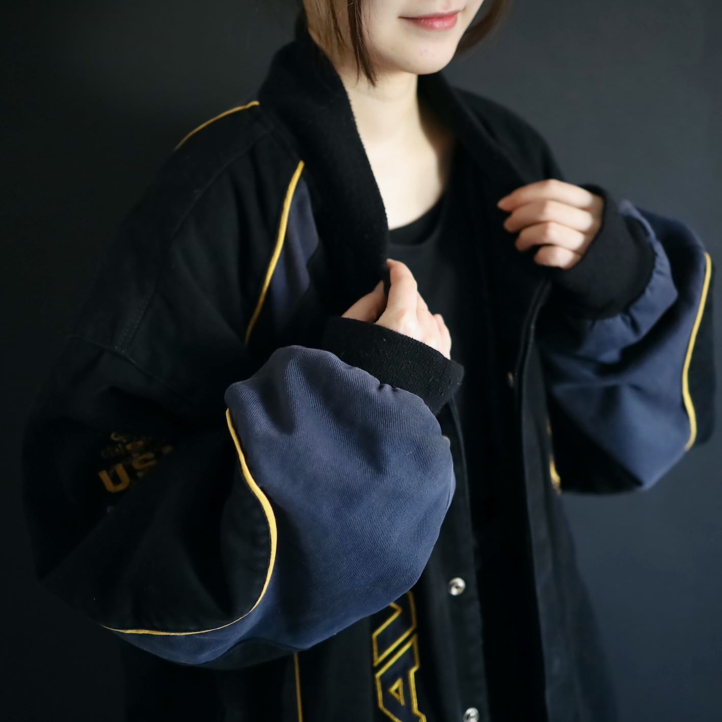 派手なカラーリングのレーシングジャケットと違い,落ち着いたトーンでコーデにも落とし込みやすい逸品.
