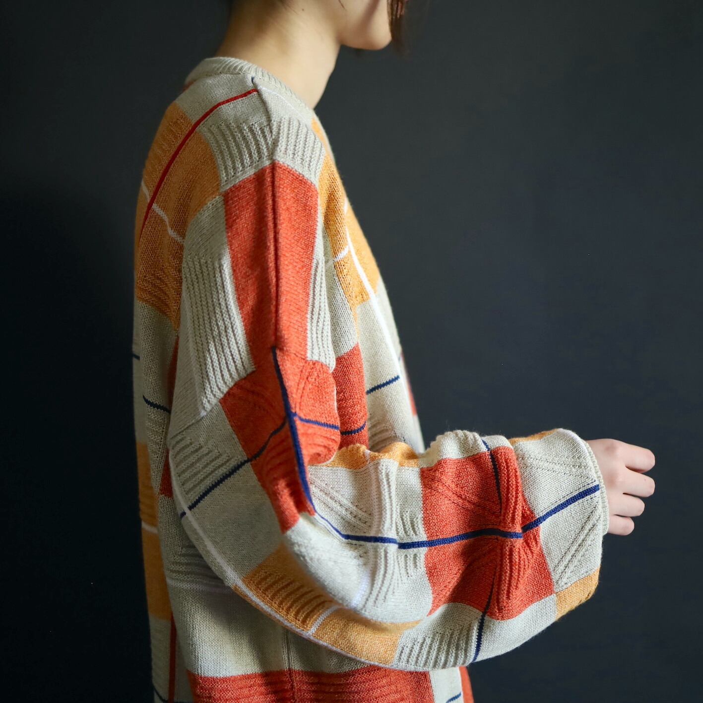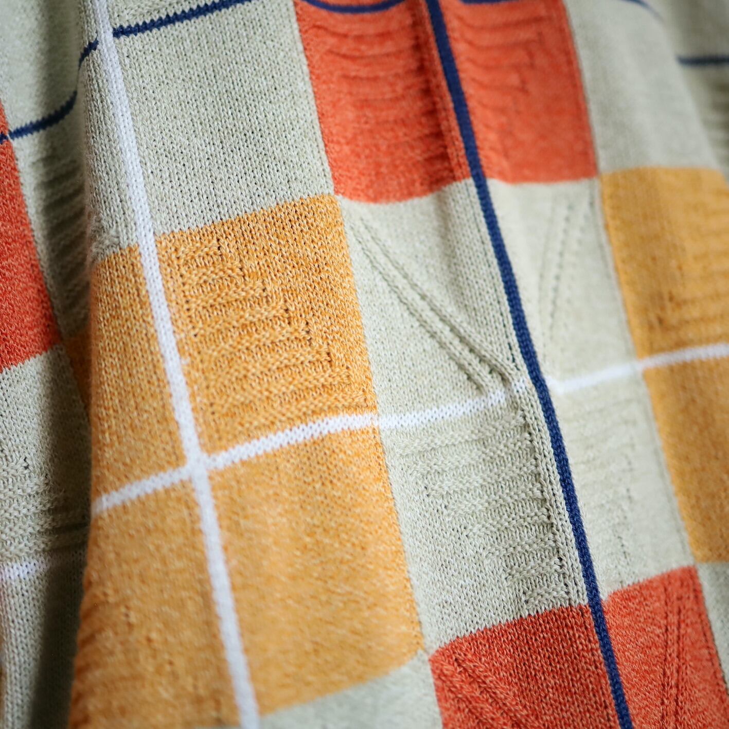 グレージュと濃淡のオレンジの3色パネル切替と,ホワイト,ネイビー,オレンジの格子ライン.