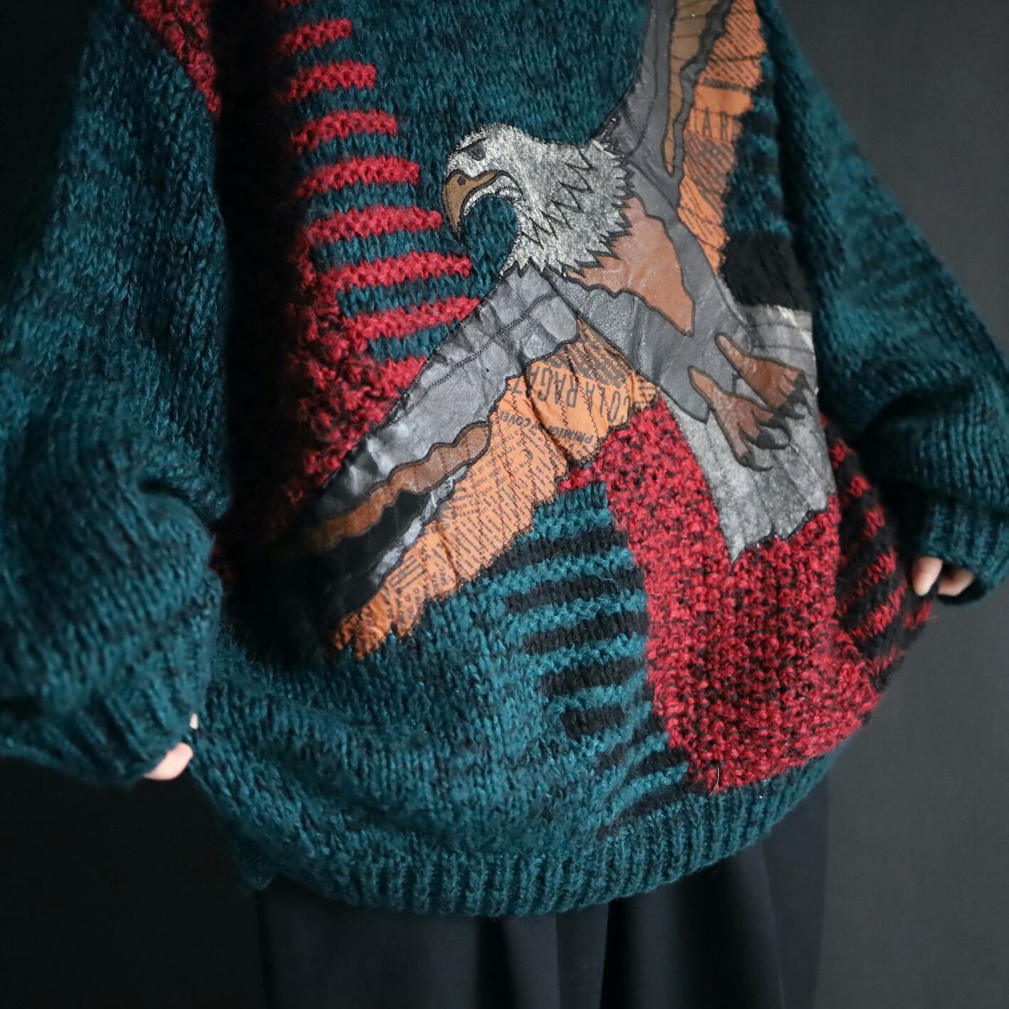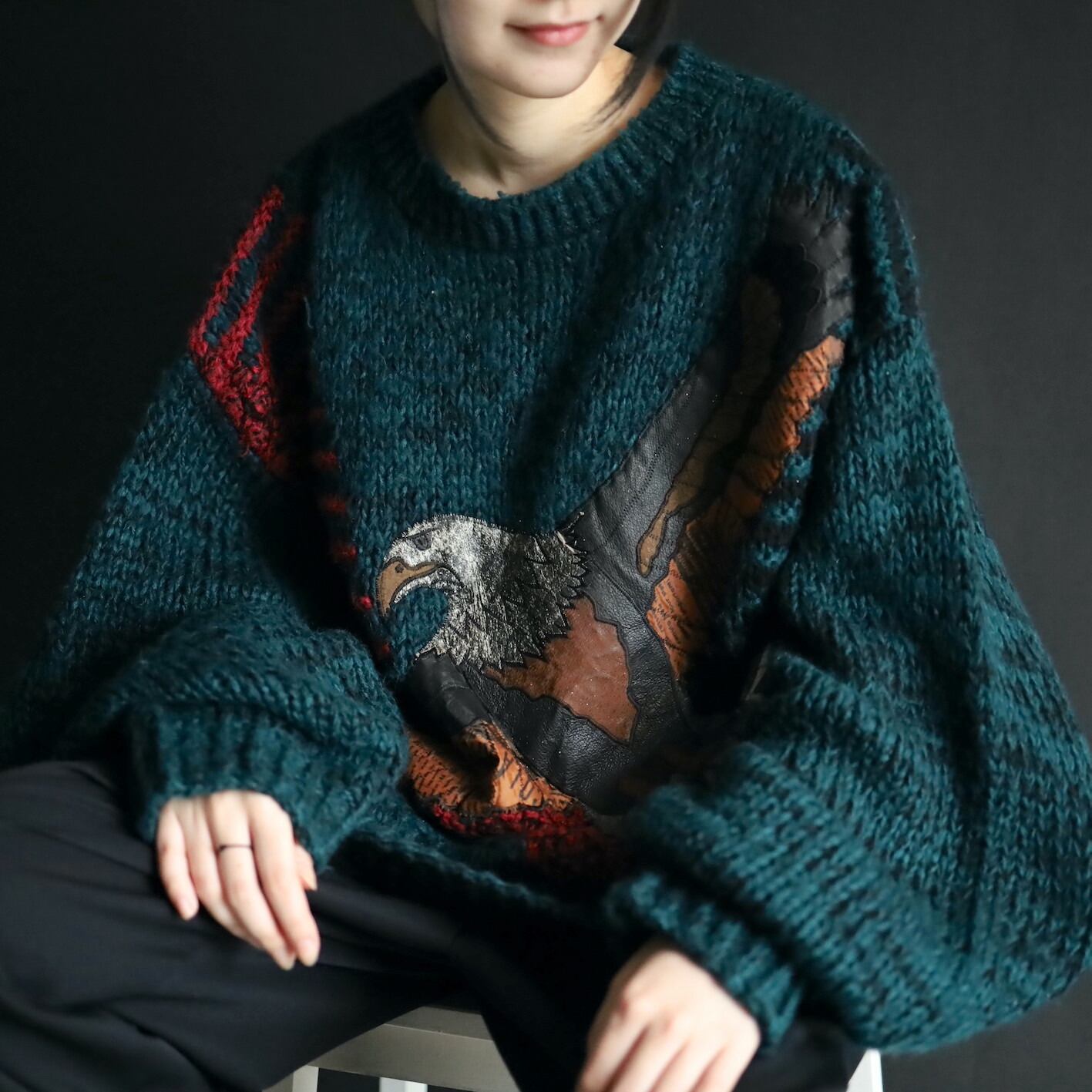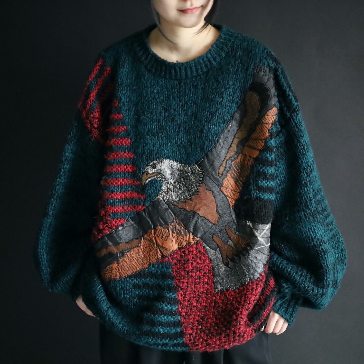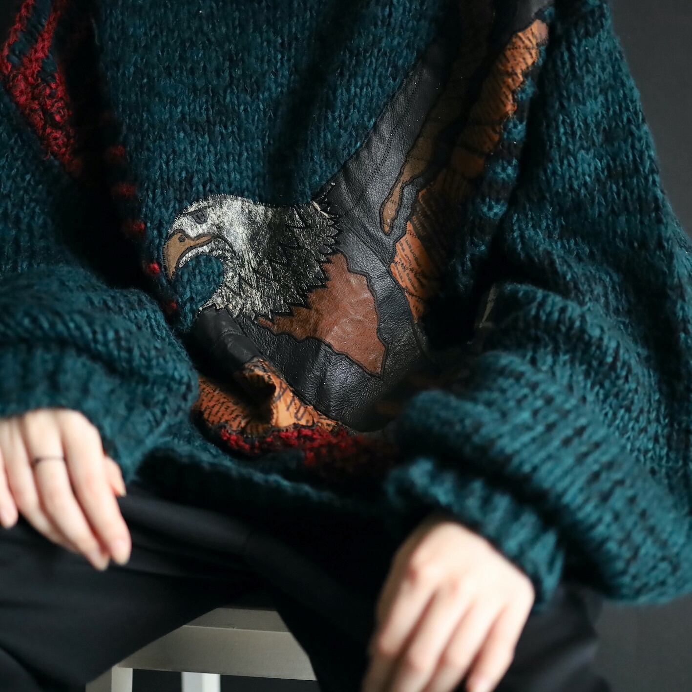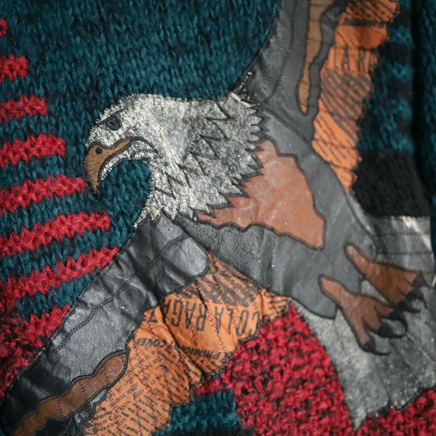 フロントレッド,ブラックのジャガード織切替と,このニットの要,鷹のレザーパッチワークデザイン.