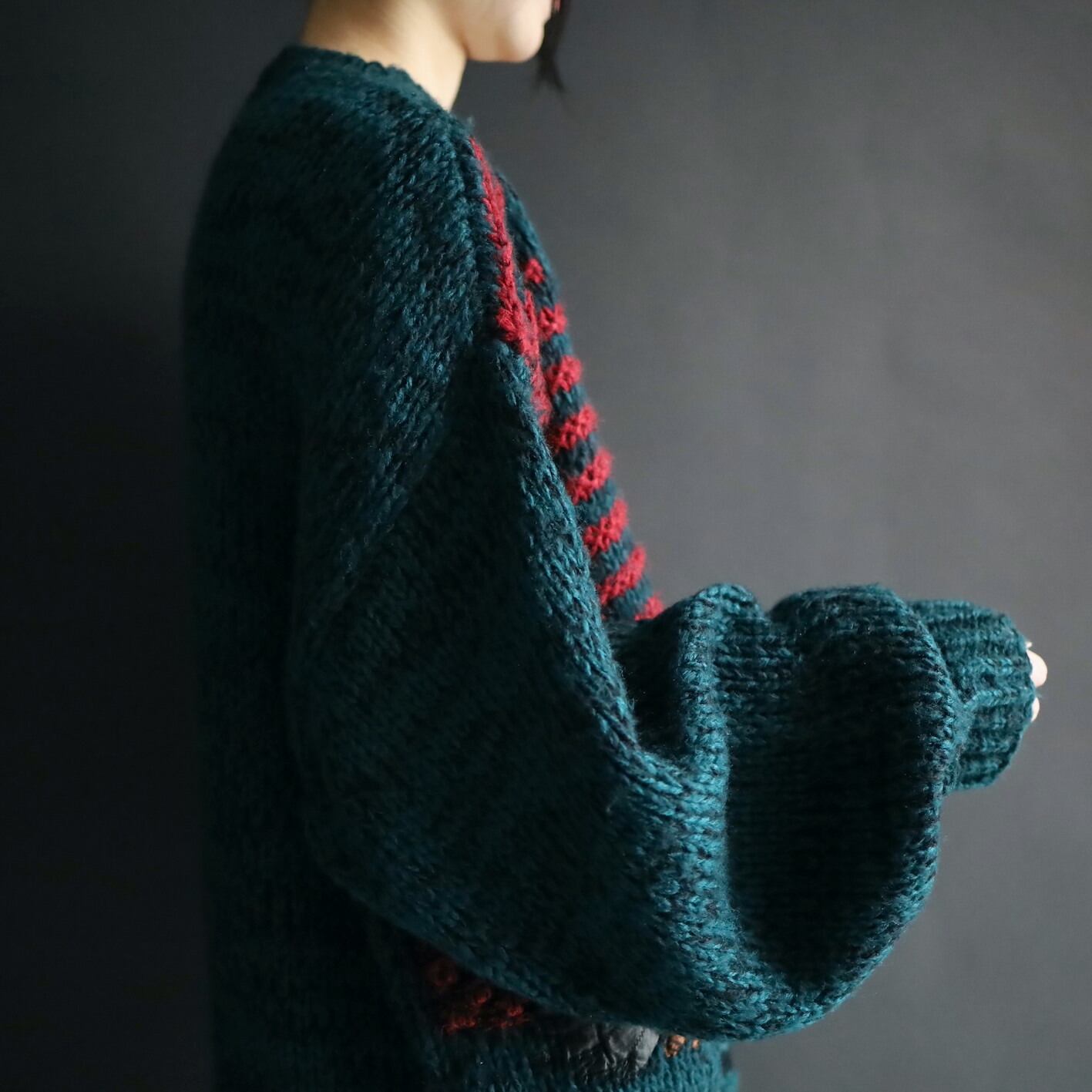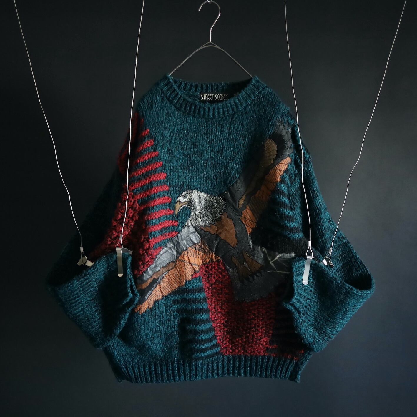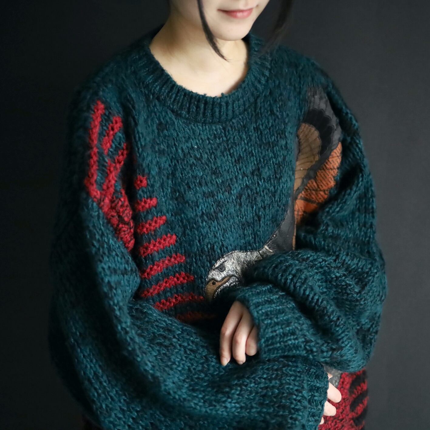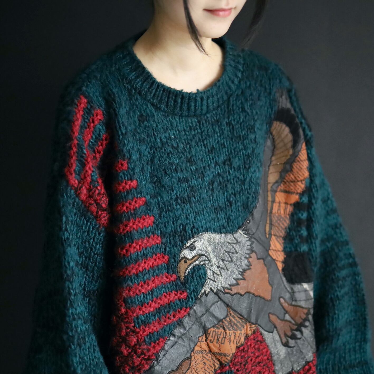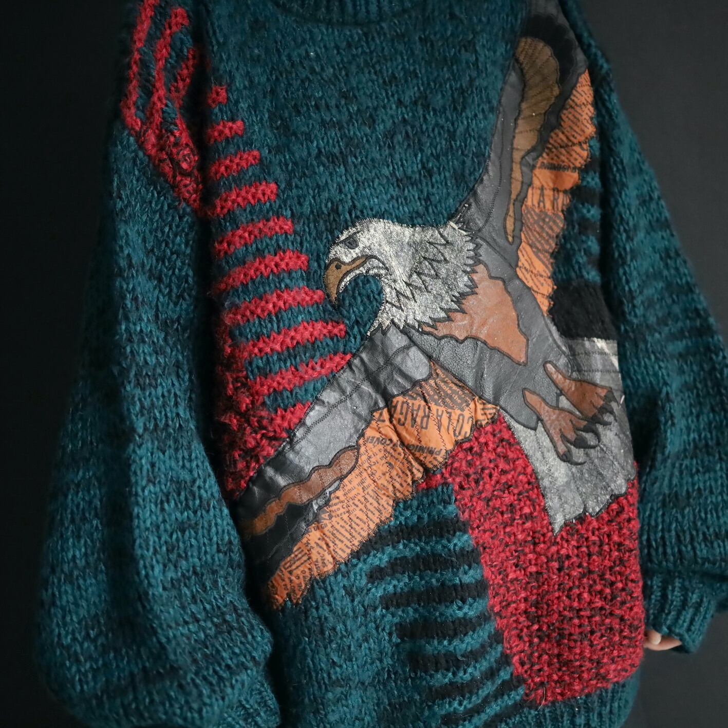 フロントレッド,ブラックのジャガード織切替と,このニットの要,鷹のレザーパッチワークデザイン.