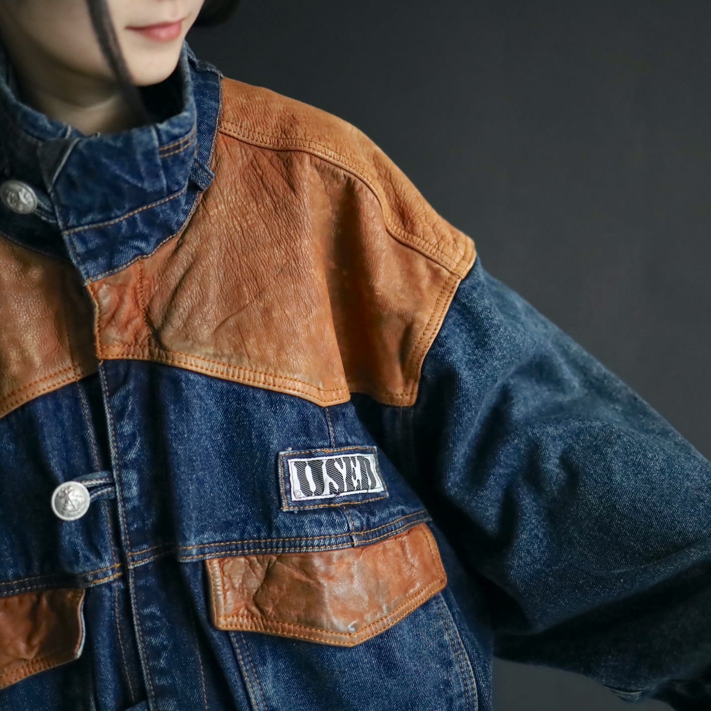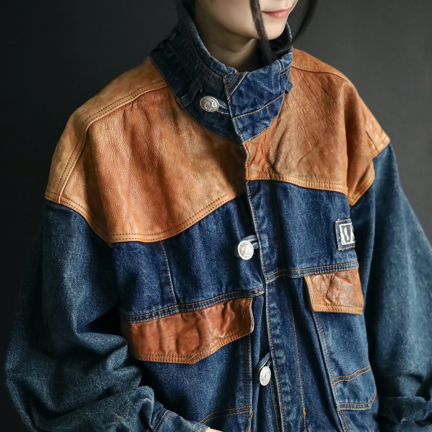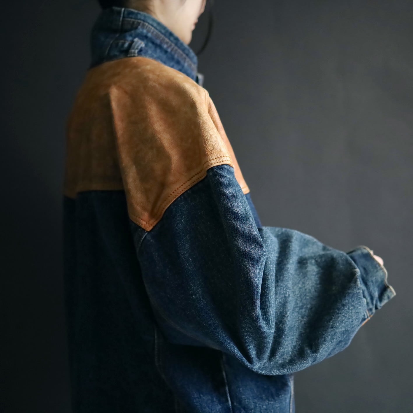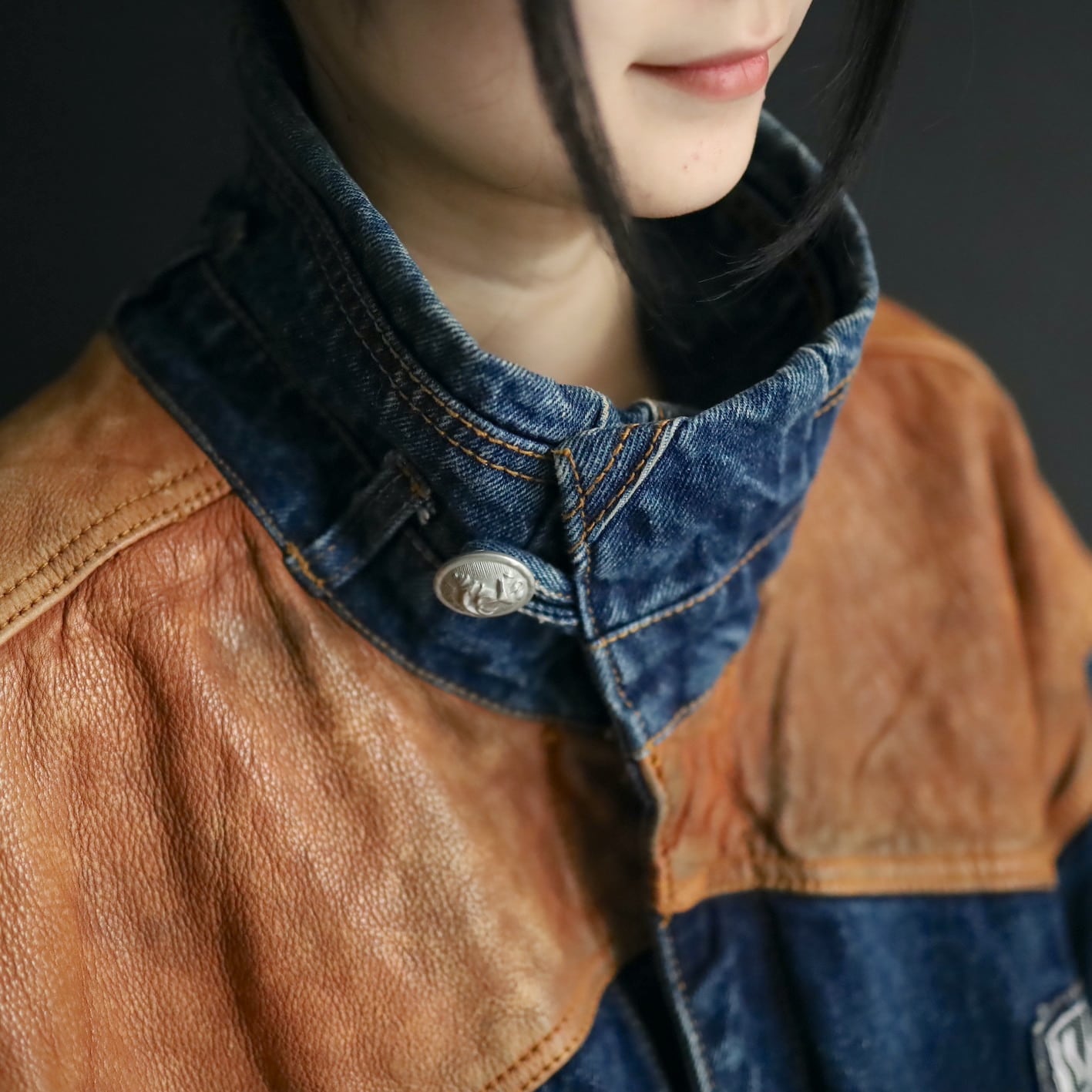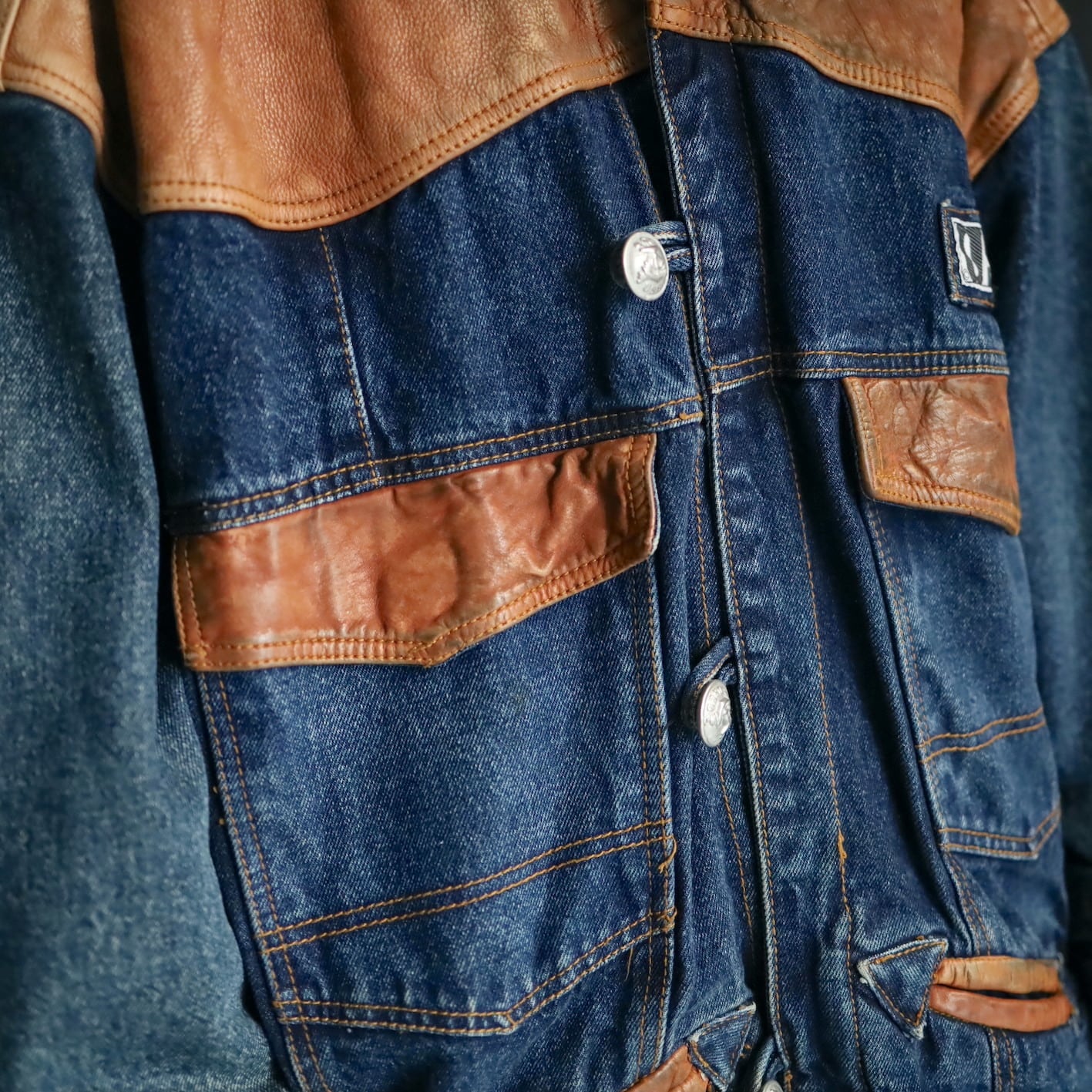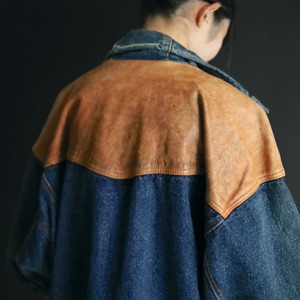ほどよく色落ちしたブルーデニムと,褪せた色味のキャメルレザーの相性が際立つ一枚です.