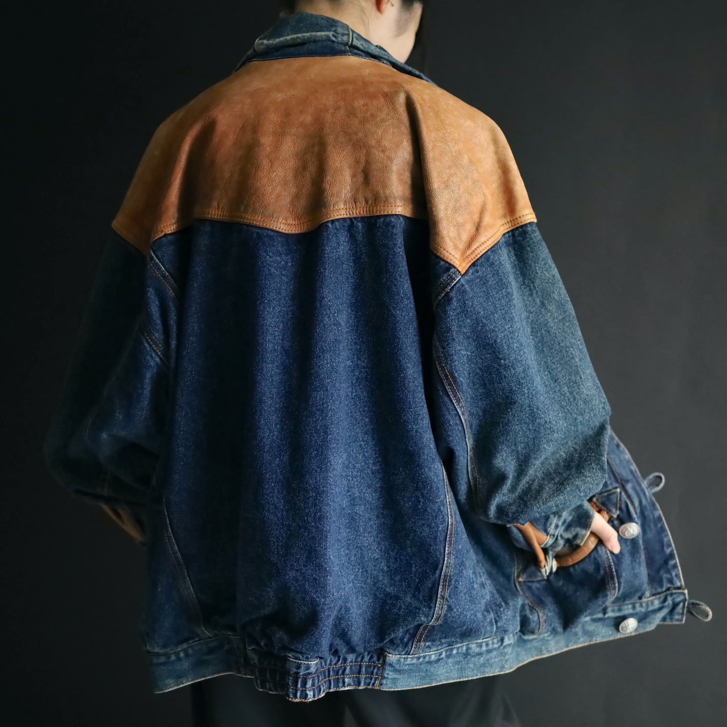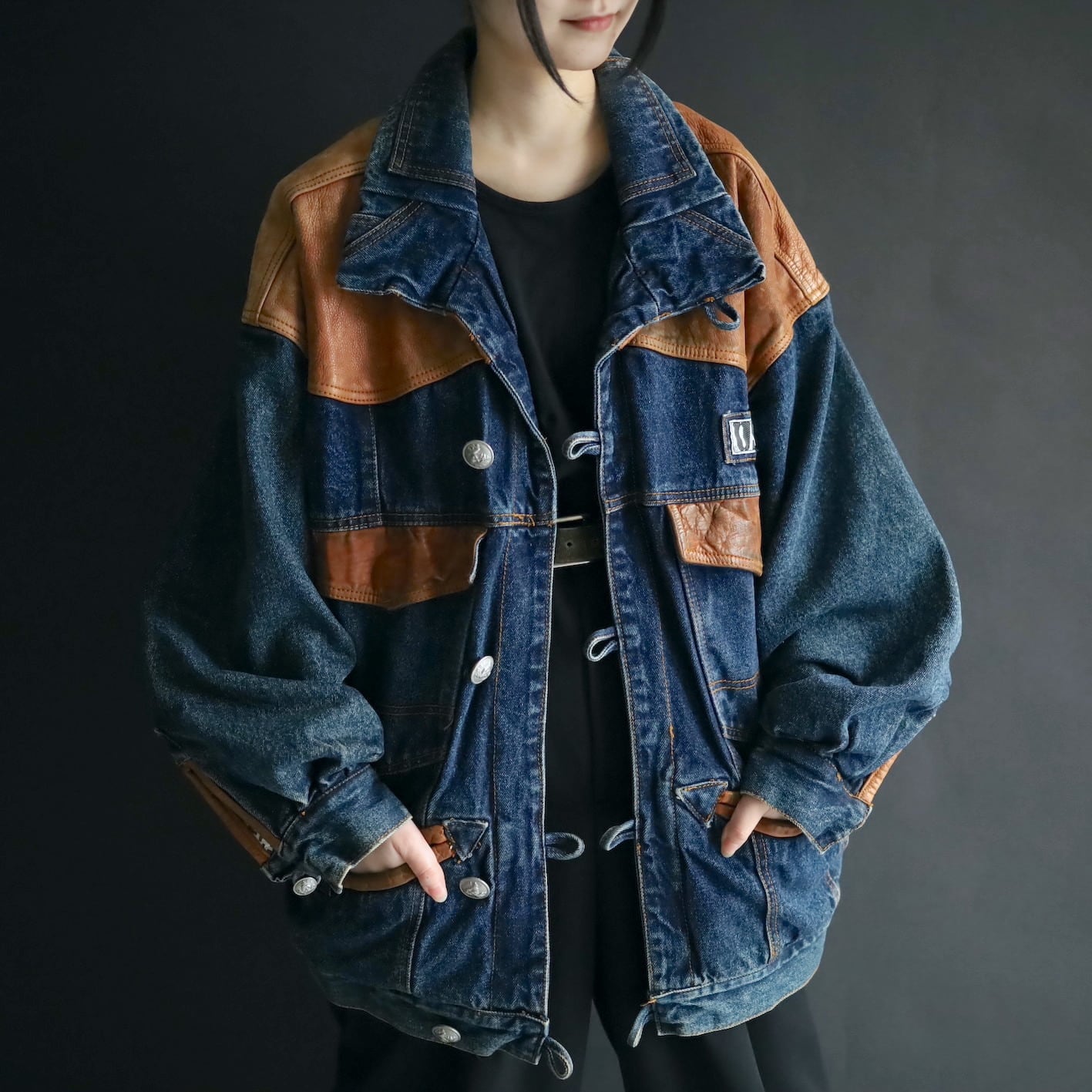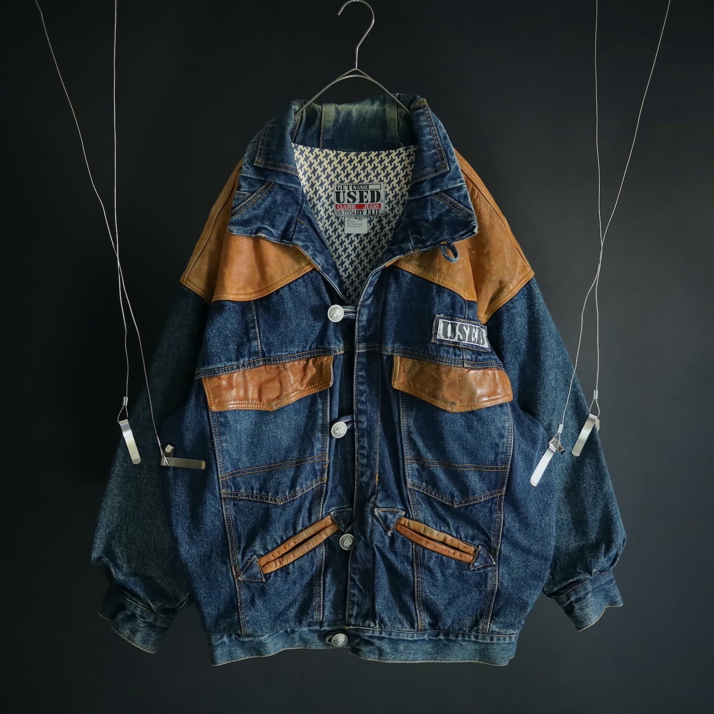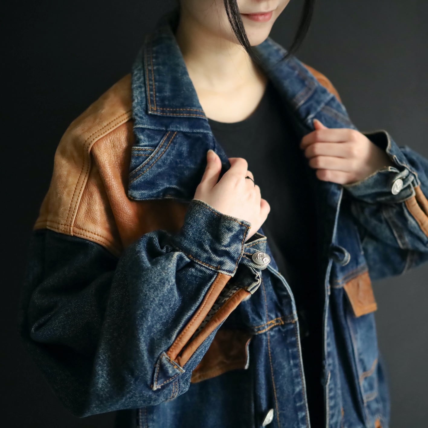 ほどよく色落ちしたブルーデニムと,褪せた色味のキャメルレザーの相性が際立つ一枚です.