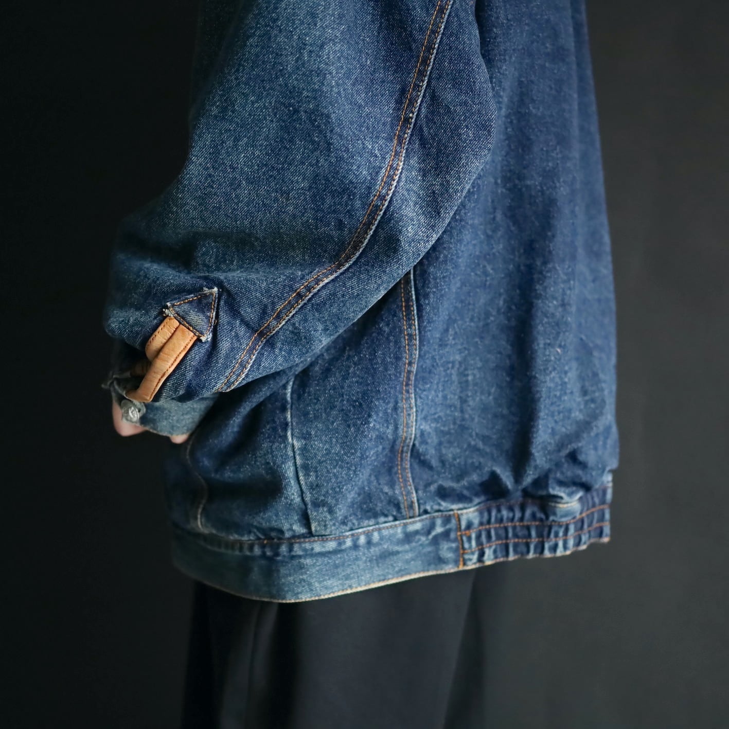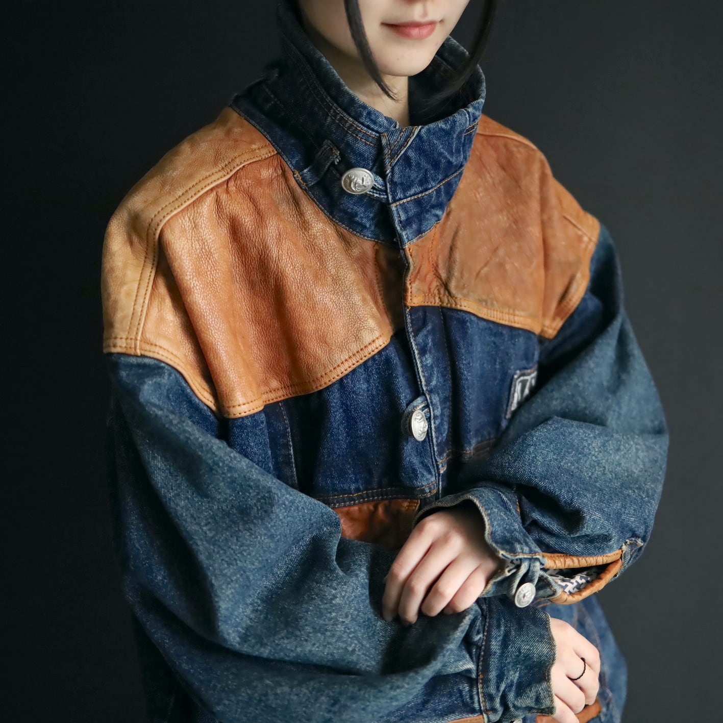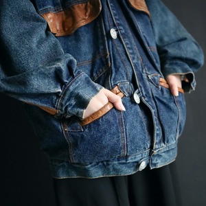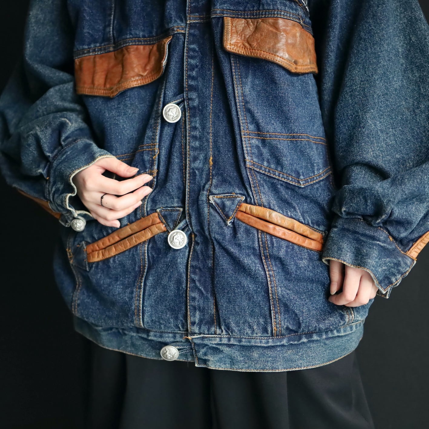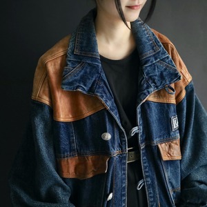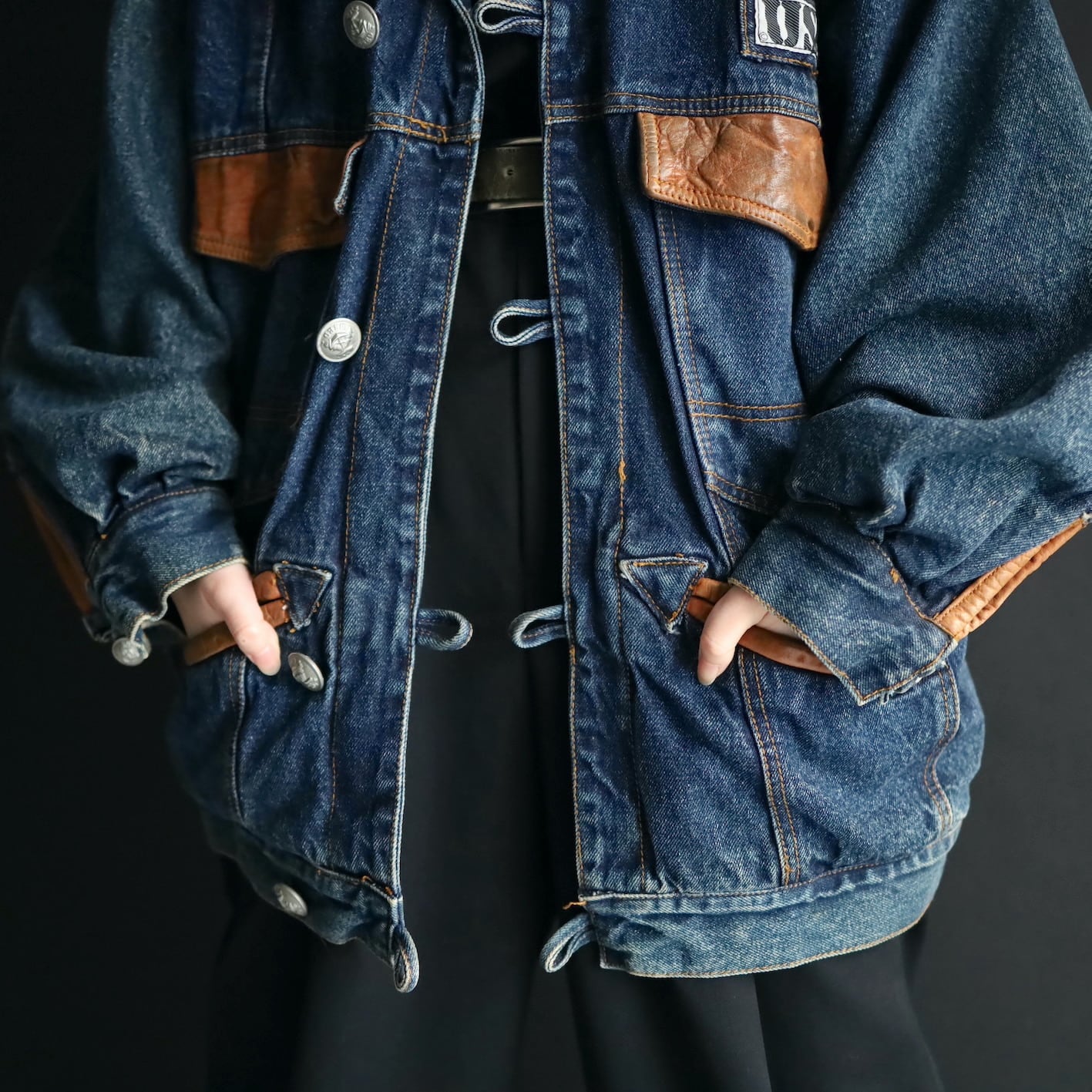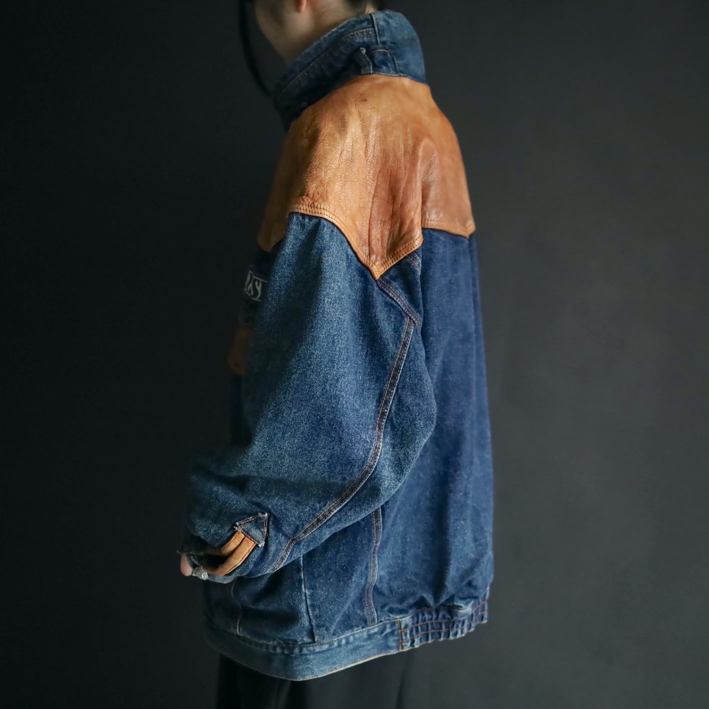 ほどよく色落ちしたブルーデニムと,褪せた色味のキャメルレザーの相性が際立つ一枚です.