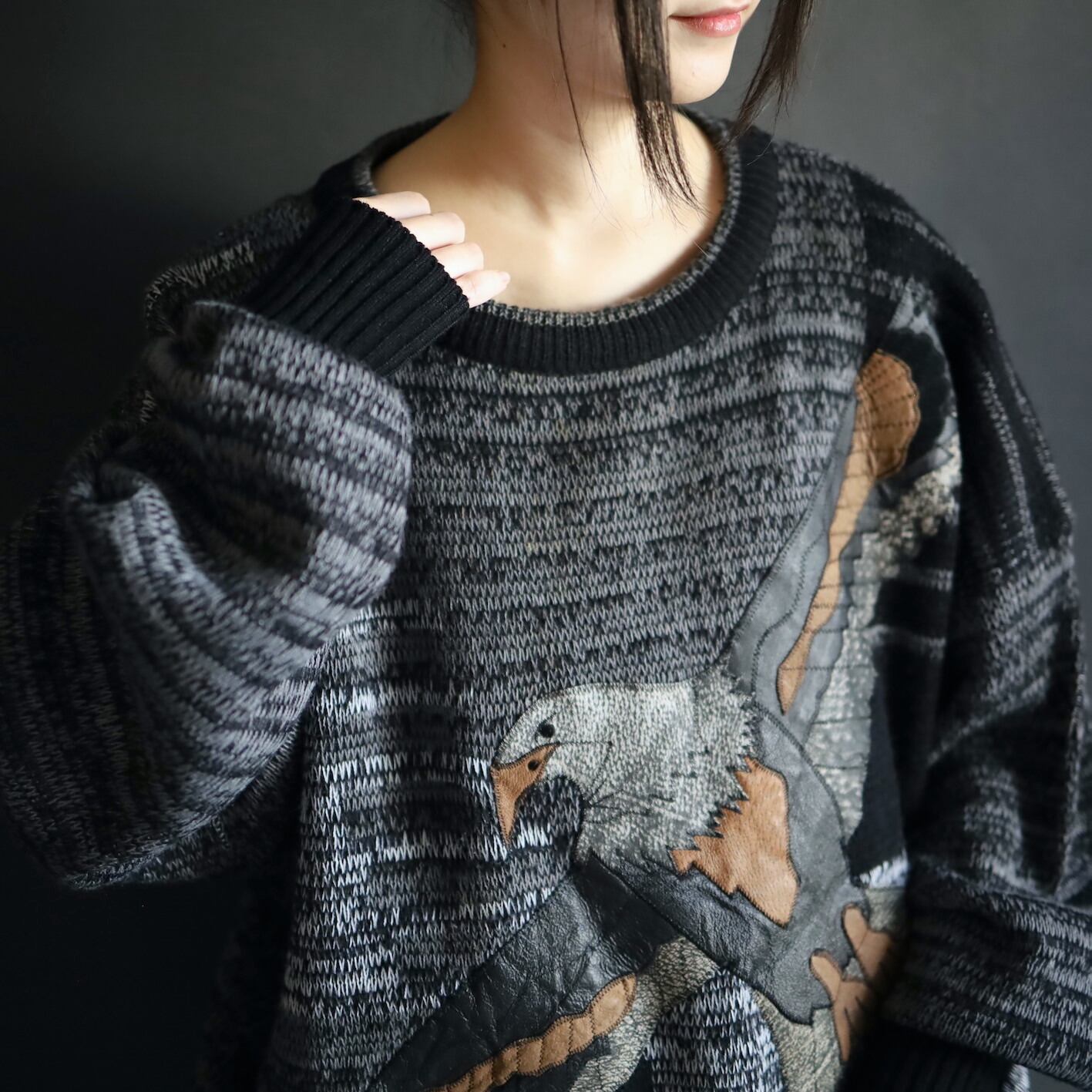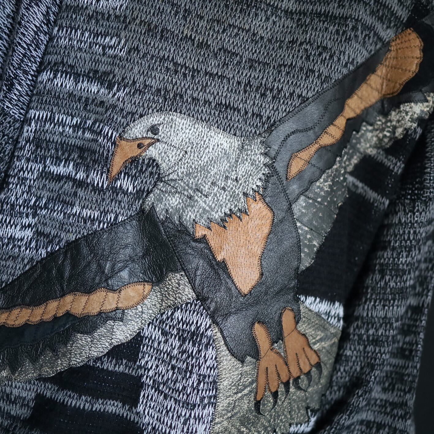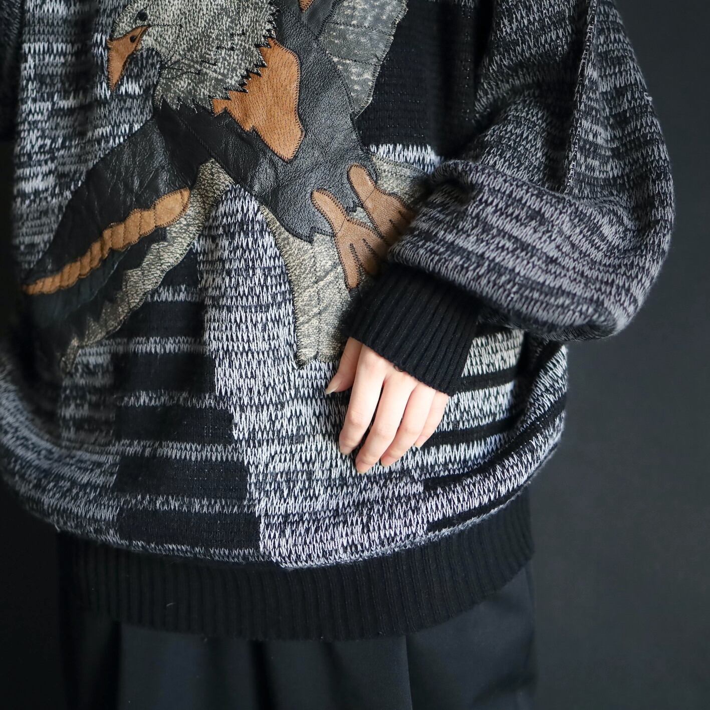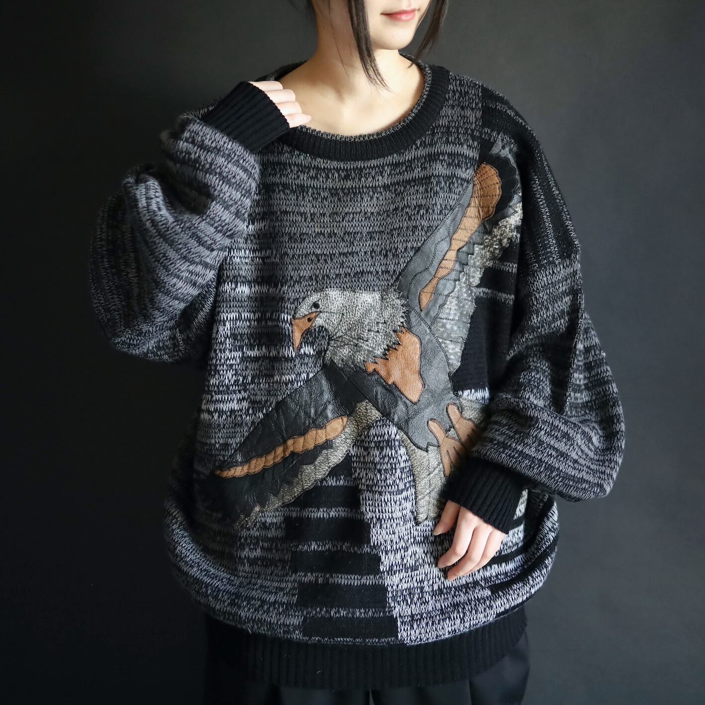 グレー×ブラックのジャガード織切替と,このニットの要,鷹のレザーパッチワークデザイン.