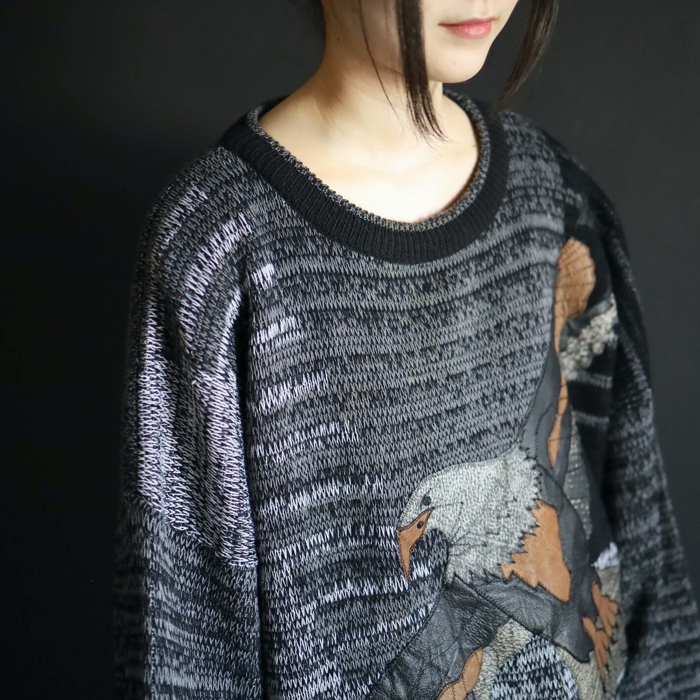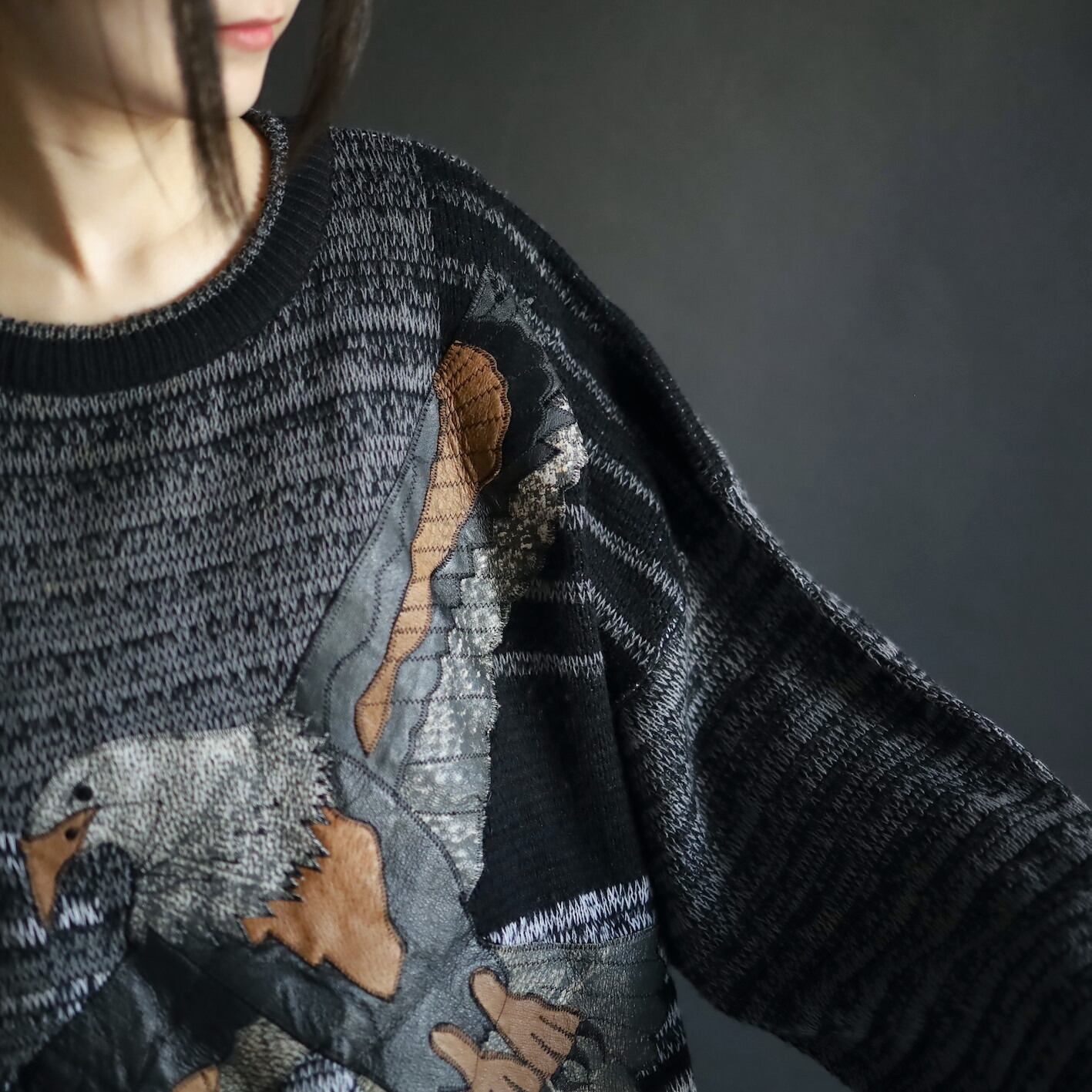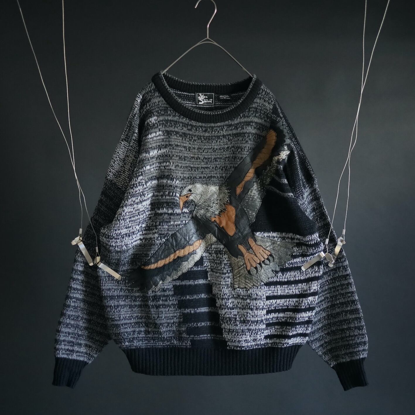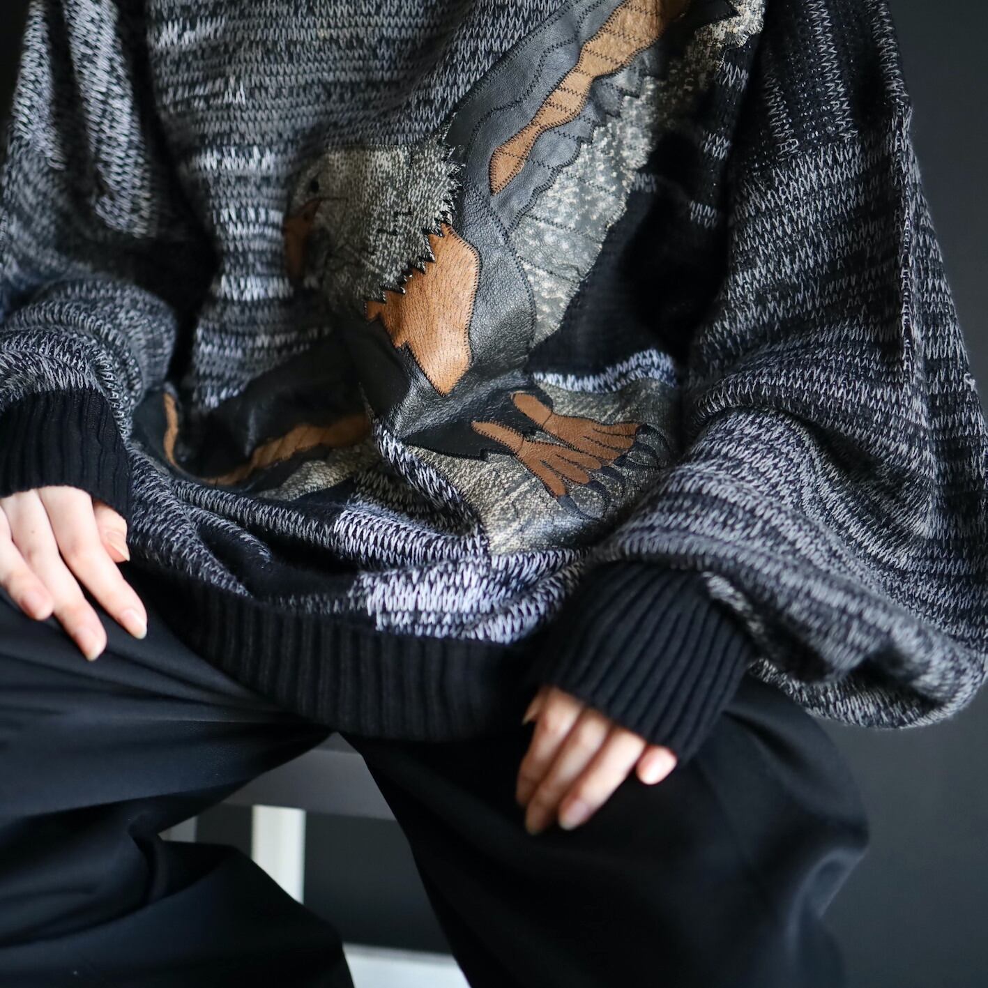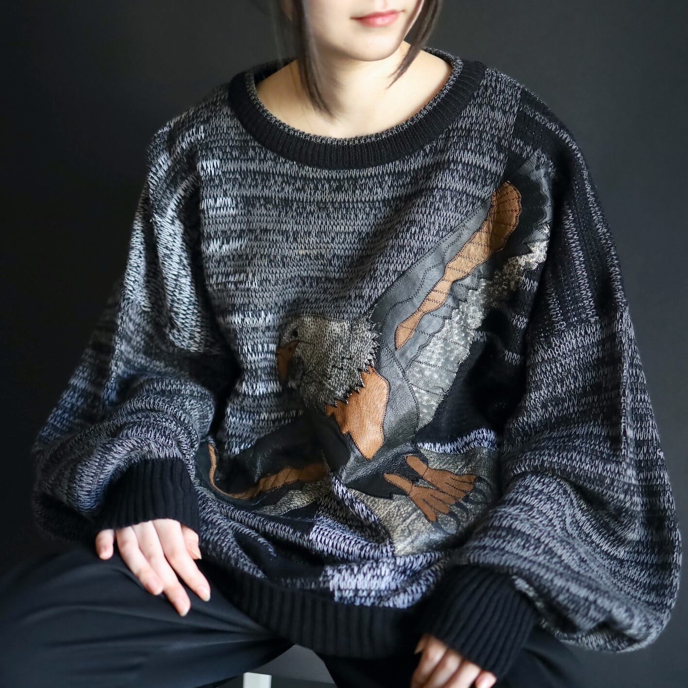 グレー×ブラックのジャガード織切替と,このニットの要,鷹のレザーパッチワークデザイン.