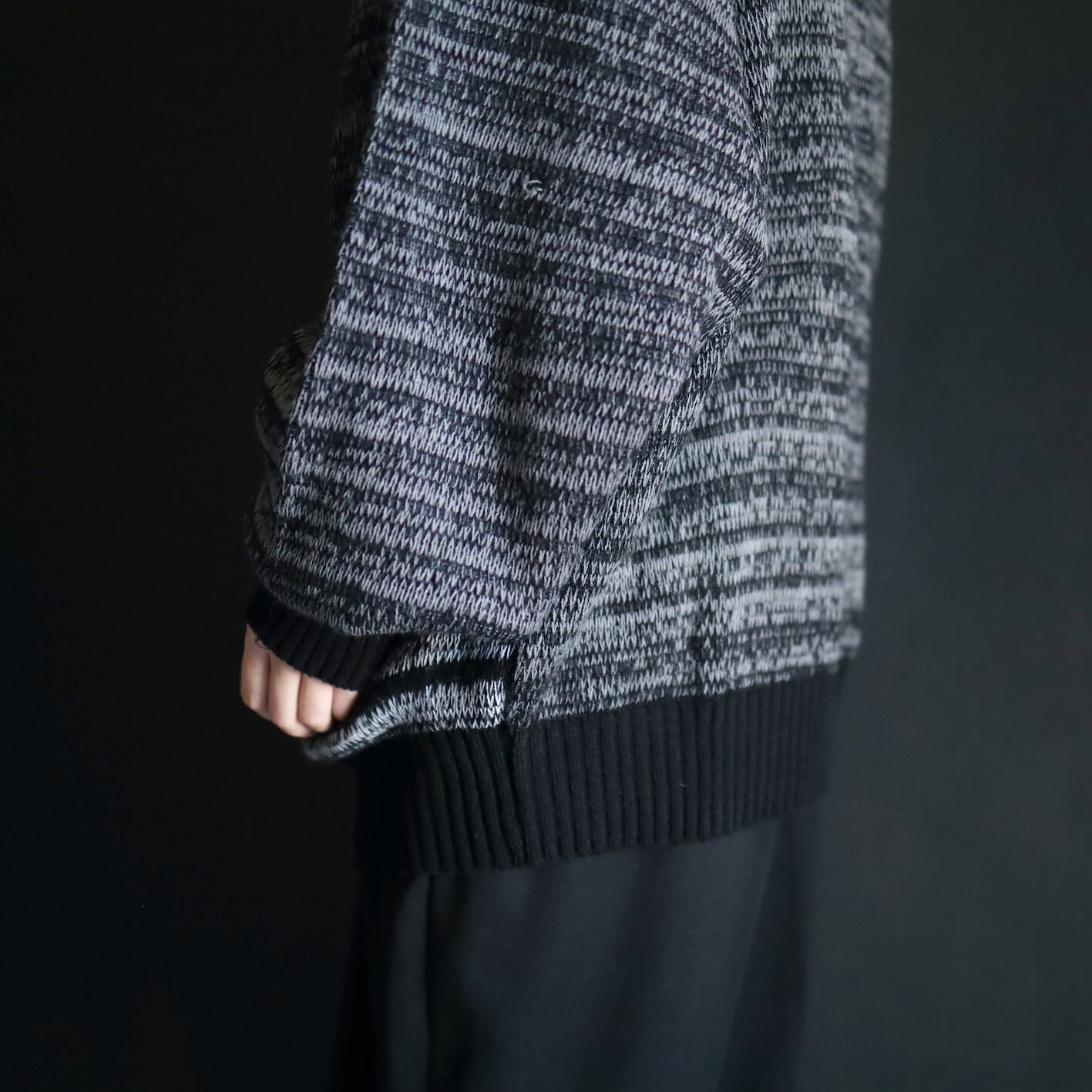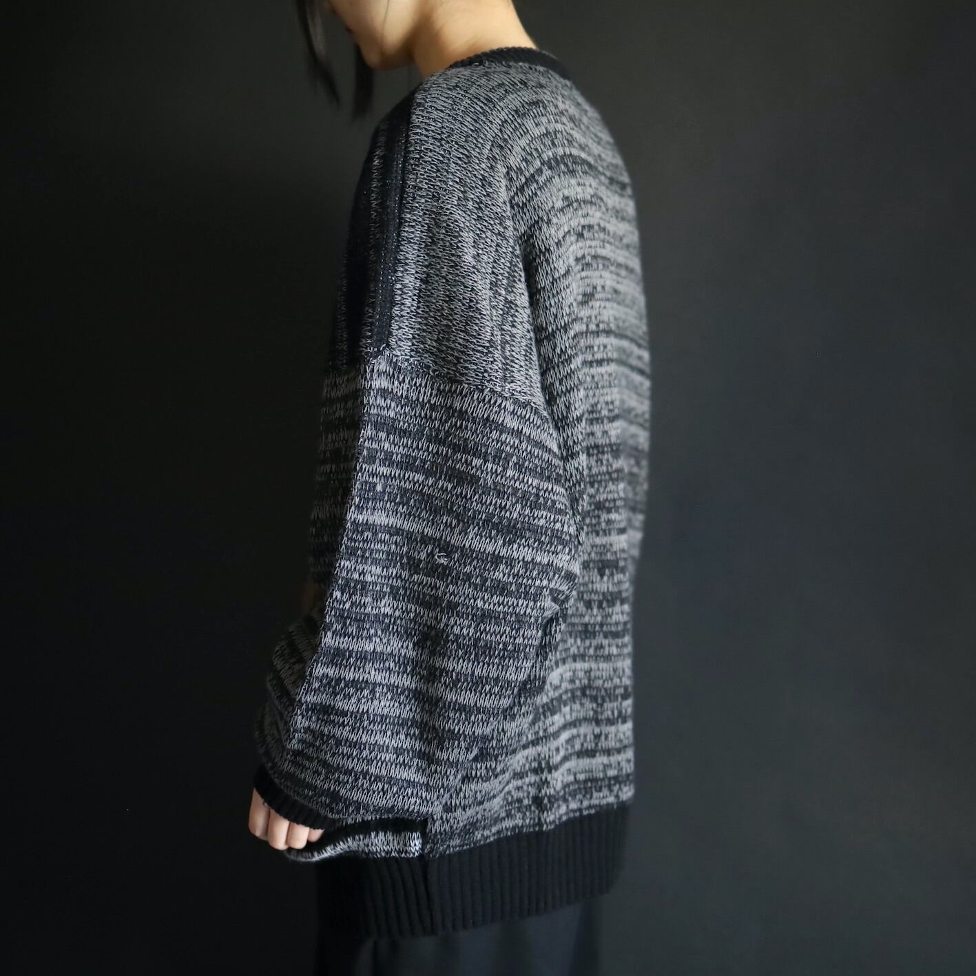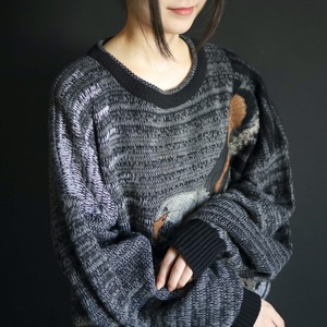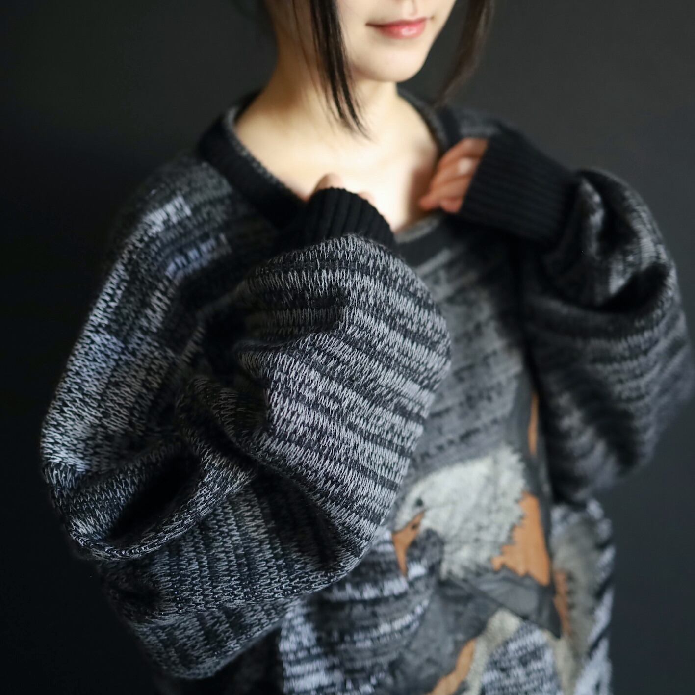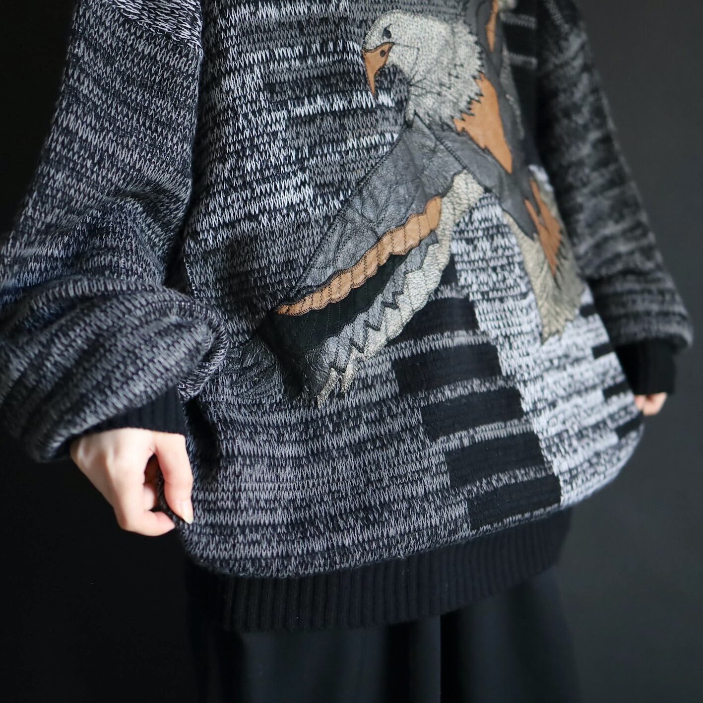 グレー×ブラックのジャガード織切替と,このニットの要,鷹のレザーパッチワークデザイン.
