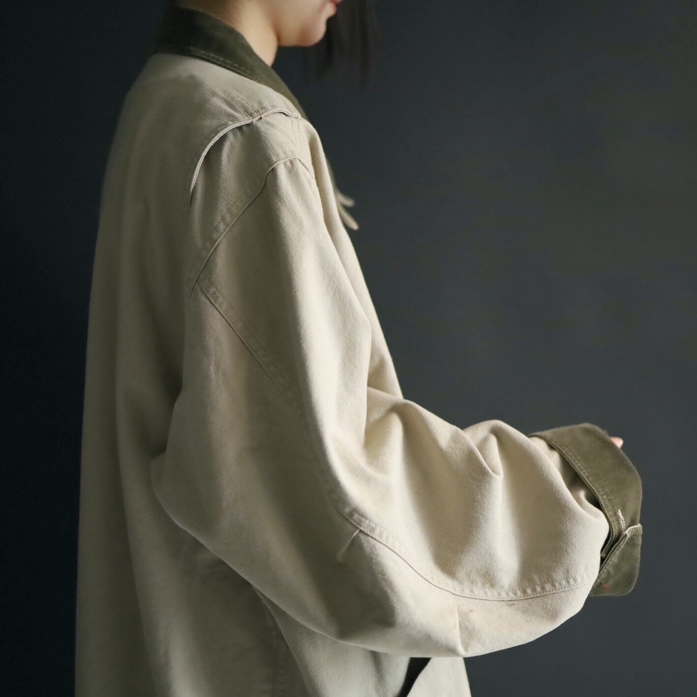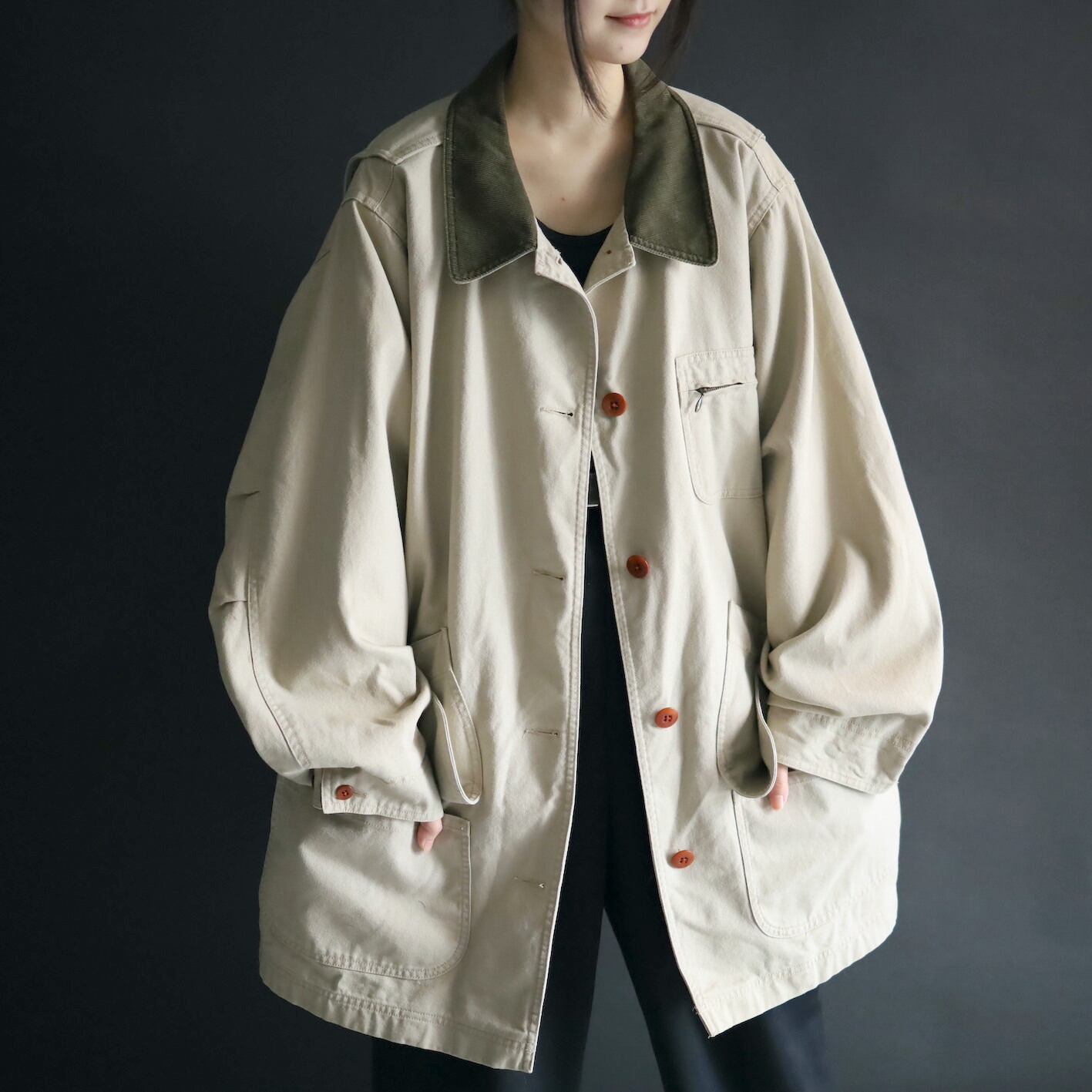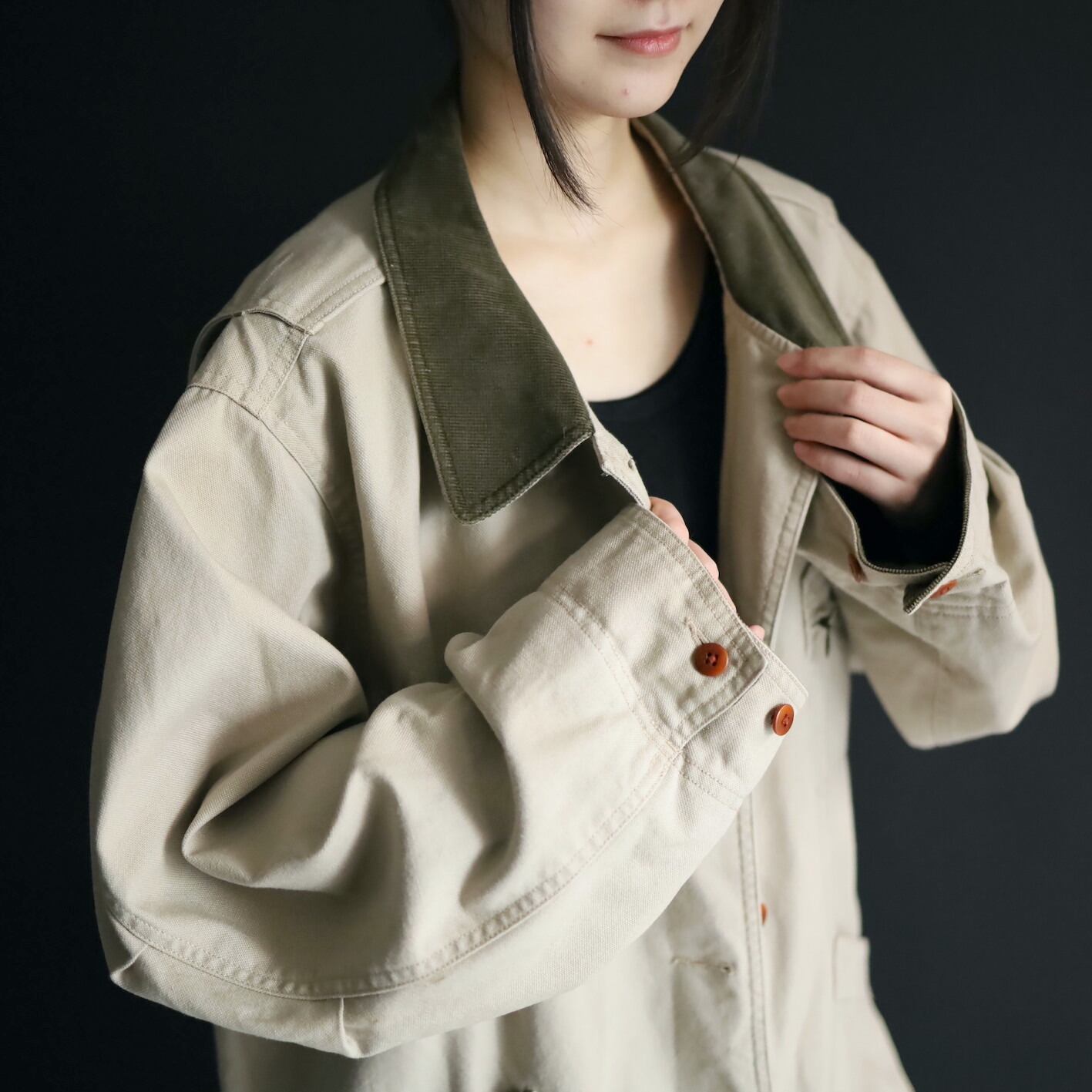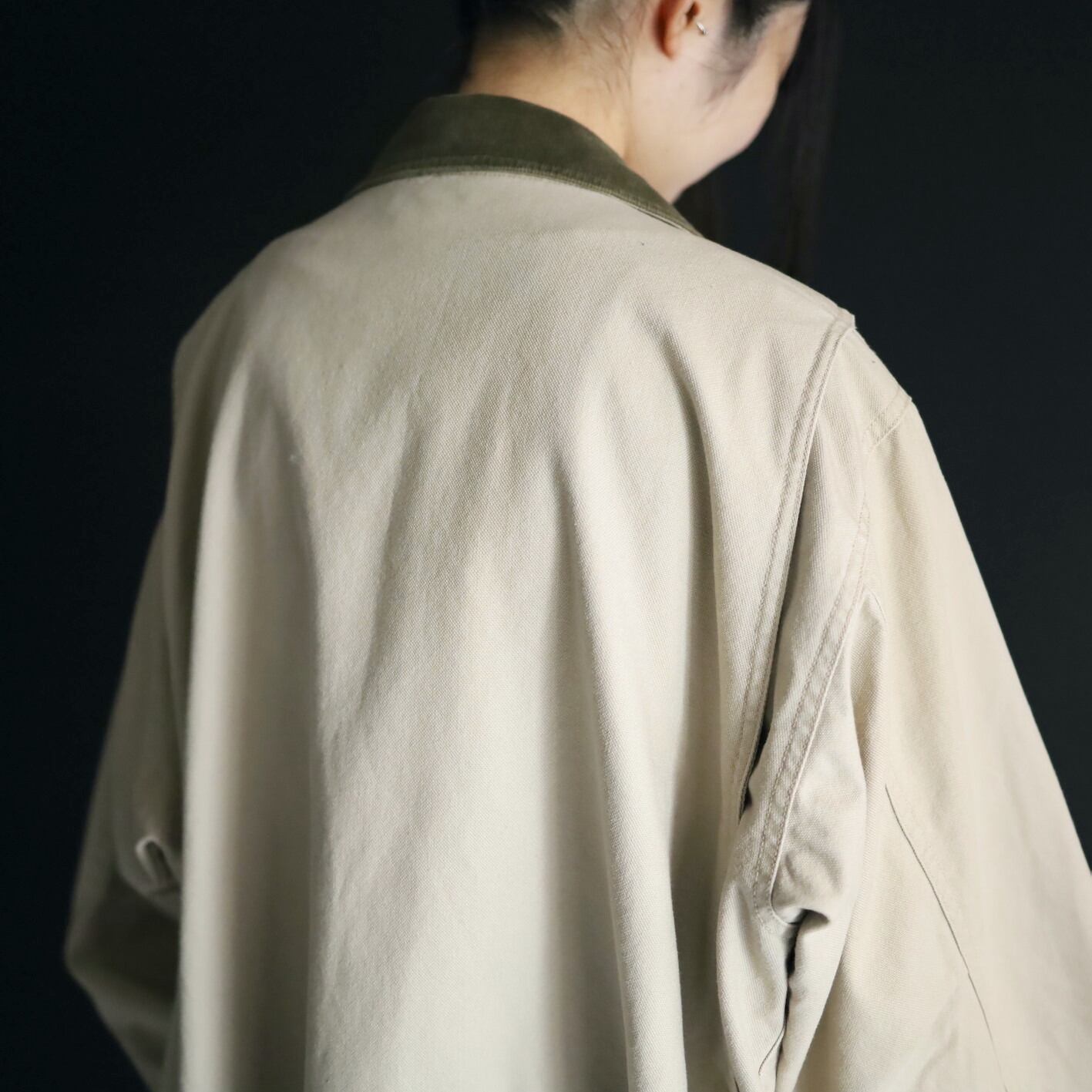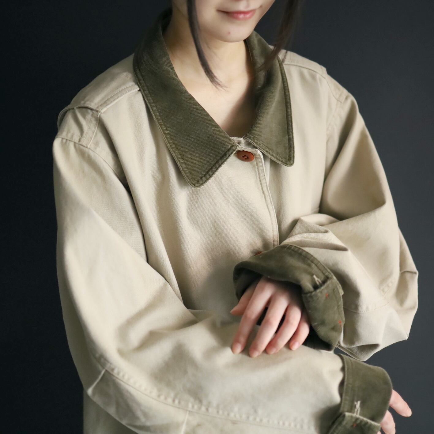 襟がカーキのコーデュロイ切替で,ワンポイント渋さの混ざった大人のアウター.
