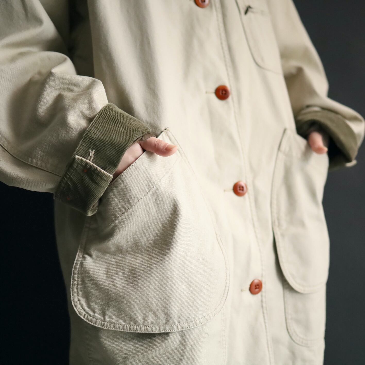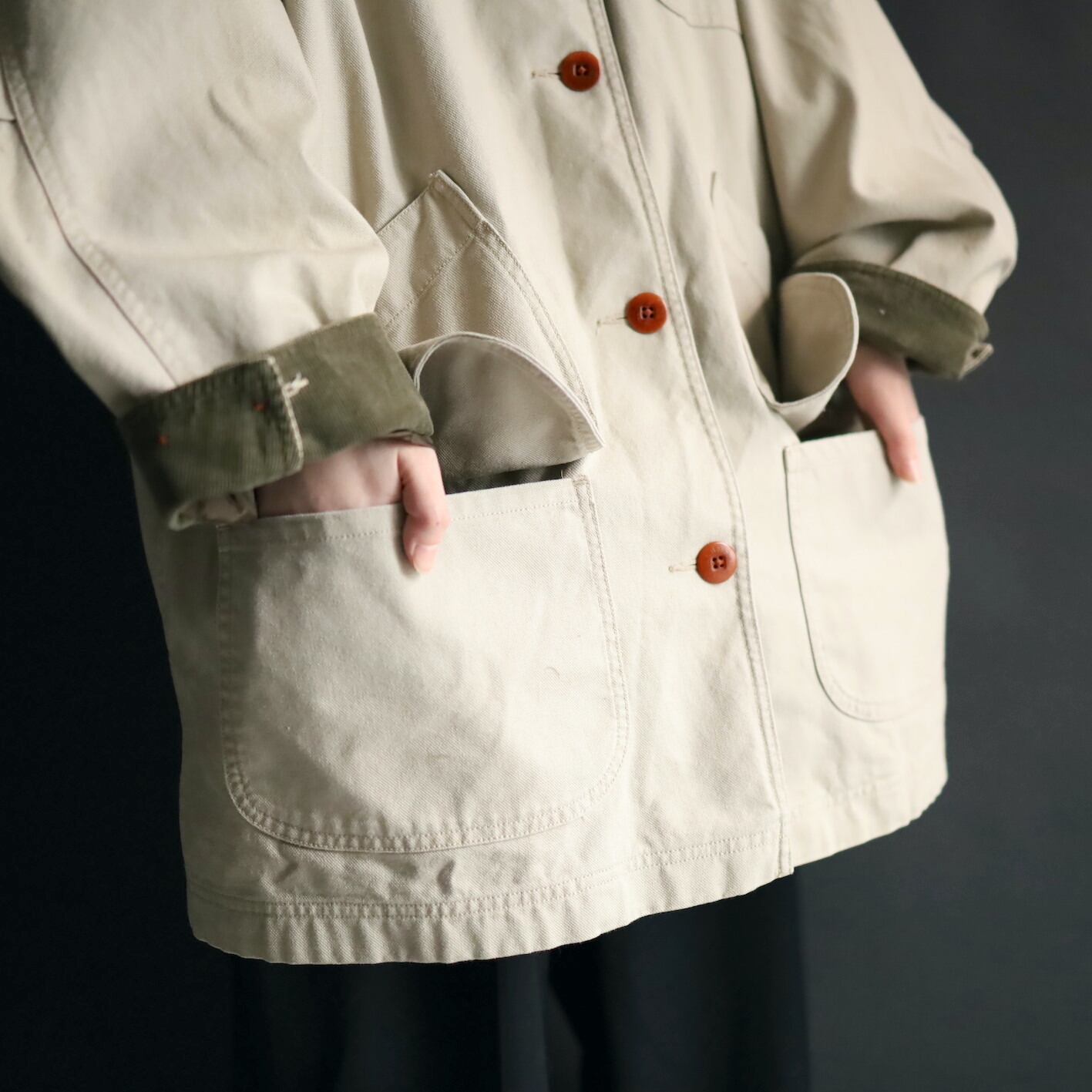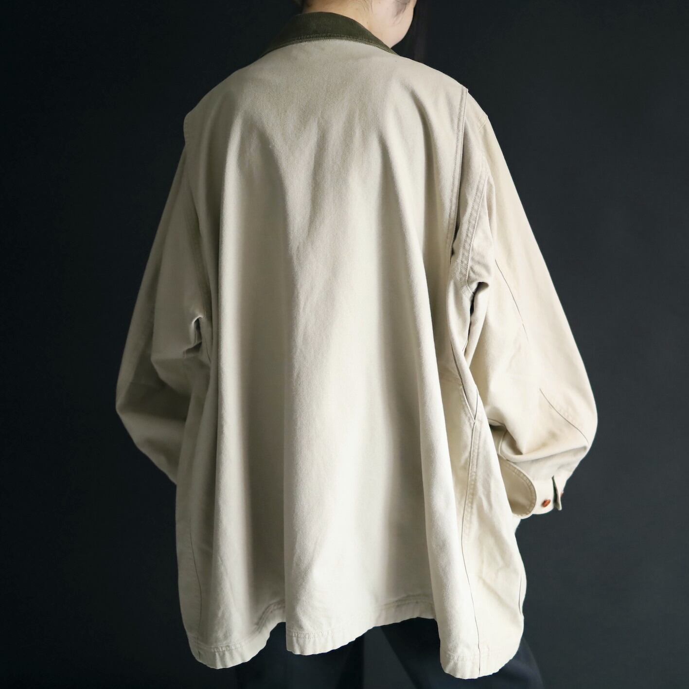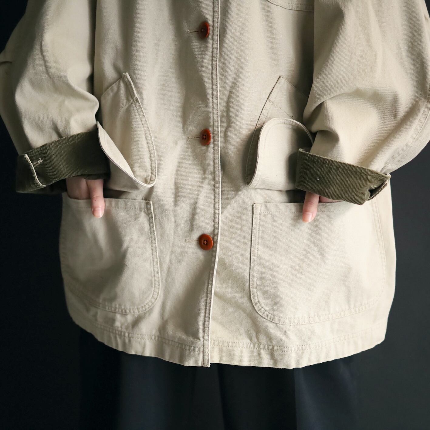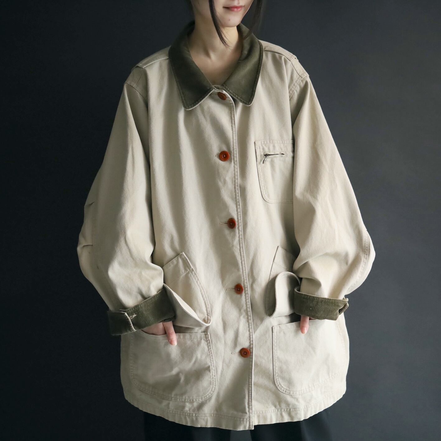 襟がカーキのコーデュロイ切替で,ワンポイント渋さの混ざった大人のアウター.
