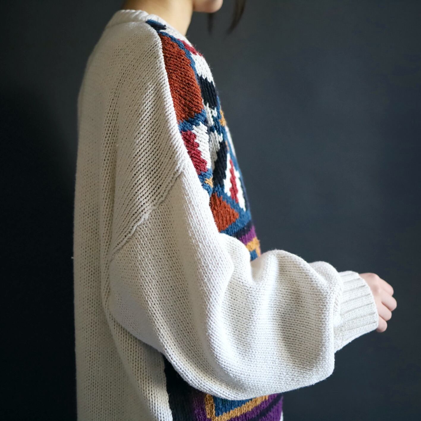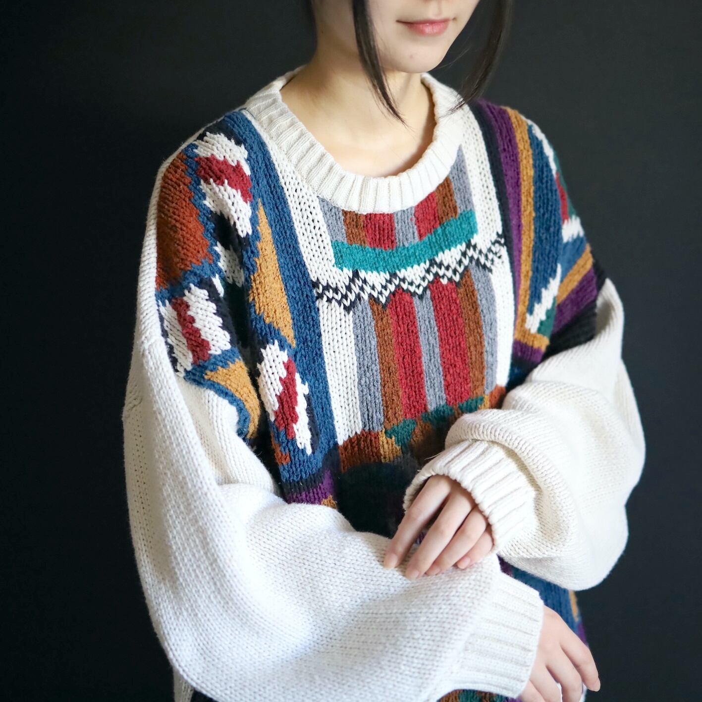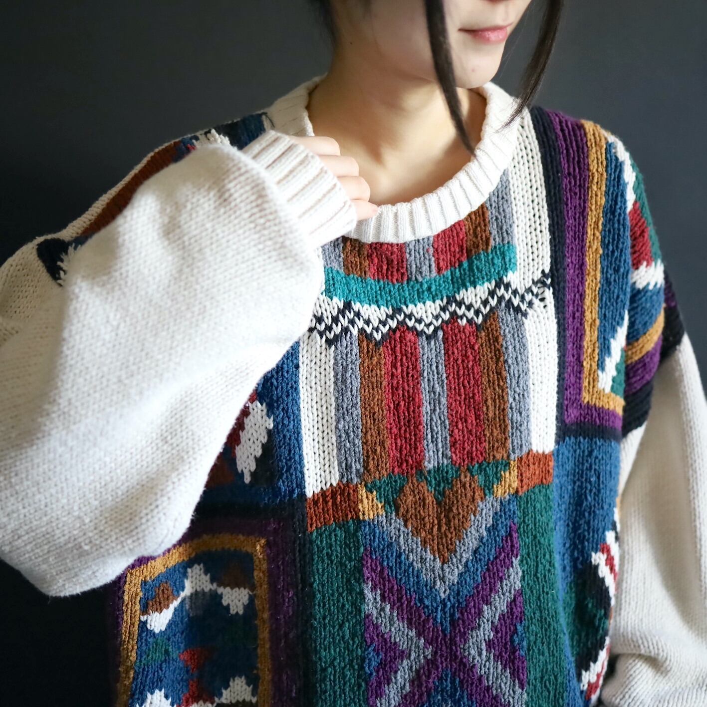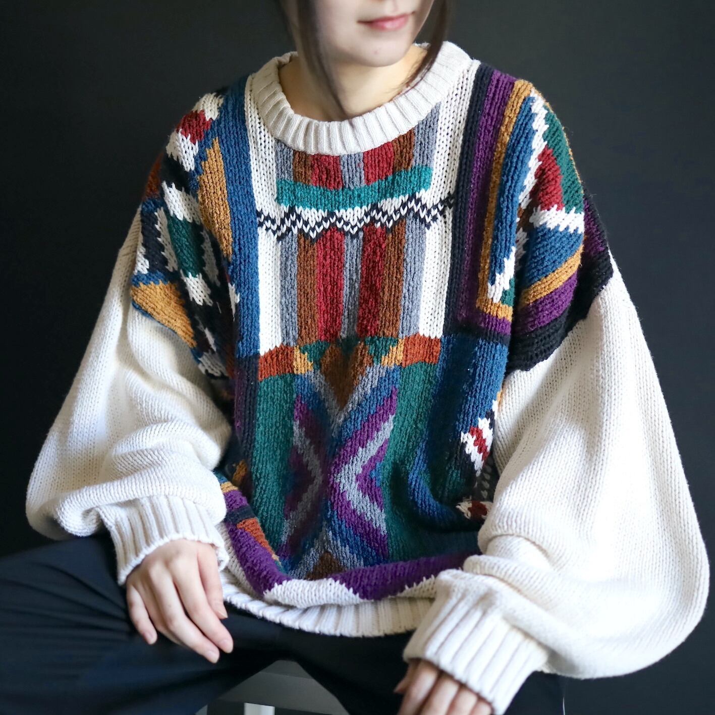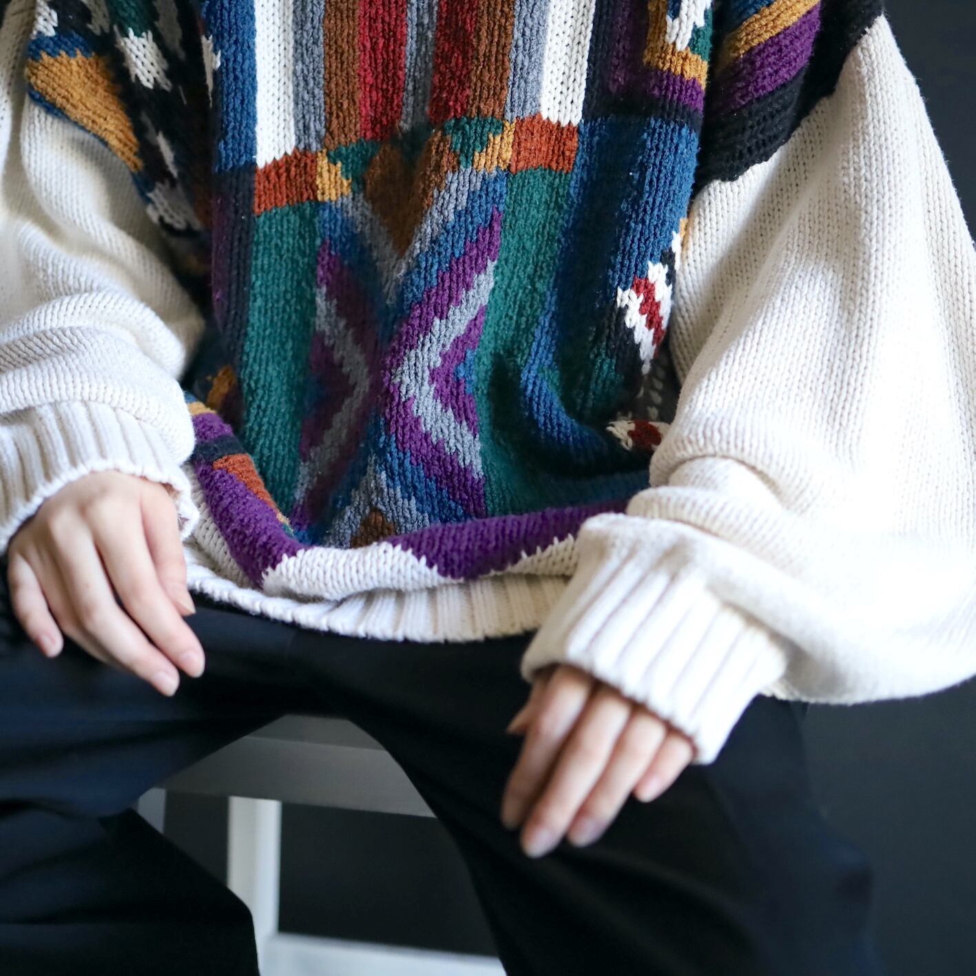 アイボリーホワイトの雰囲気ある色味をベースに,カラフルな配色のアート柄を入れたジャガード織ニット.