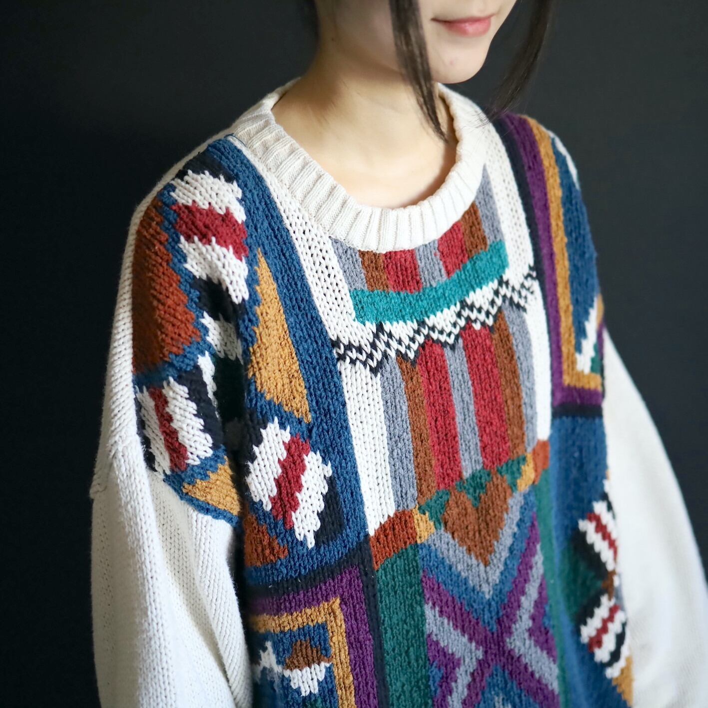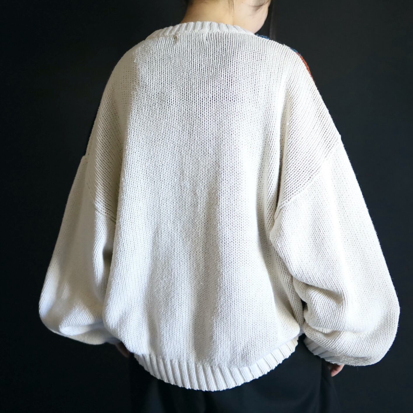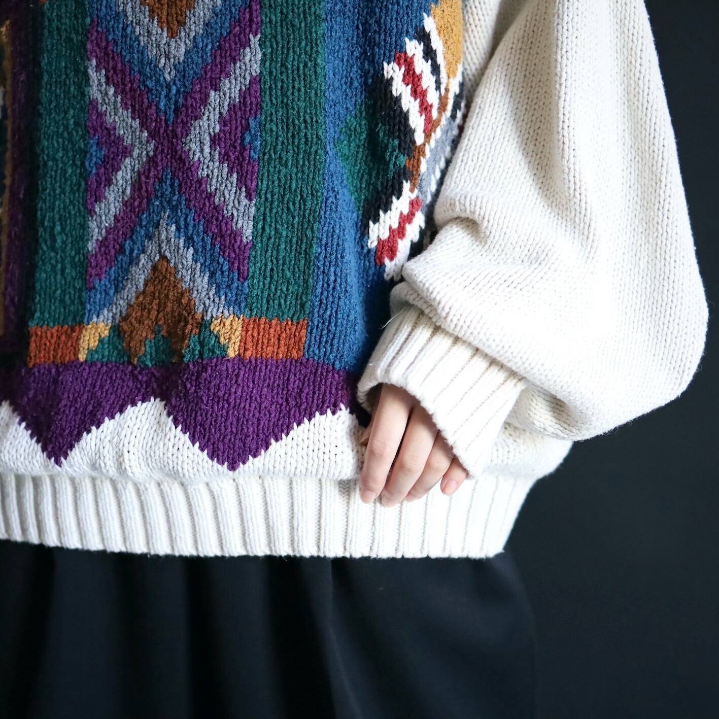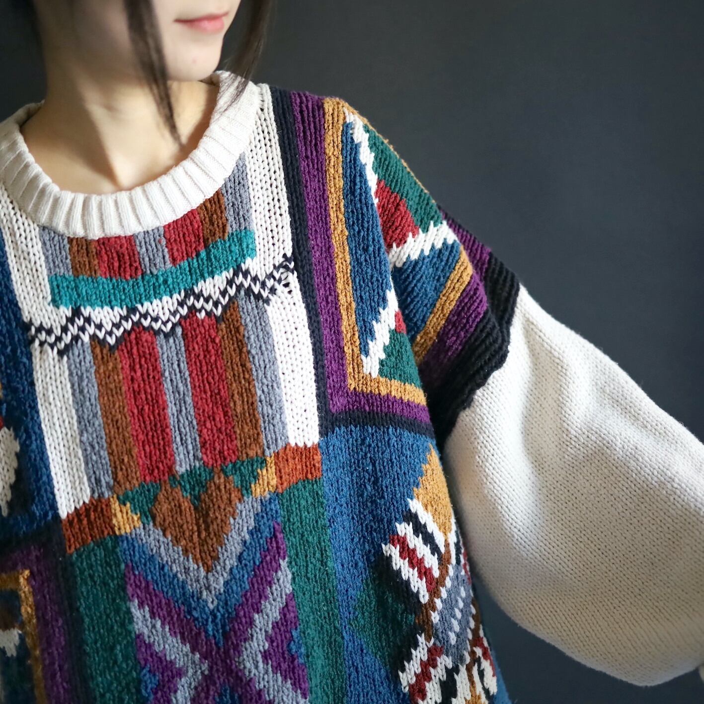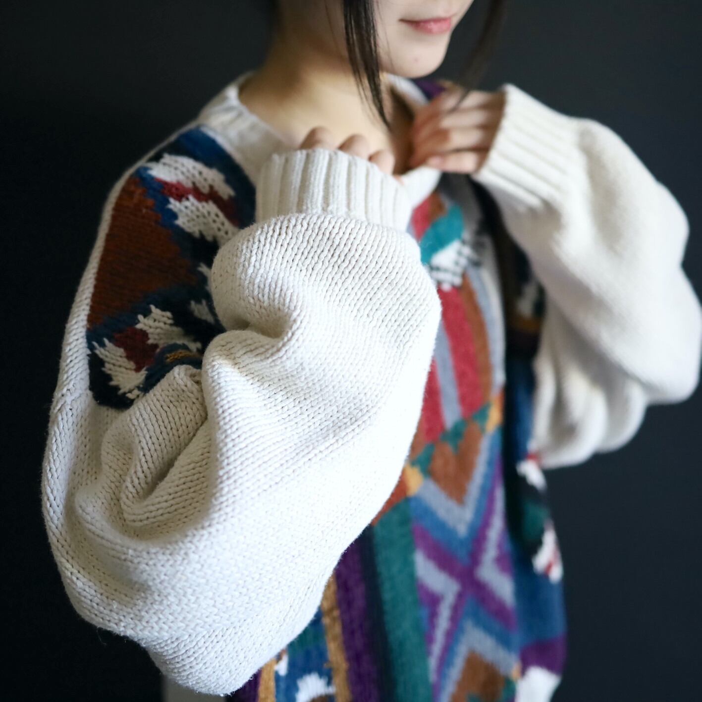 アイボリーホワイトの雰囲気ある色味をベースに,カラフルな配色のアート柄を入れたジャガード織ニット.