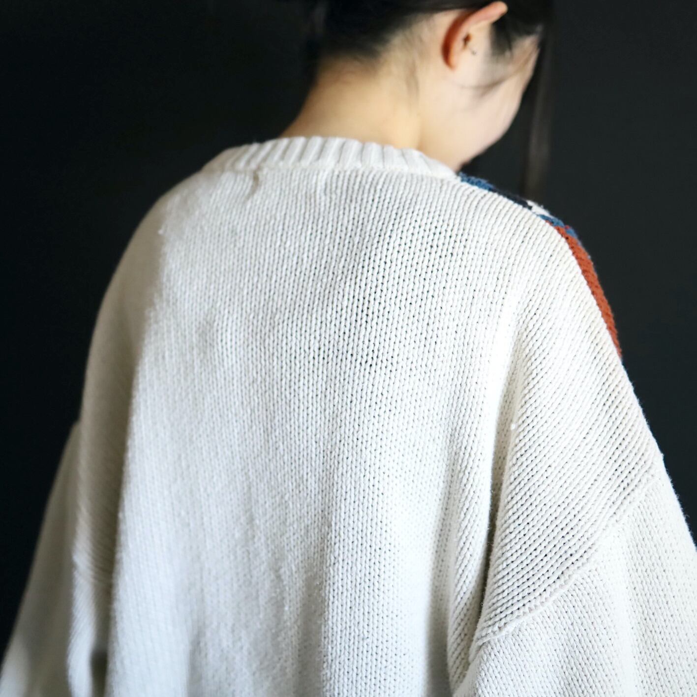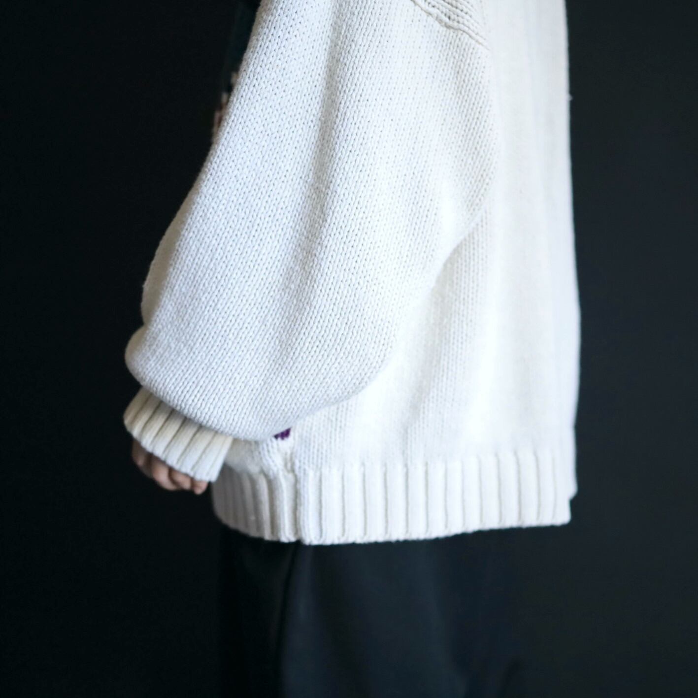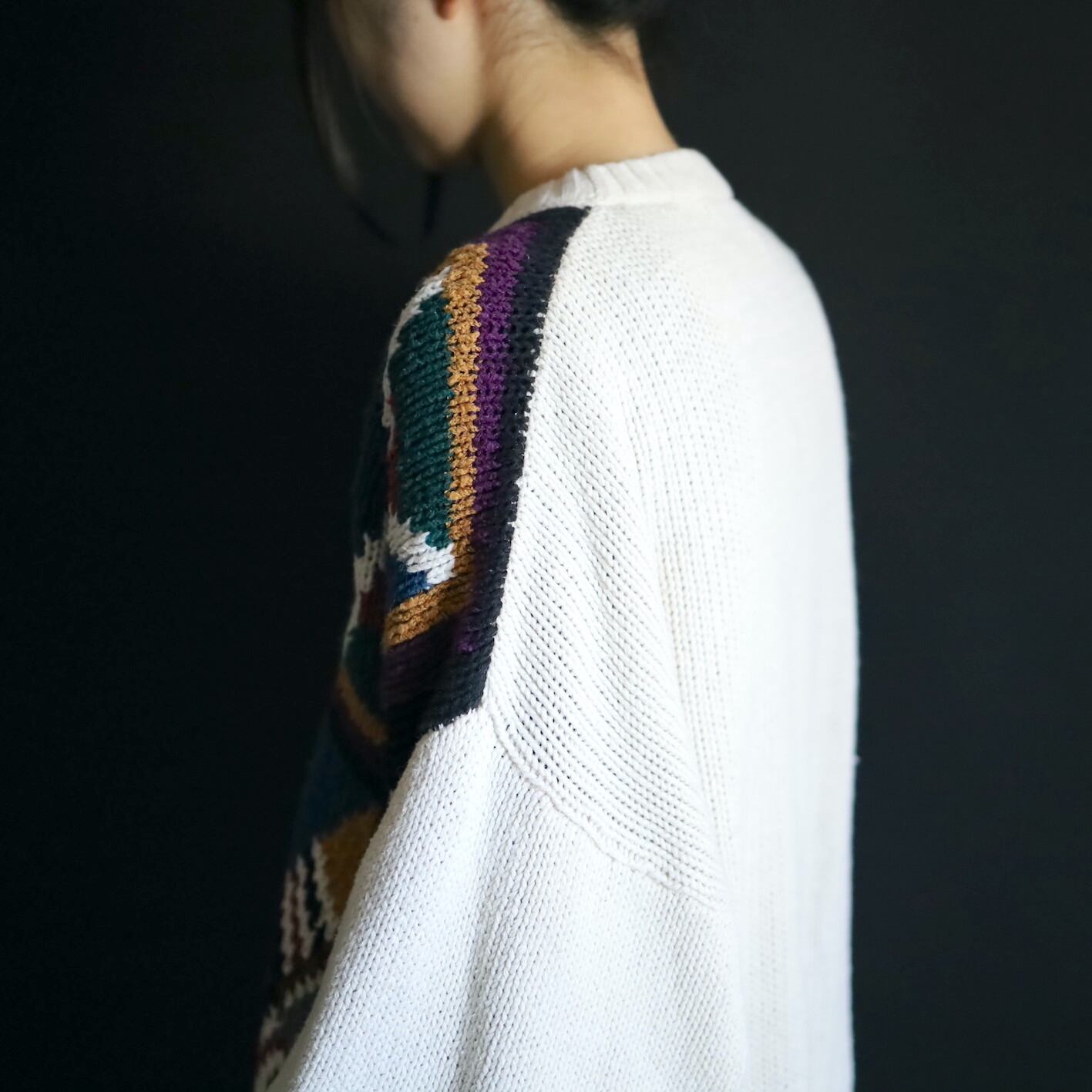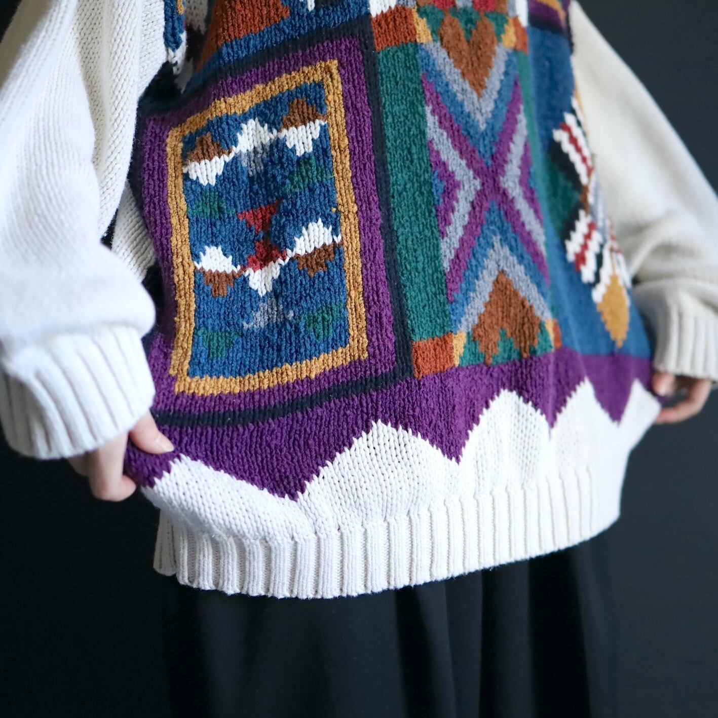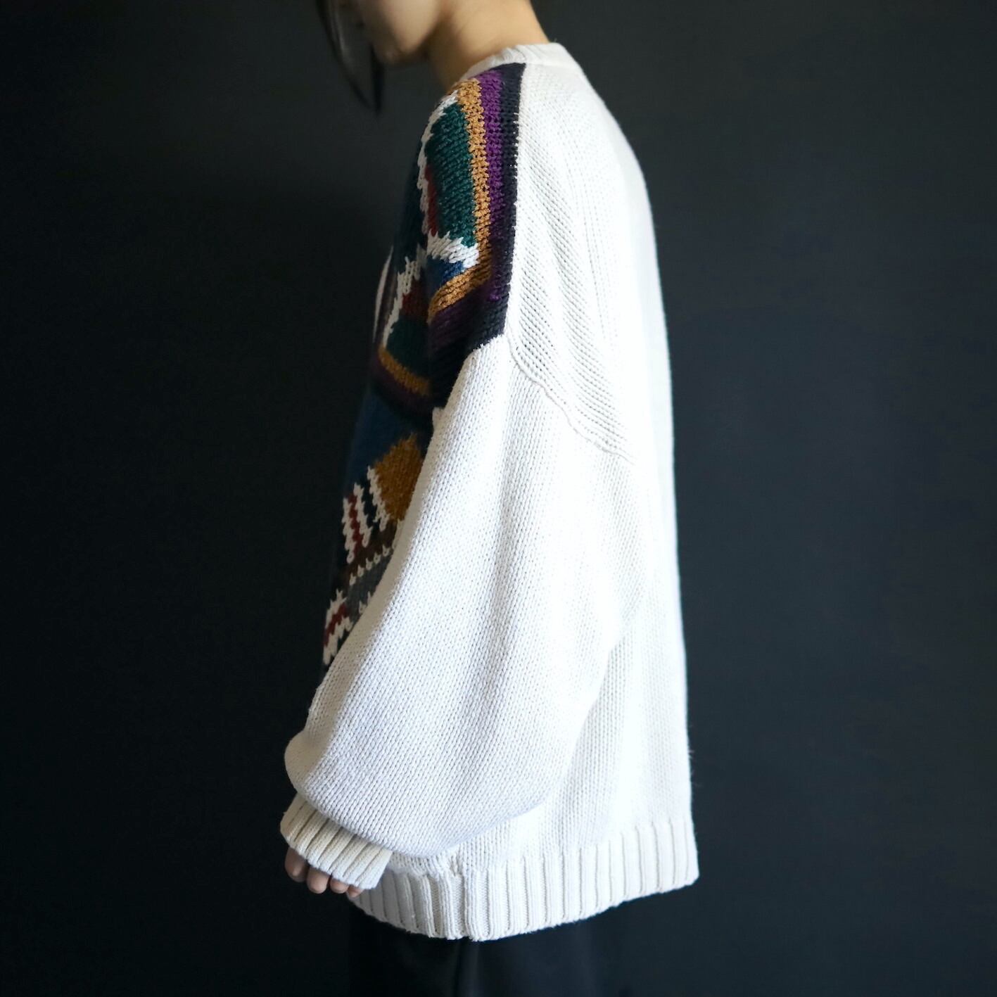 アイボリーホワイトの雰囲気ある色味をベースに,カラフルな配色のアート柄を入れたジャガード織ニット.