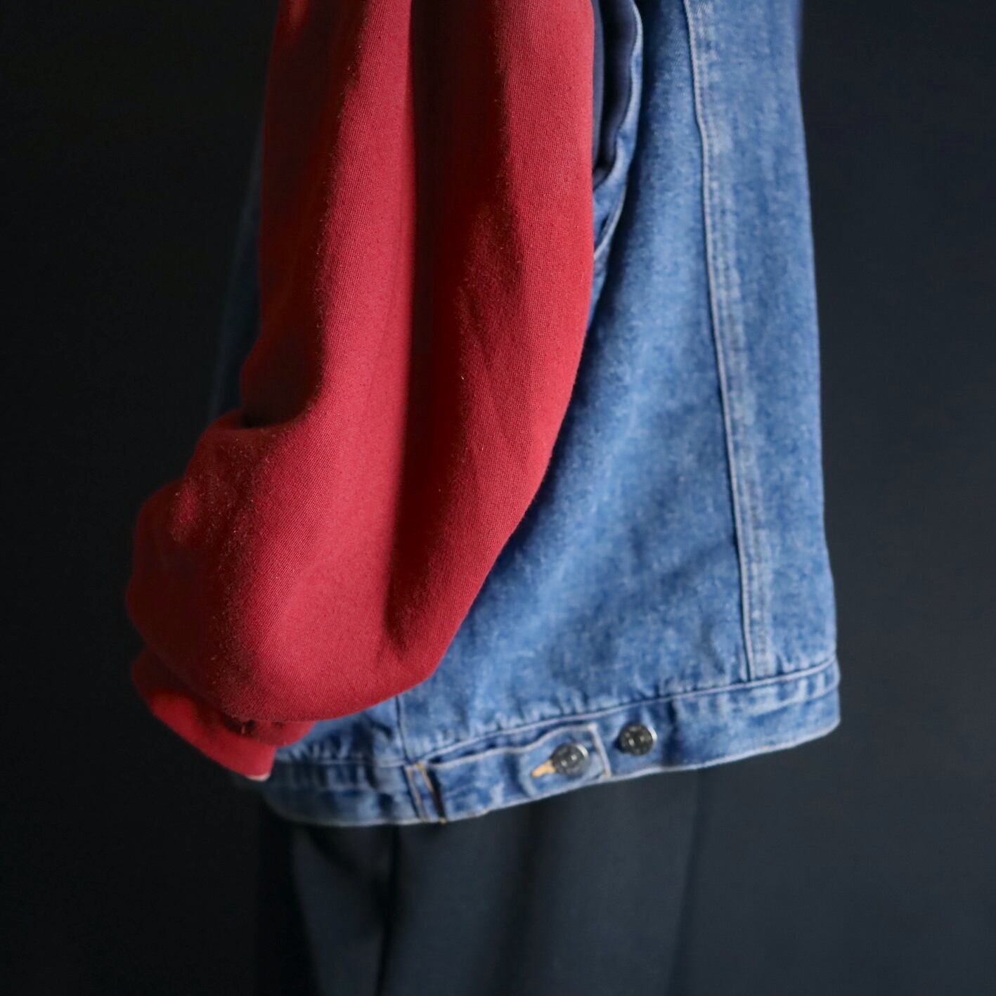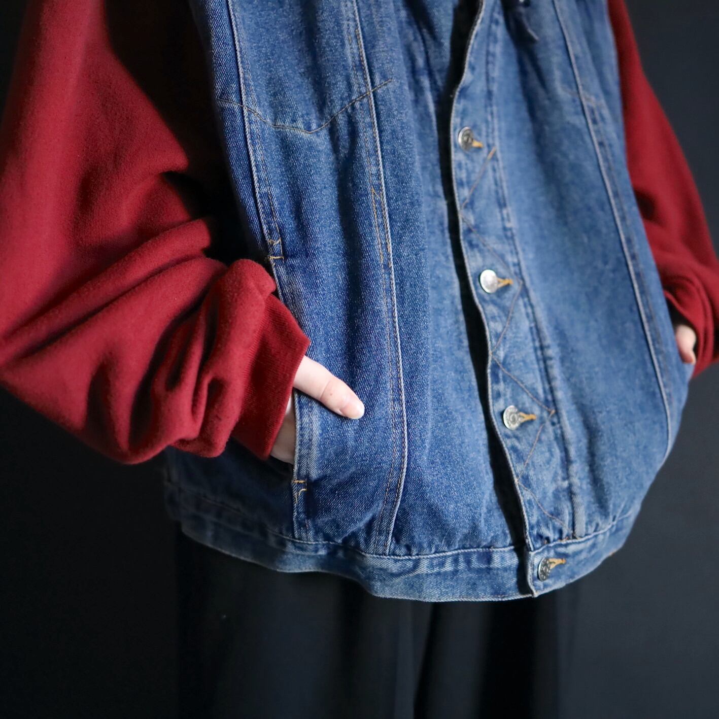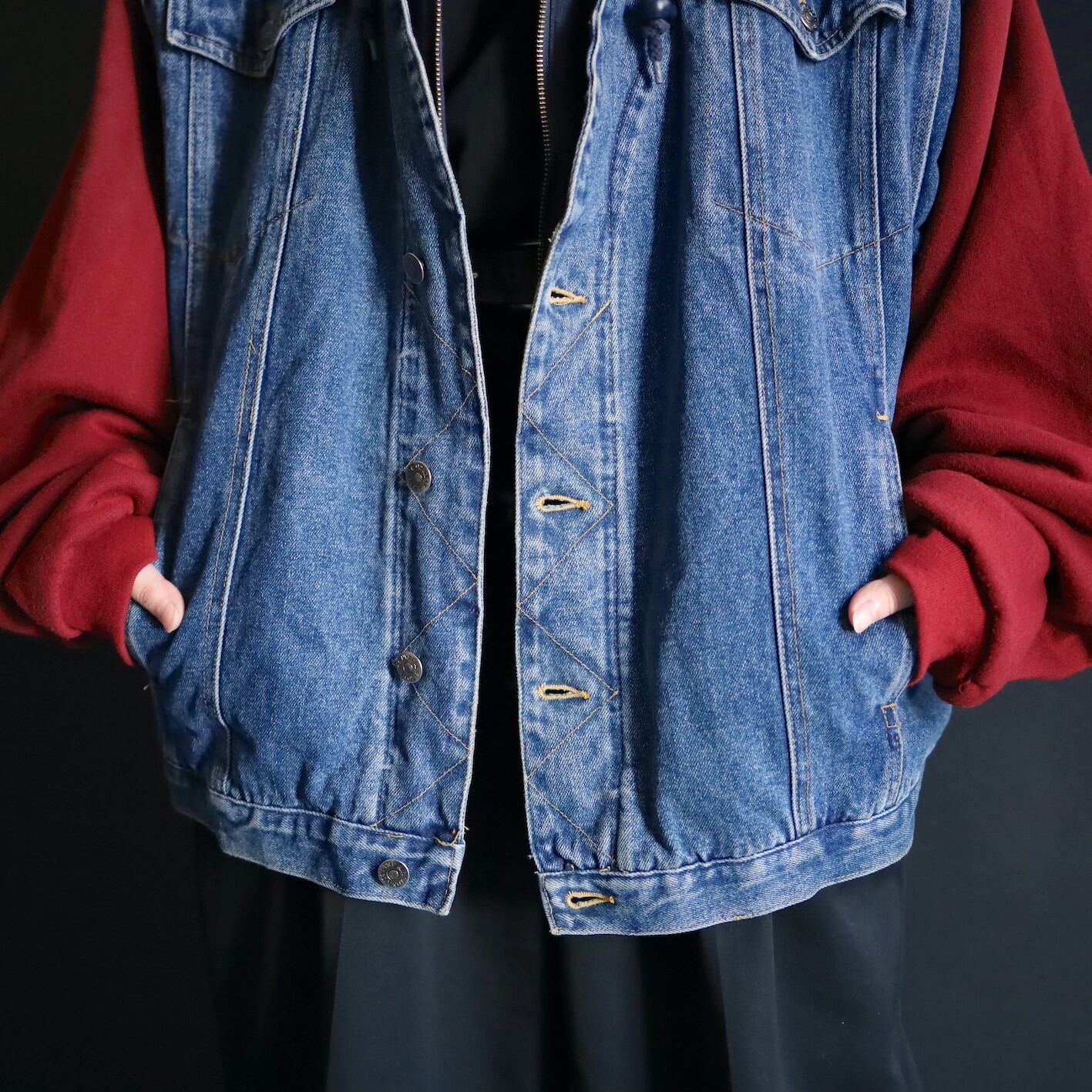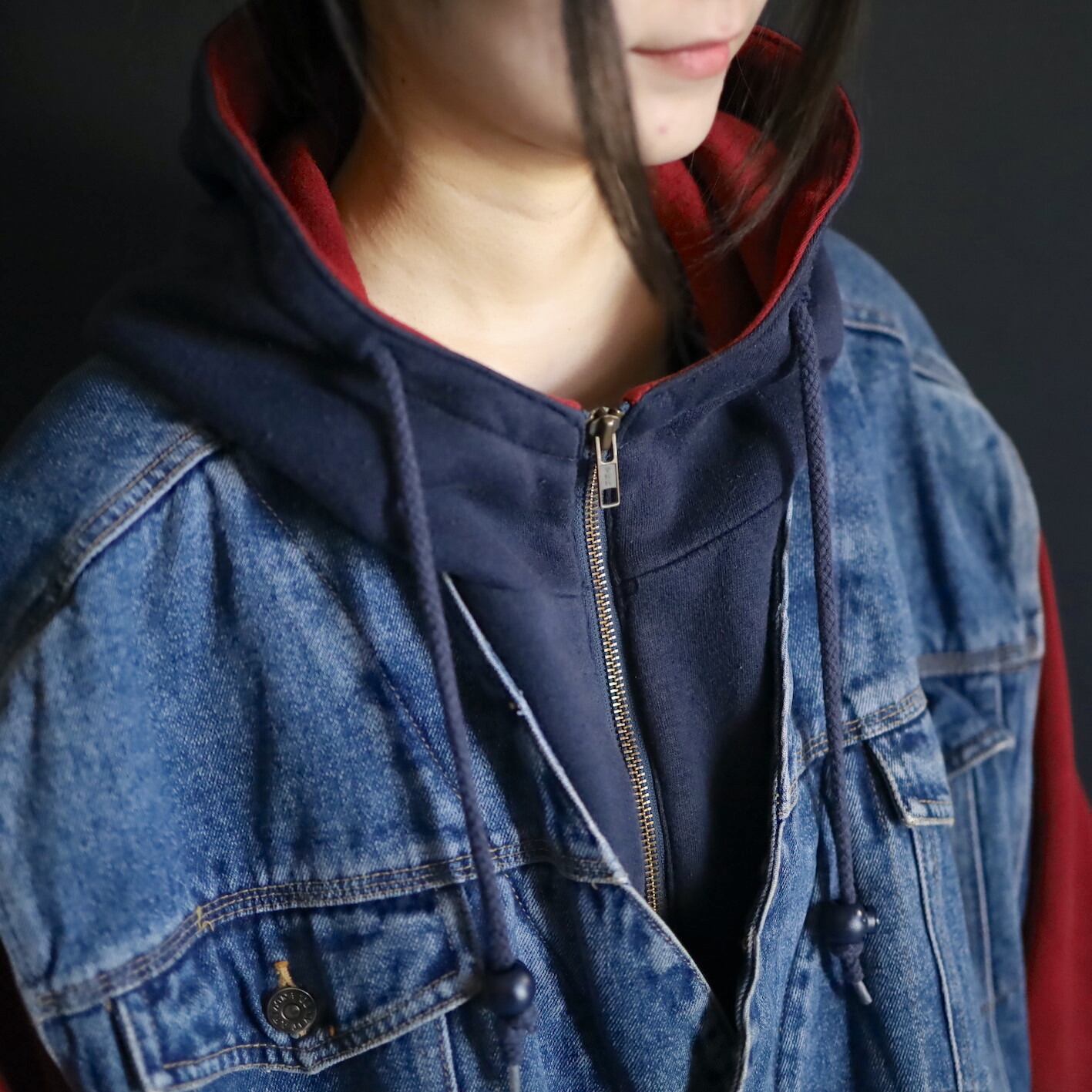 ネイビーとワインレッドのバイカラースウェットと,ほどよく色落ちしたデニムベストのレイヤードスタイル.