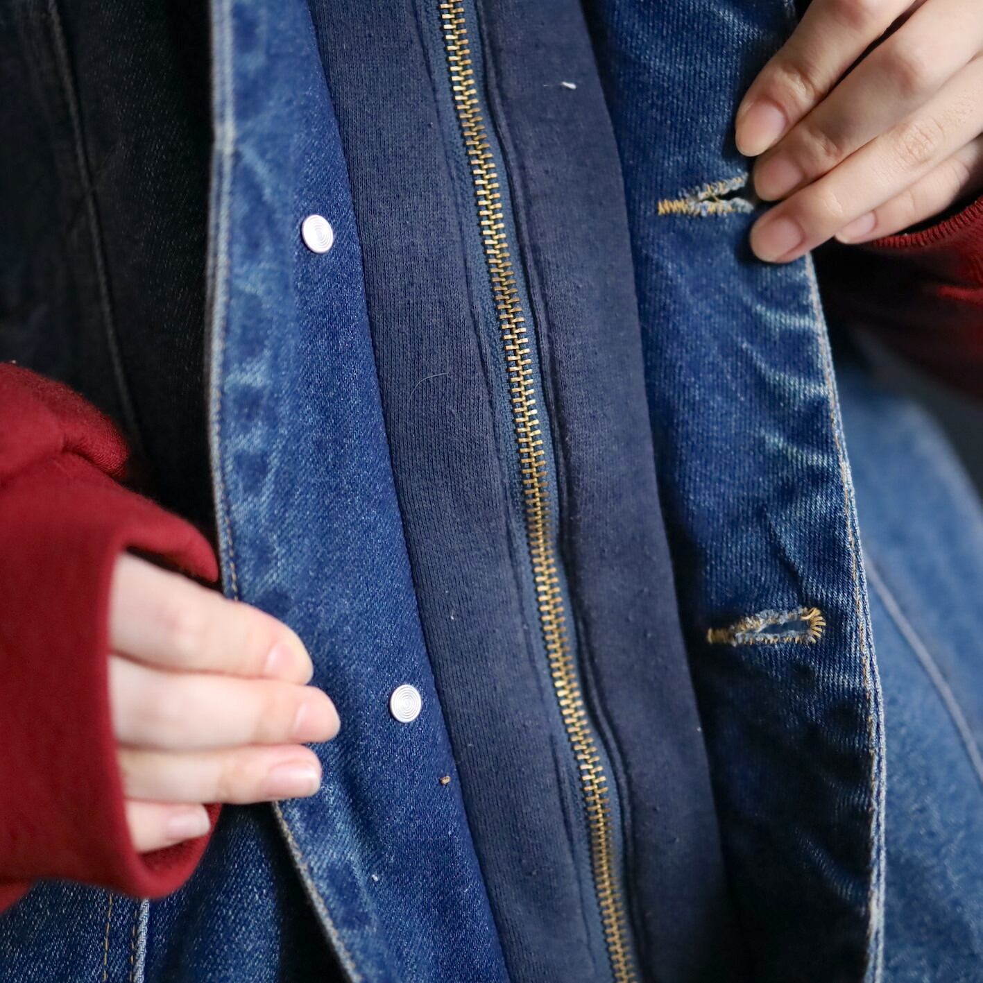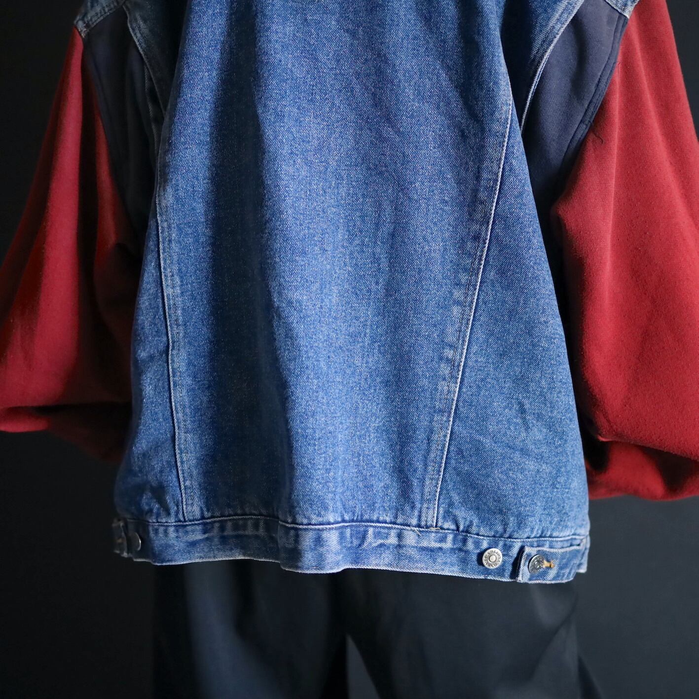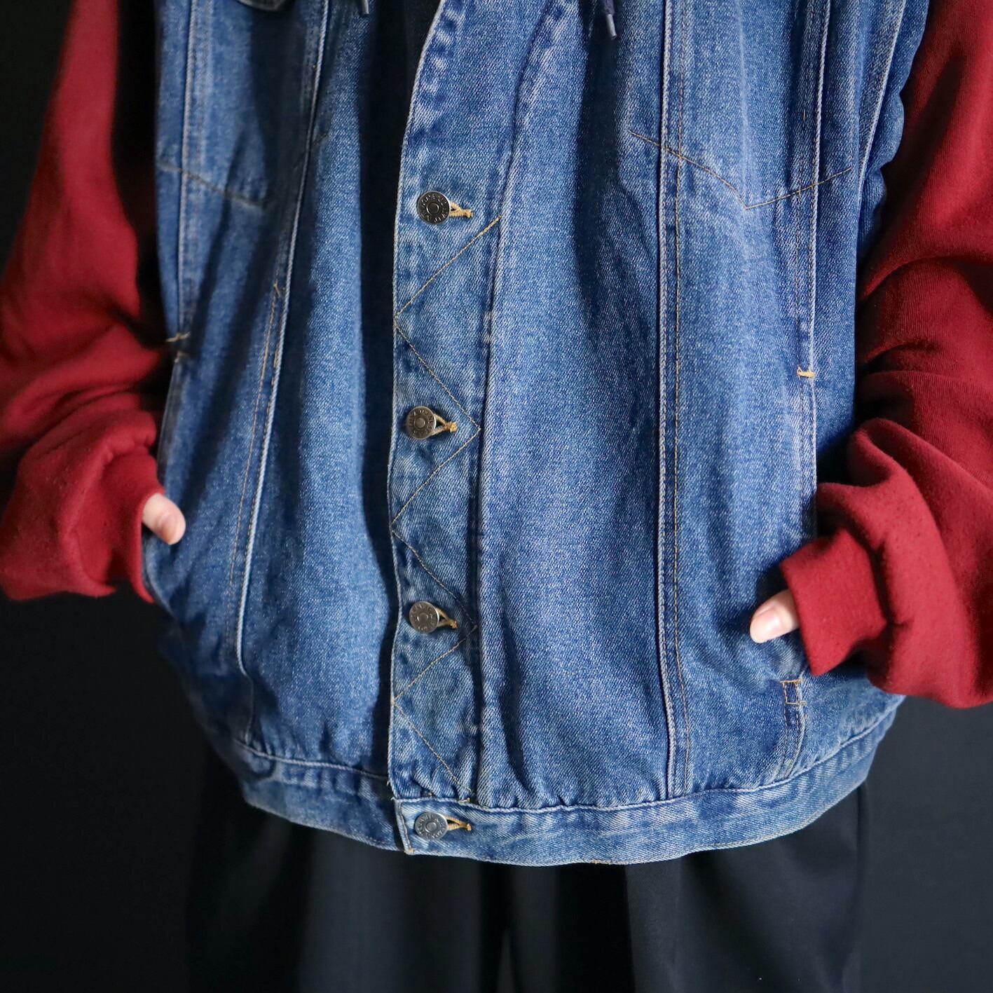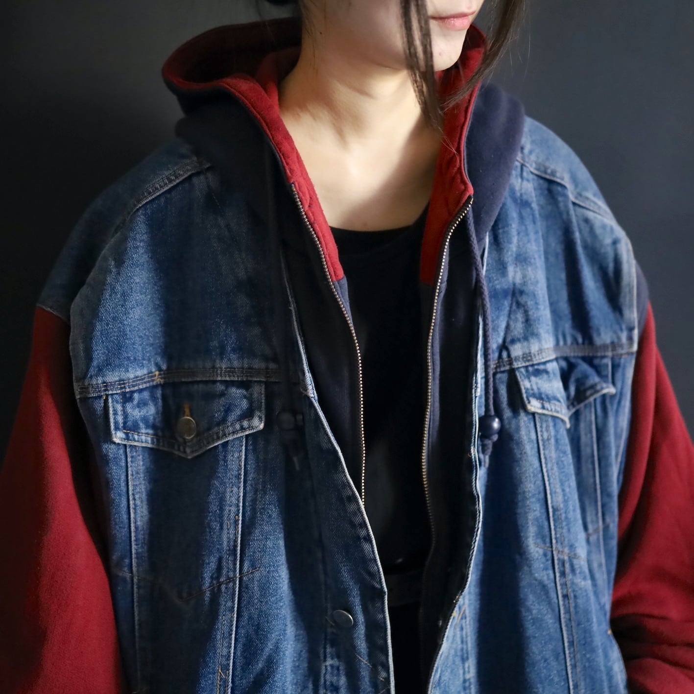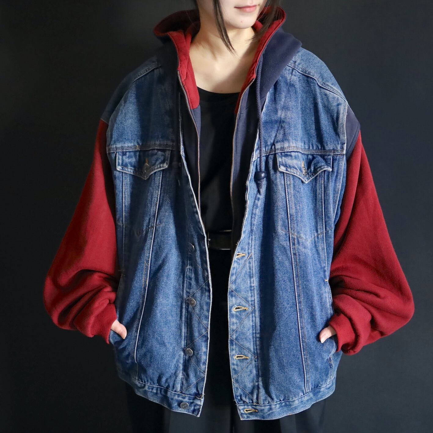 ネイビーとワインレッドのバイカラースウェットと,ほどよく色落ちしたデニムベストのレイヤードスタイル.