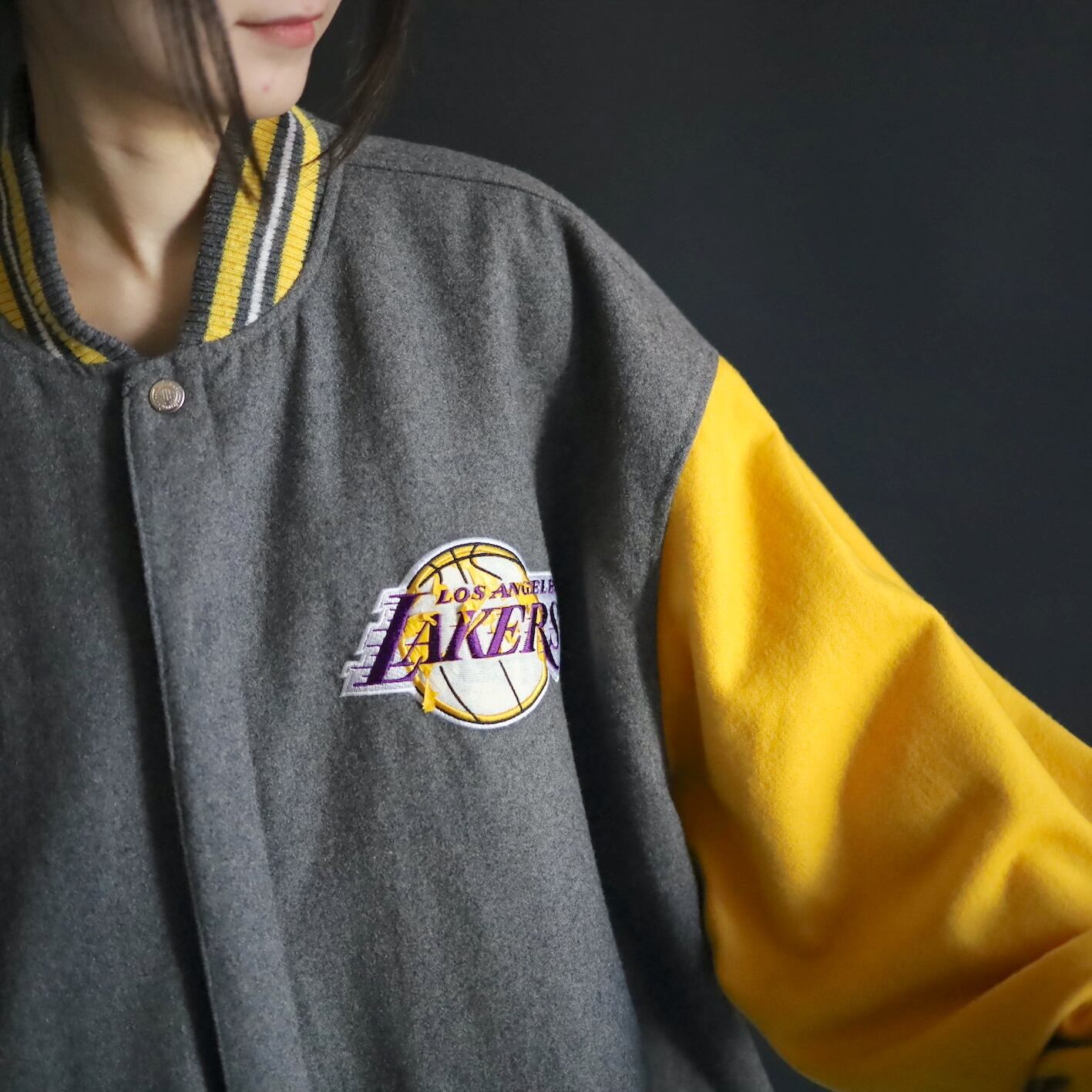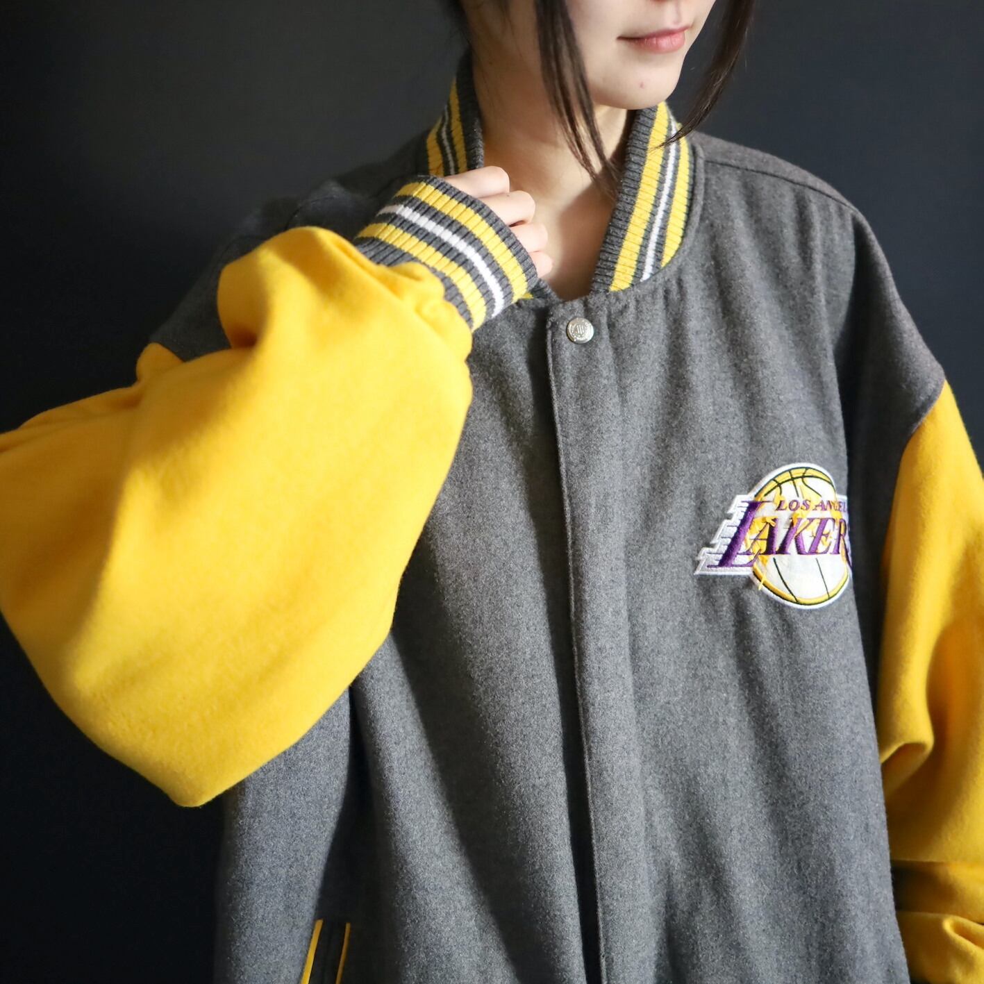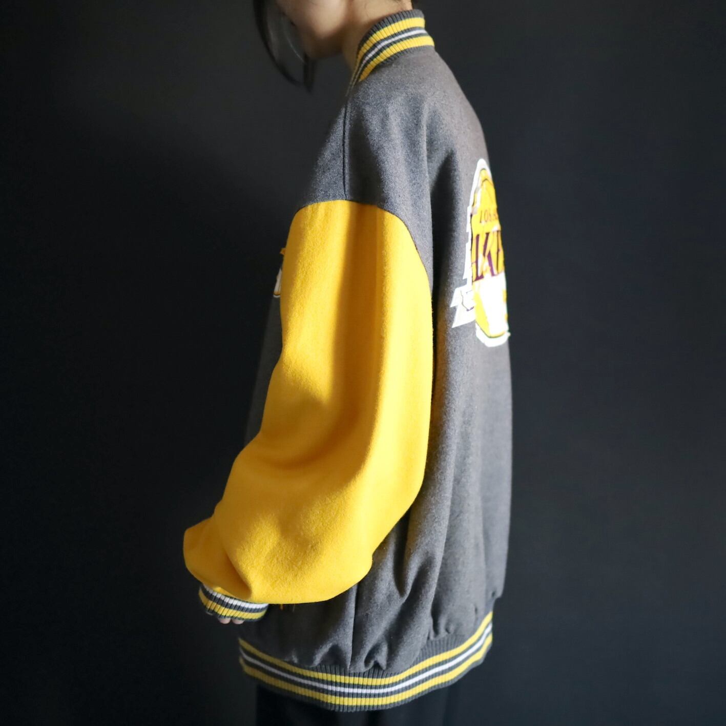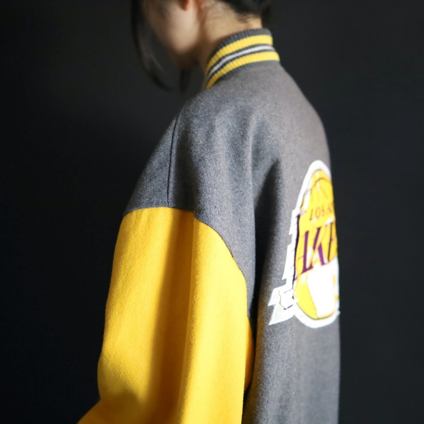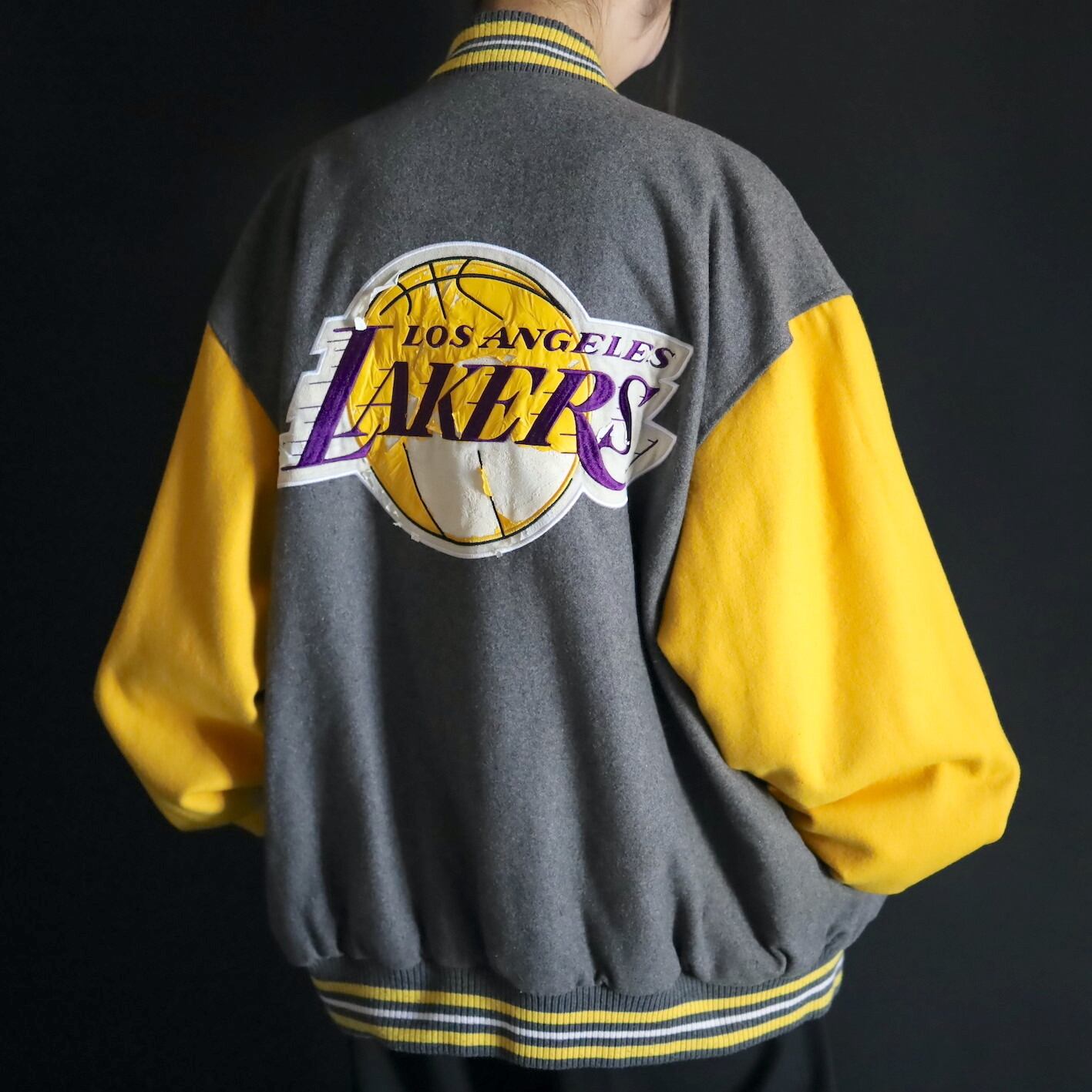 グレー×イエロー面,前後両面レイカーズのロゴプリントに擦れ,剥がれあり.
