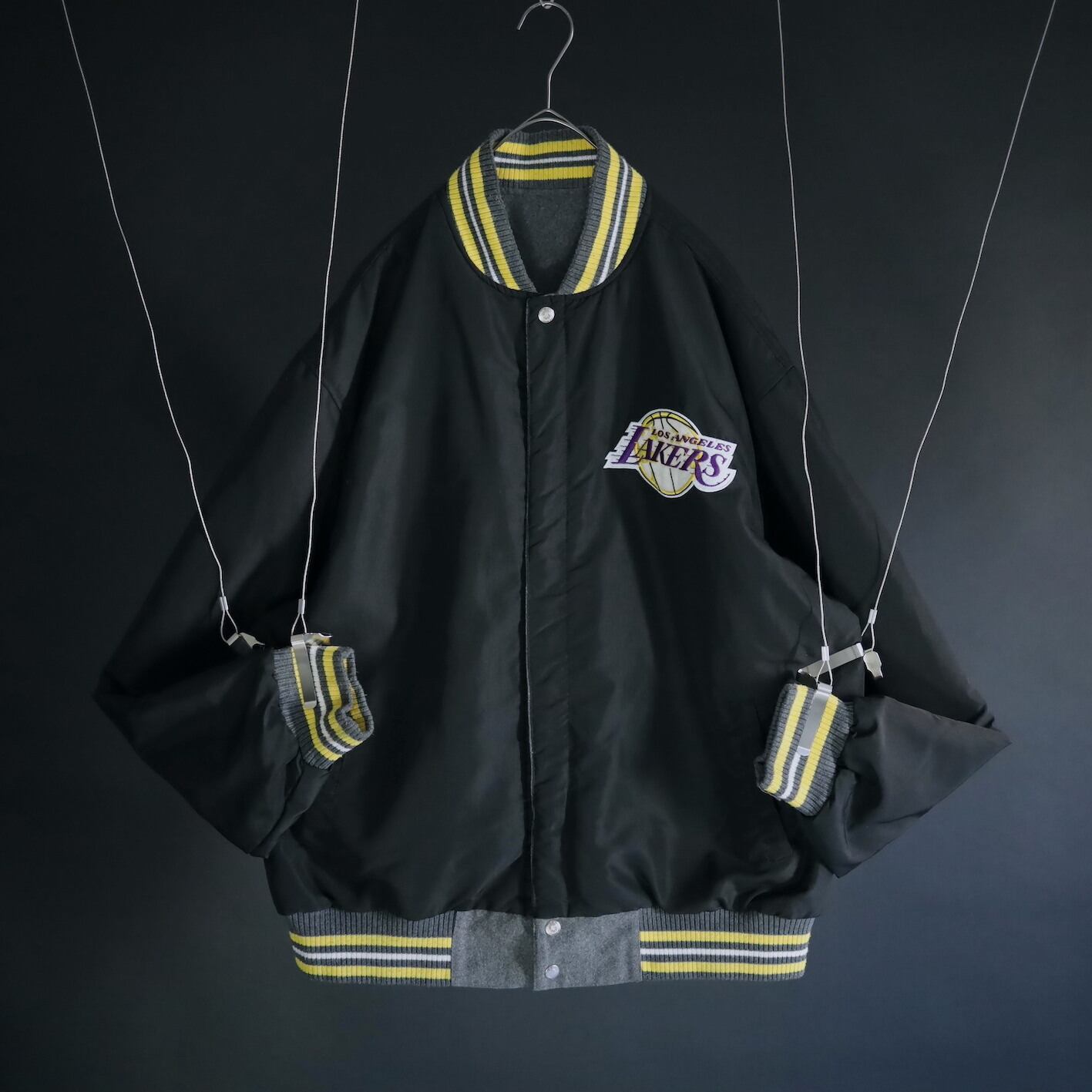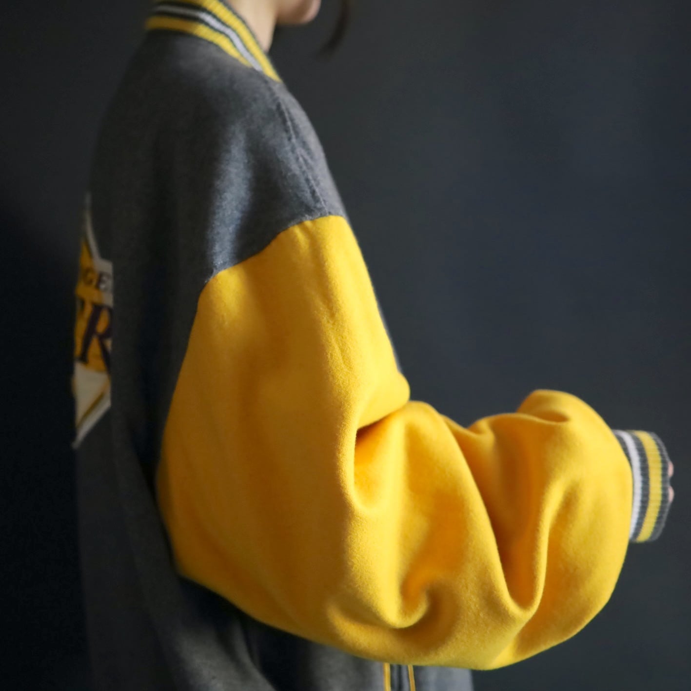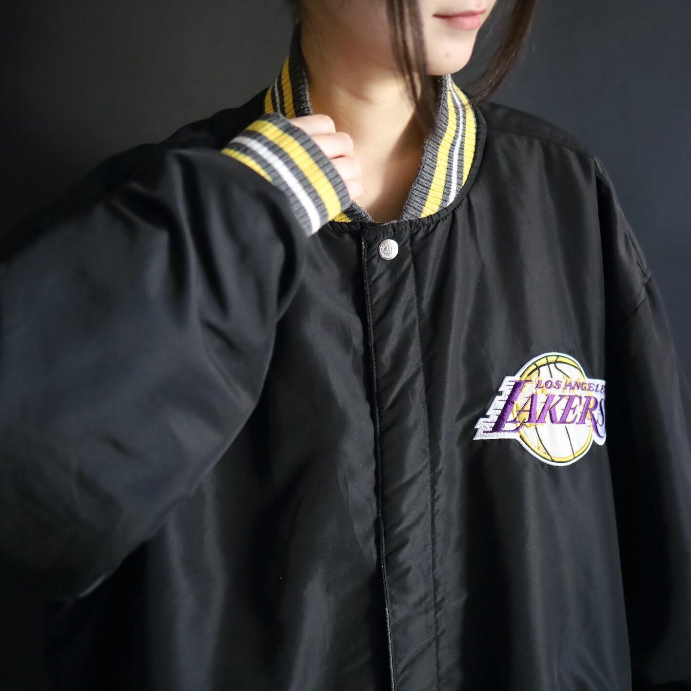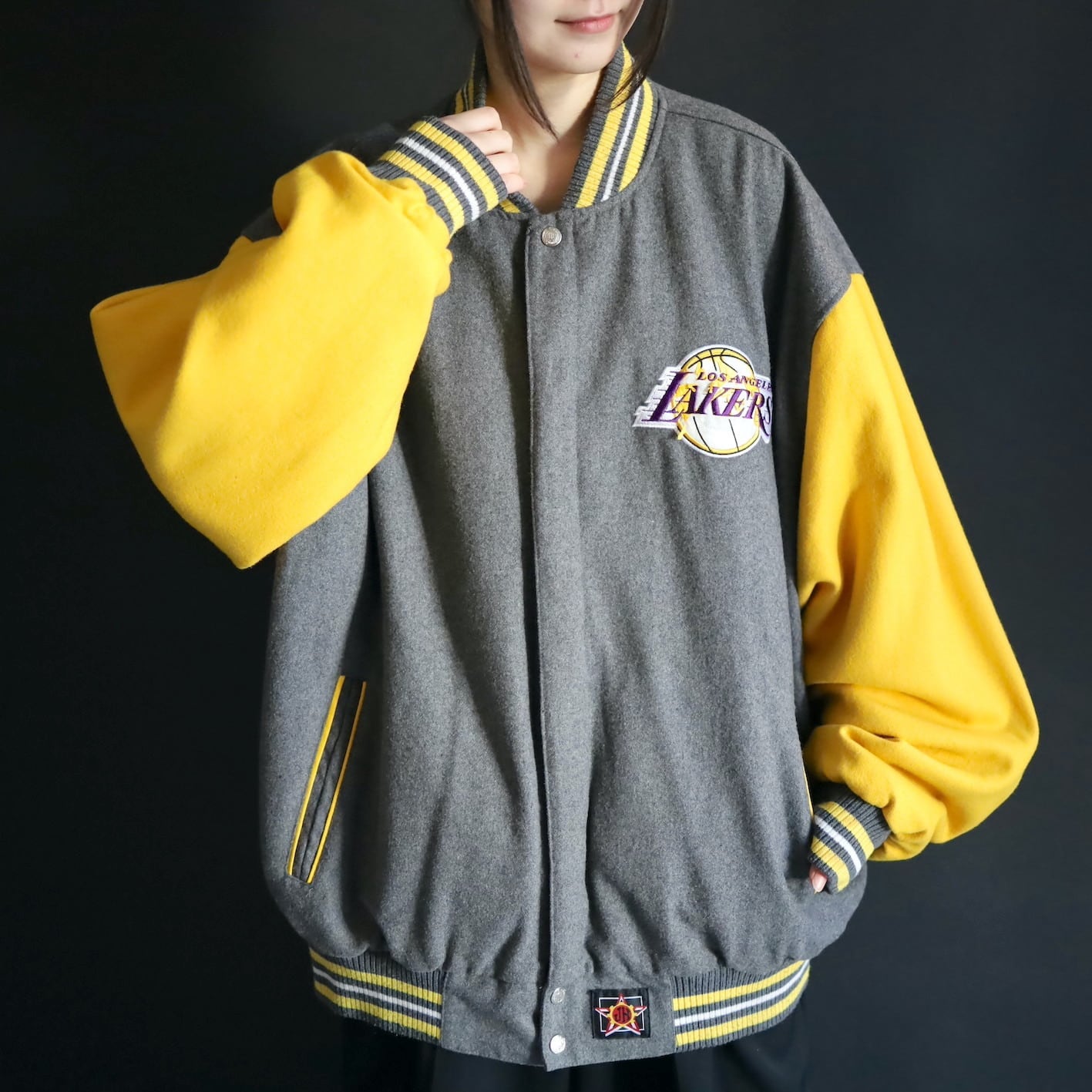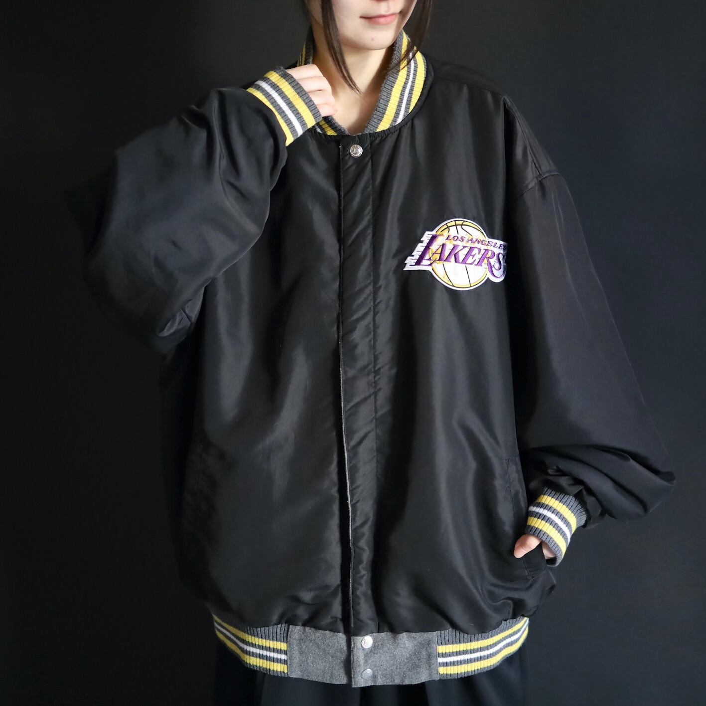 グレー×イエロー面,前後両面レイカーズのロゴプリントに擦れ,剥がれあり.