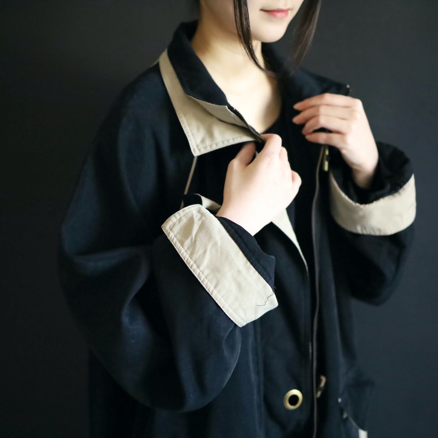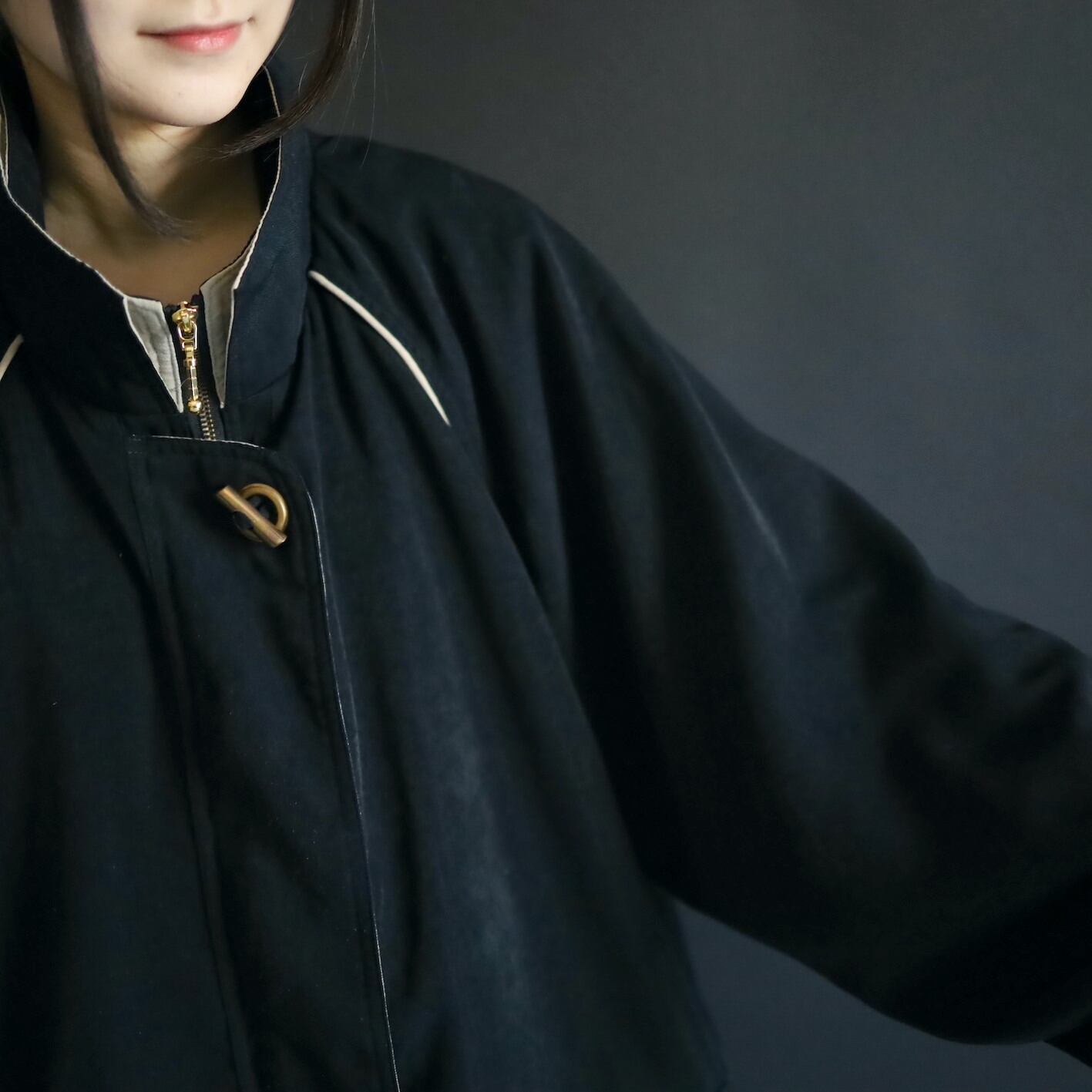 ハリツヤのあるブラックボディをベースに,ベージュバイカラーとパイピングデザイン.