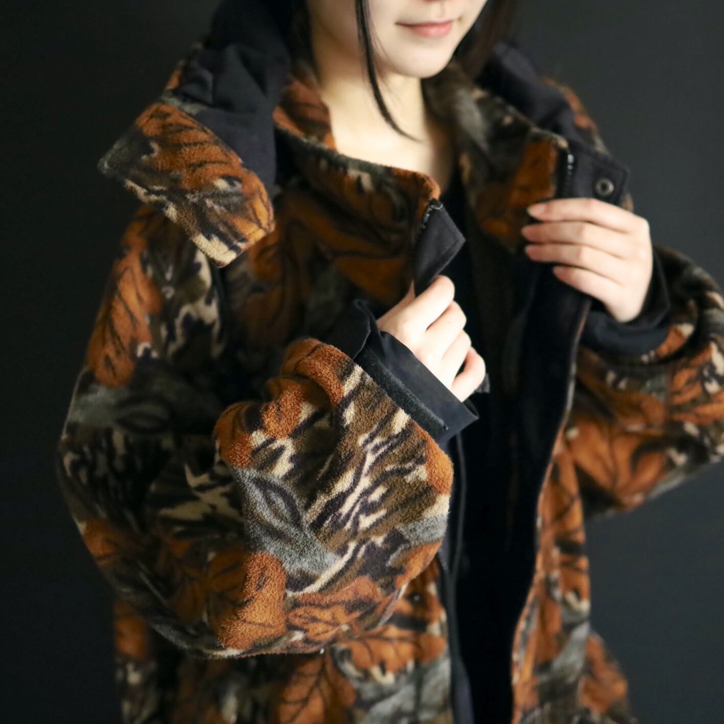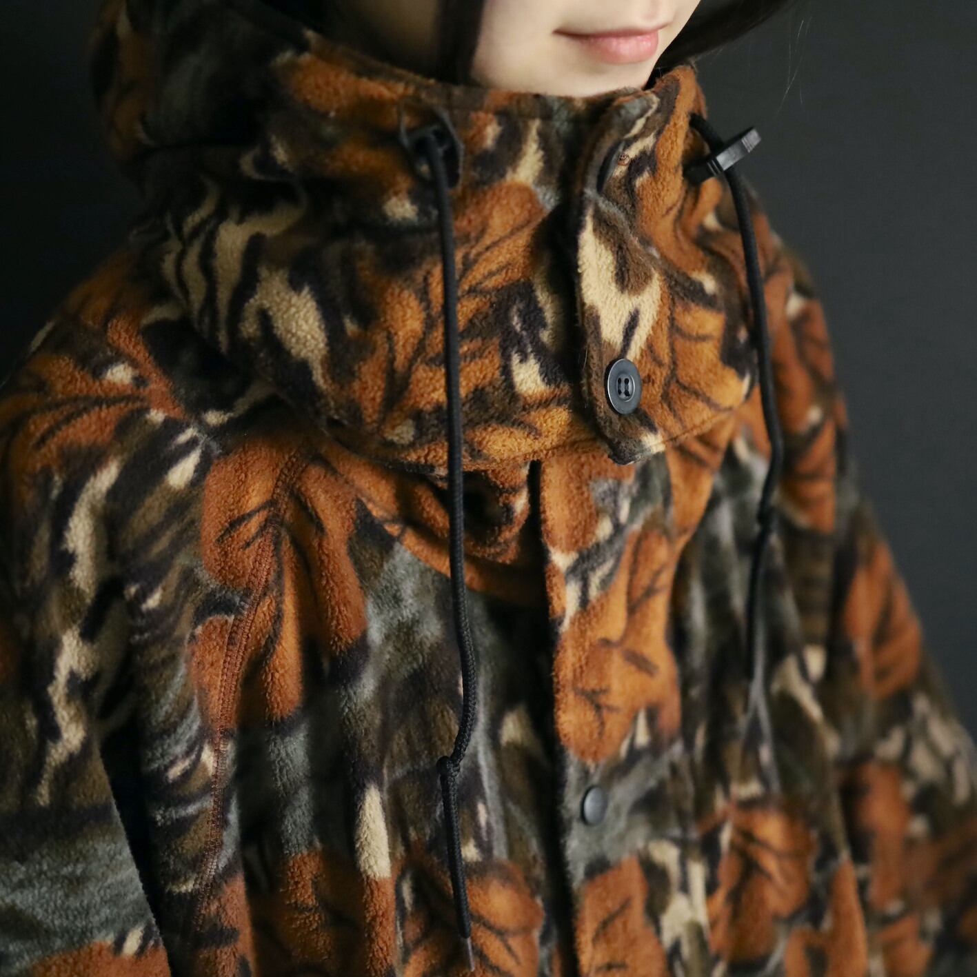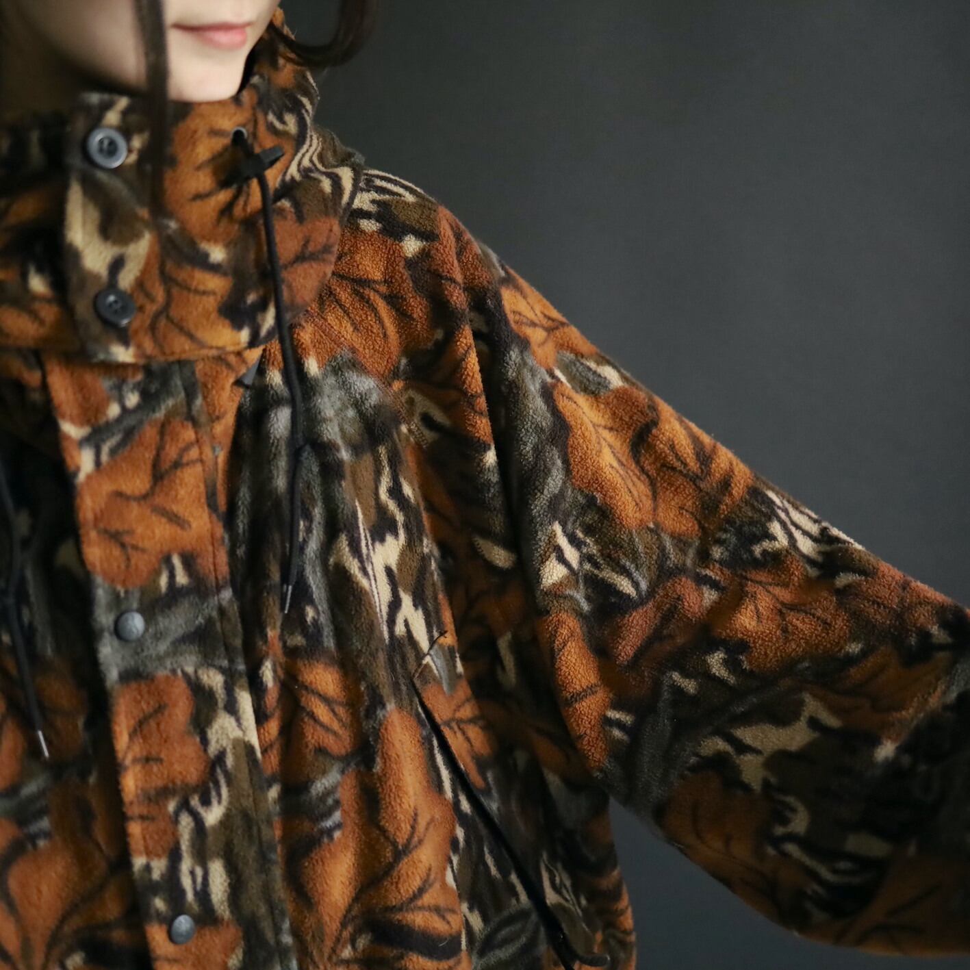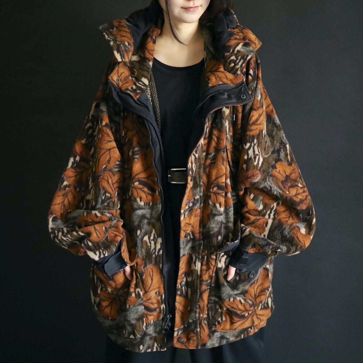 ブラウンベースのリーフカモフラージュ柄フリースで,ほっこりとした印象を受ける温かみのある一枚.